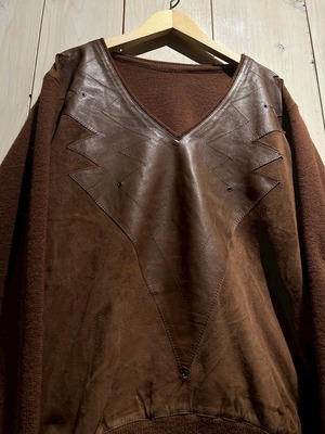 ボディは落ち着いたブラウンニットをベースに、胸元へ大胆に配されたレザー切り替えが印象的。マットなスエードと艶のあるスムースレザーを組み合わせることで、単調にならず奥行きのある表情に仕上がっています。
