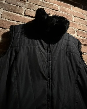 フェイクファー×ポリエステルによる、リバーシブル仕様のジップアップベスト。