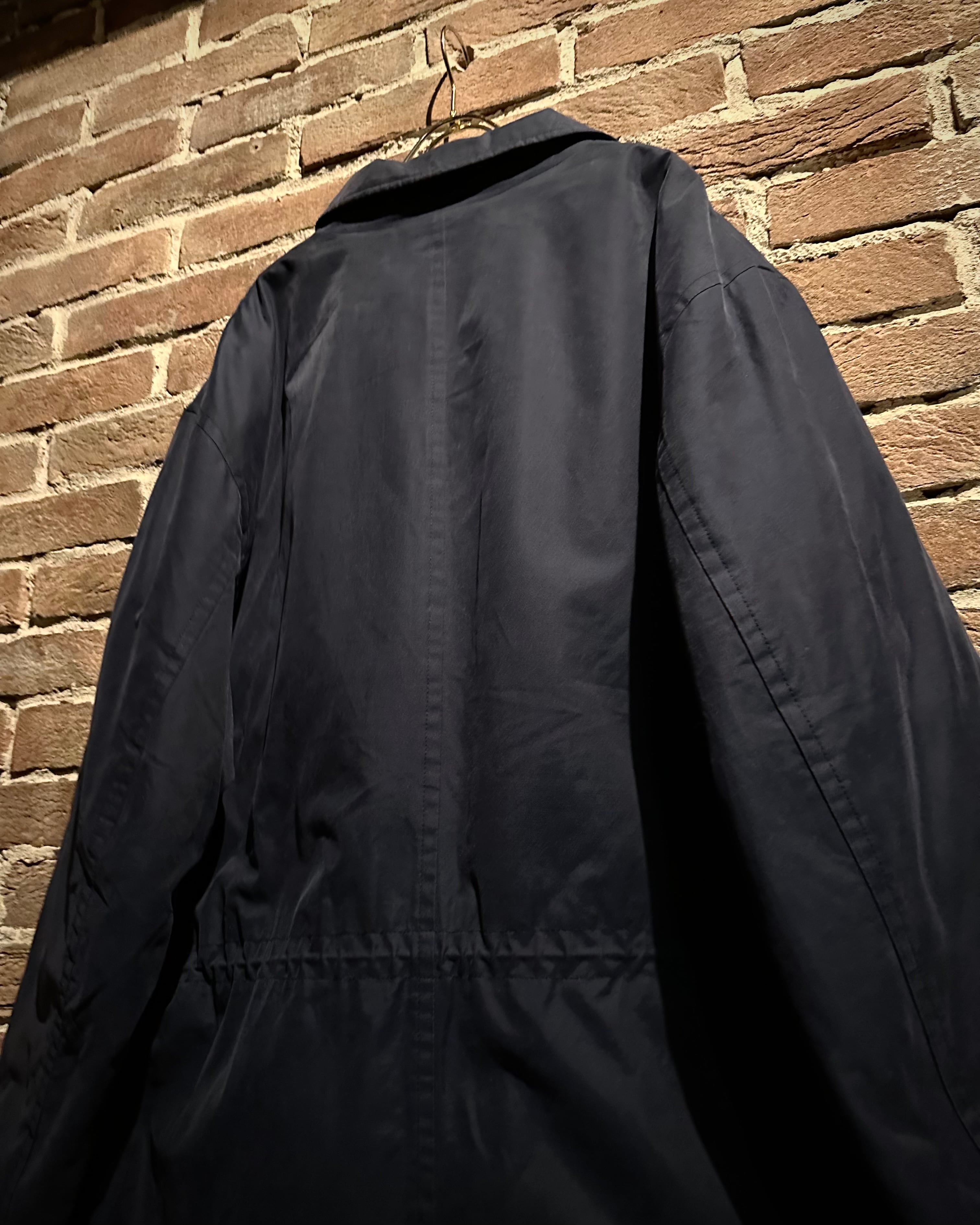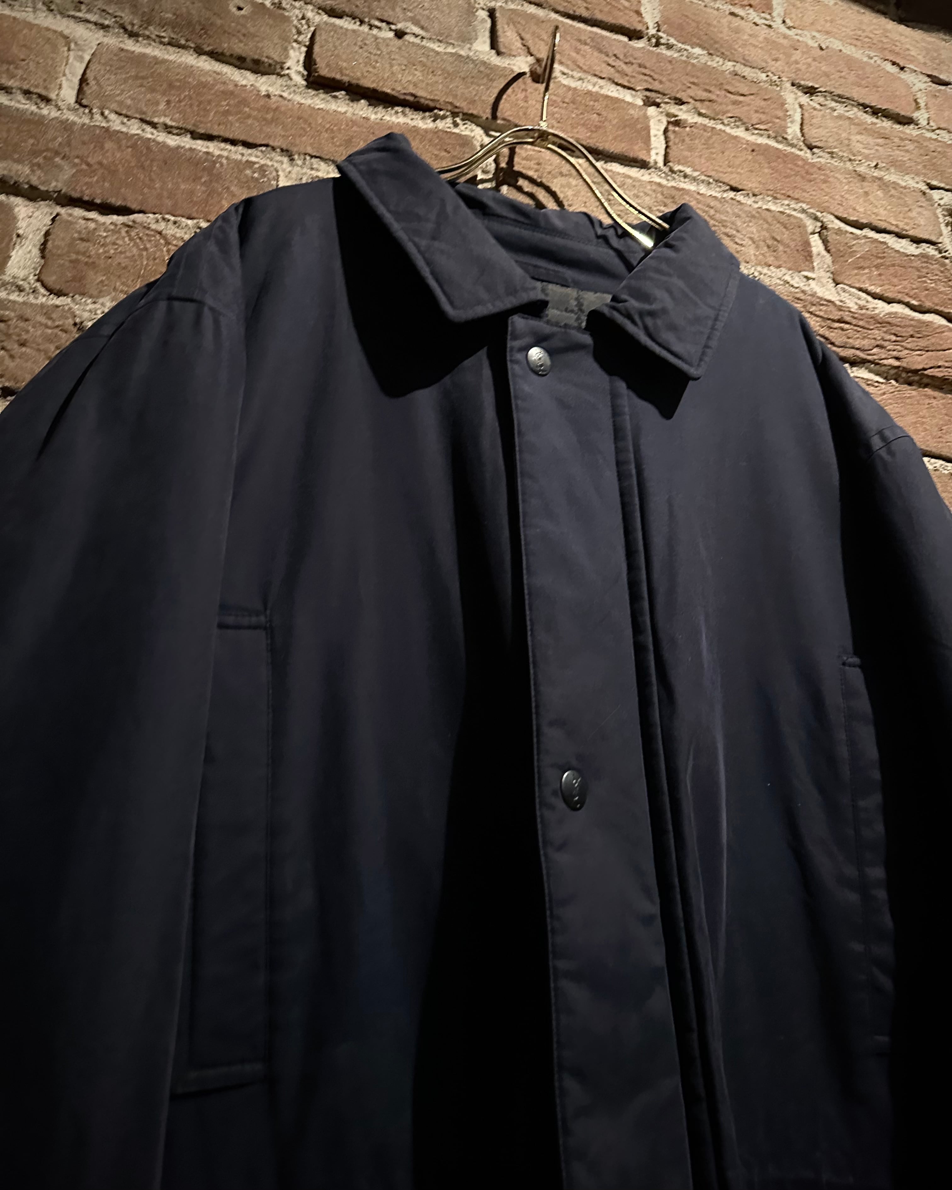 ポケットディテールに加え、フロントは比翼仕立て。スナップボタンとジップを内側に収めた構造で、閉じた際の面構えは非常にミニマルです。ロゴ入りスナップボタンのさりげないアクセントも◎