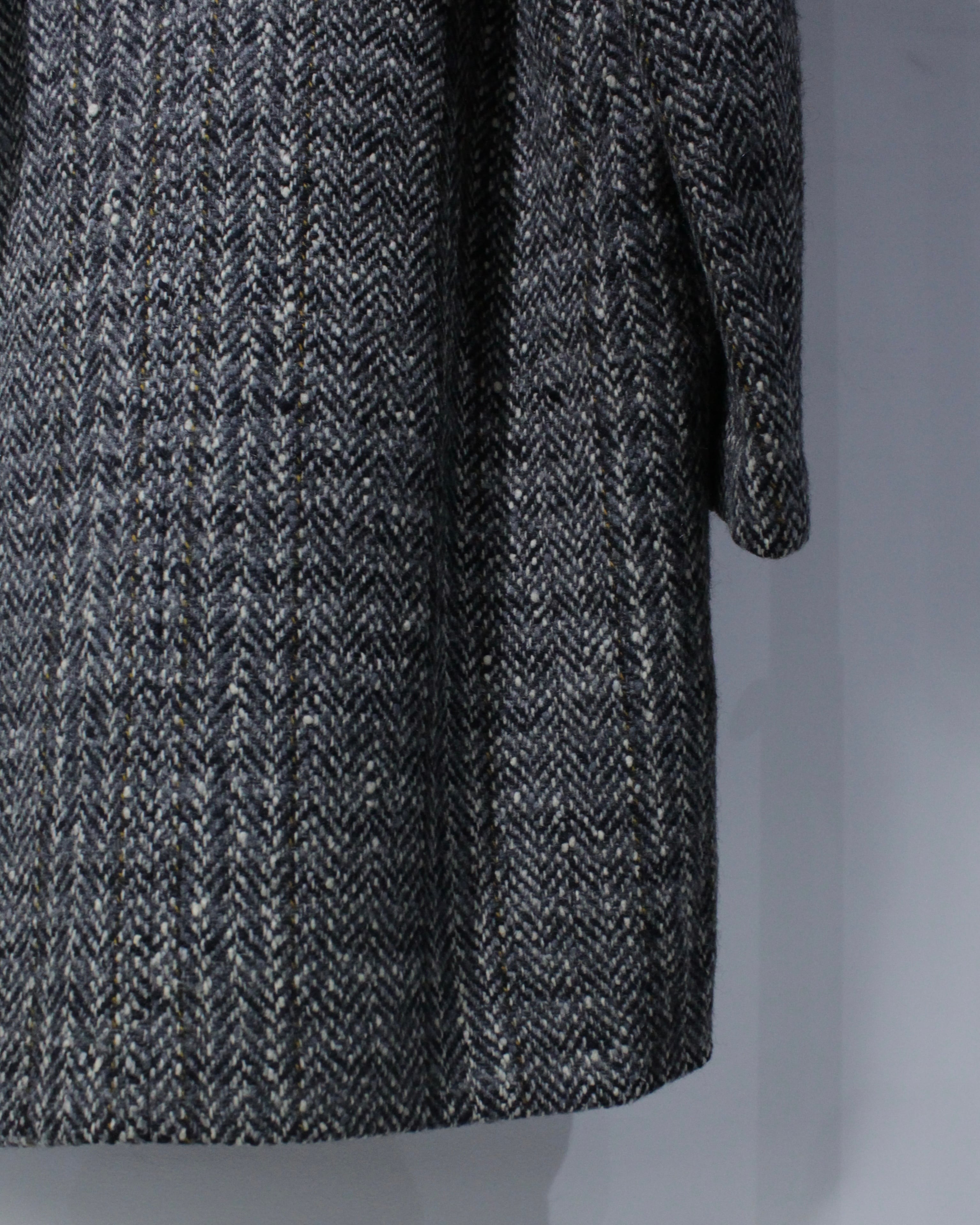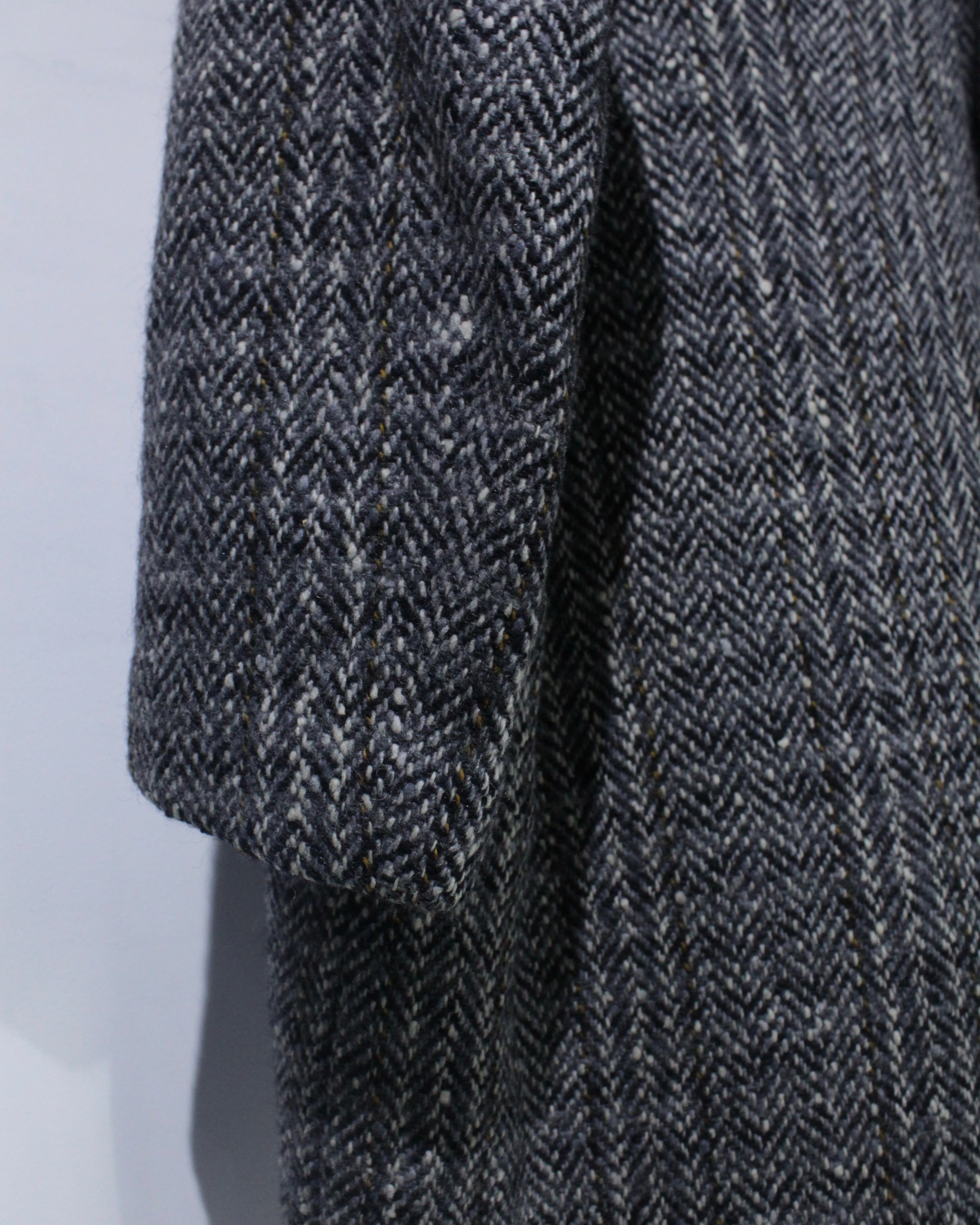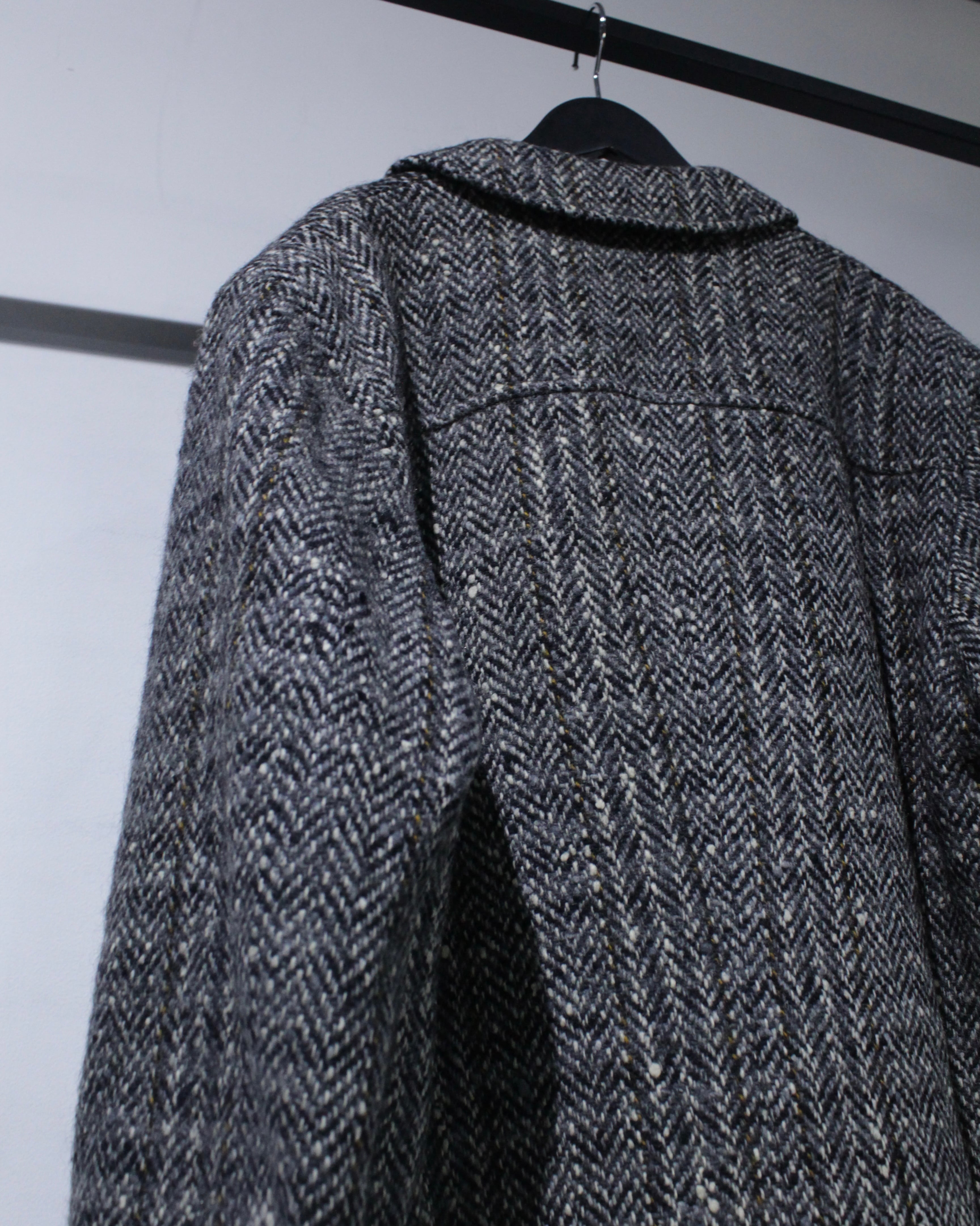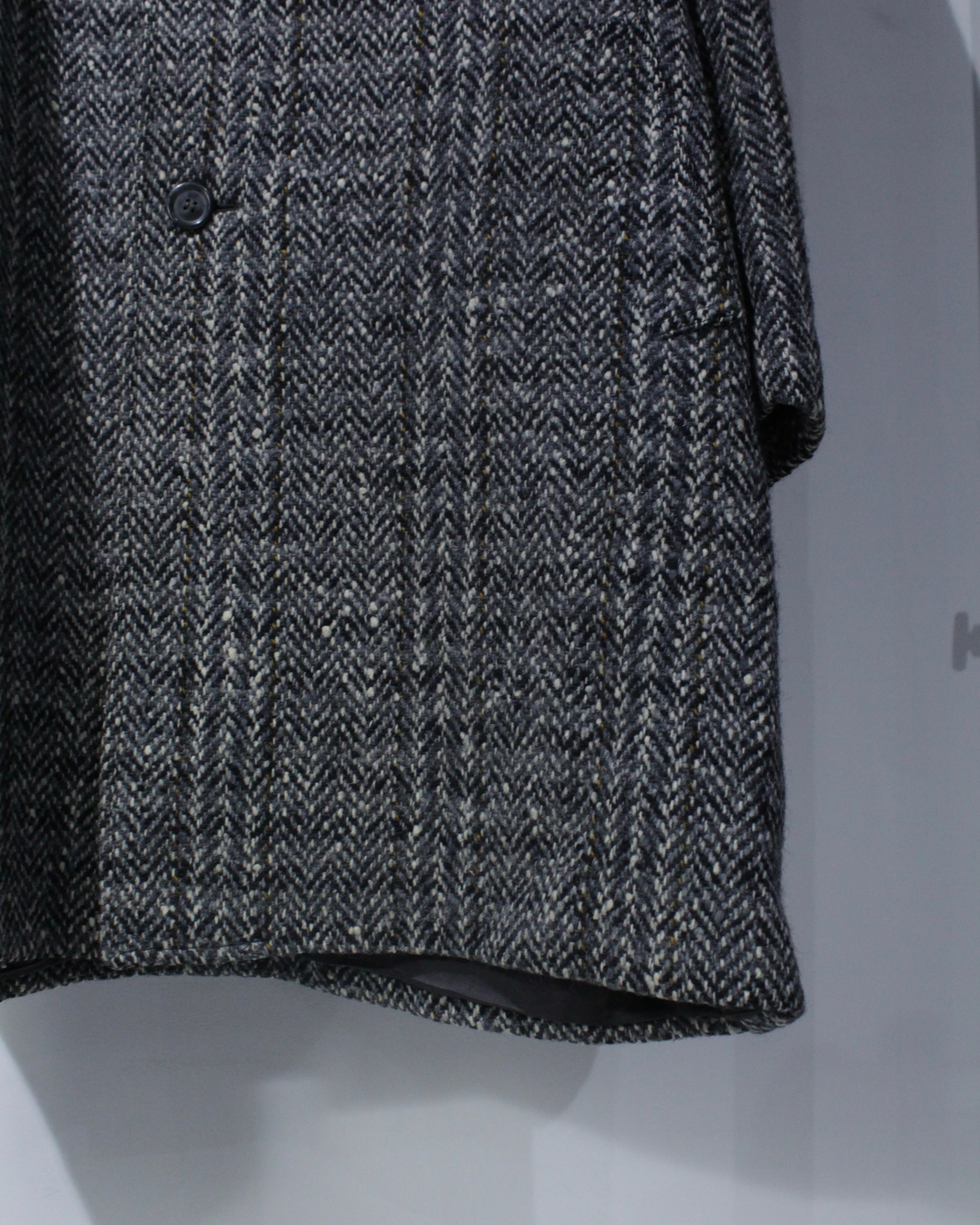 まず目を引くのは、密度高く織られたヘリンボーンツイードの表情。グレーとブラックを基調に、黄色の糸が混ざることで、単色では出せない奥行きと陰影が生まれています。近くで見るほど織りの立体感が際立ち、イタリアらしい素材の良さが素直に伝わってくる仕上がり。