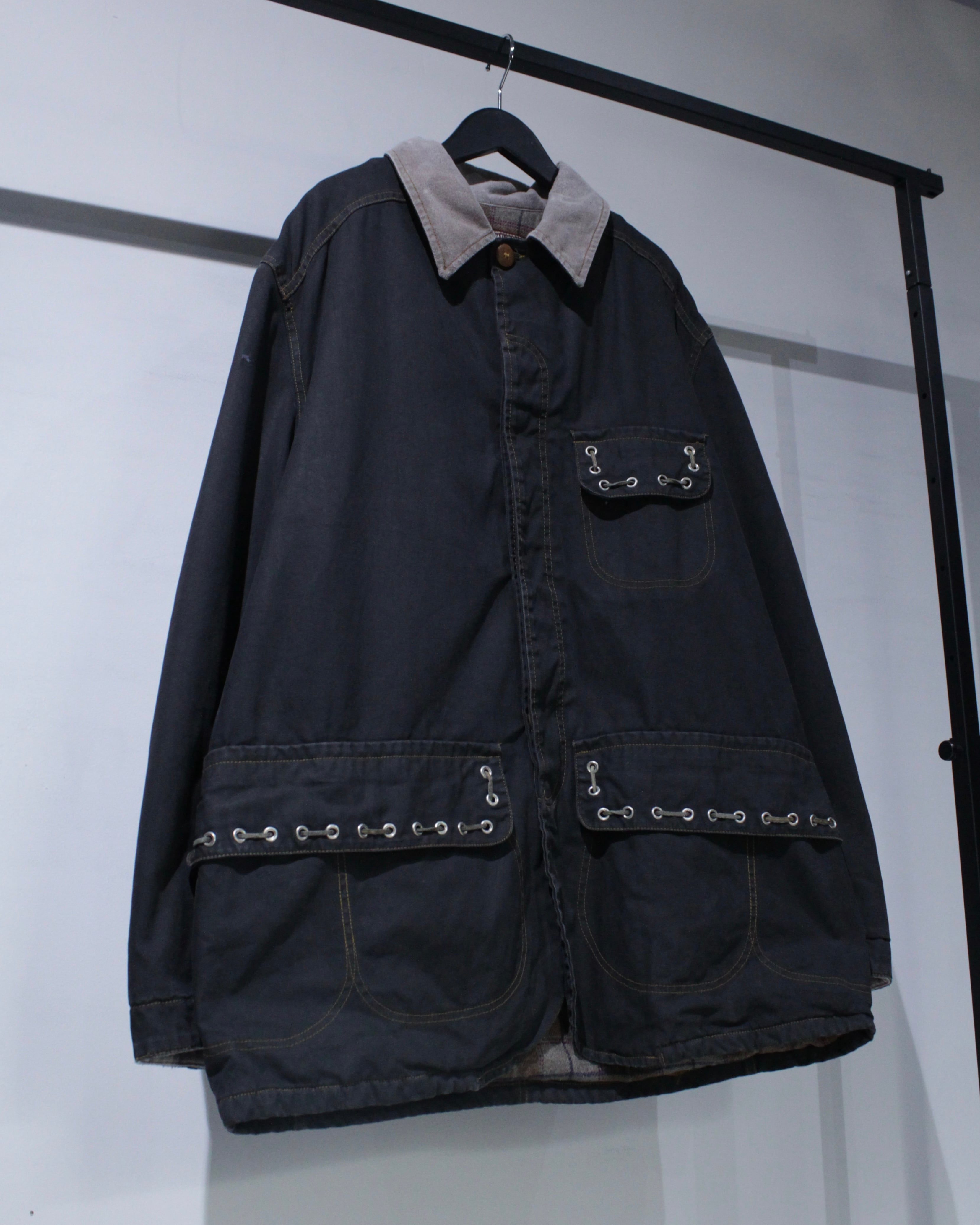 各ポケットのフラップ部分には、ハトメにロープを通したステッチ風のデザイン。襟元は別地切り替えで、着用時に自然な奥行きが生まれます。