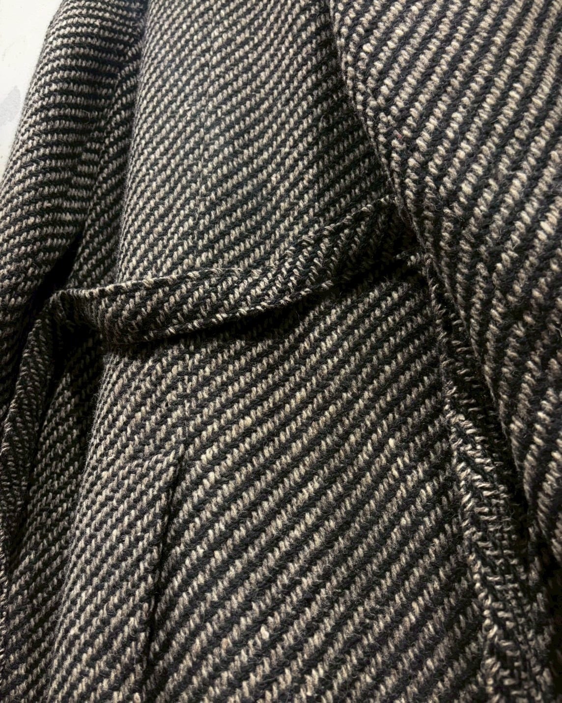 ブラック×ホワイトの糸を用いたツイード素材はざっくりとした織りによる立体感と奥行きがあり、ウール特有の温かみを感じさせながら品のある質感に仕上がっています。