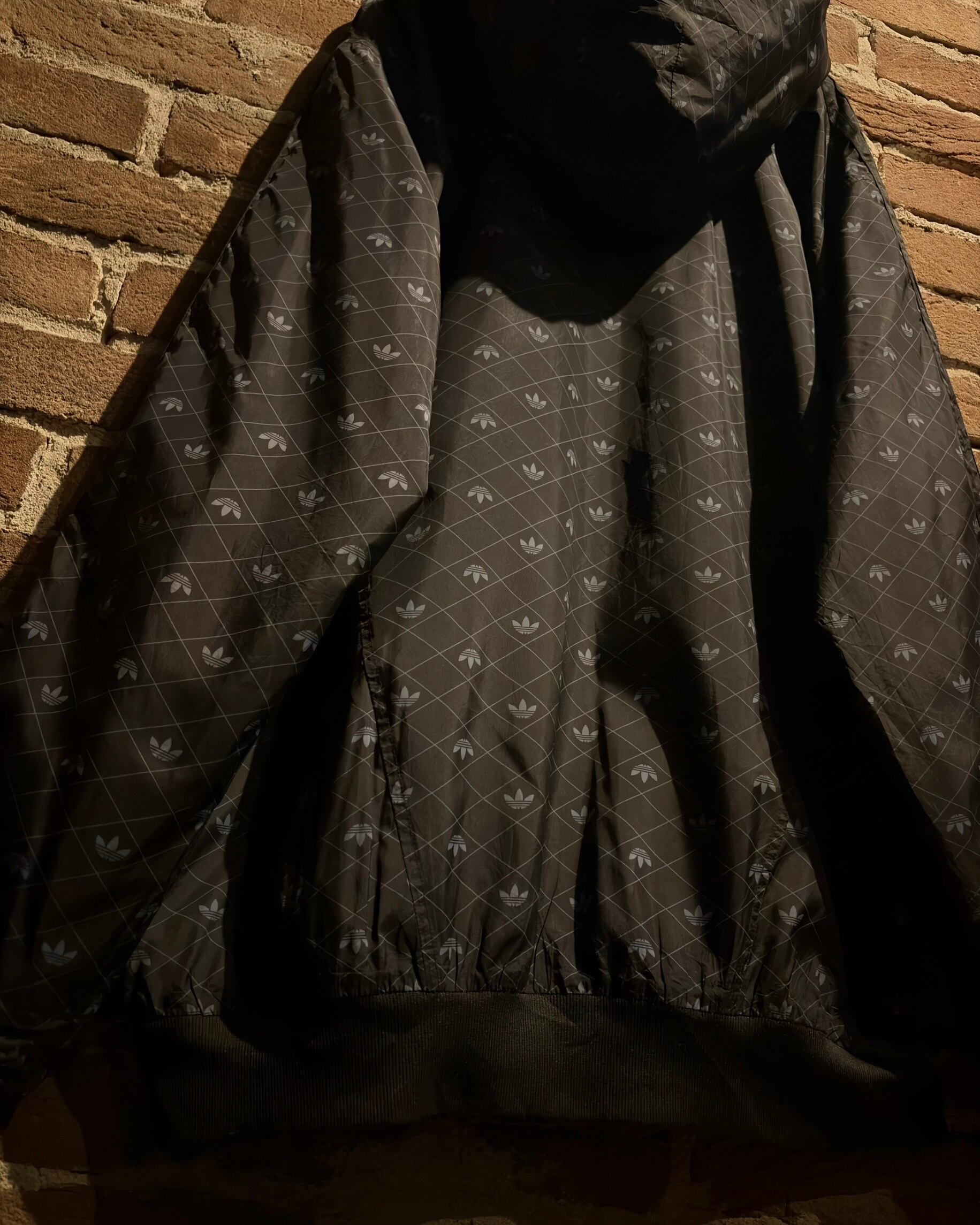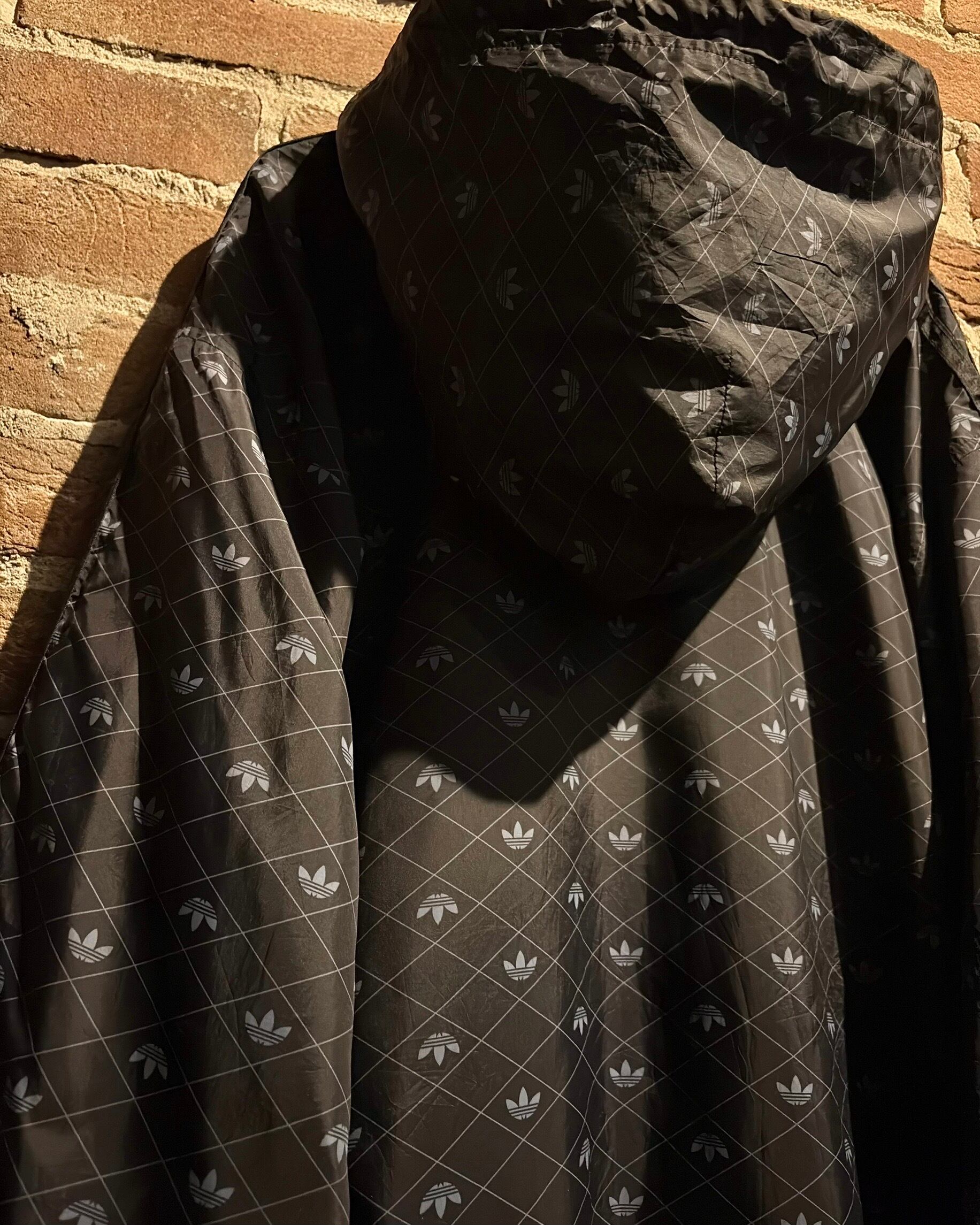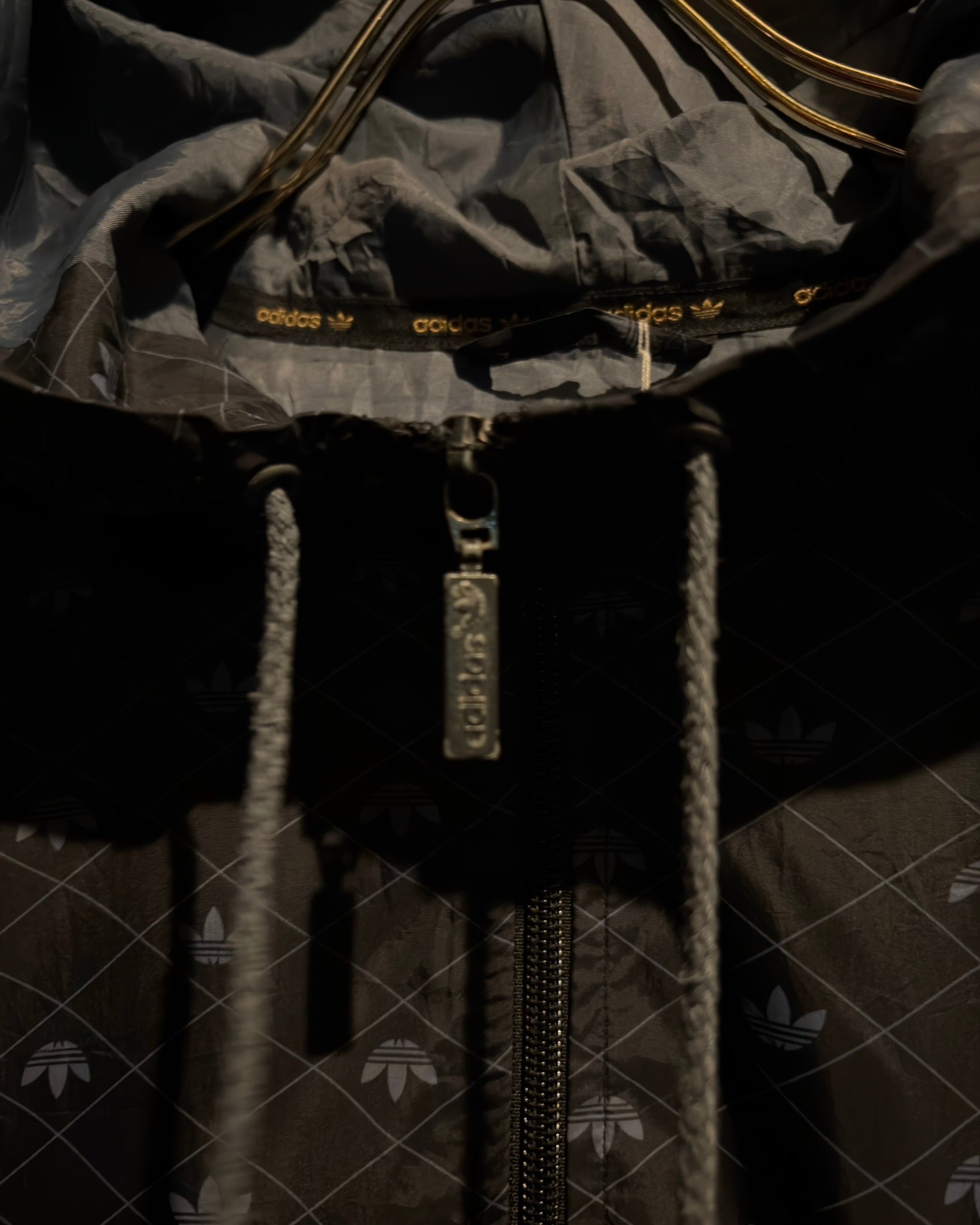 袖にはお馴染みの3ストライプスをしっかり配置。プリントではなく切り替えで表現されており、動きに合わせて立体感が生まれるのもポイント。フロントはジップ仕様、フード付きでスポーティな空気感を強調しています。