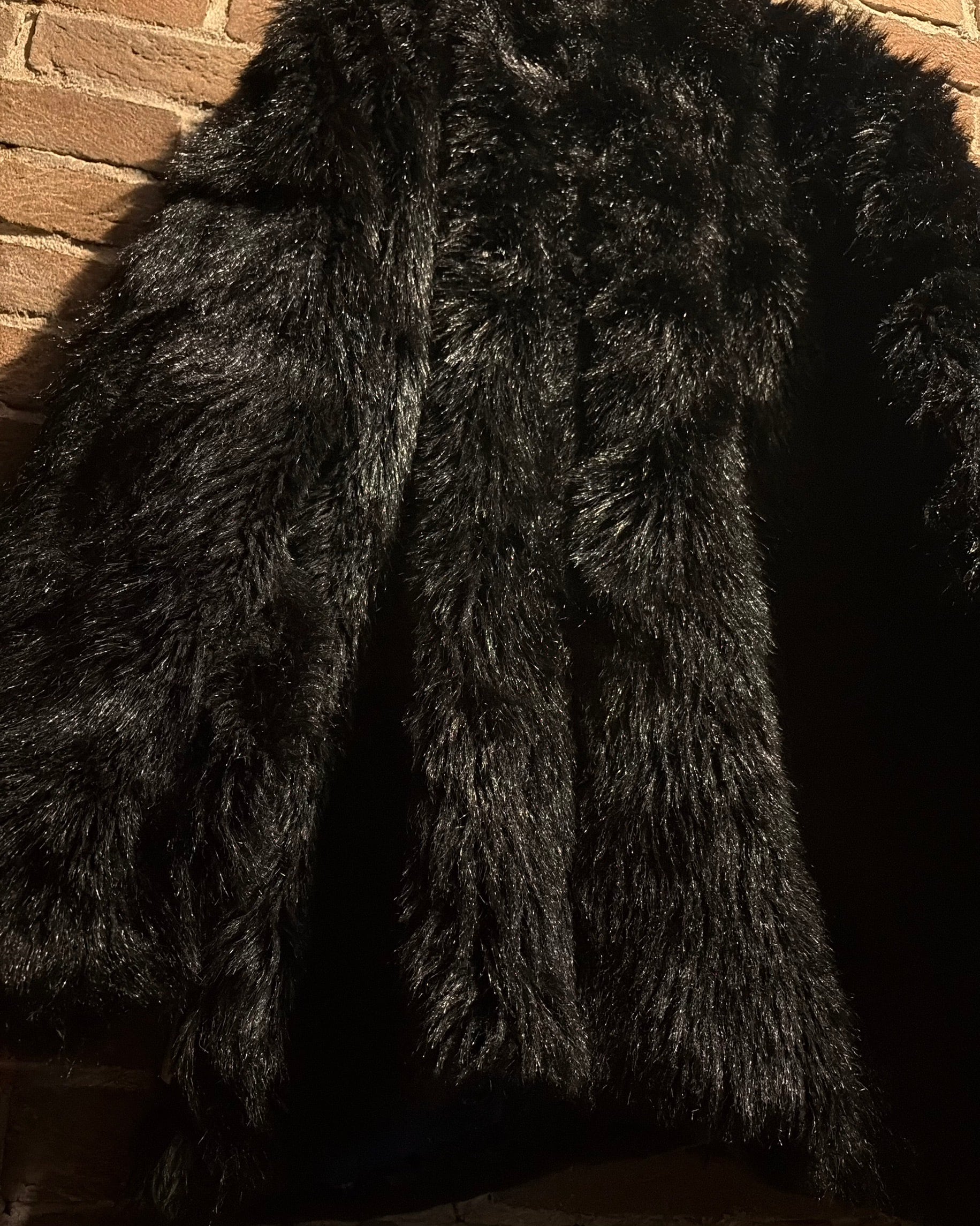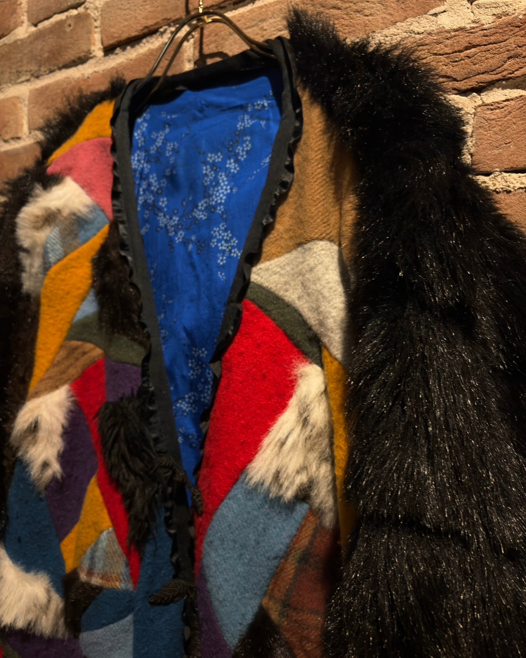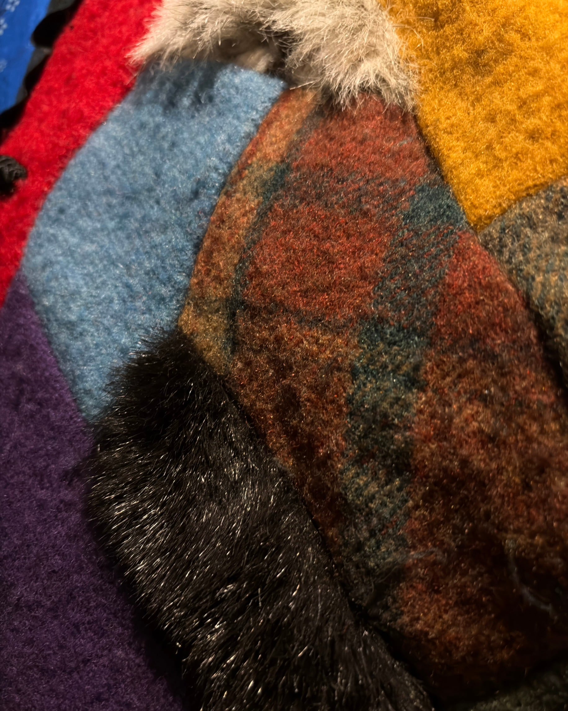 毛足の長いファーのボディをベースに、フロントにはマルチカラーのメルトン素材とファーをパッチワーク調に切り替えた、インパクト抜群のジャケット。