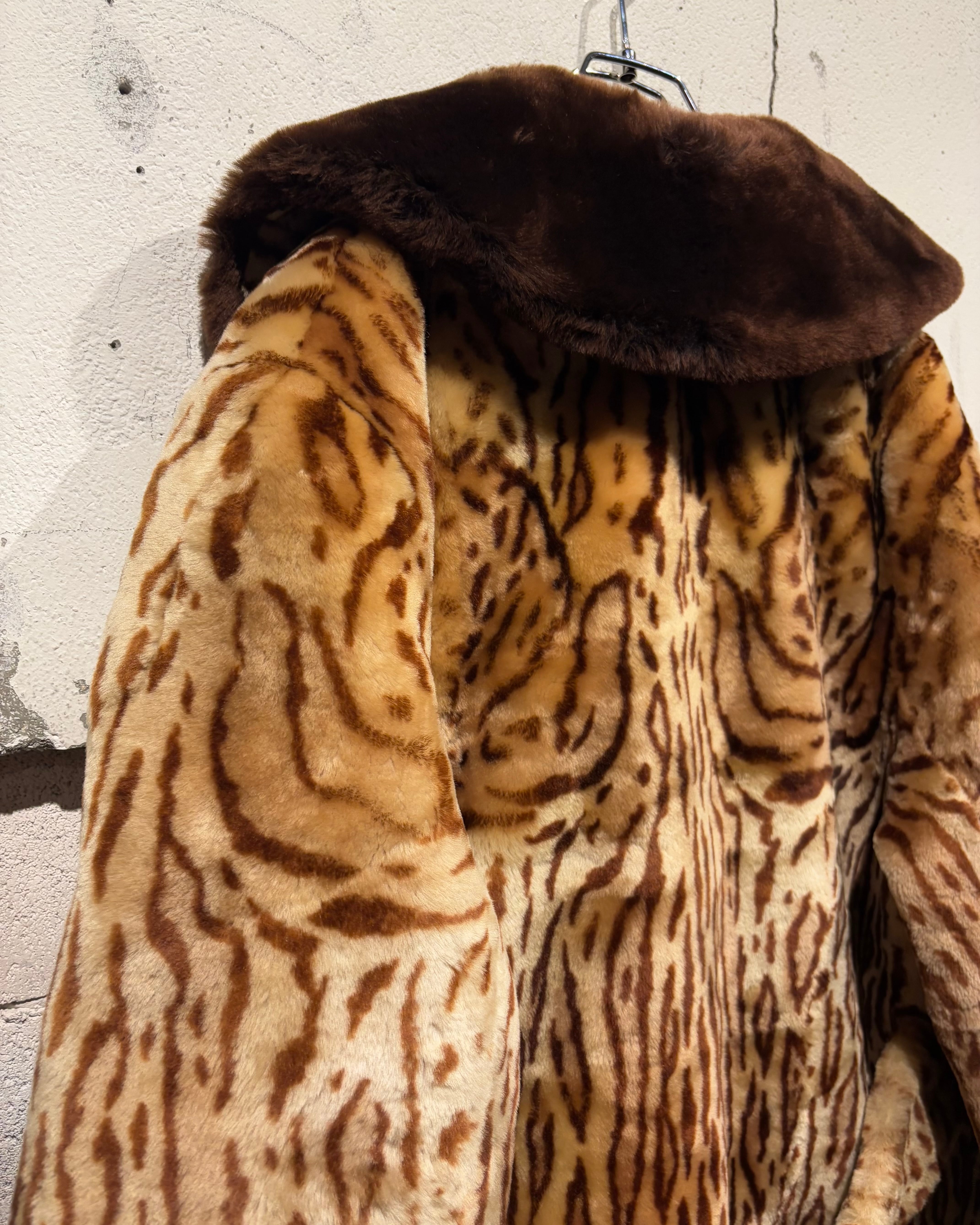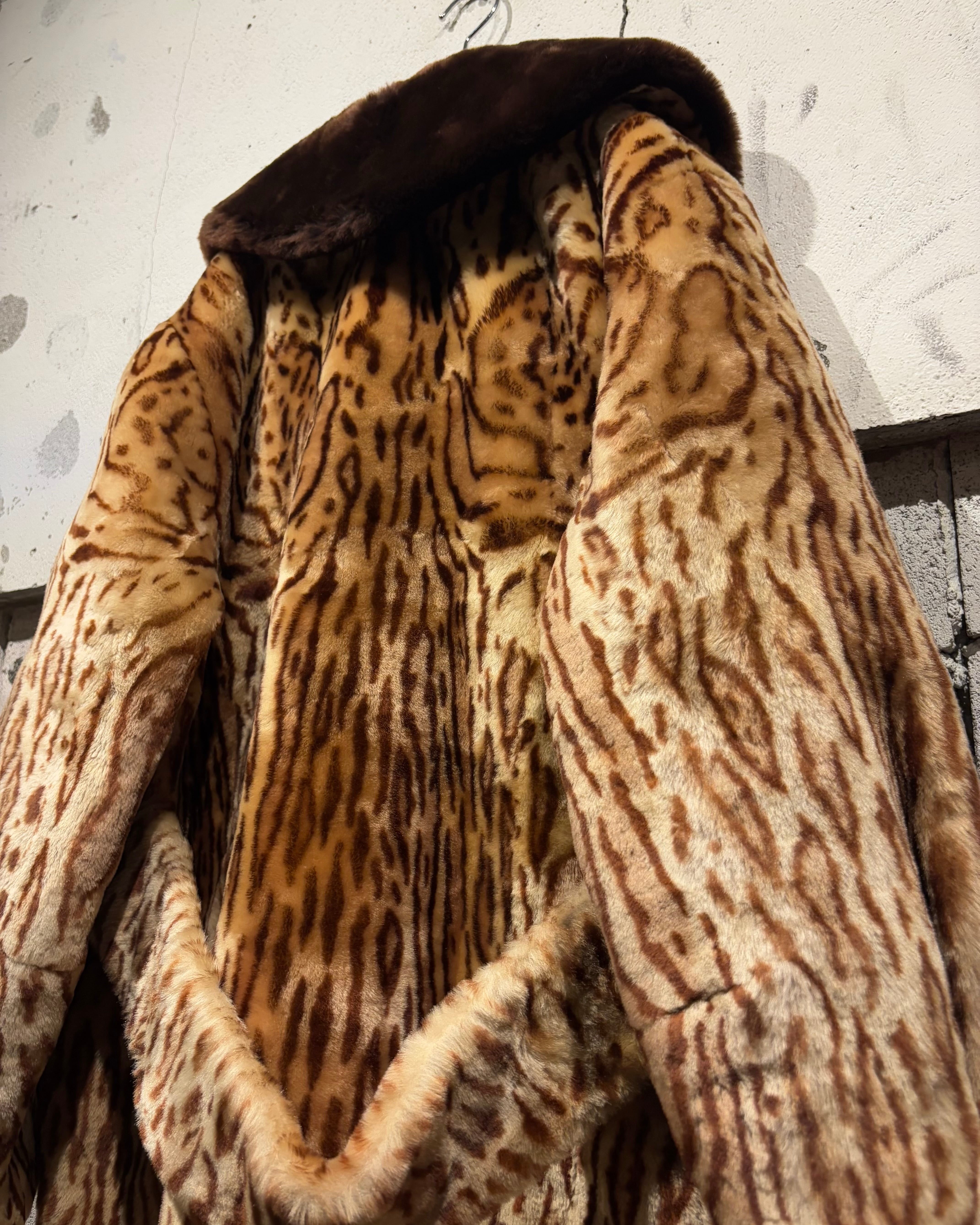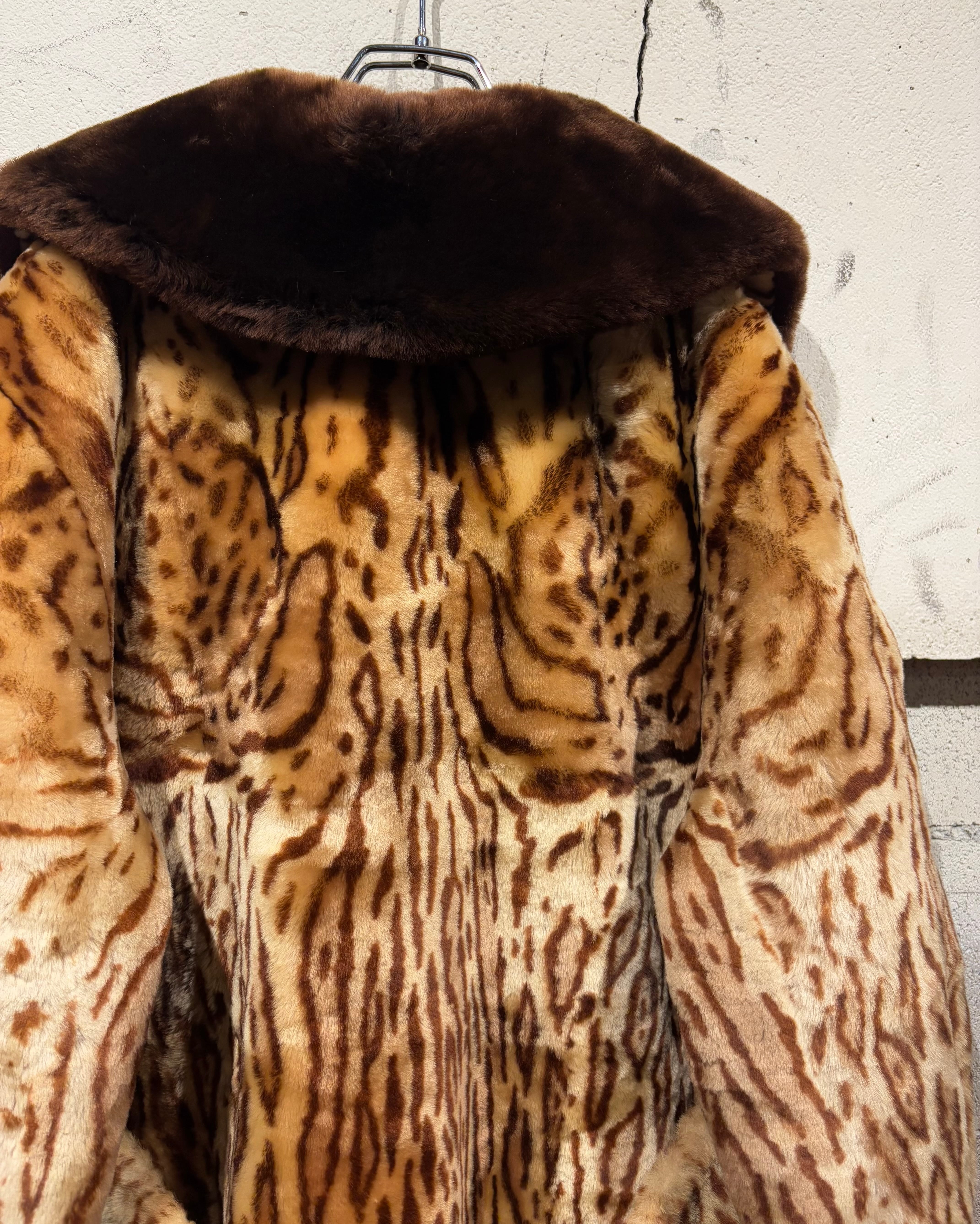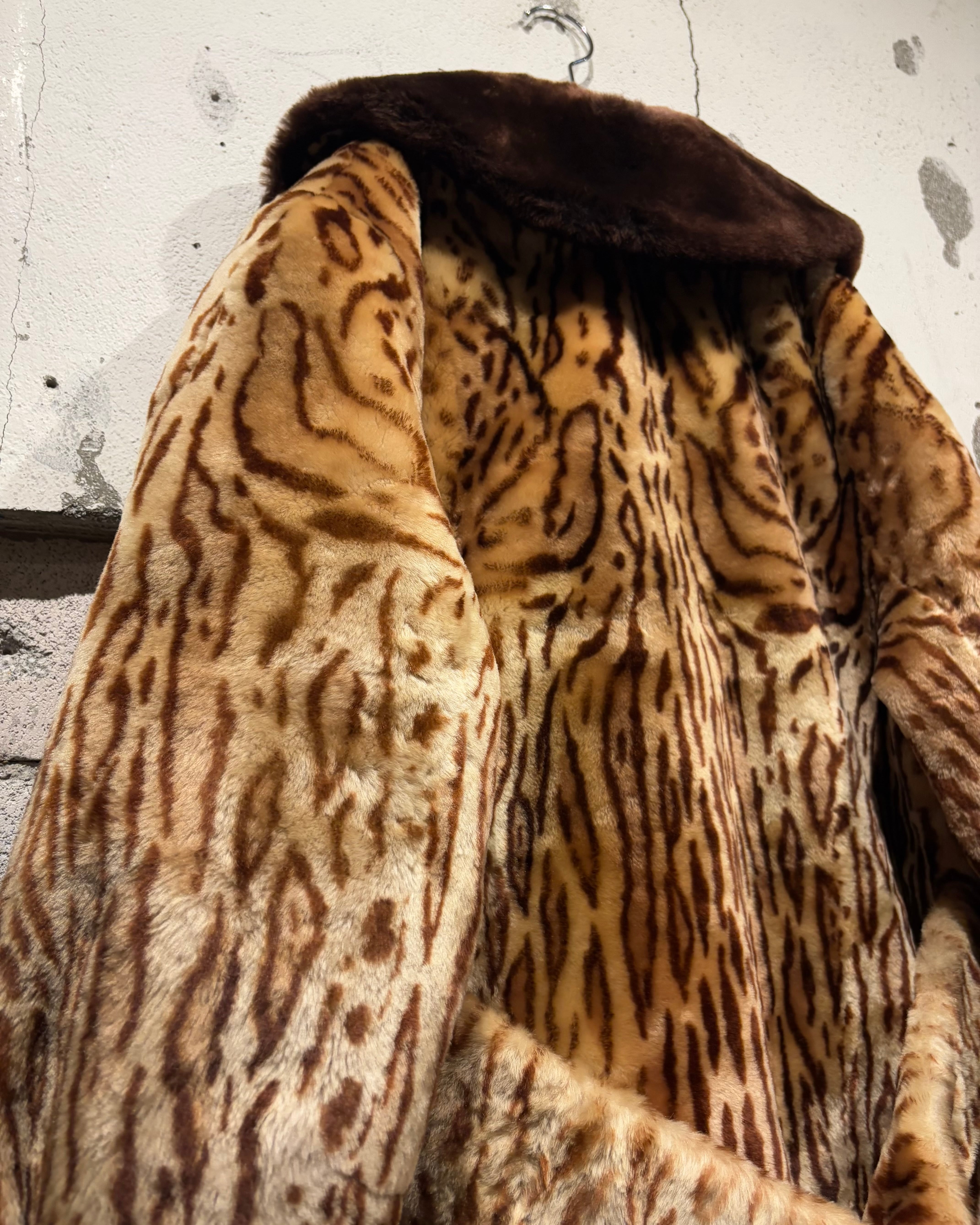 艶やかな光沢を帯びたアニマル柄のボディに、ブラウンの切り替えが印象的な、リアルファーを用いたコート。