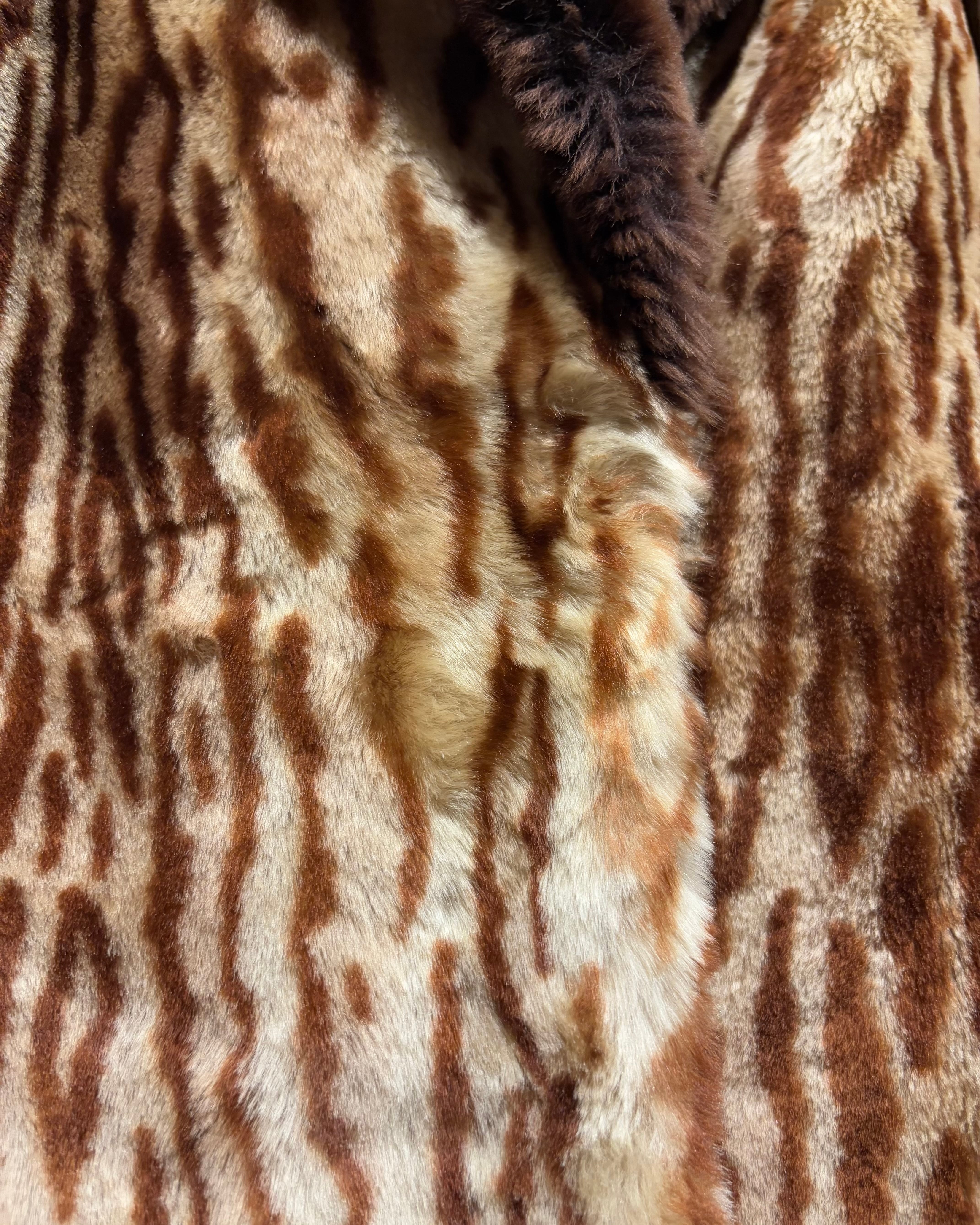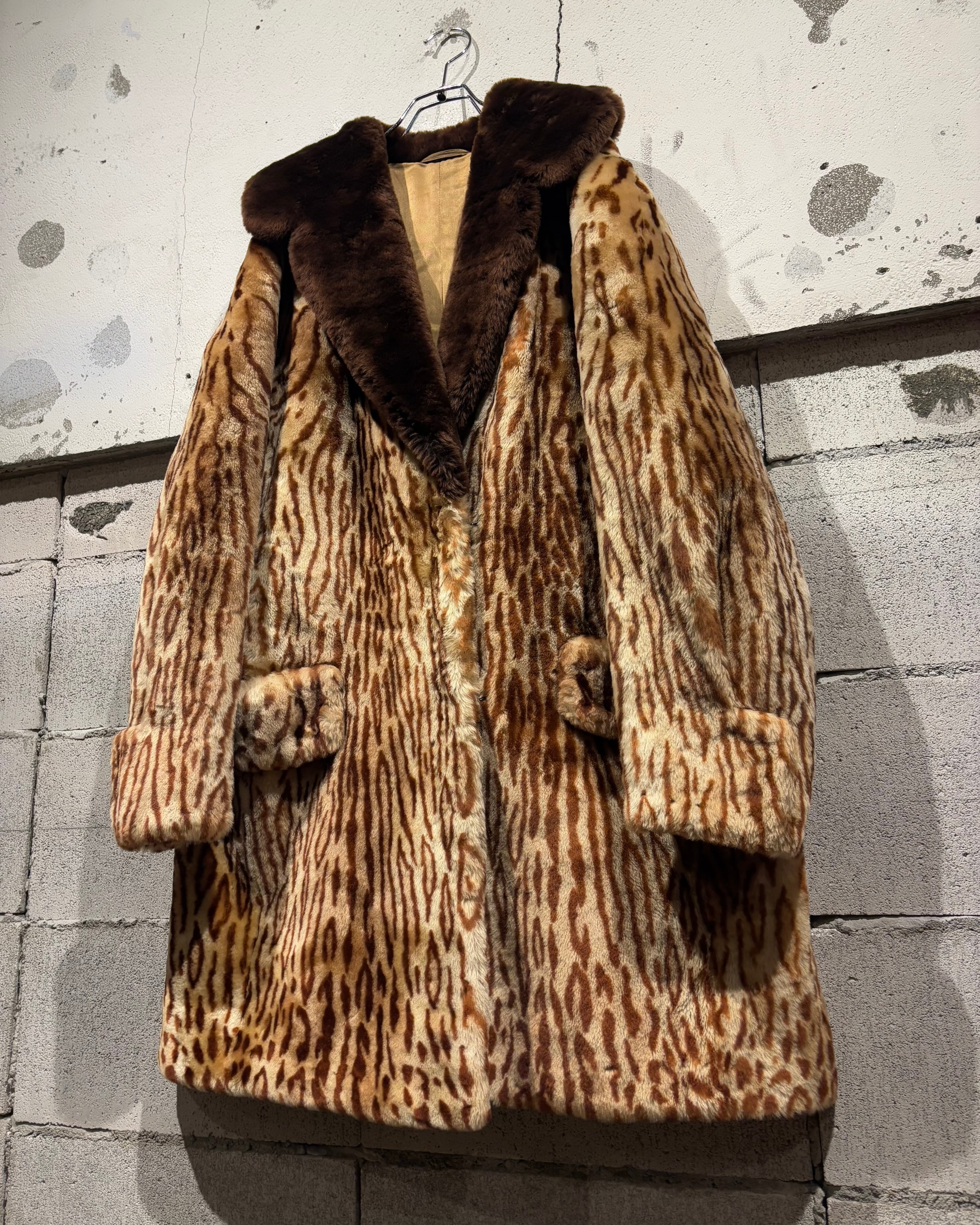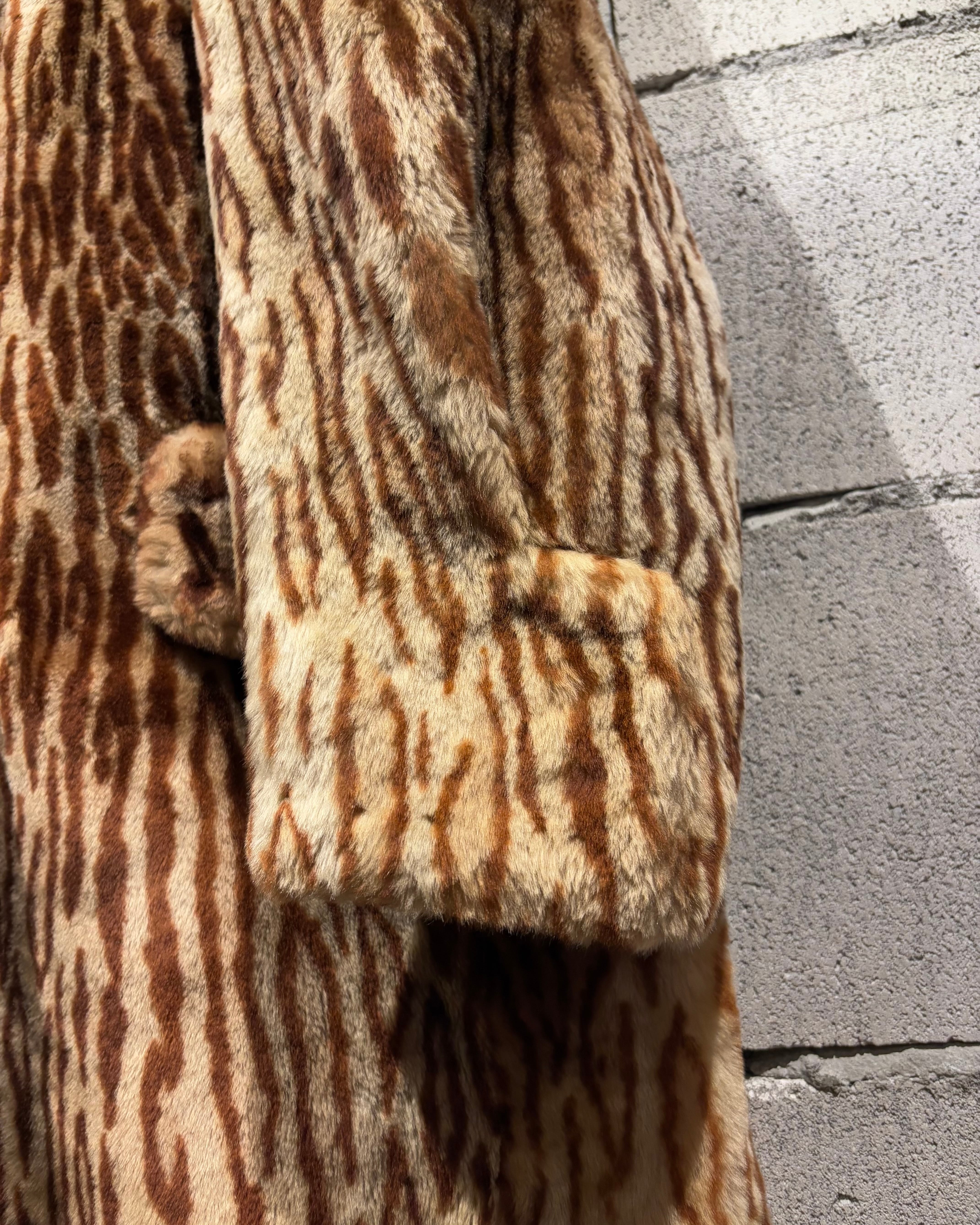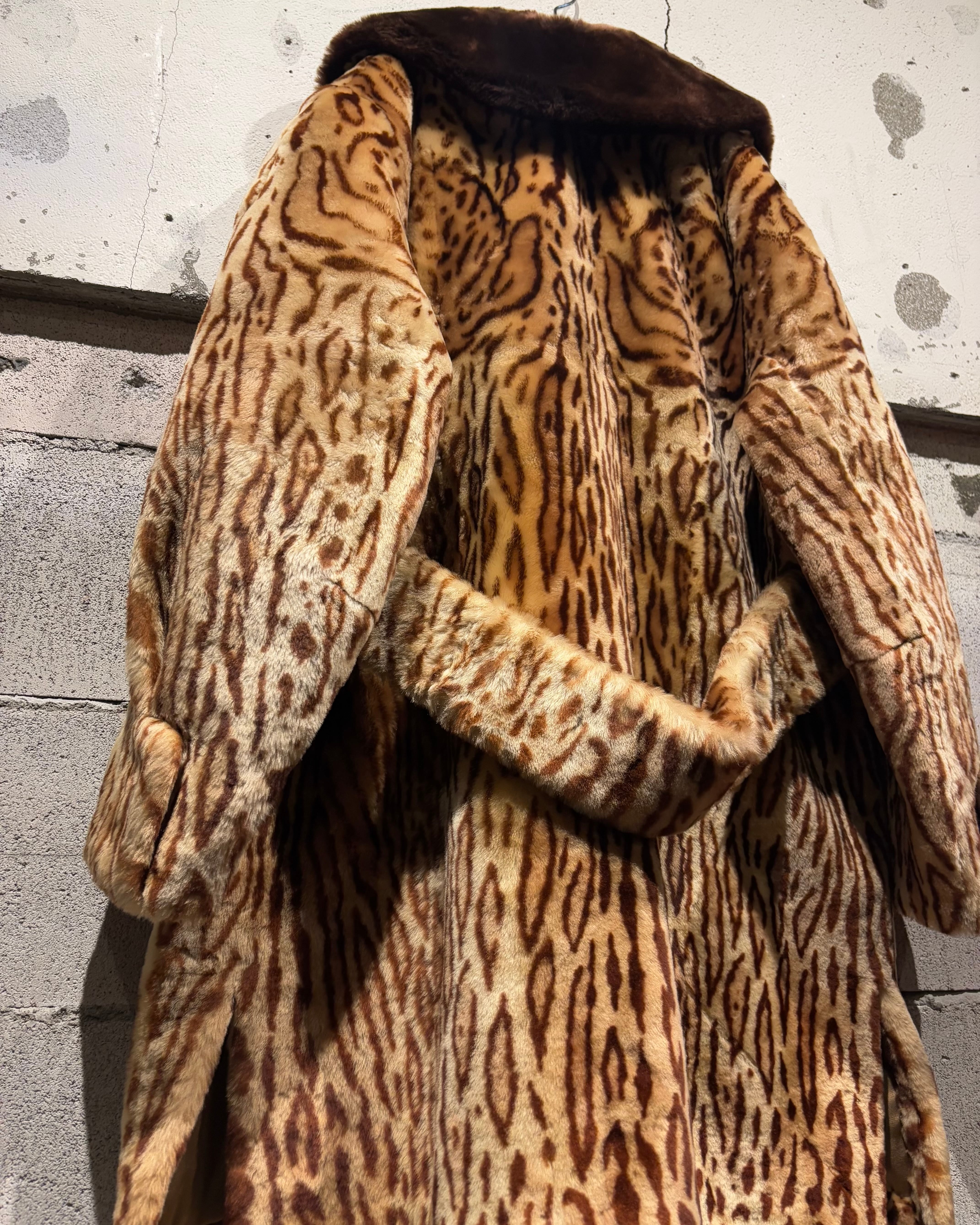 艶やかな光沢を帯びたアニマル柄のボディに、ブラウンの切り替えが印象的な、リアルファーを用いたコート。