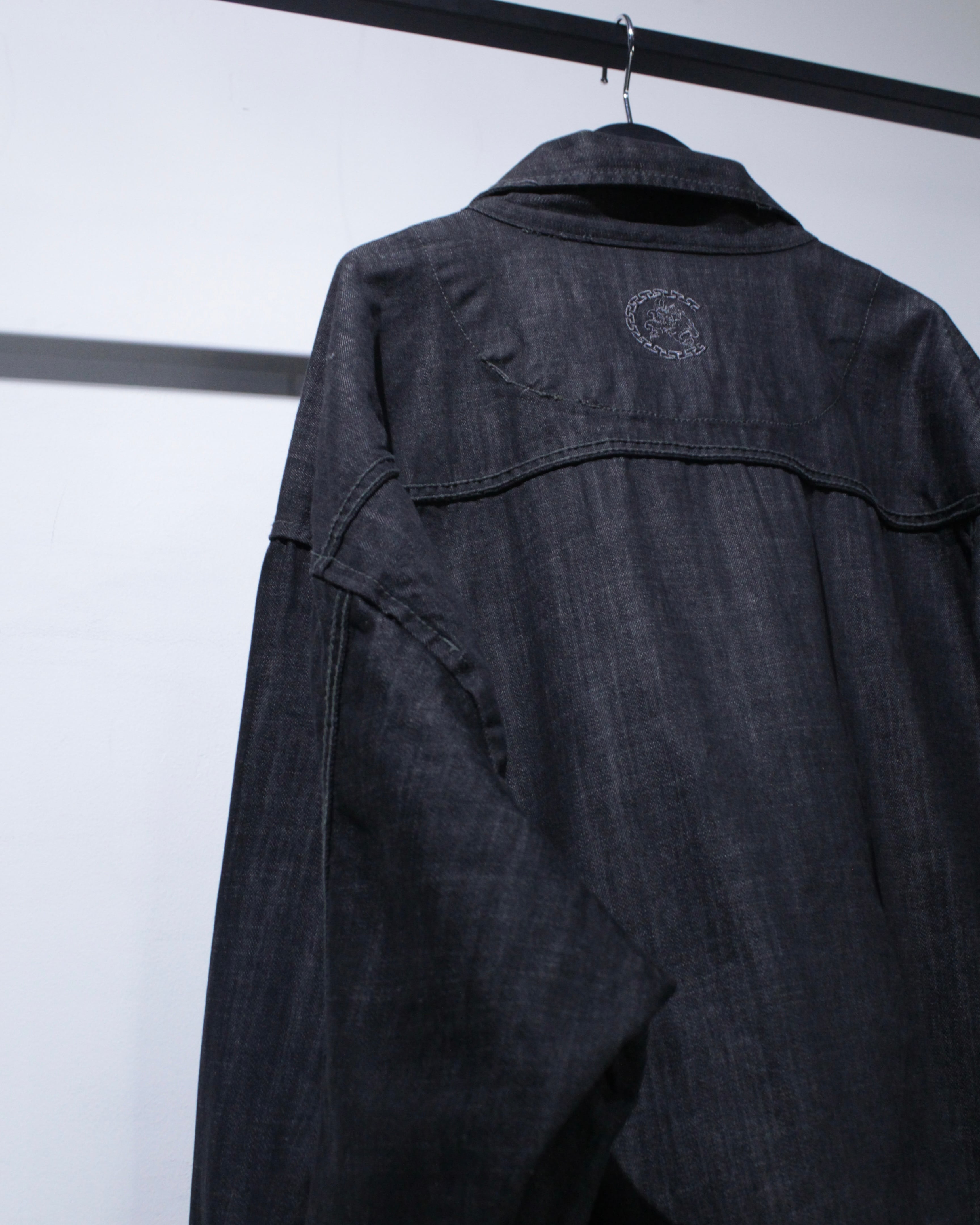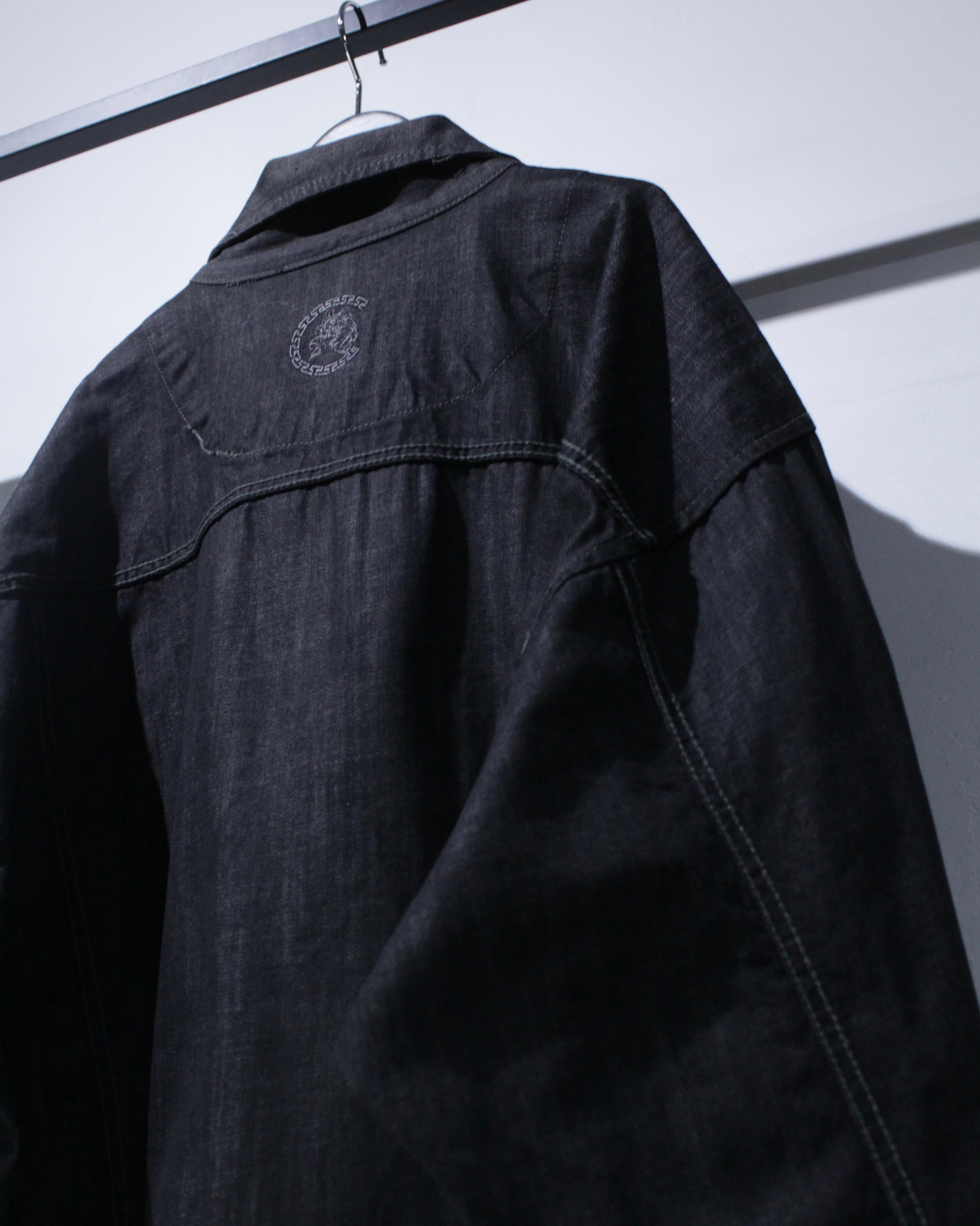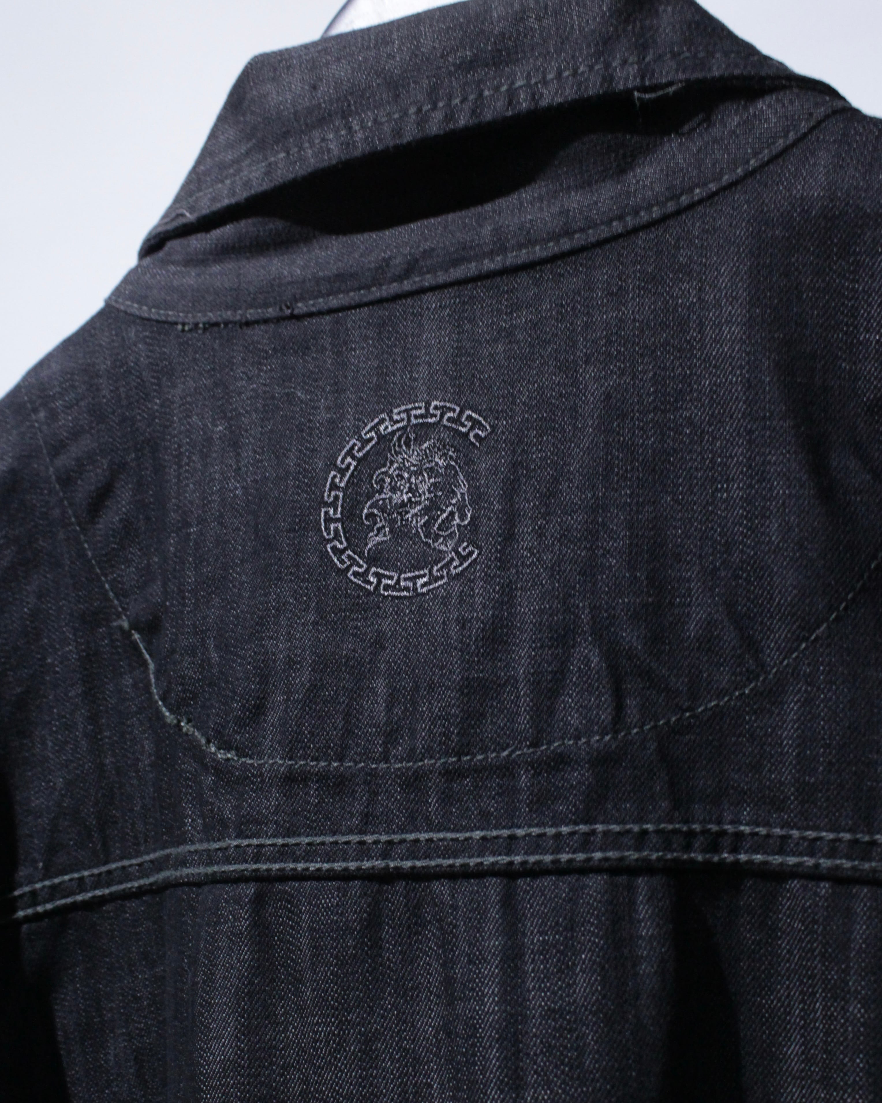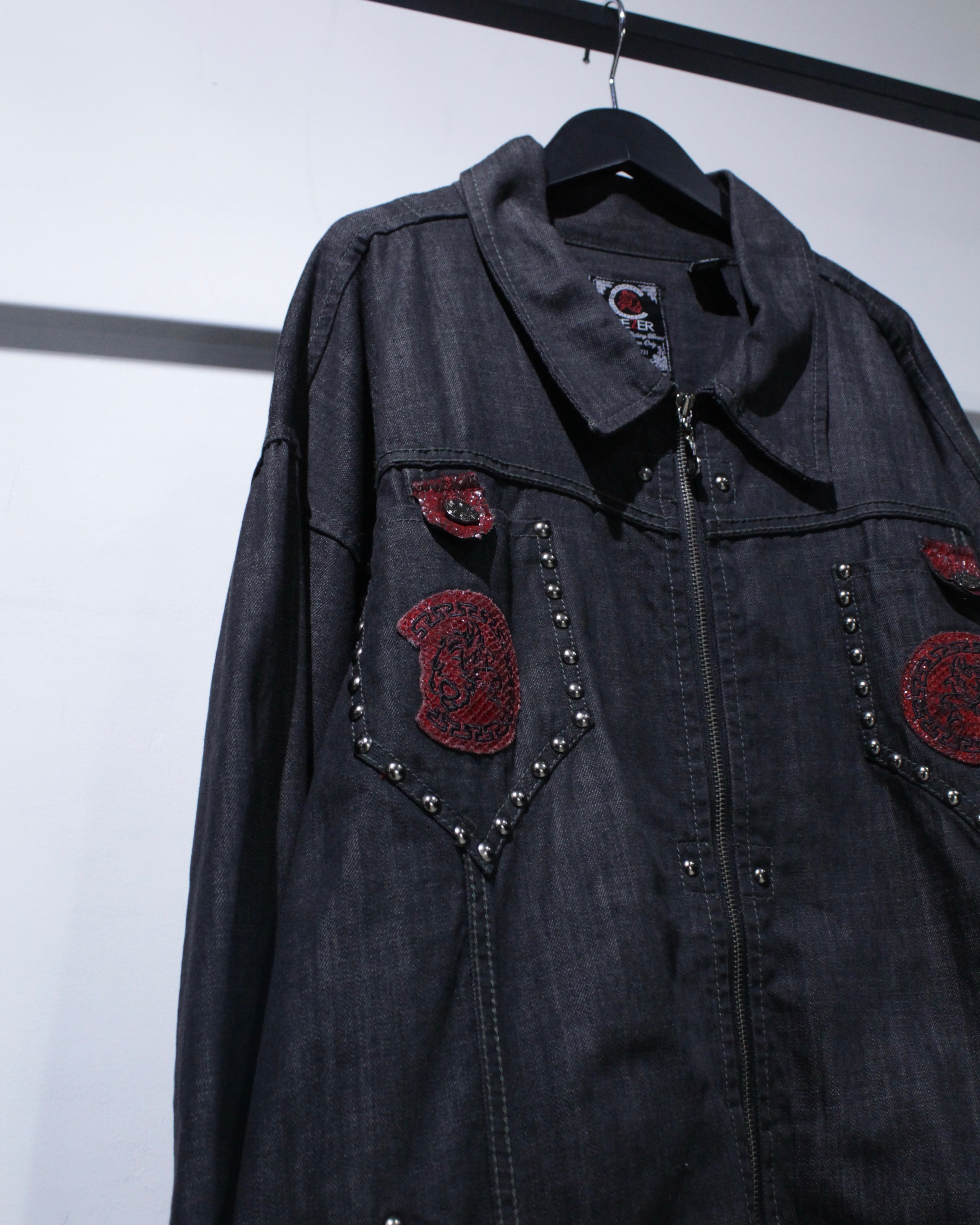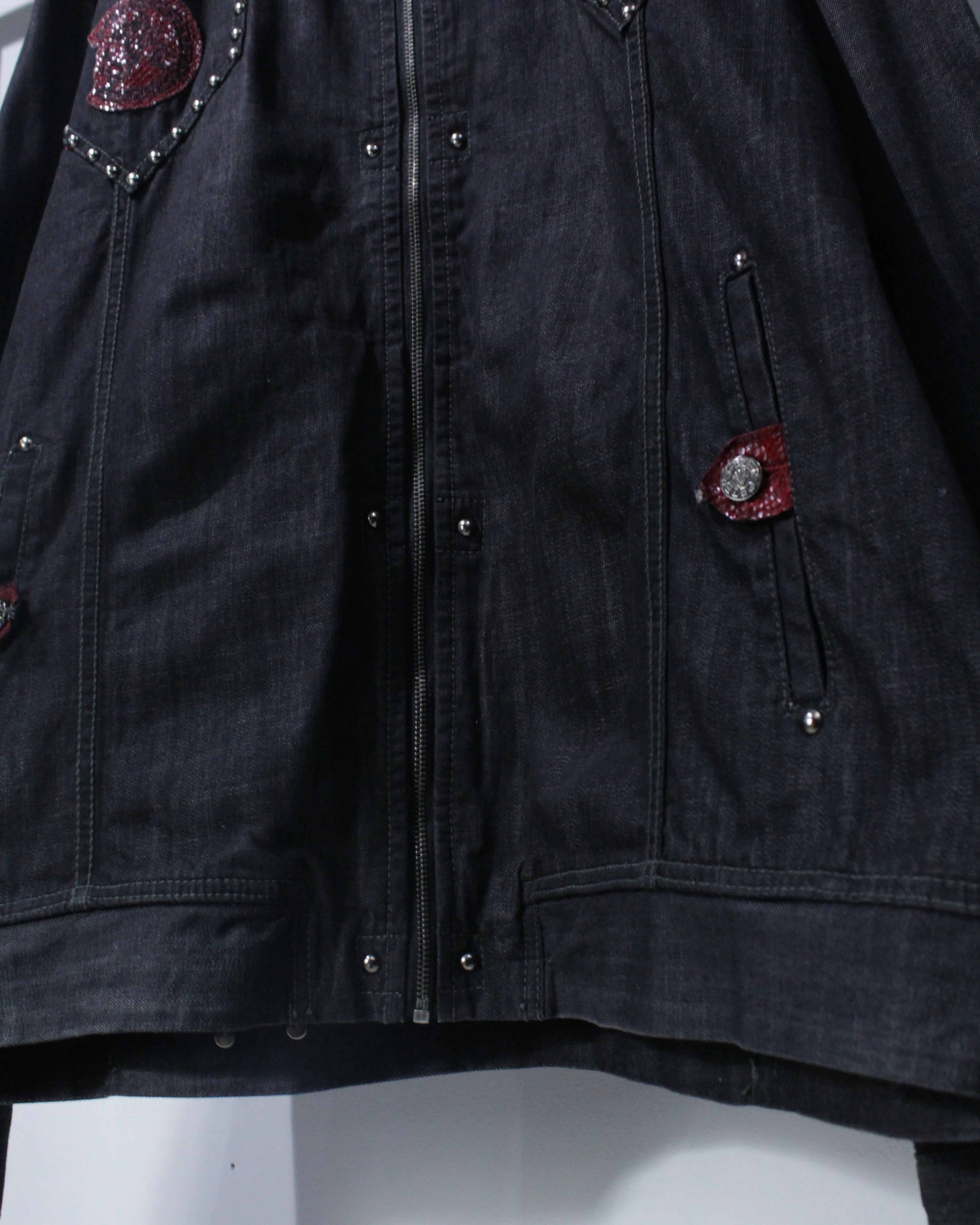 ブラックデニムをベースに、フロントのパッチポケットにはワッペン、ポケットや随所に光り輝くシルバーのスタッズを載せたデニムジャケット。