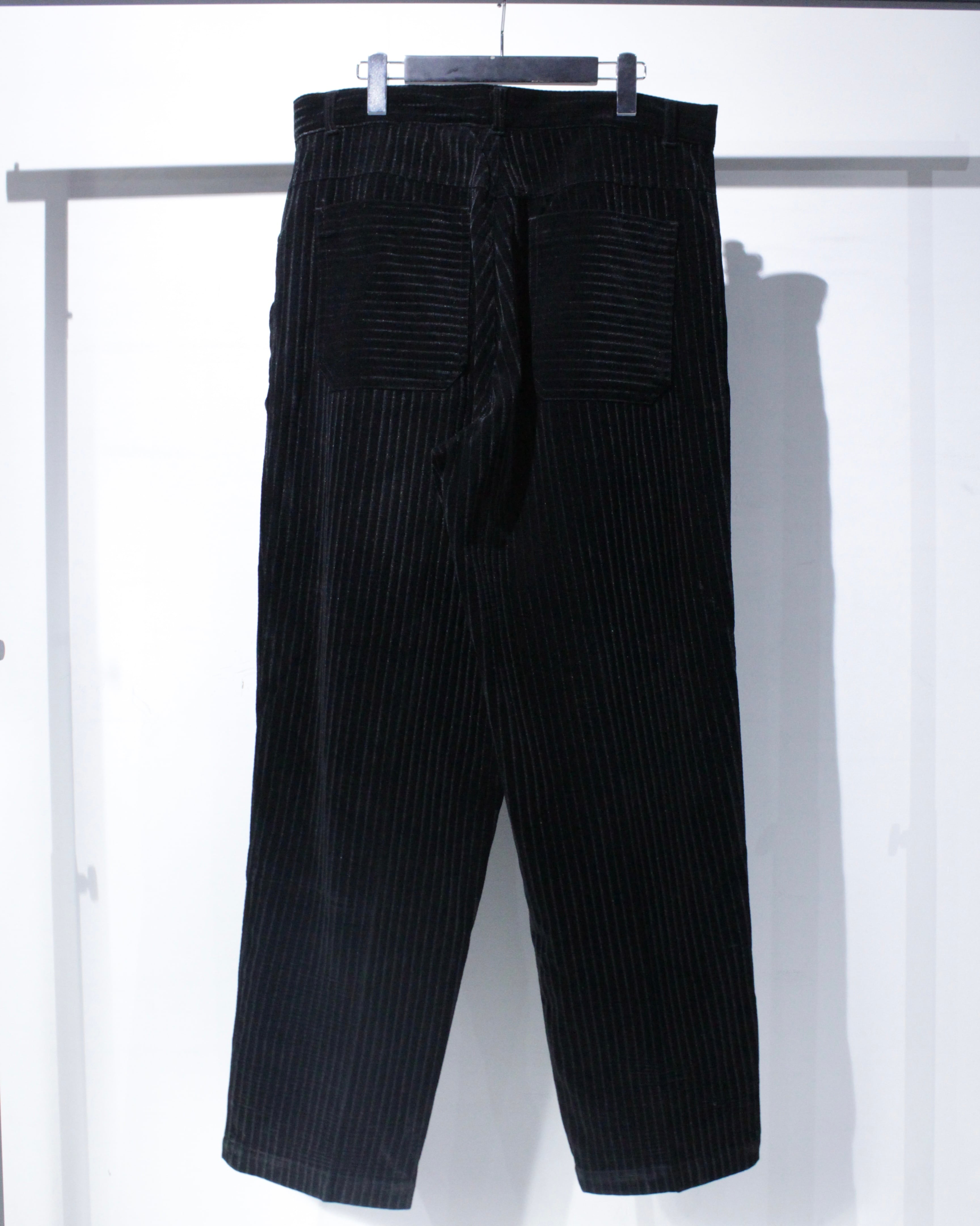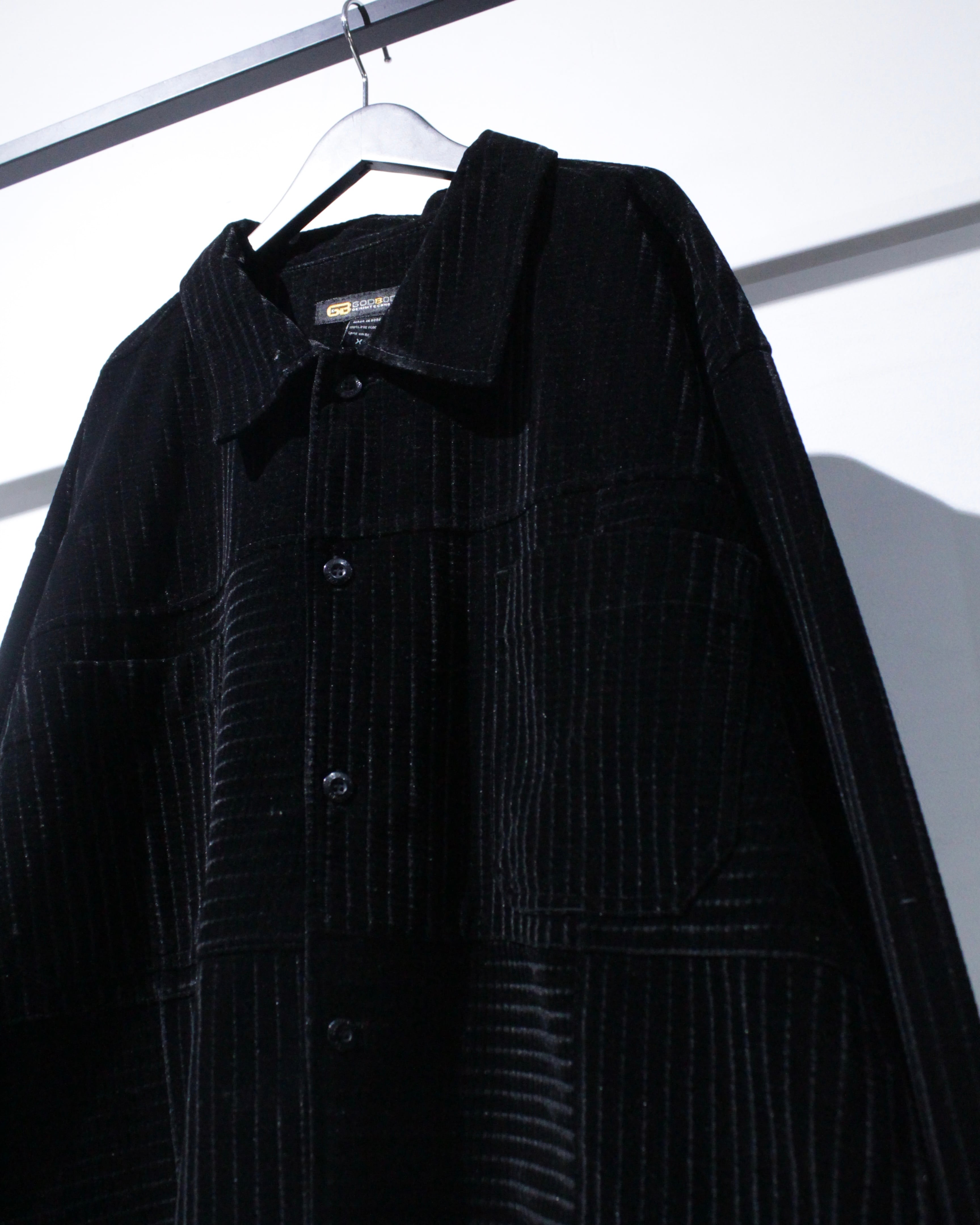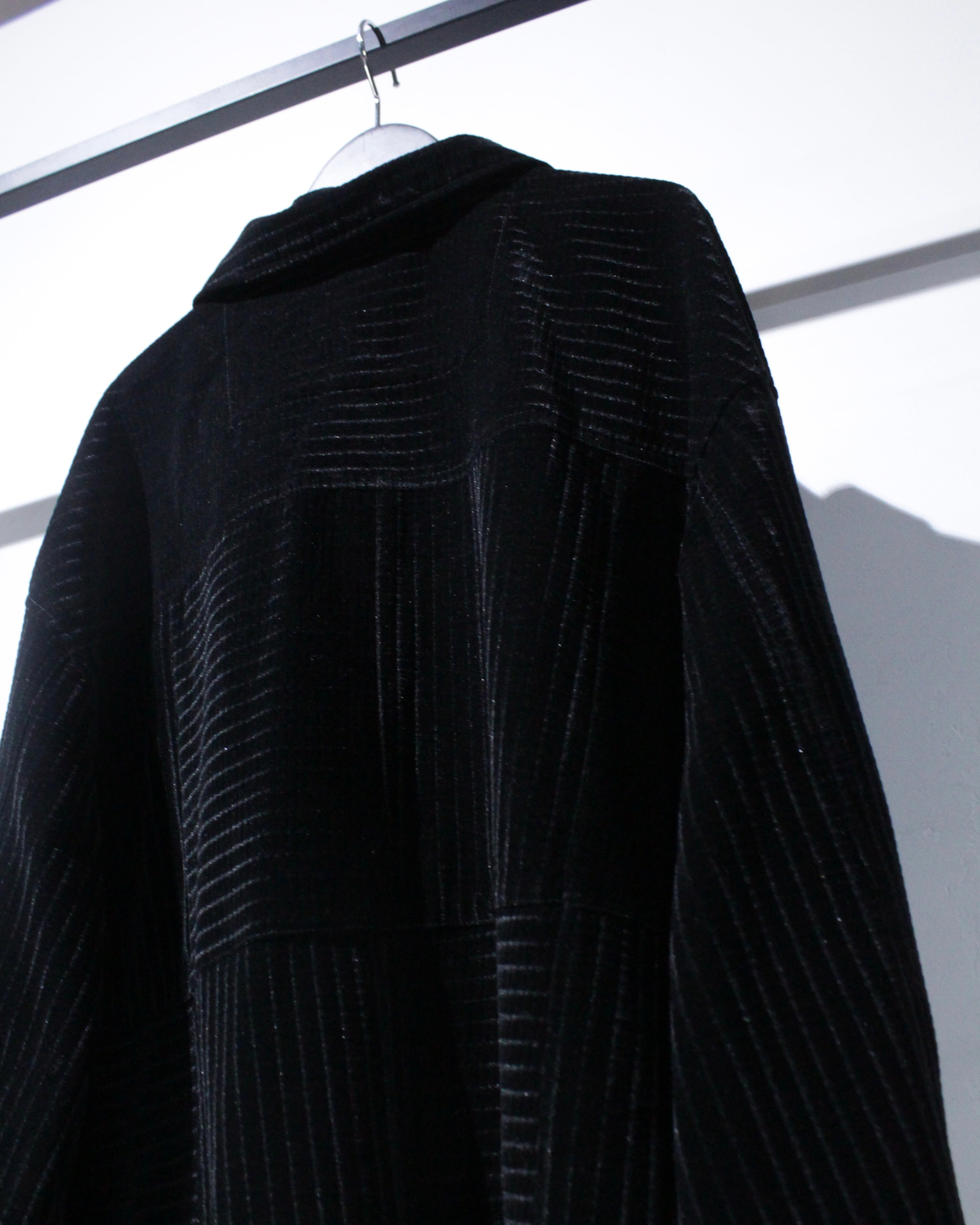 ジャケットはオーバーサイズのシルエットに設計され、フロントはボタンダウンでシンプルに構築。ポケットの切り替えや縦横に走る畝の方向性を組み合わせたパッチワーク的なディテールも秀逸で、シンプルながらデザイン性の高さを感じさせます。