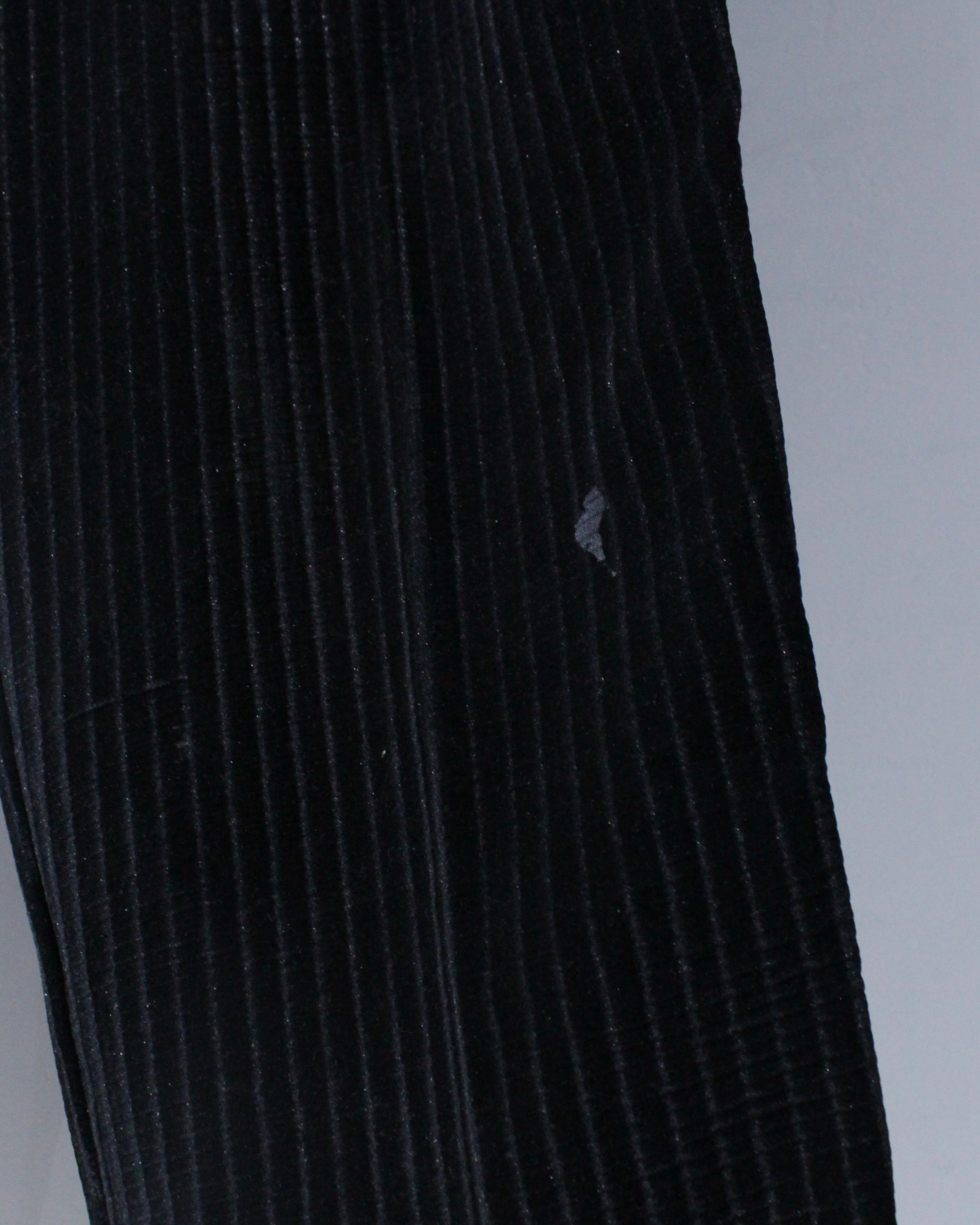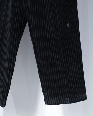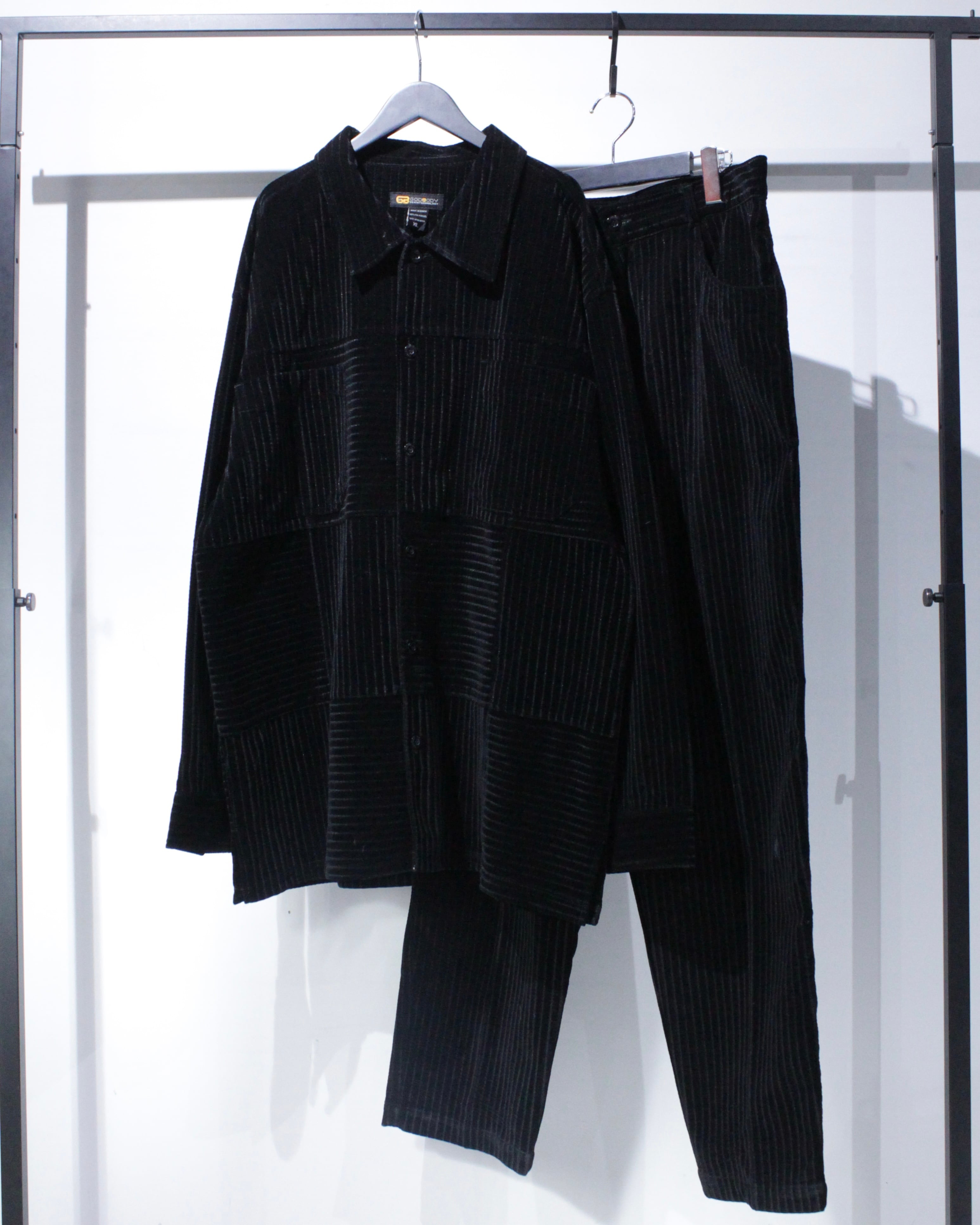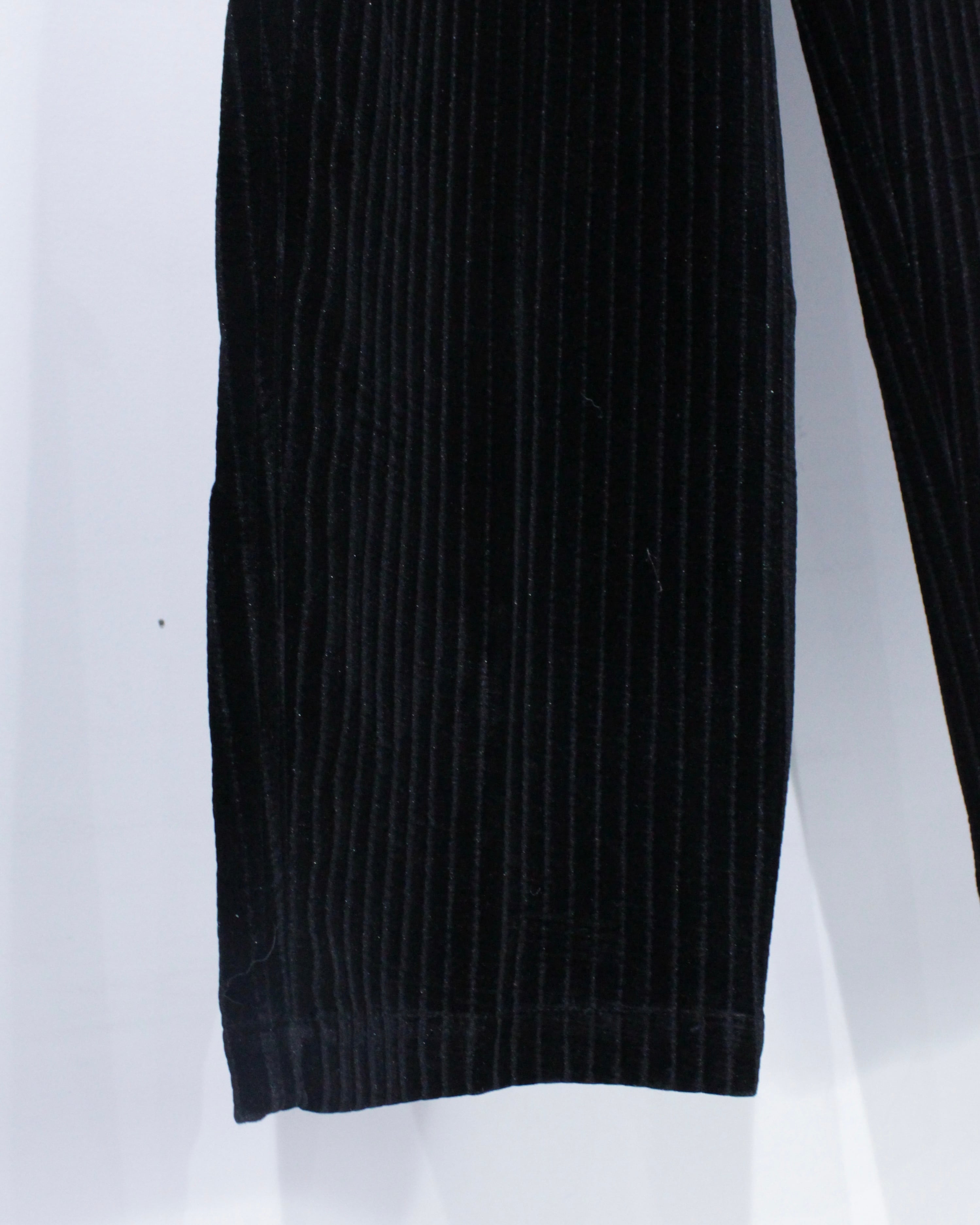 ブラックを基調とした、畝のあるベロアのようなテキスタイルを用いたセットアップ。
