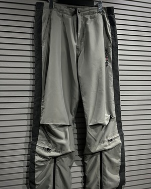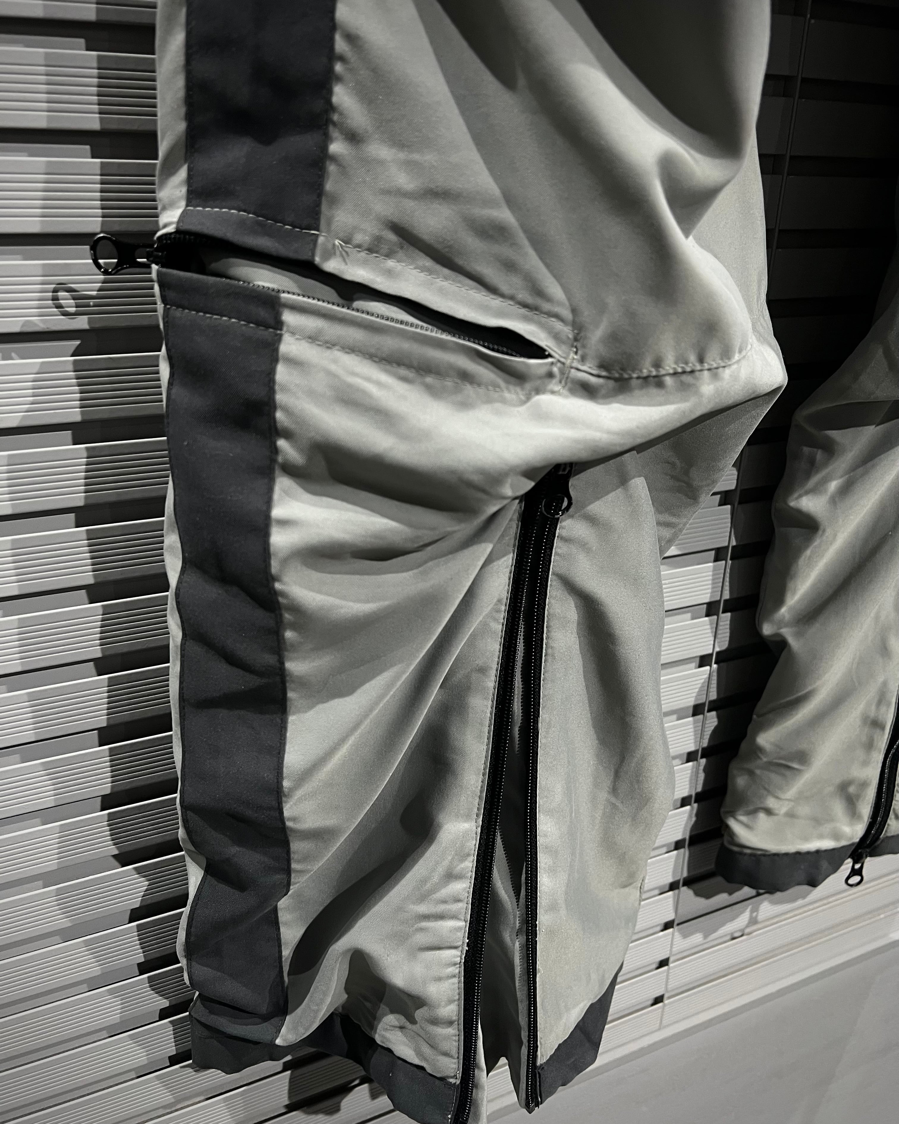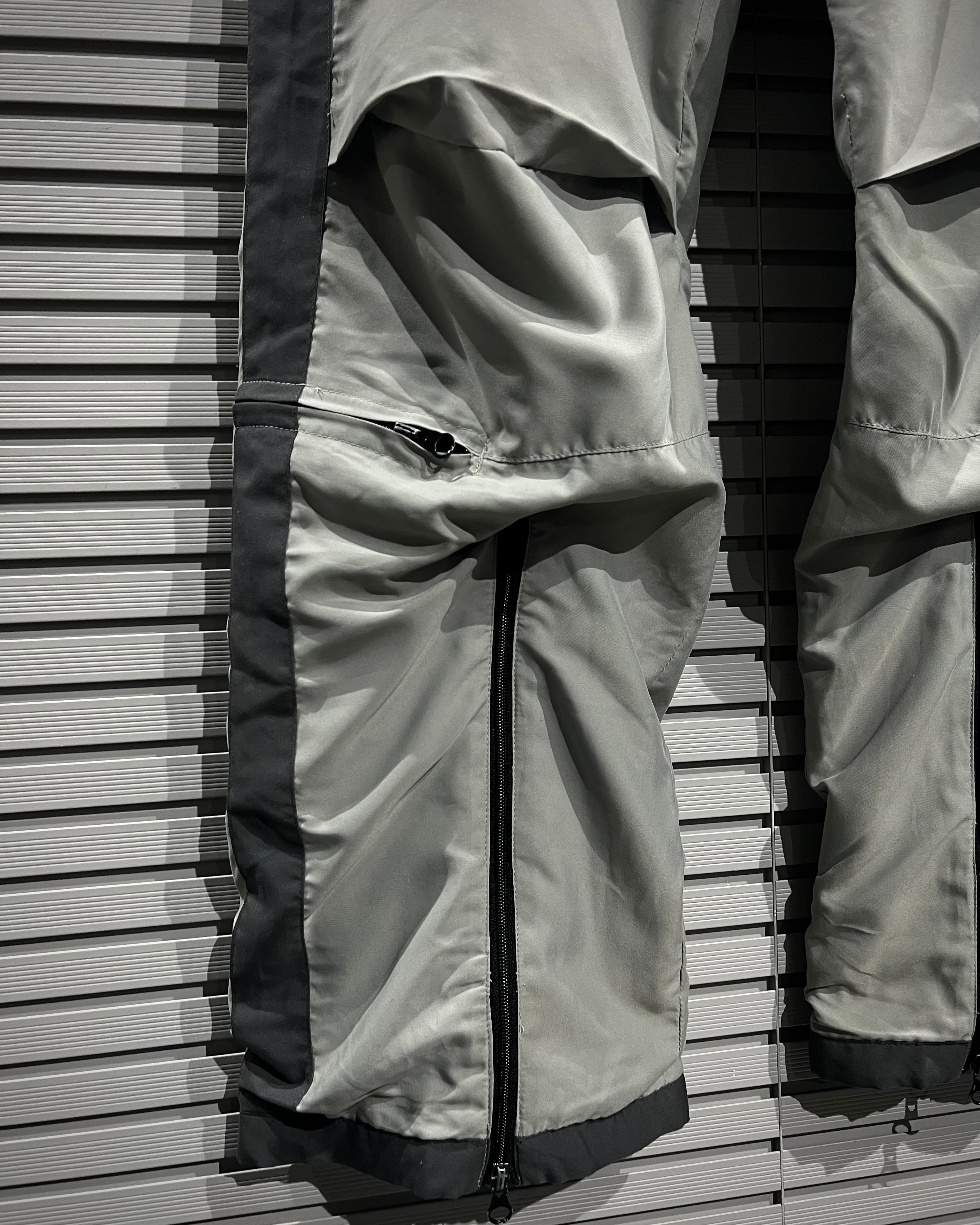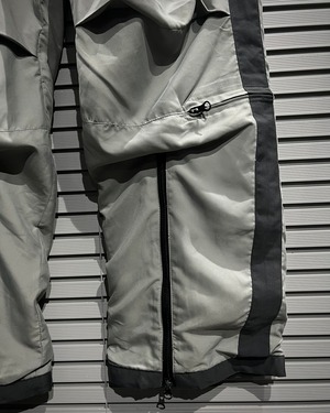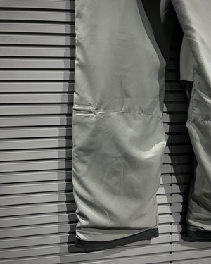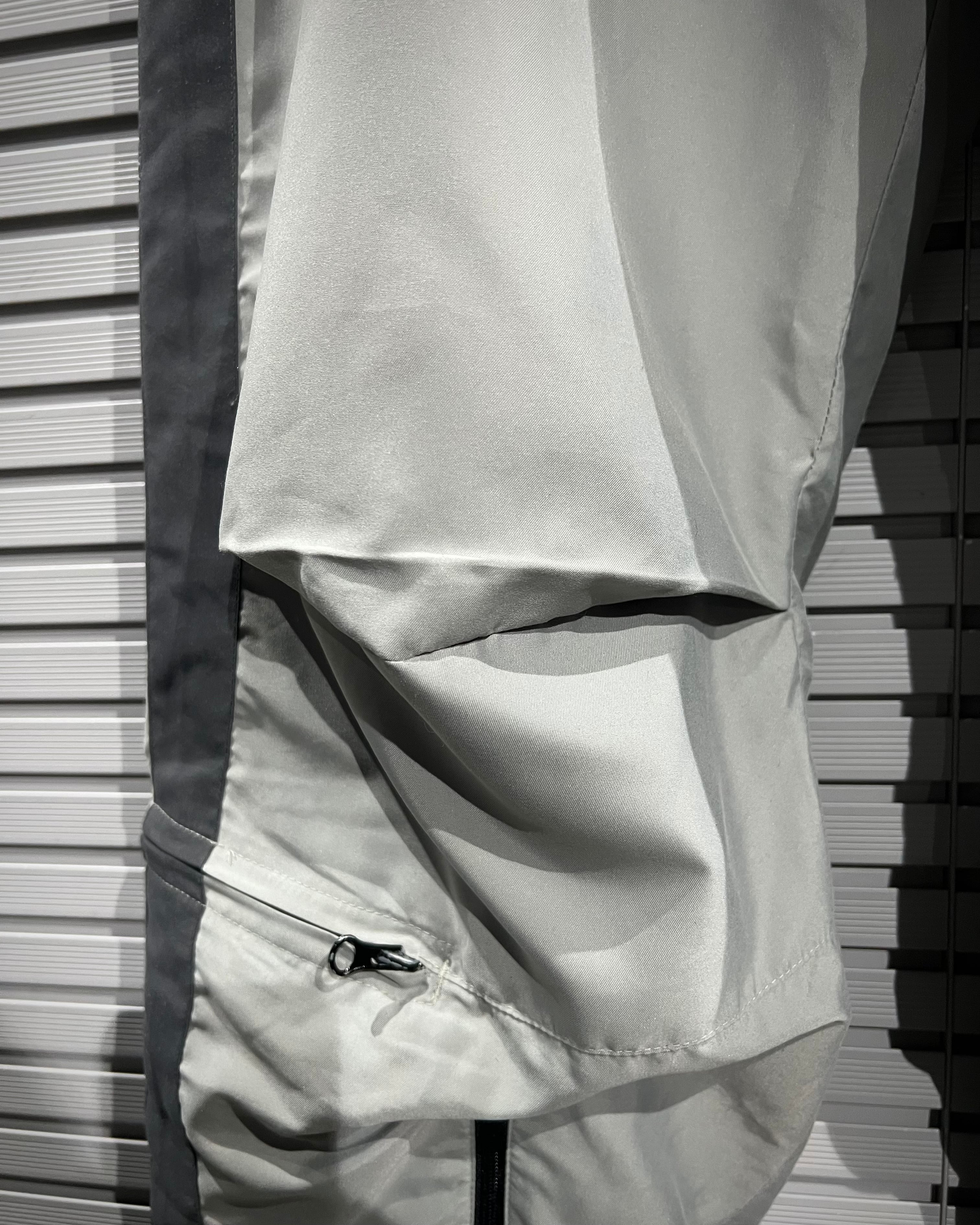 ボディは軽やかなポリエステルシェルをベースに、サイドにはグレーのラインを配置。膝付近にはアクションプリーツ、ジップによるギミックを搭載。シルエットの変化やレイヤードを楽しめる設計で、ブランドらしいこだわりがしっかりと詰め込まれています。