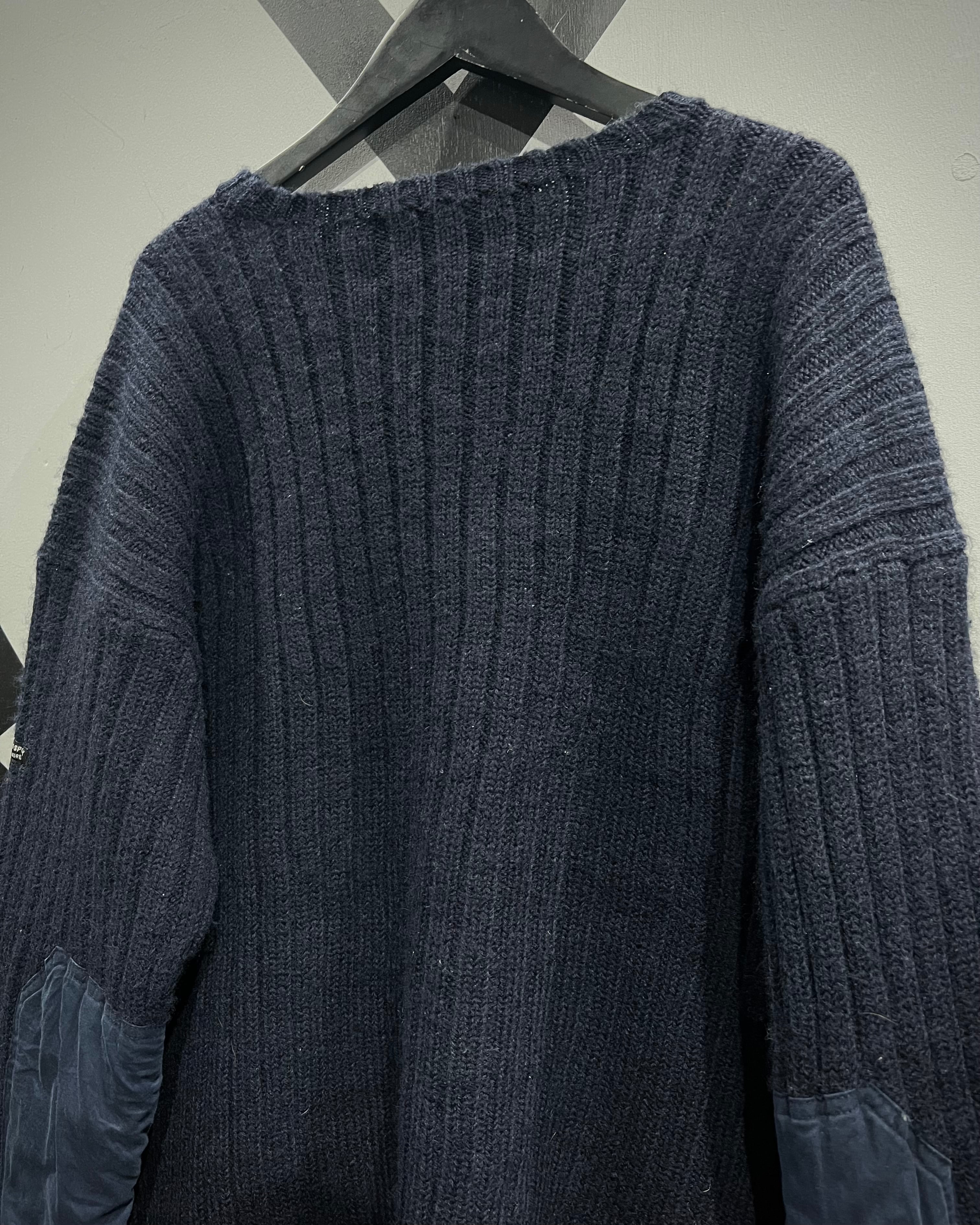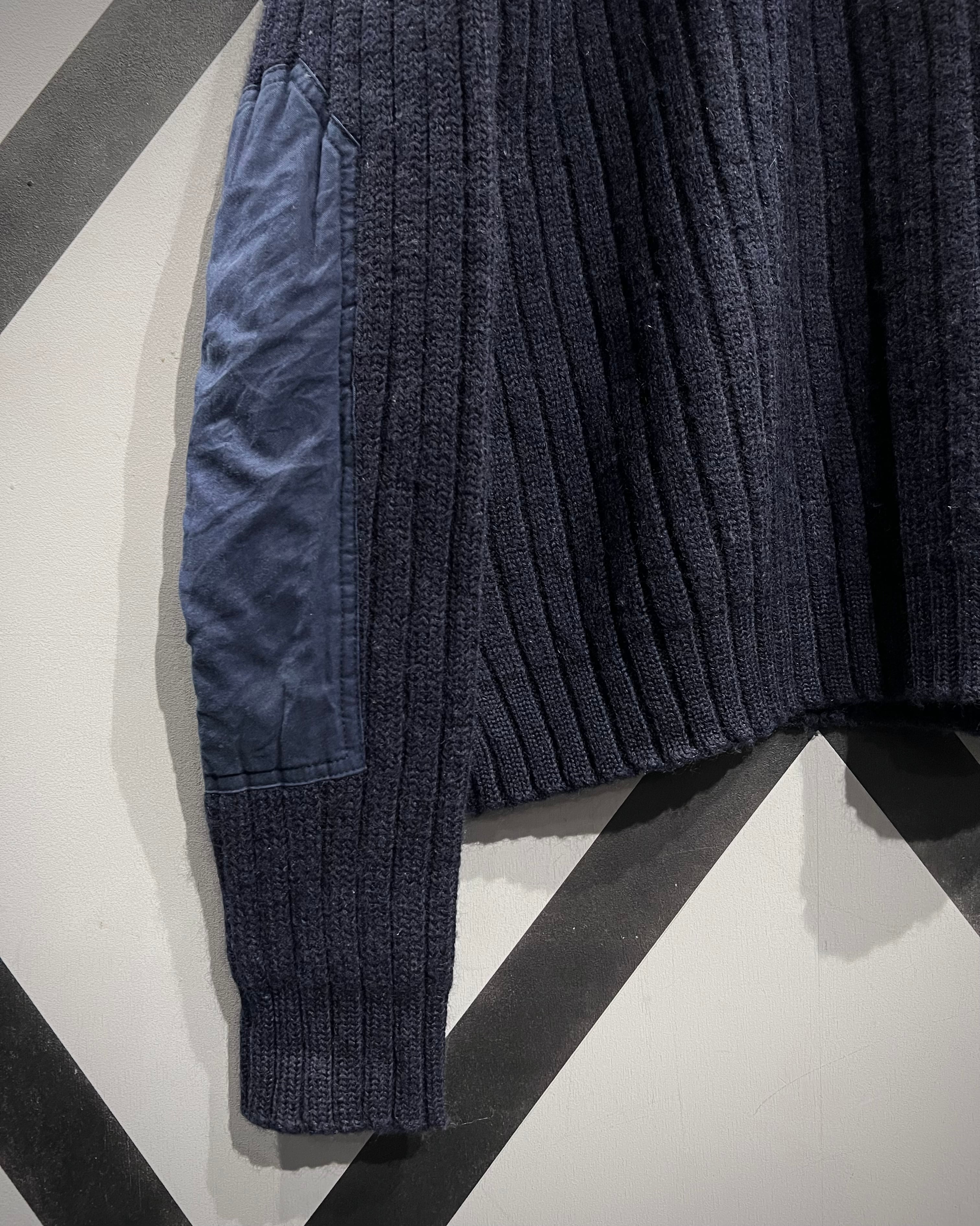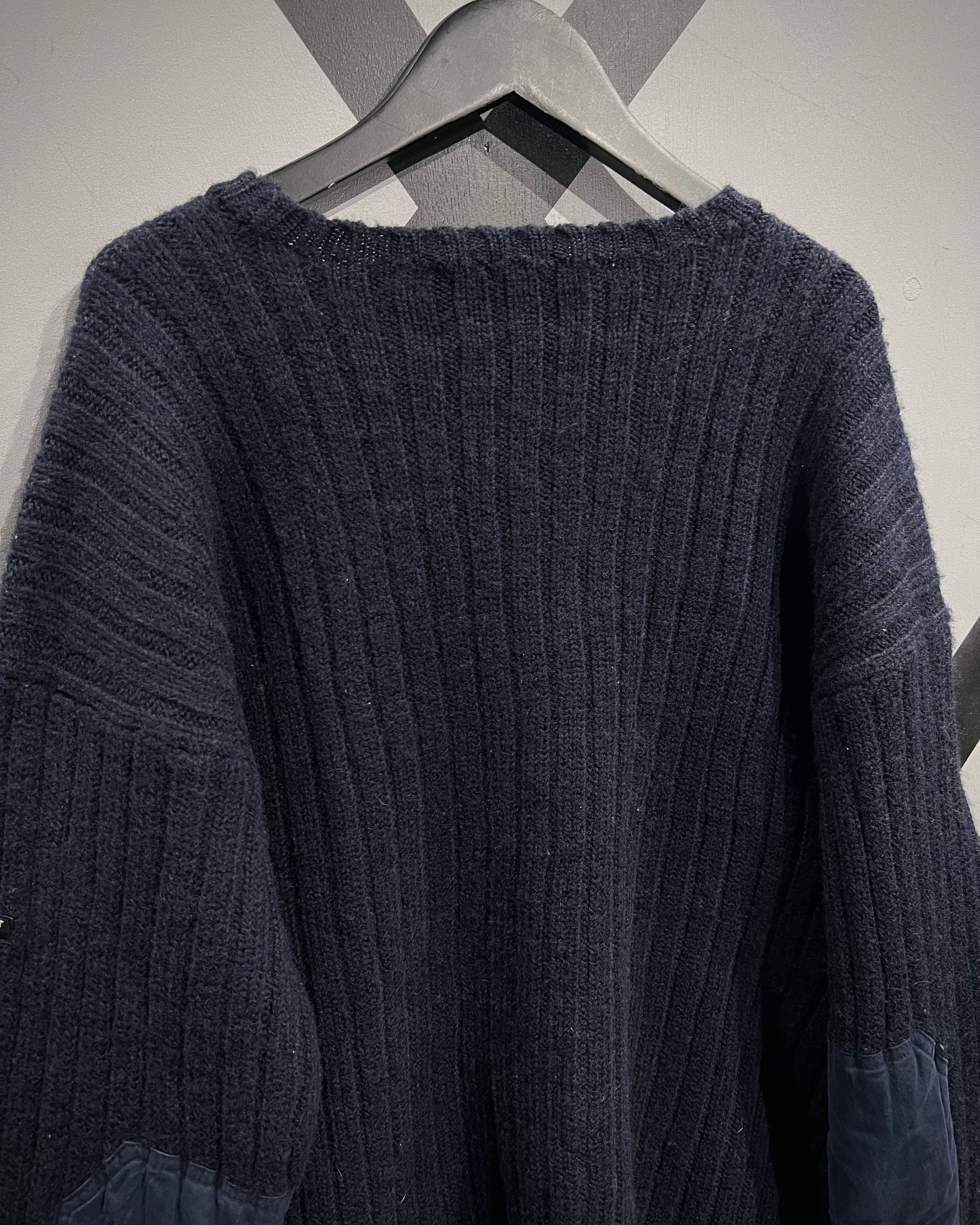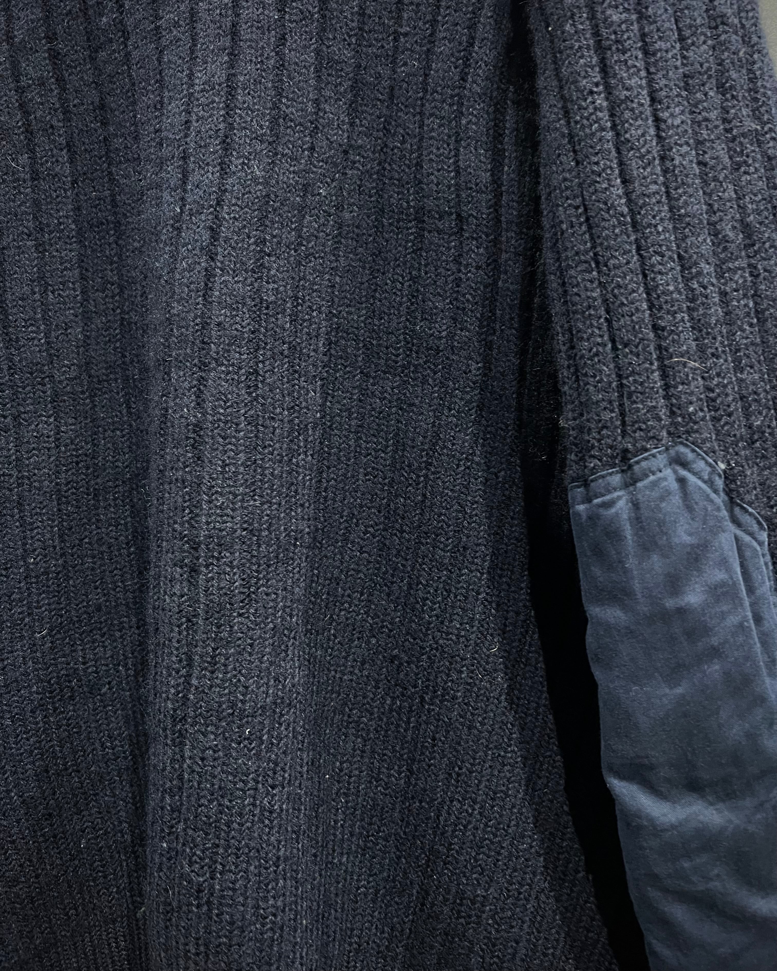 ベースは肉厚なウールニットで縦畝のリブ編みにエルボーパッチを施し、補強としての意味合いはもちろん、デザインとしても程よいアクセントをプラス。