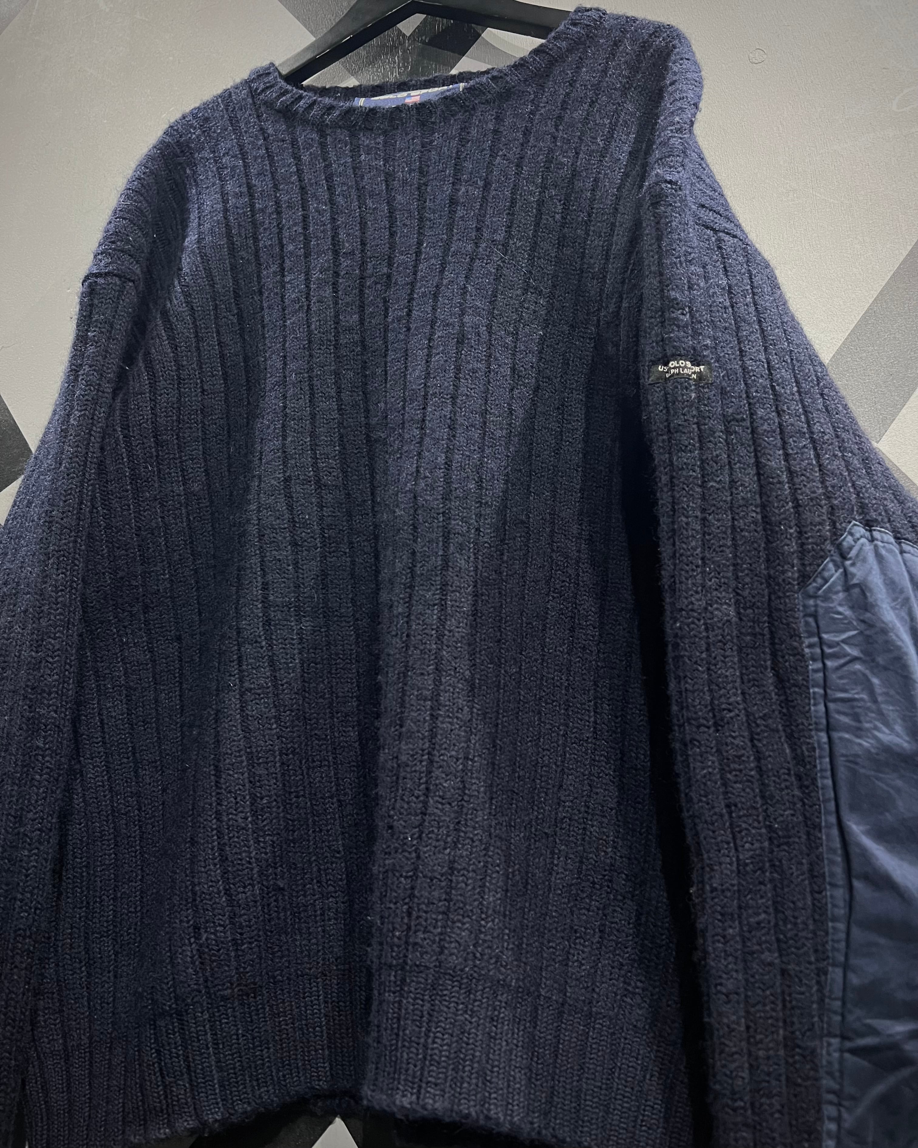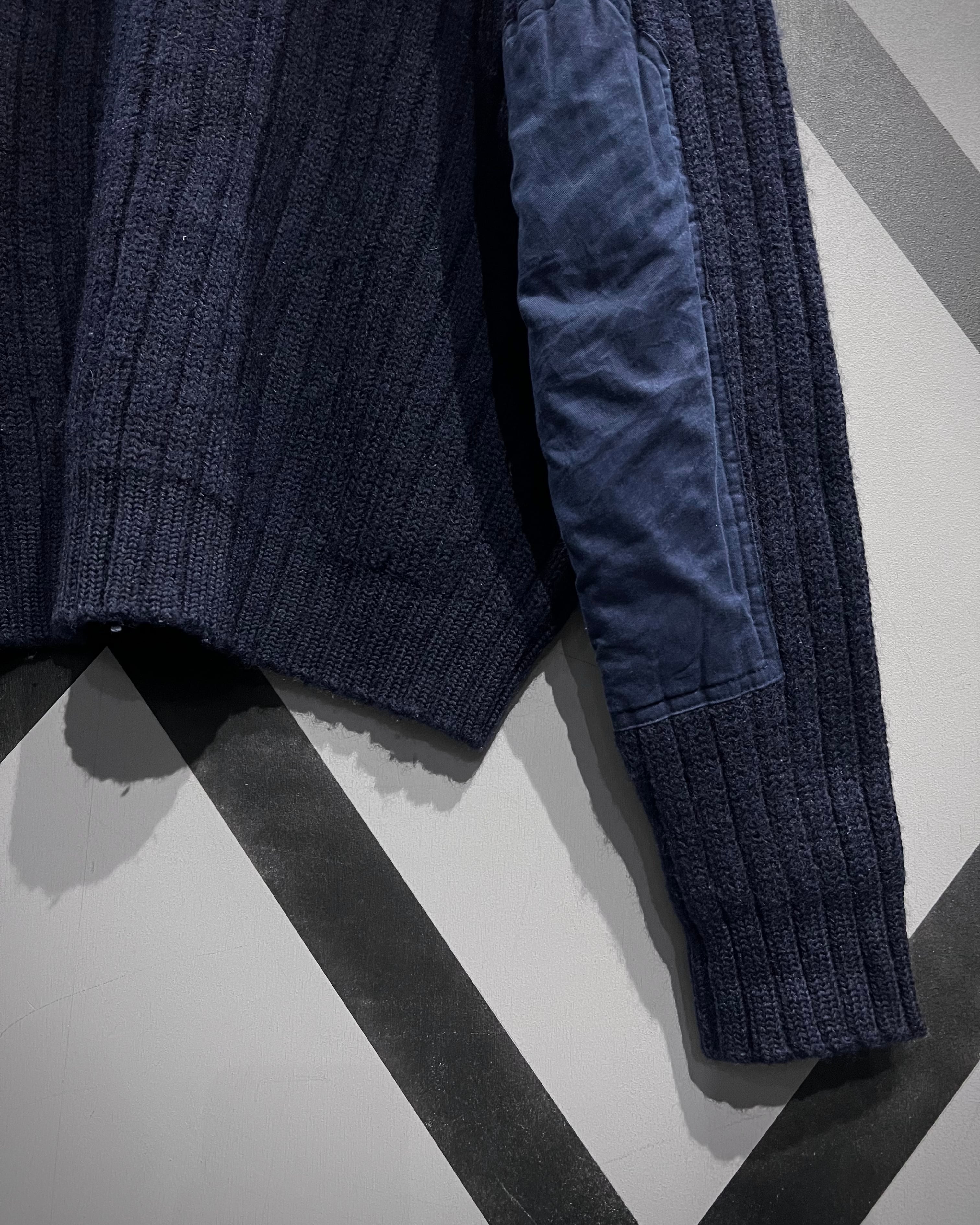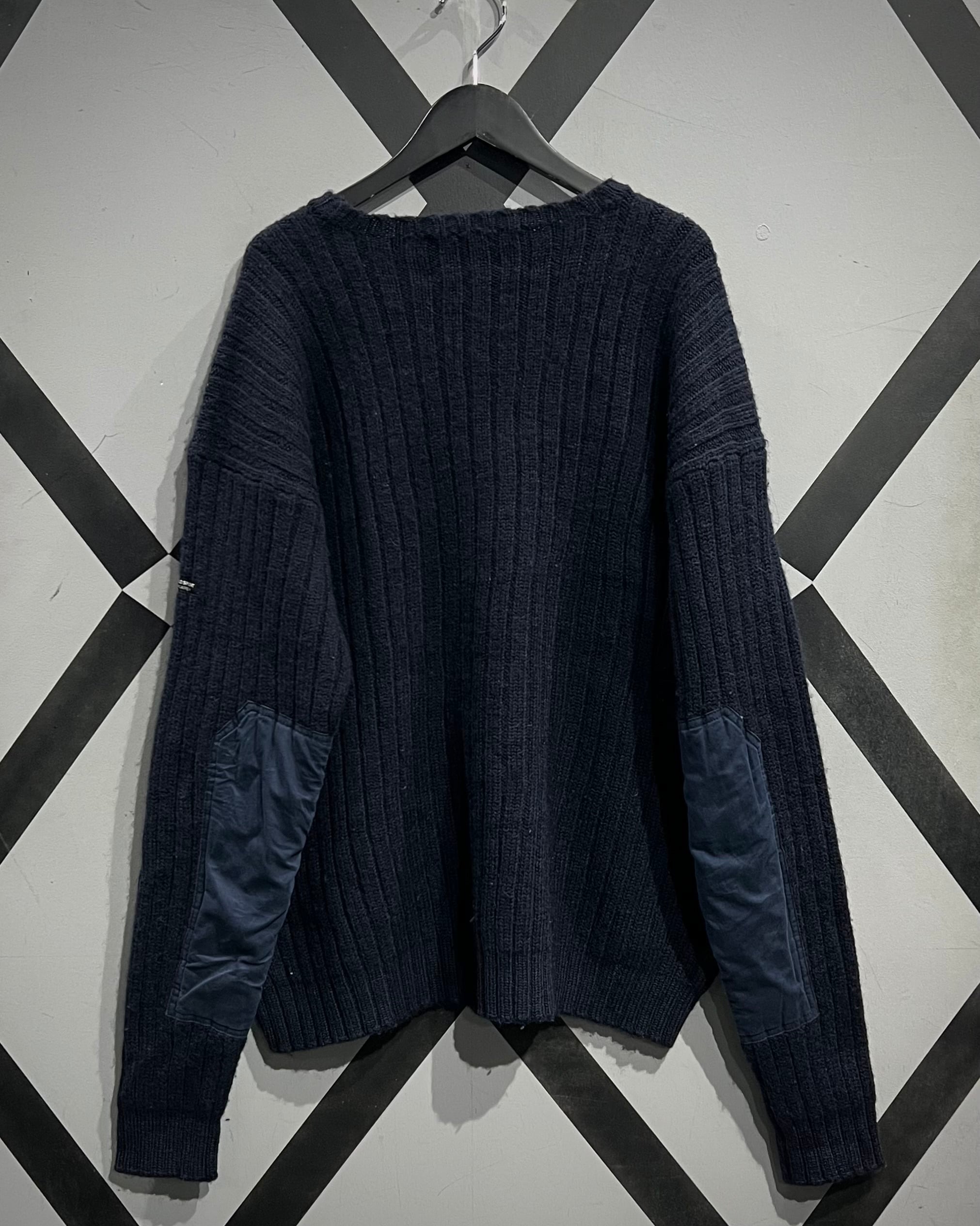 ベースは肉厚なウールニットで縦畝のリブ編みにエルボーパッチを施し、補強としての意味合いはもちろん、デザインとしても程よいアクセントをプラス。
