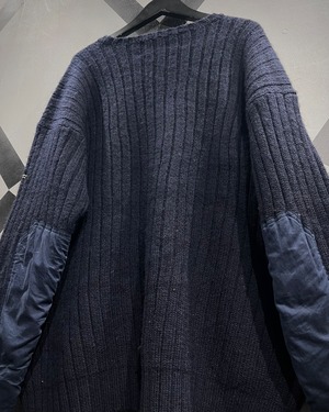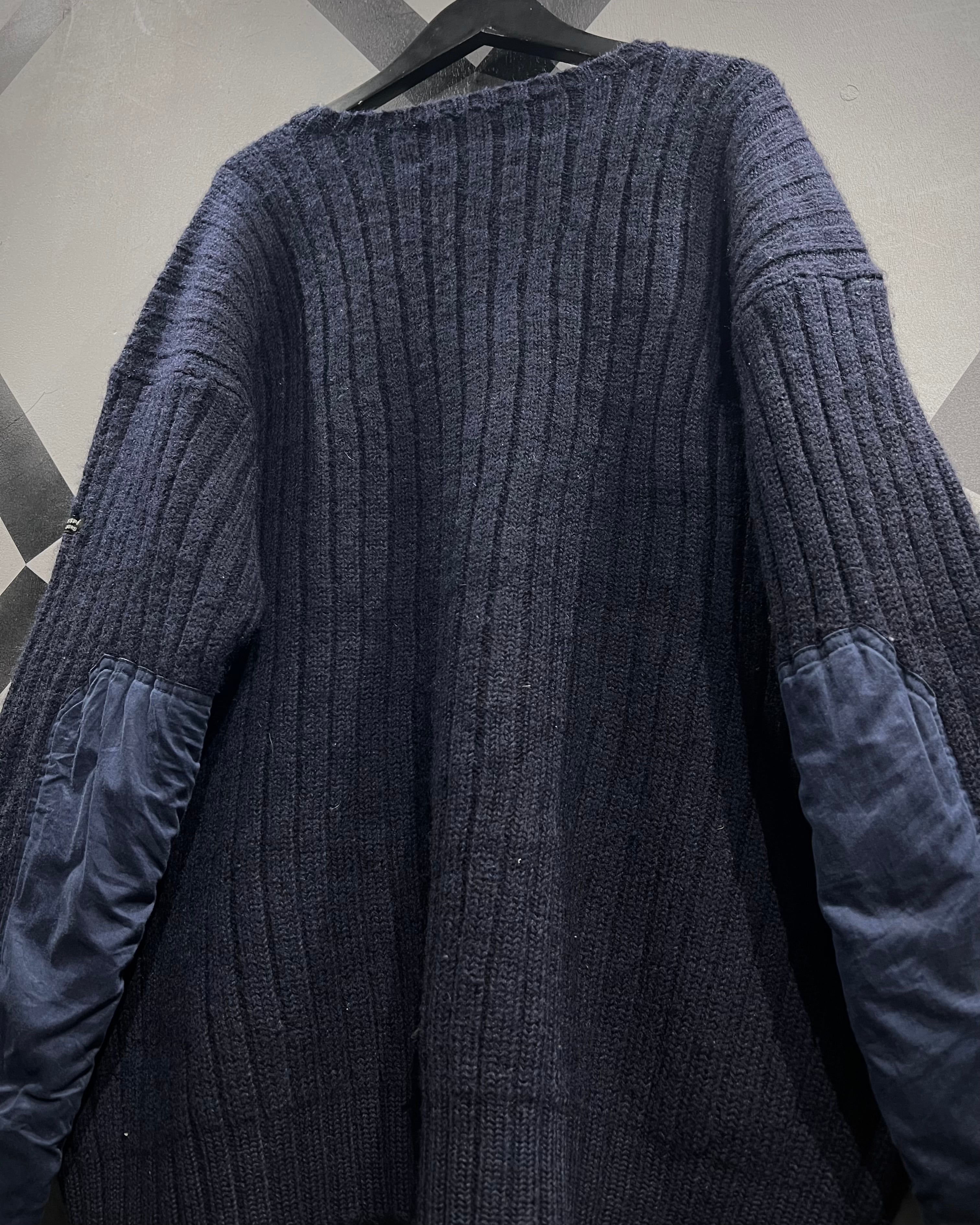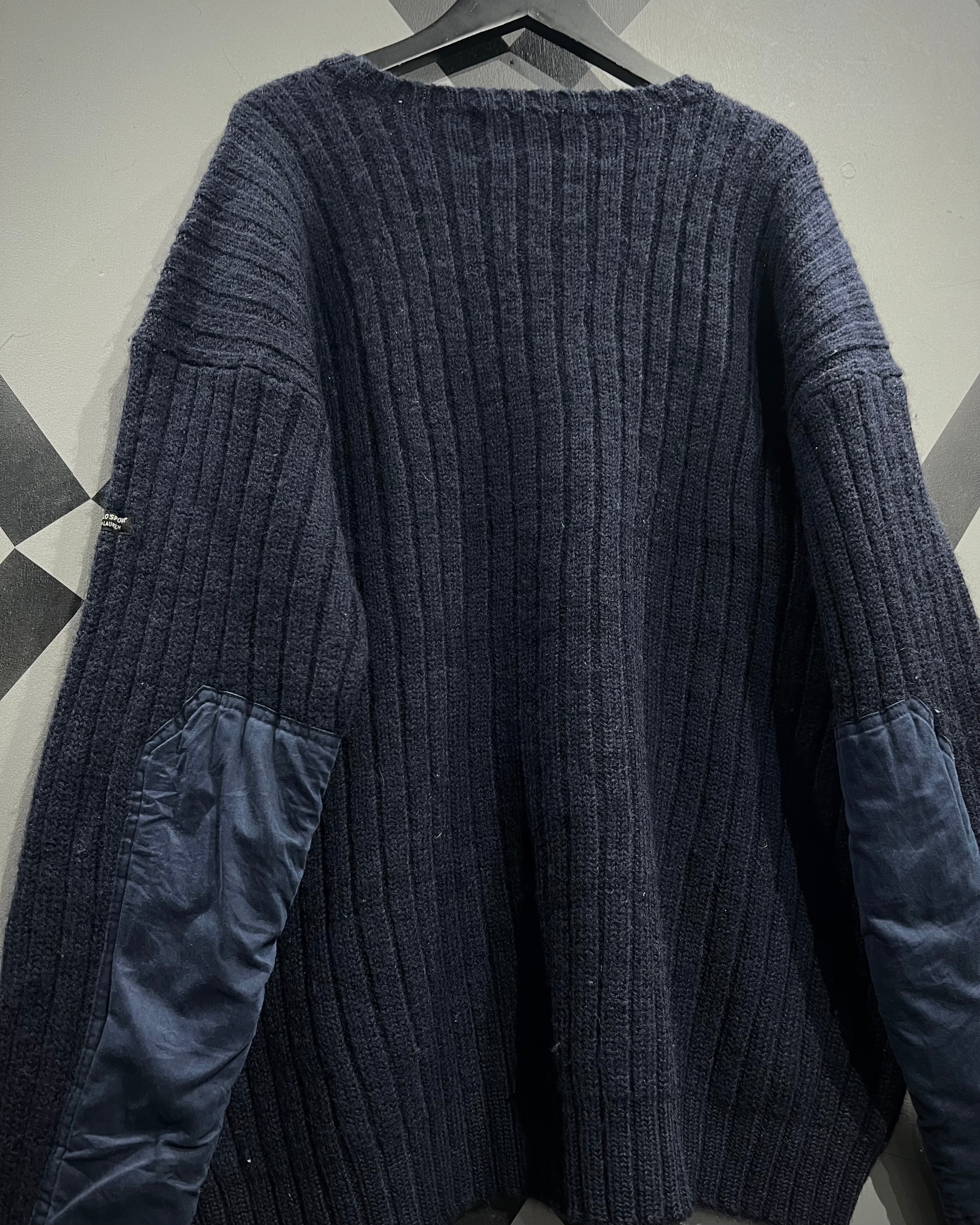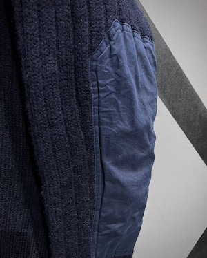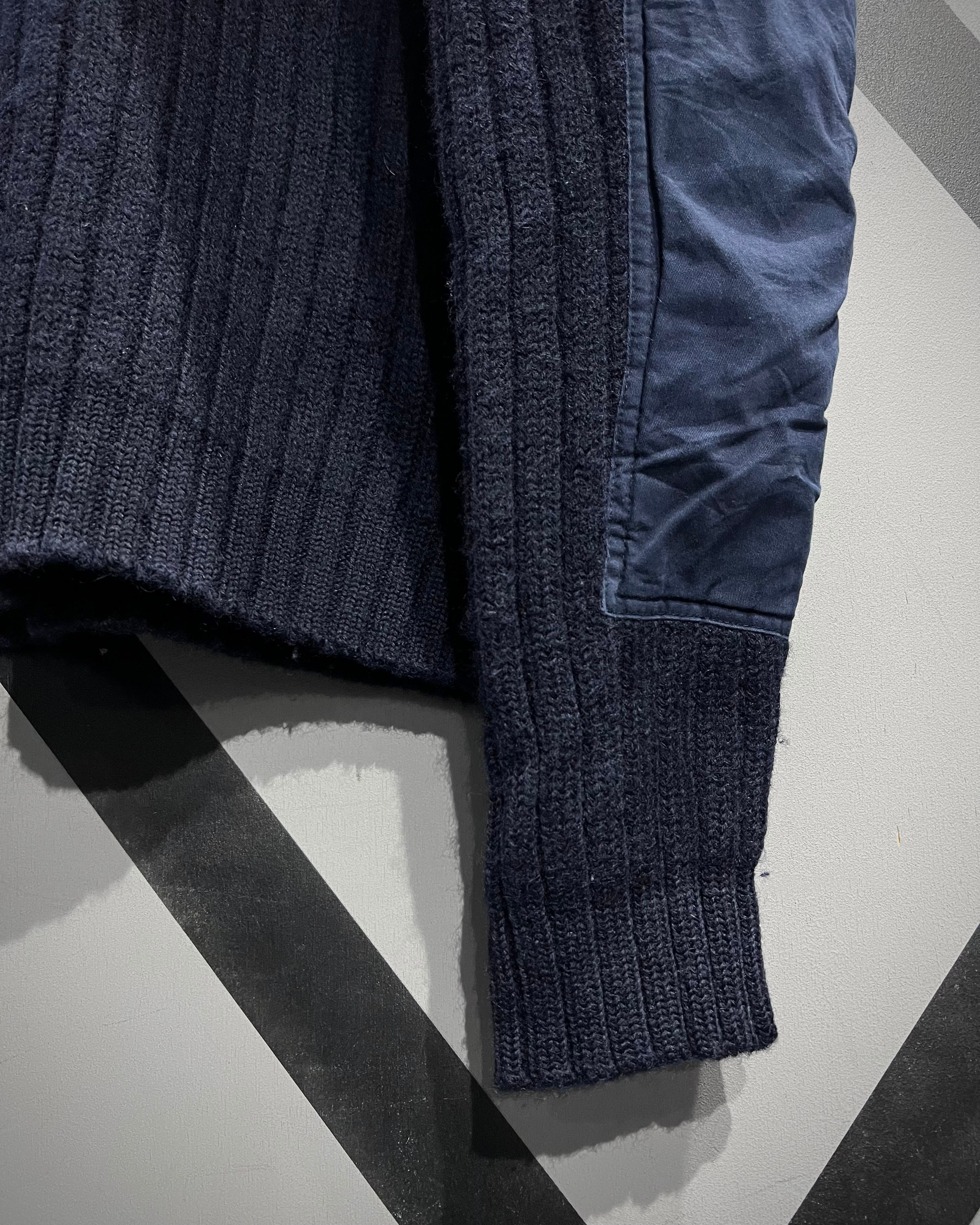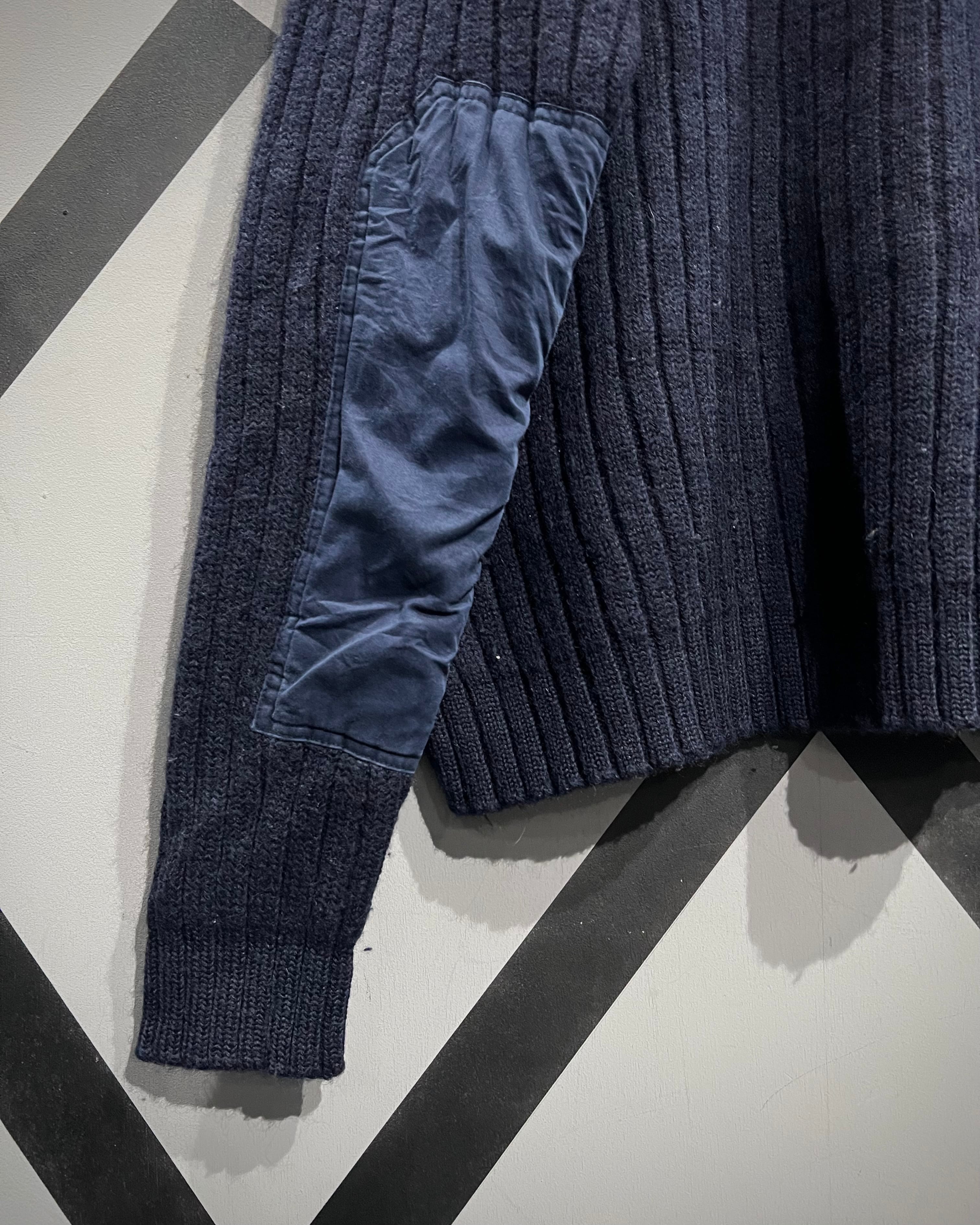 ベースは肉厚なウールニットで縦畝のリブ編みにエルボーパッチを施し、補強としての意味合いはもちろん、デザインとしても程よいアクセントをプラス。