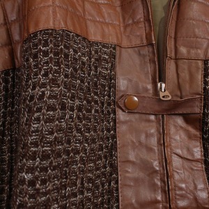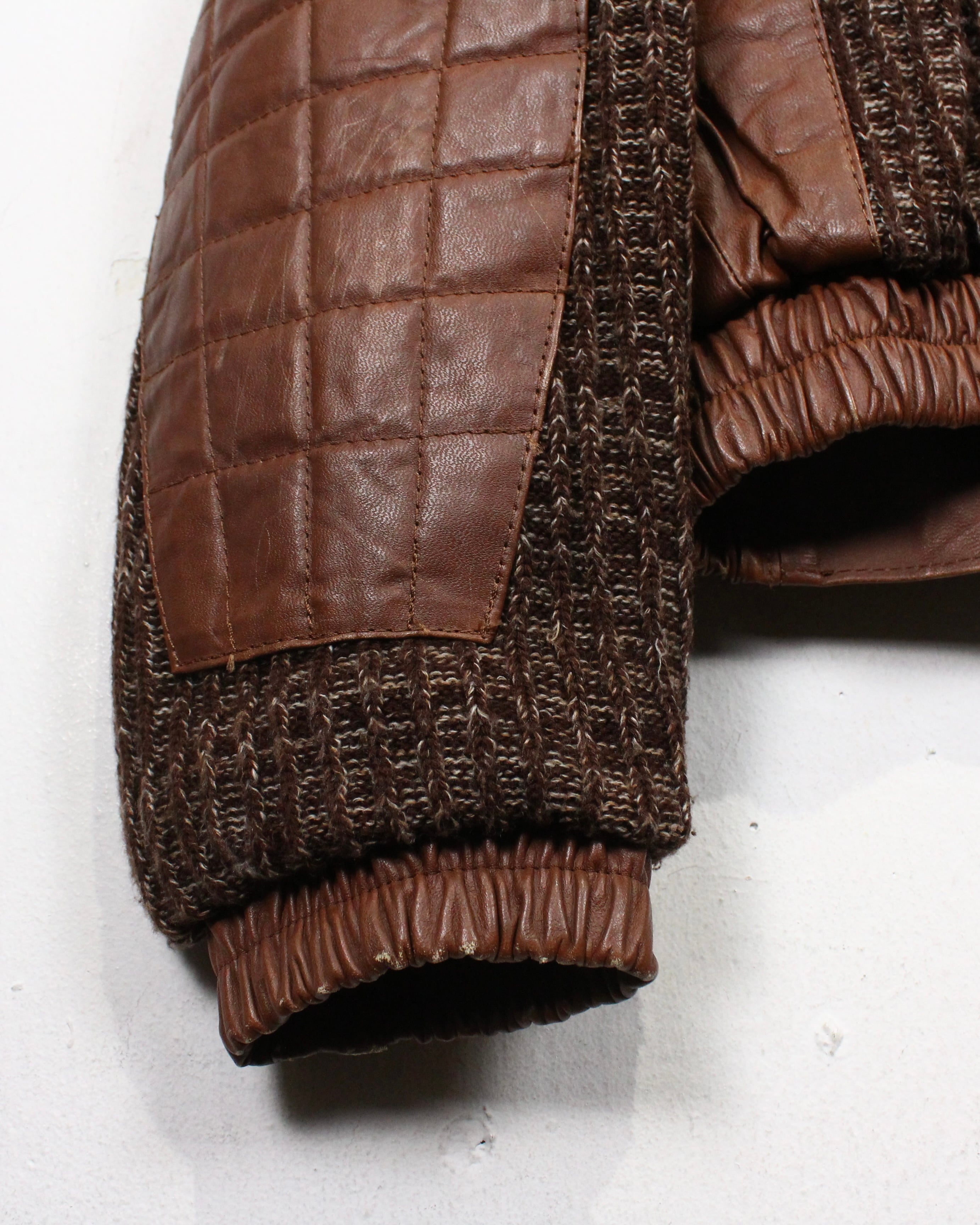 レザー部分には、しっかりとした厚みとシボ感のあるブラウンレザーを使用。キルティング状にステッチを走らせることで、視覚的な立体感を表現。一方でニット部分は、ざっくりとした編み立てが印象的で、奥行きのある表情を演出しています。