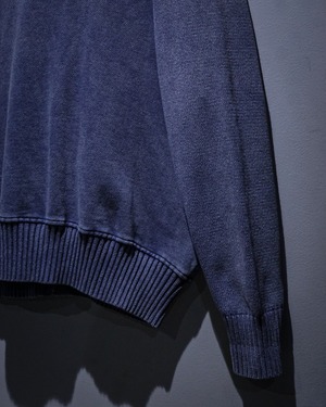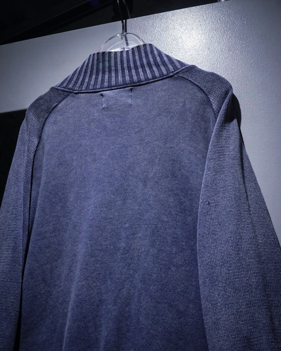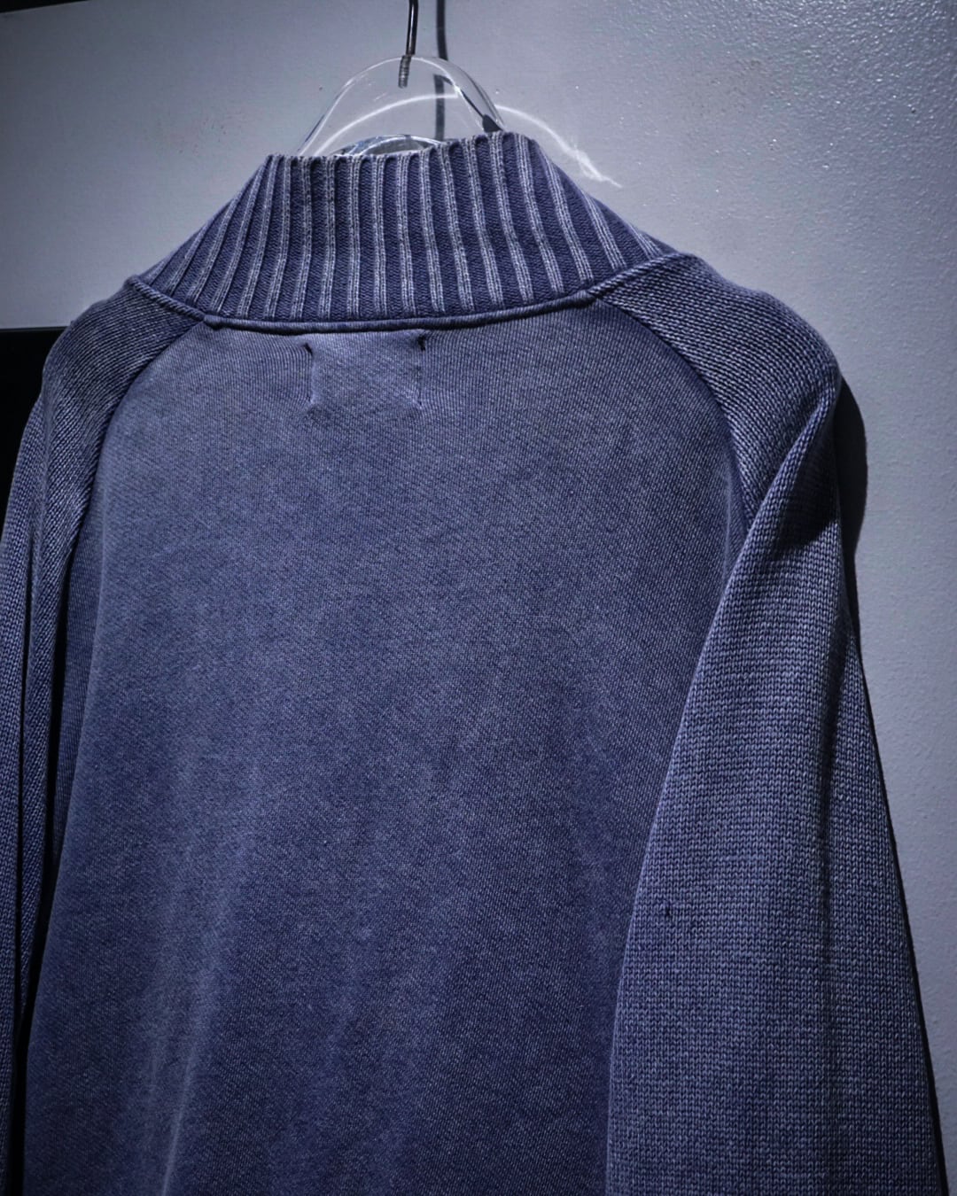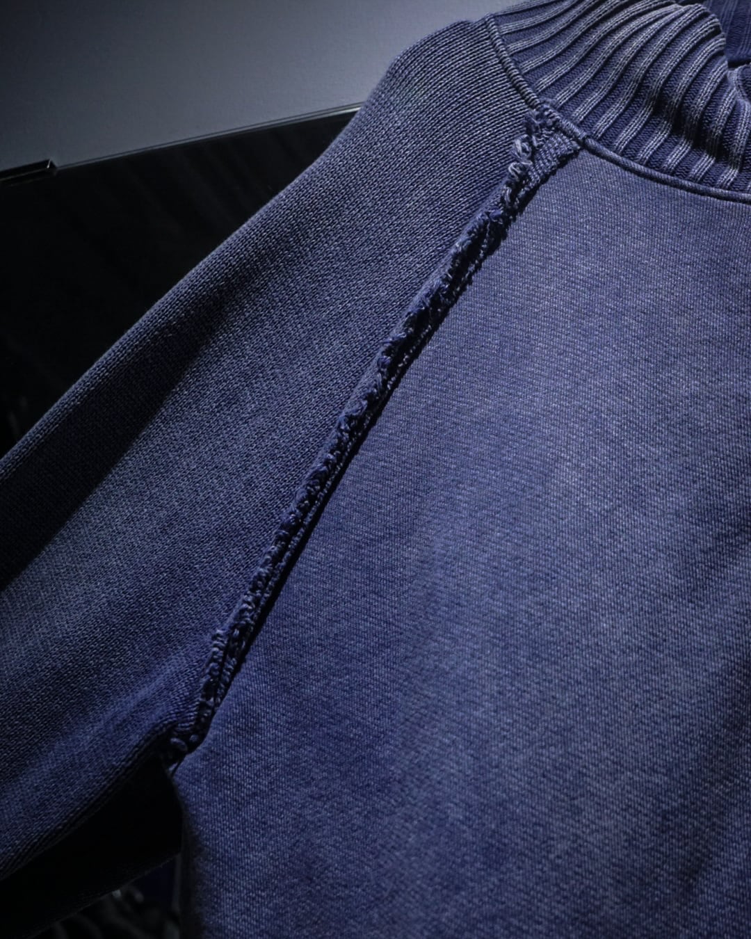 グラデーションがかったカラーリングに首元や裾、袖口、肩周りにはリブニットを切り替え、ラグランのシームに沿ってカットオフのインサイドアウト風のデザイン。