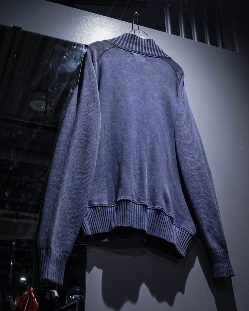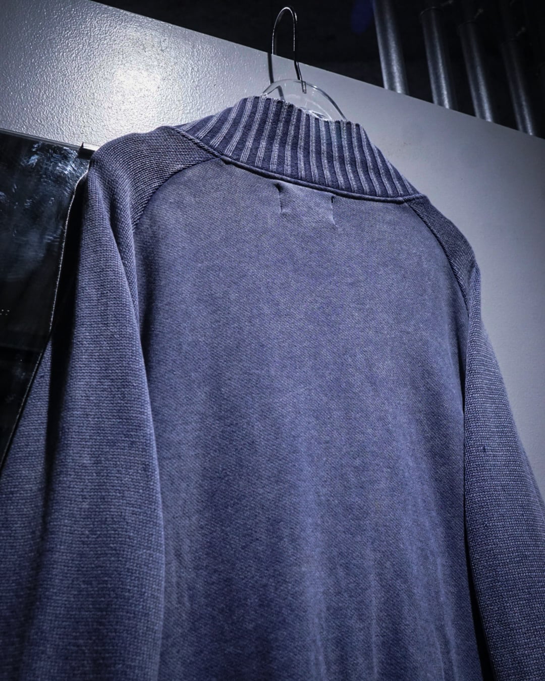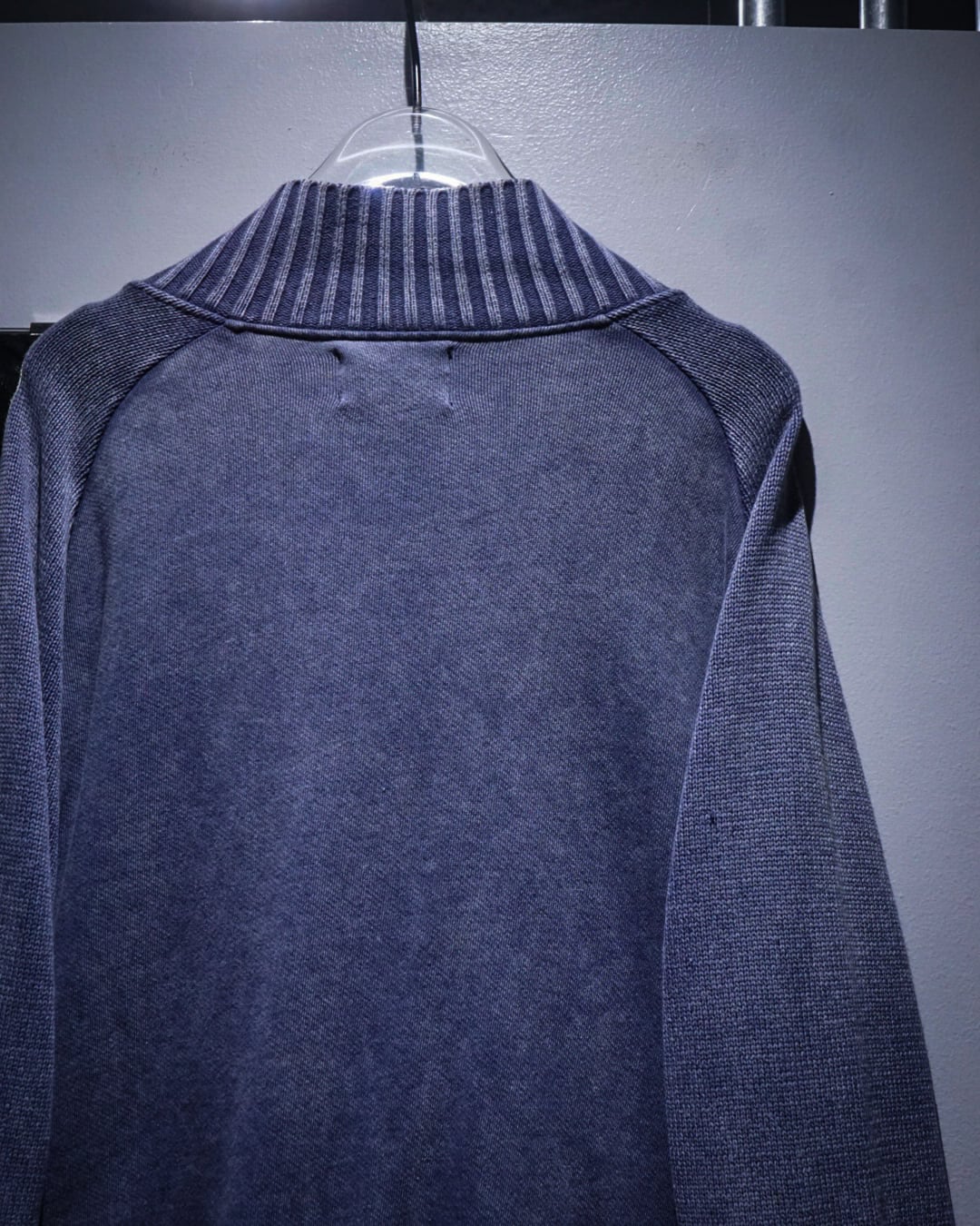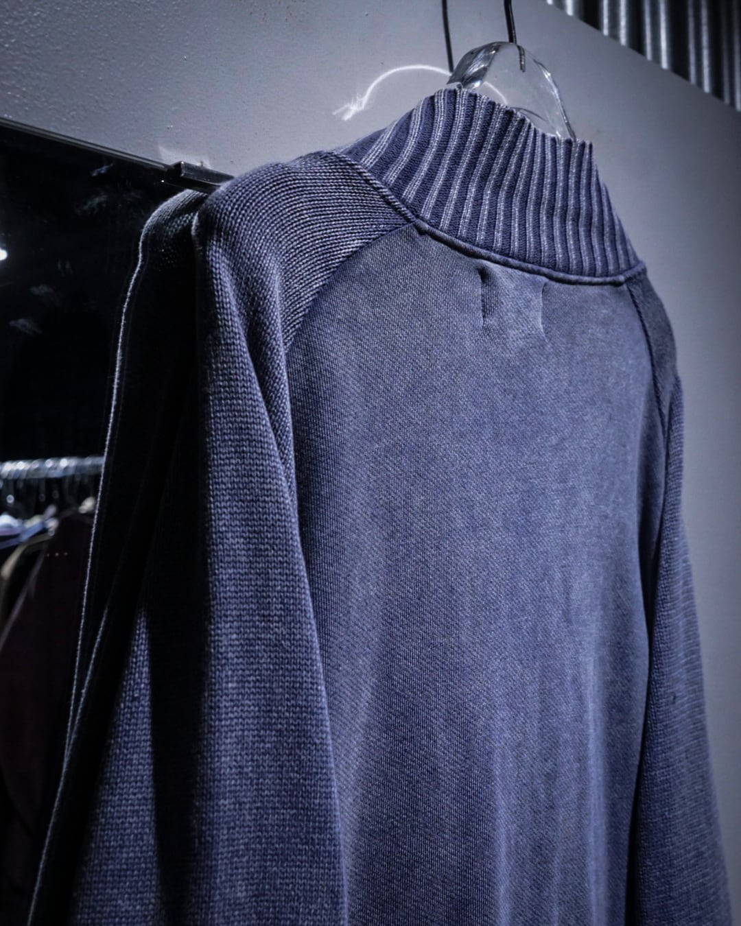 グラデーションがかったカラーリングに首元や裾、袖口、肩周りにはリブニットを切り替え、ラグランのシームに沿ってカットオフのインサイドアウト風のデザイン。