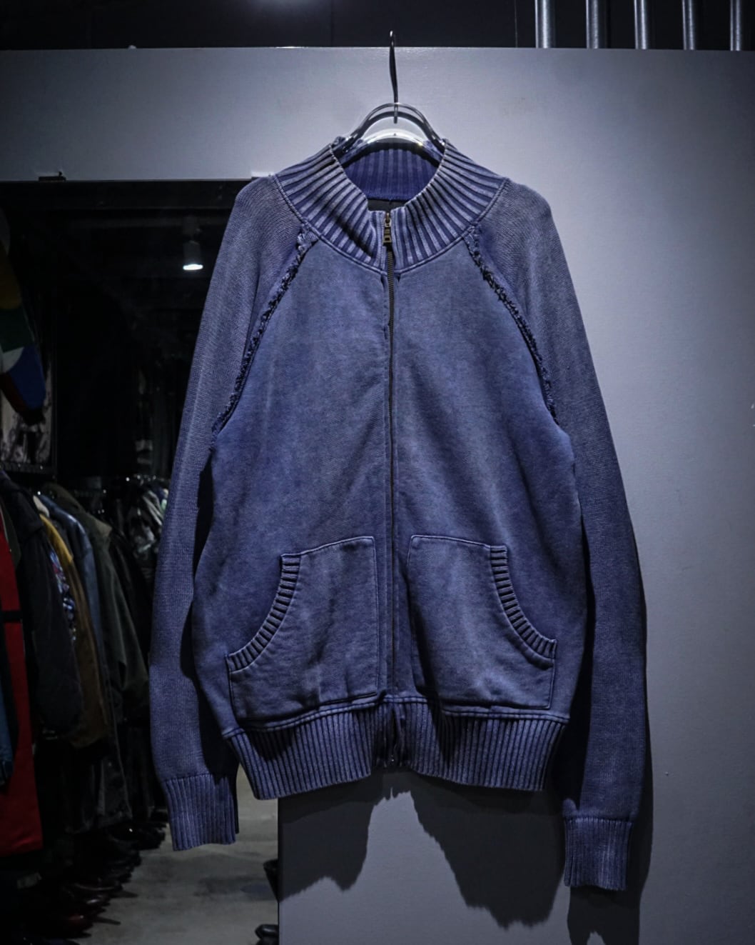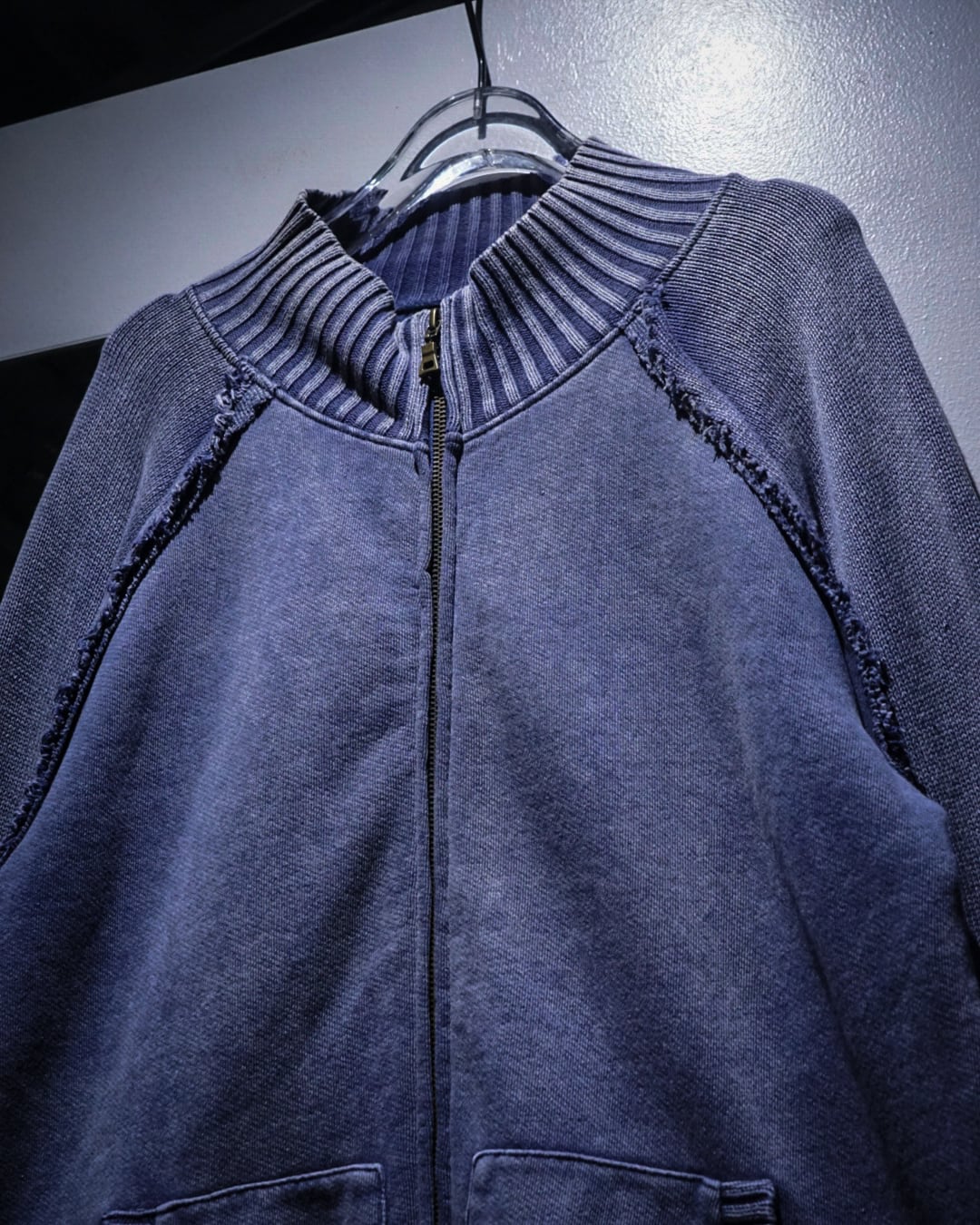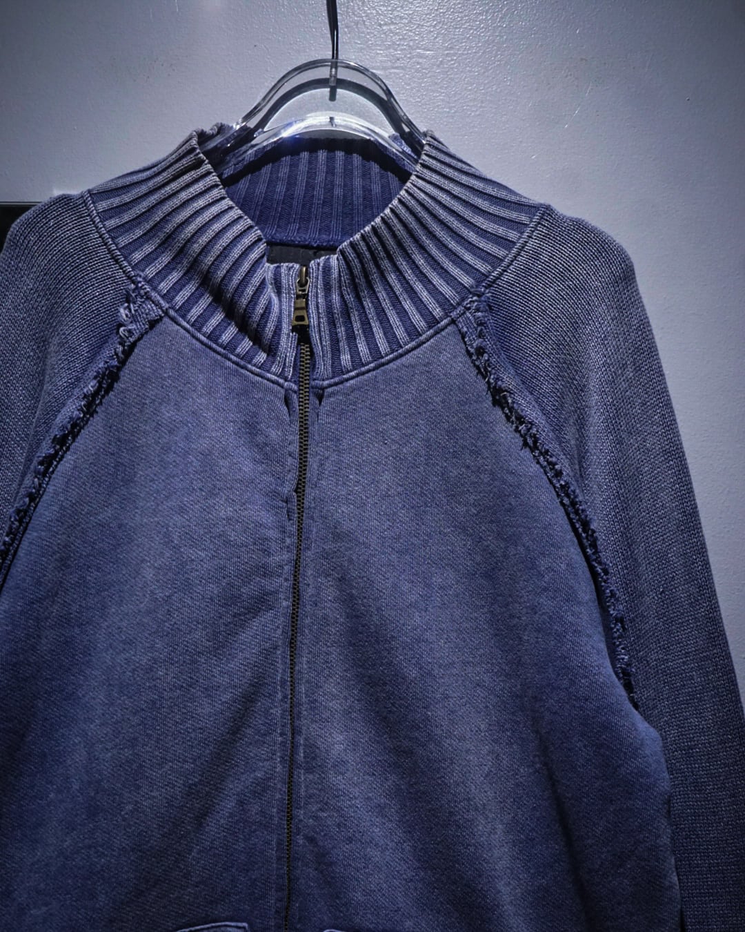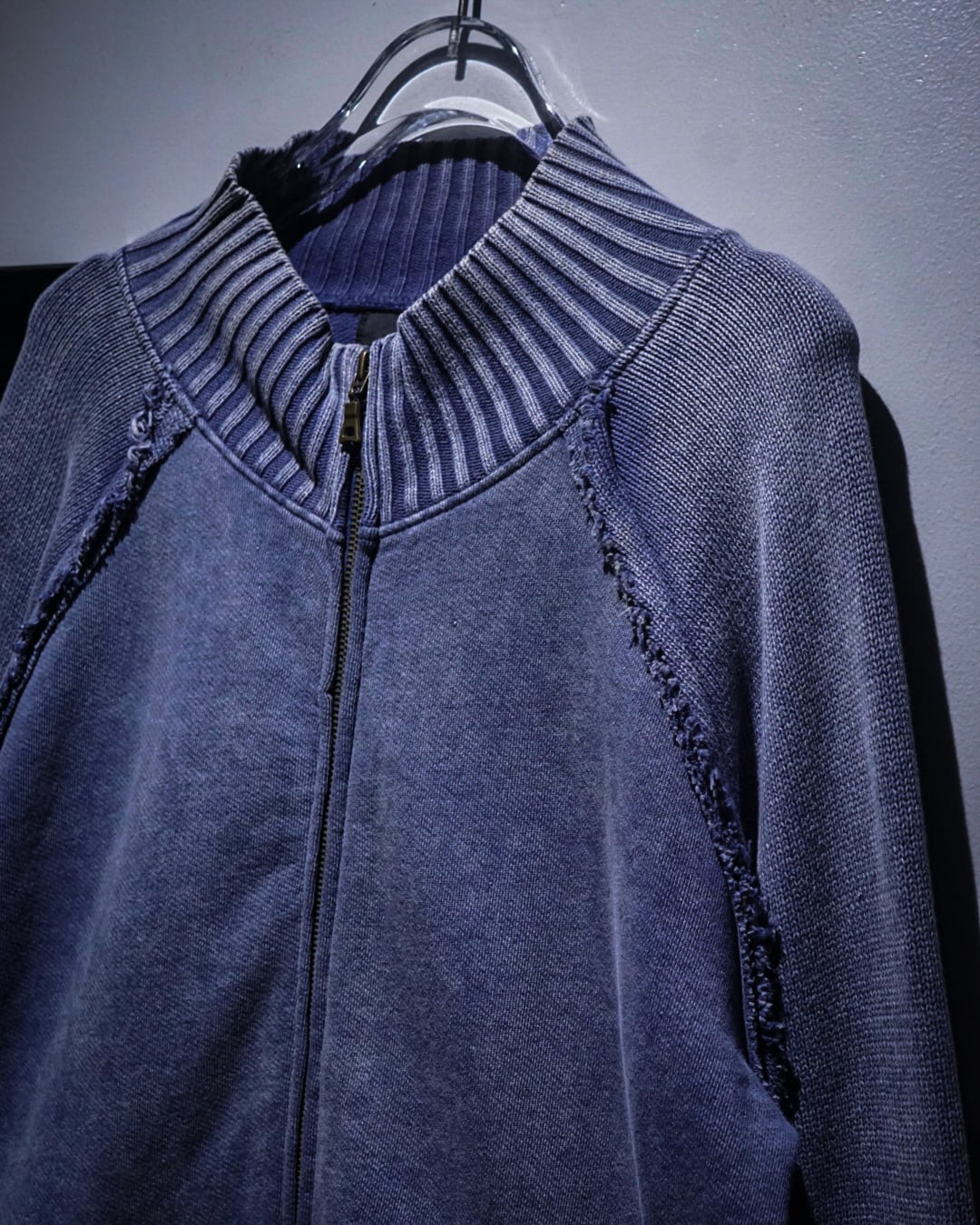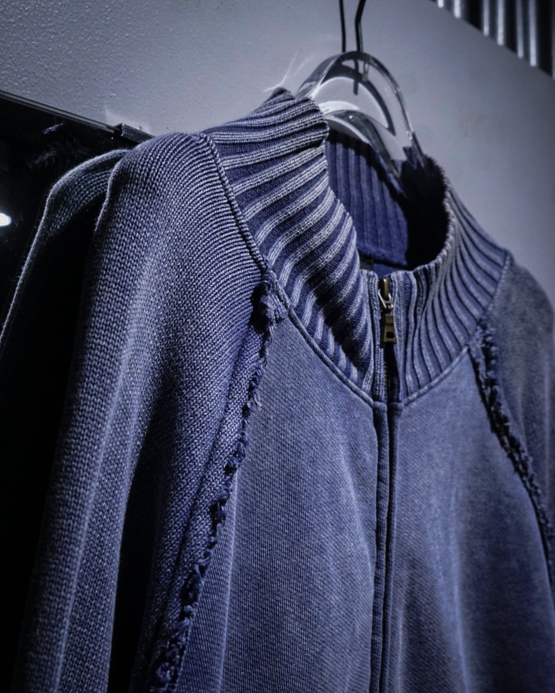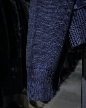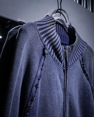 肉感のあるニットのボティに、美しいブルーでフェード調のデザインを載せたジップアップニットジャケット。