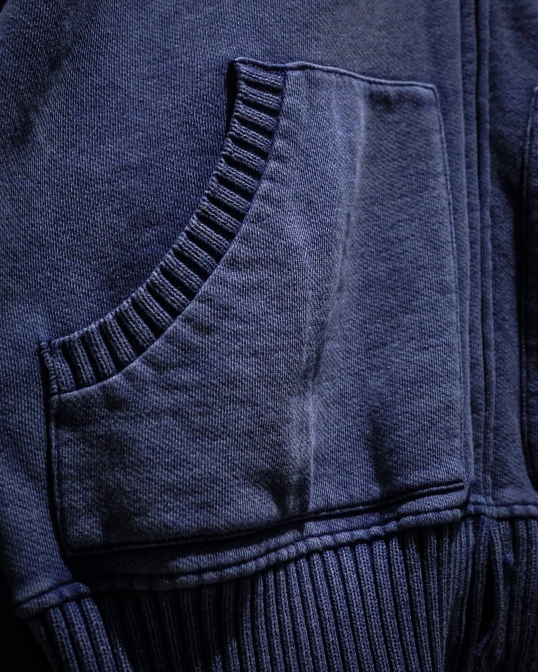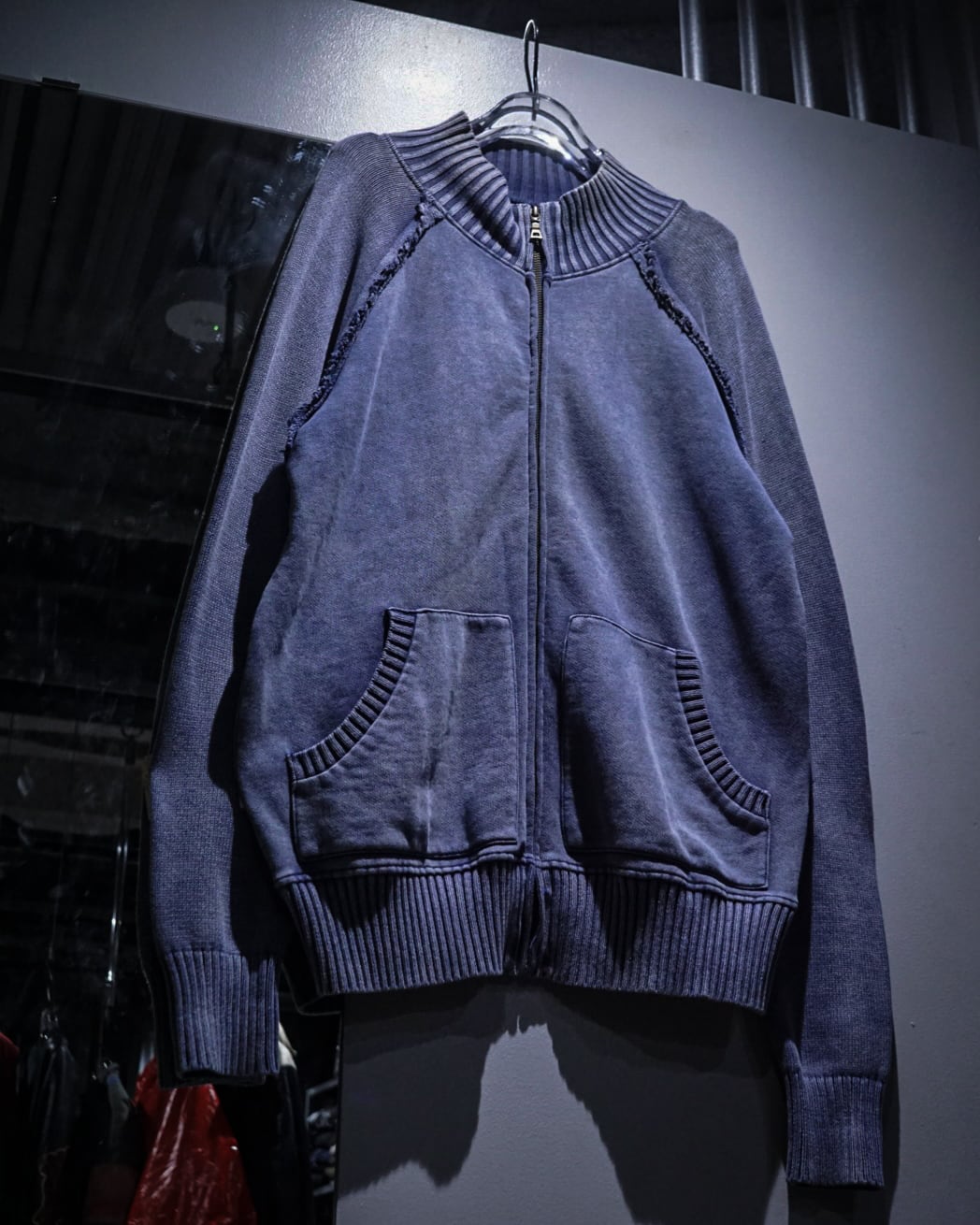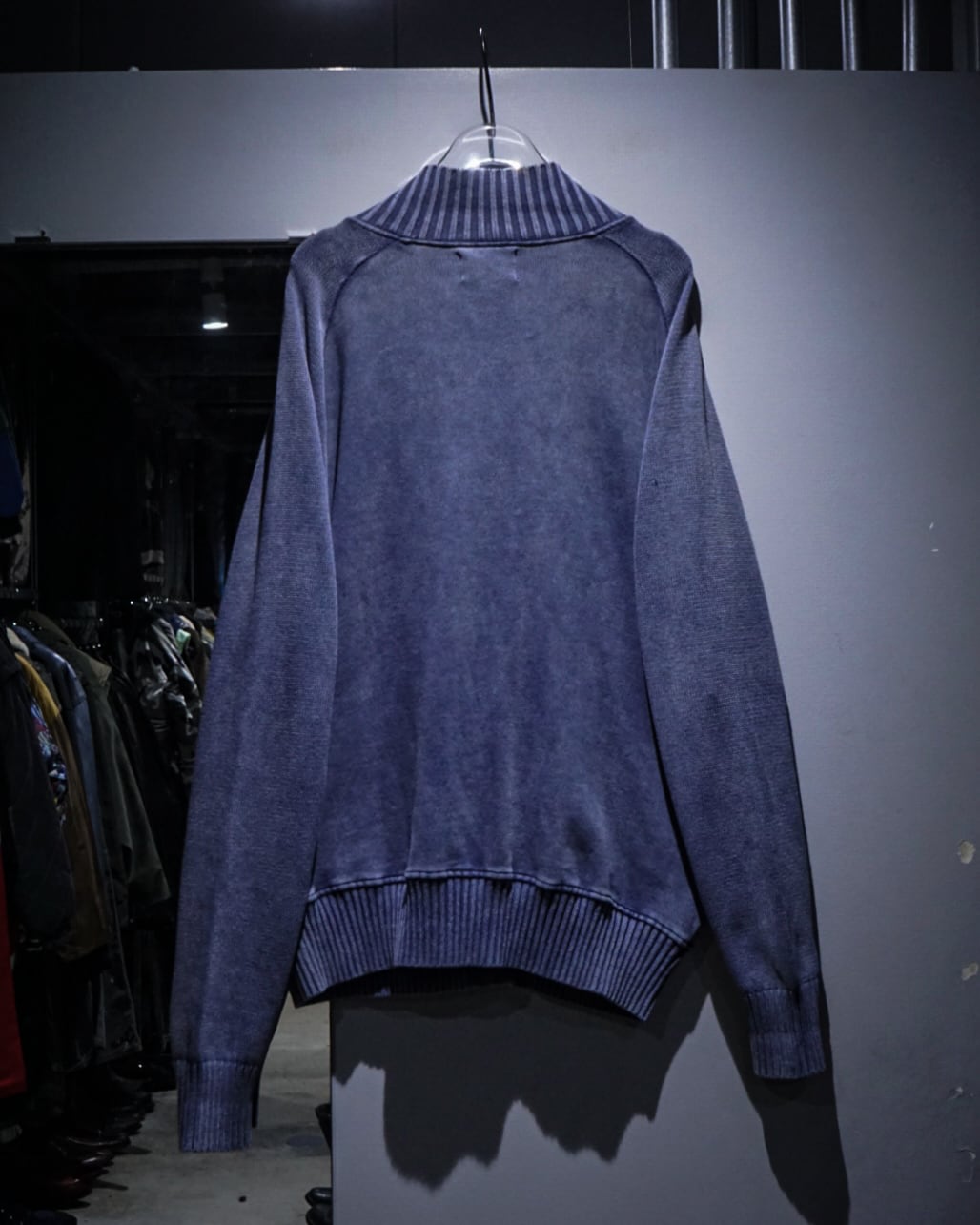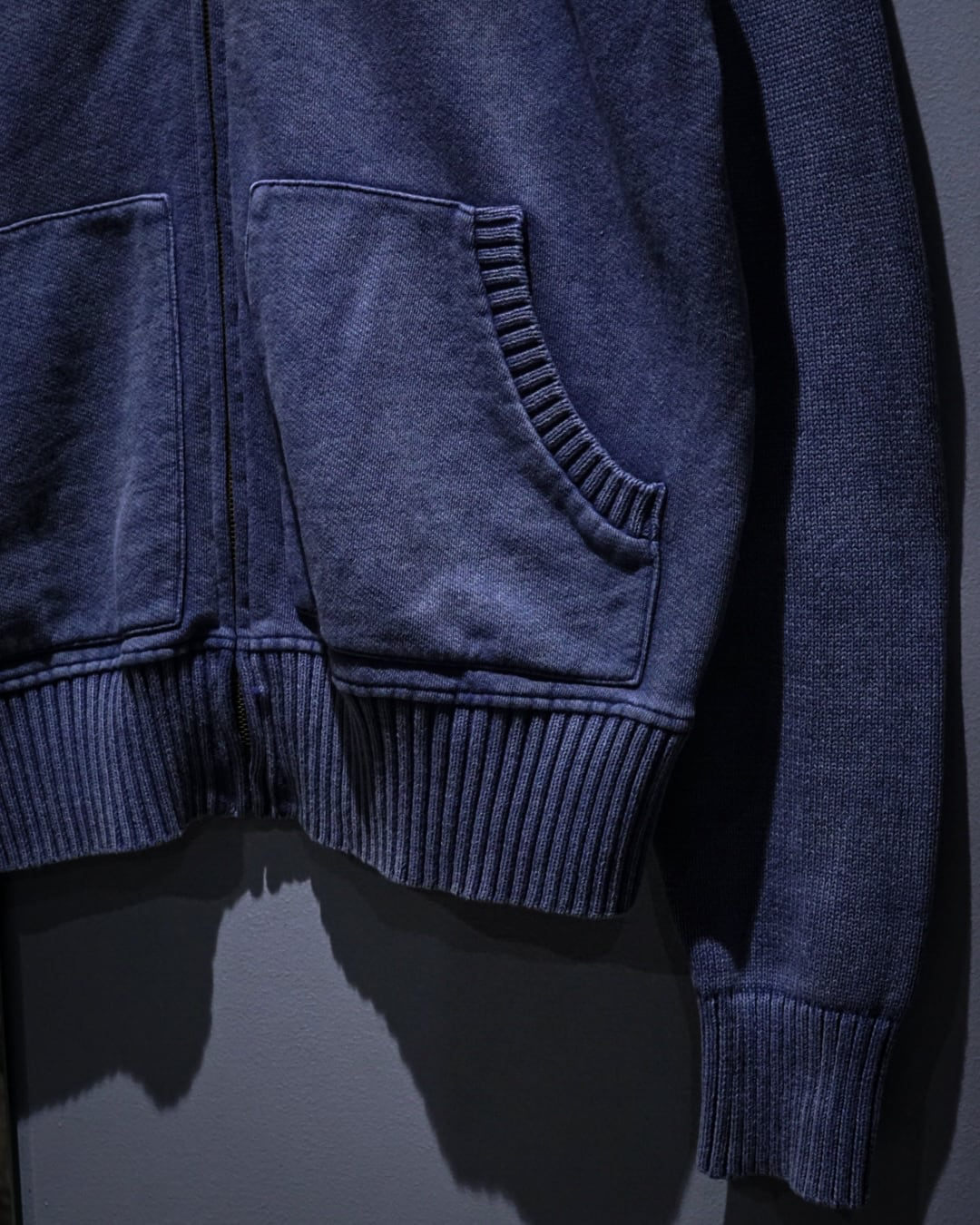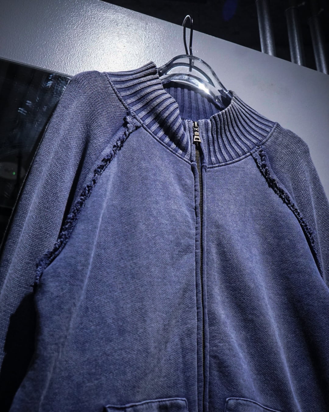 肉感のあるニットのボティに、美しいブルーでフェード調のデザインを載せたジップアップニットジャケット。
