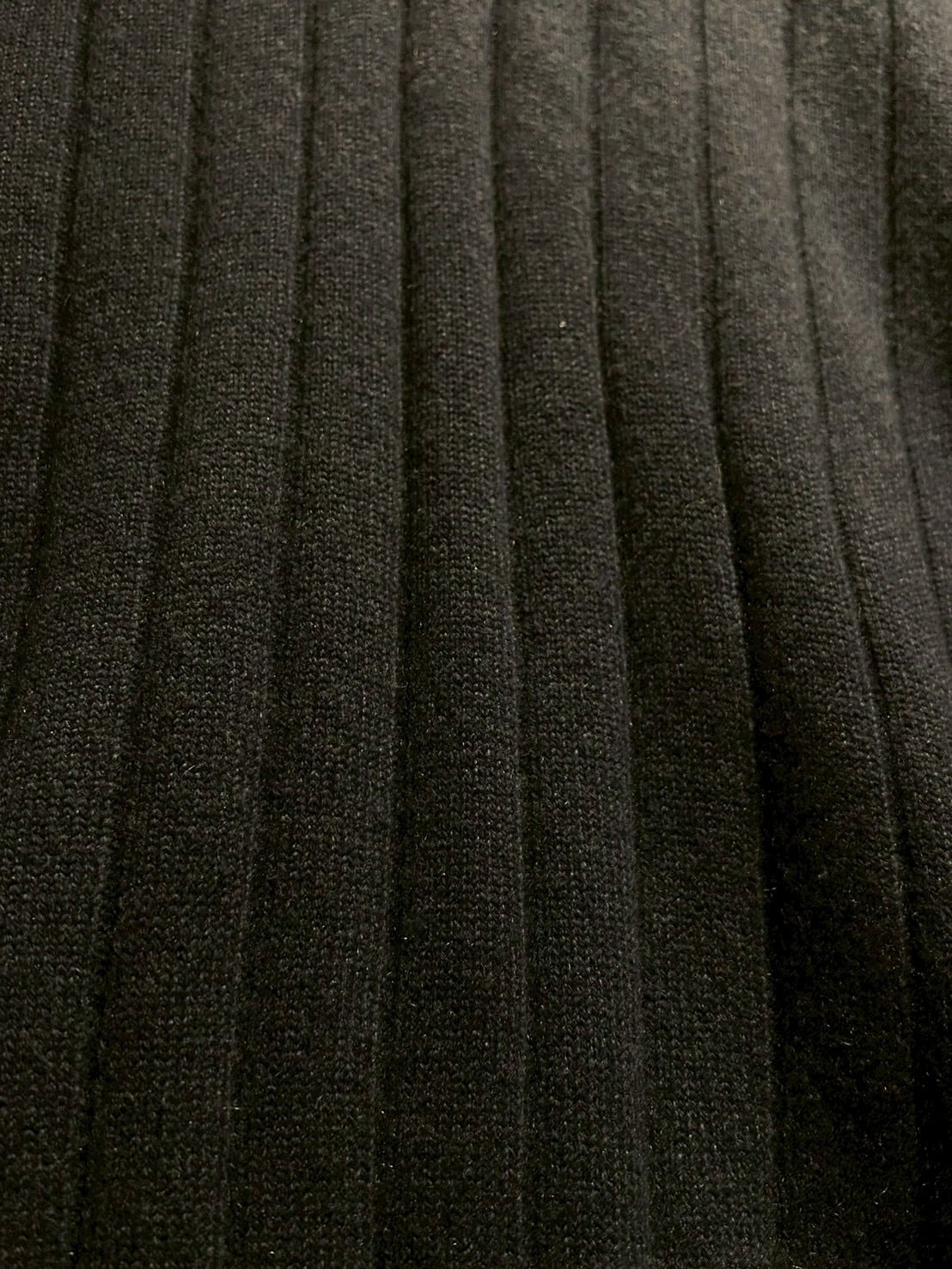 本体にはカシミヤを贅沢に用いたニット素材を採用。しっとりとしたタッチと、肌に触れた瞬間に伝わる柔らかさは別格です。縦畝が美しく走るリブ編みが、単色ながら奥行きのある表情を生み出しています。
