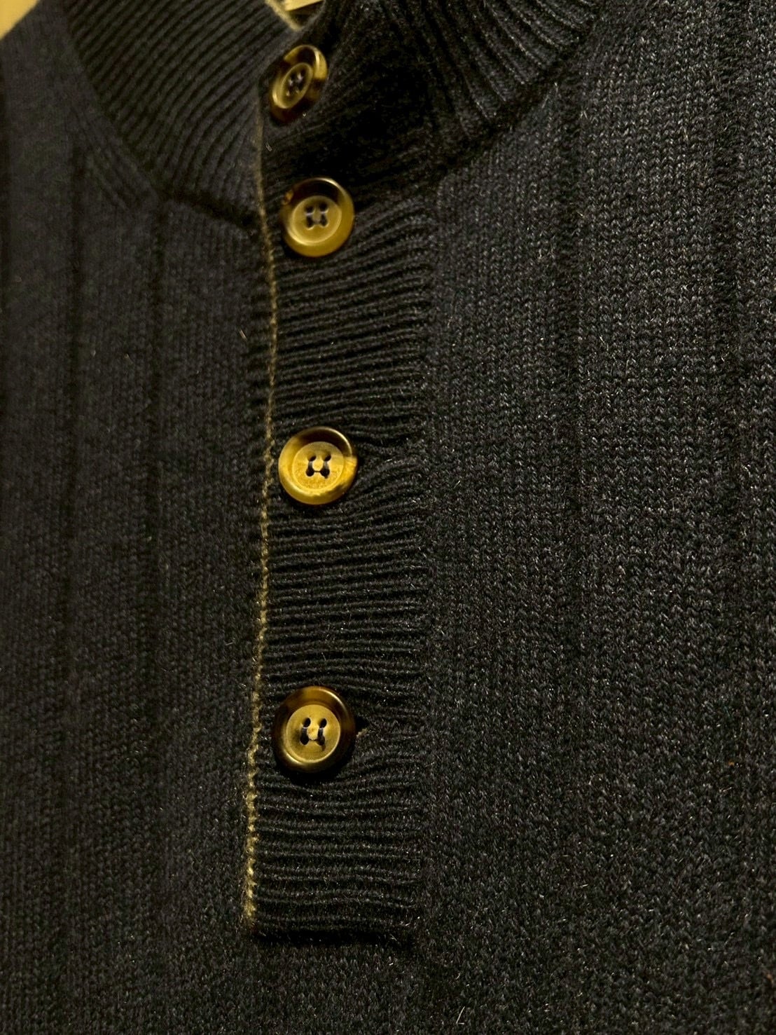 フロントはボタン付きのヘンリーネック仕様。開け具合で表情を変えられるため、インナーとしても一枚着としても◎ネック周りやリブの切り替えも非常に丁寧で、縫製精度の高さが随所に感じられる仕上がり。