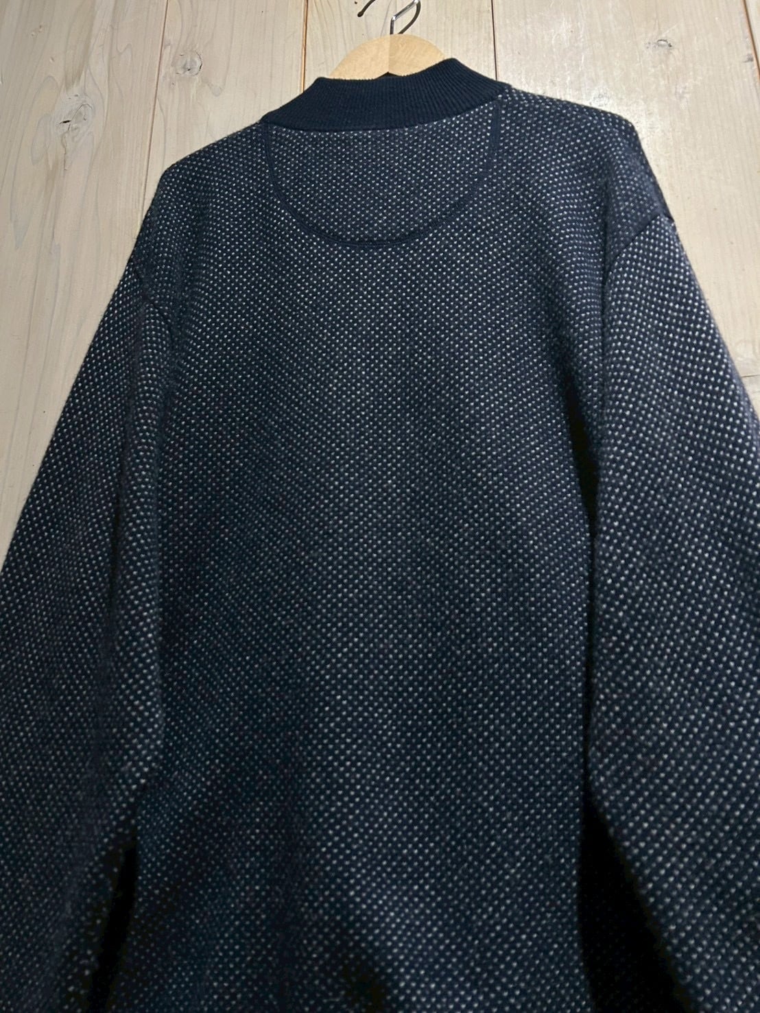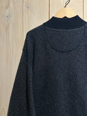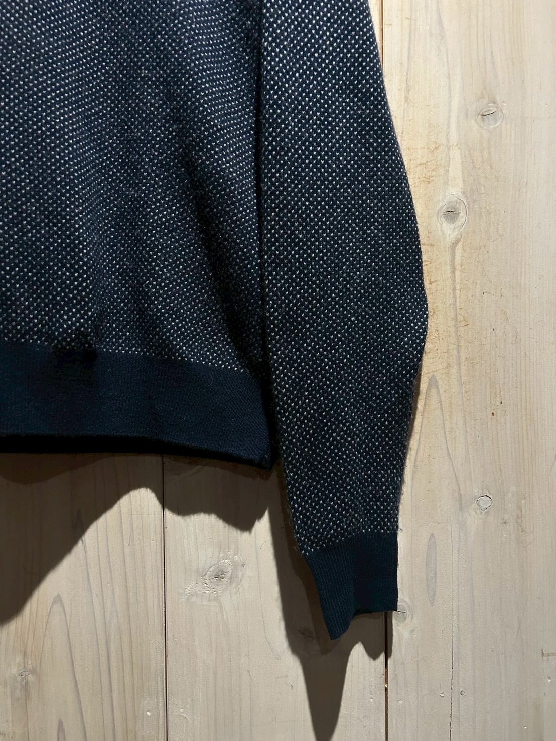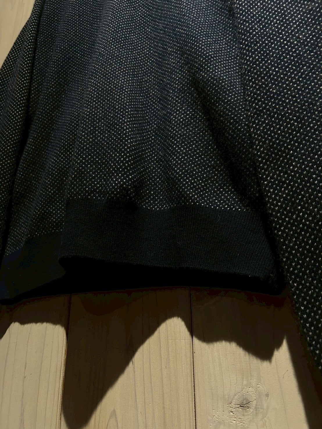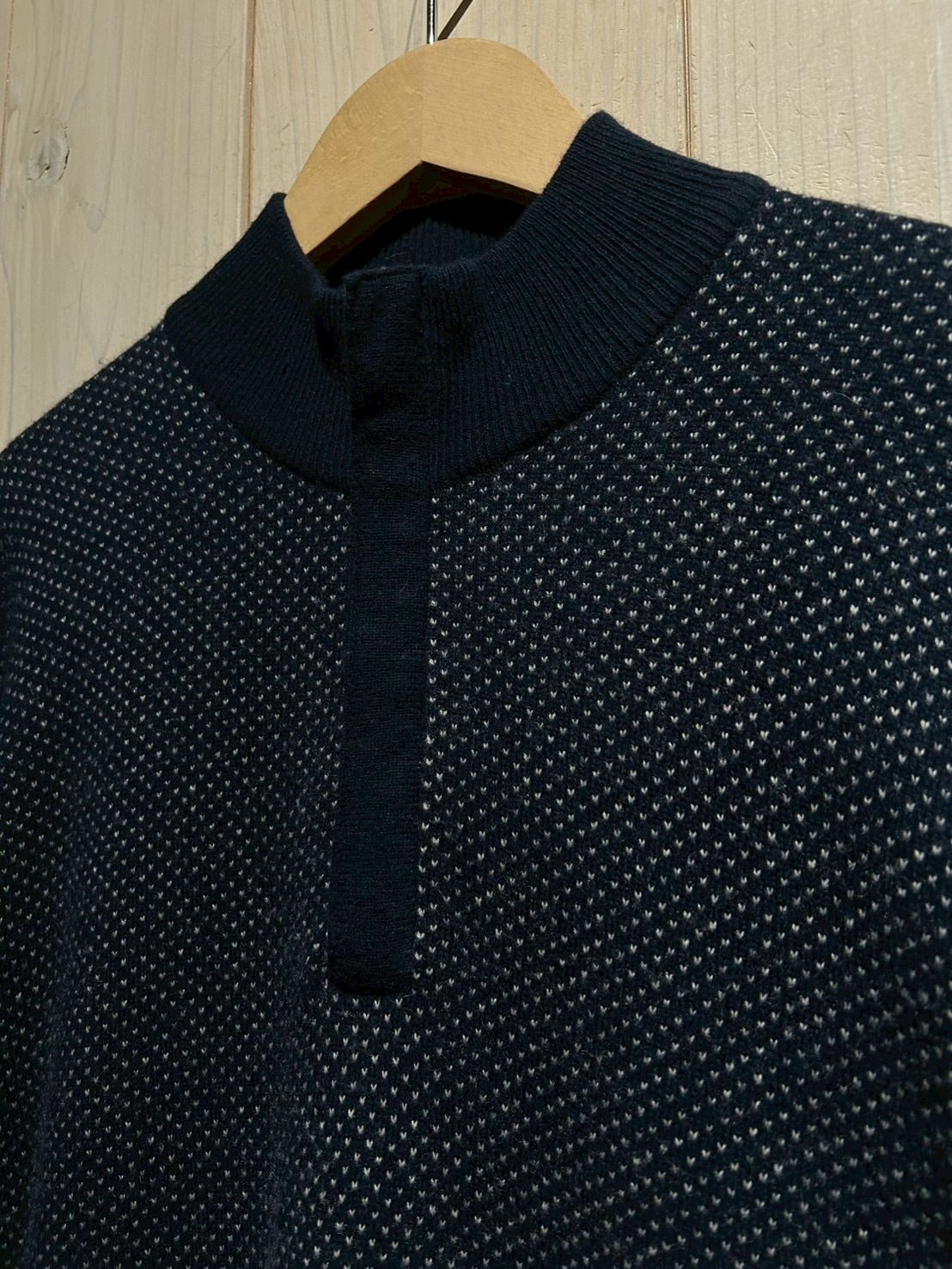 細かなドットが連なるバーズアイパターンを全面に配したニット。一見すると落ち着いたネイビートーンながら、近くで見るほどに奥行きが増し、静かな存在感を放ちます。