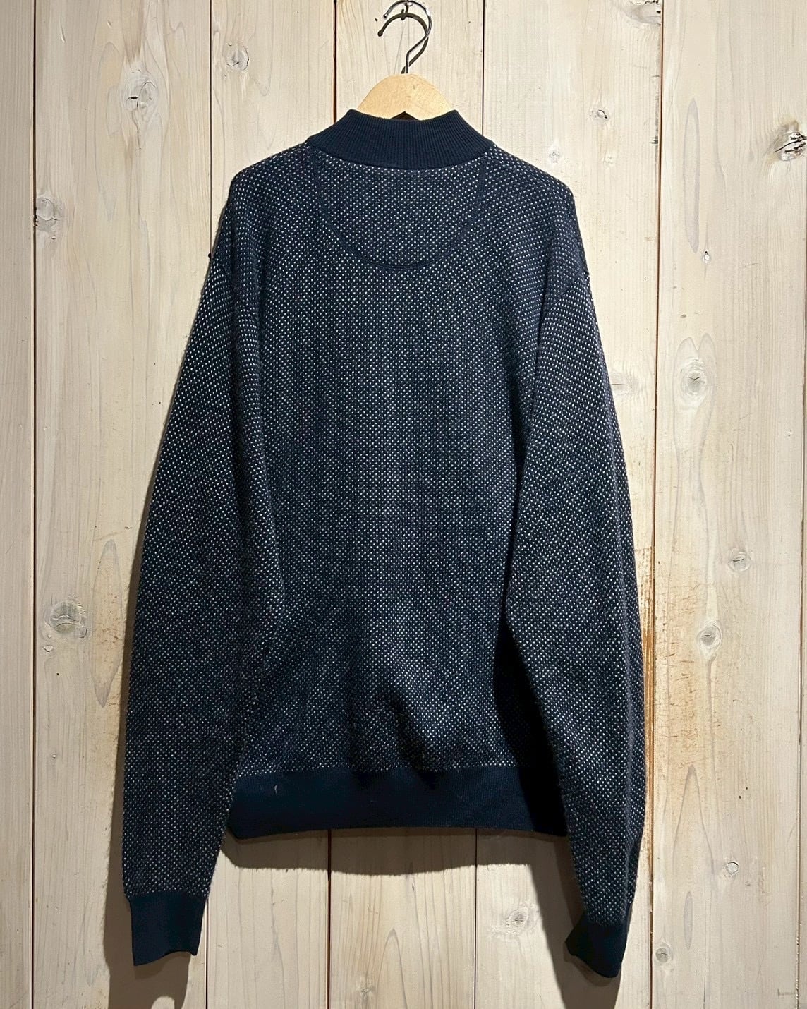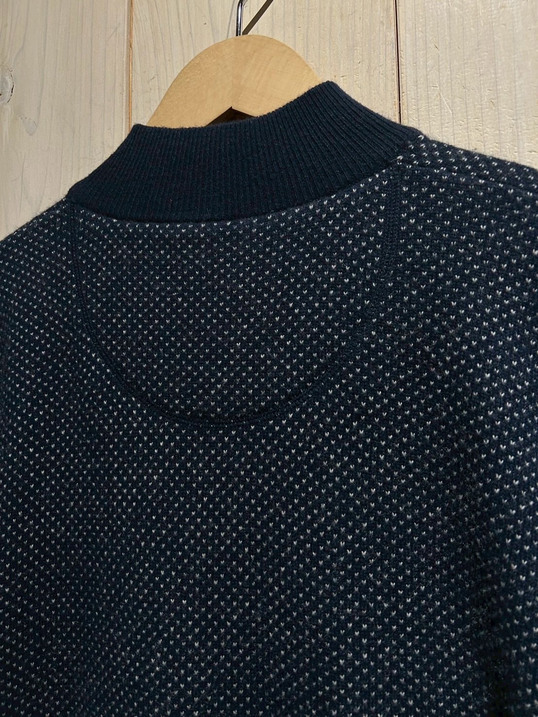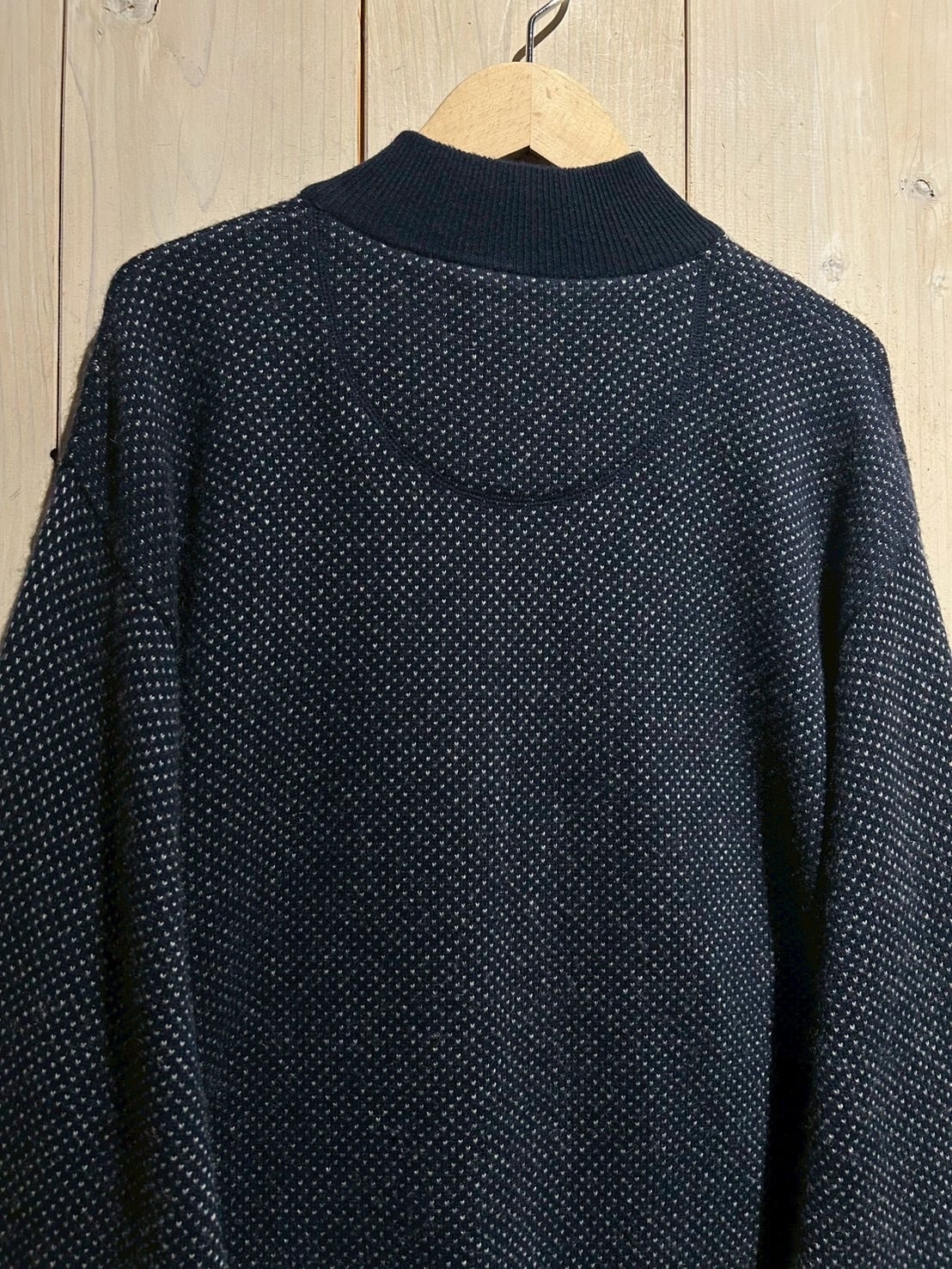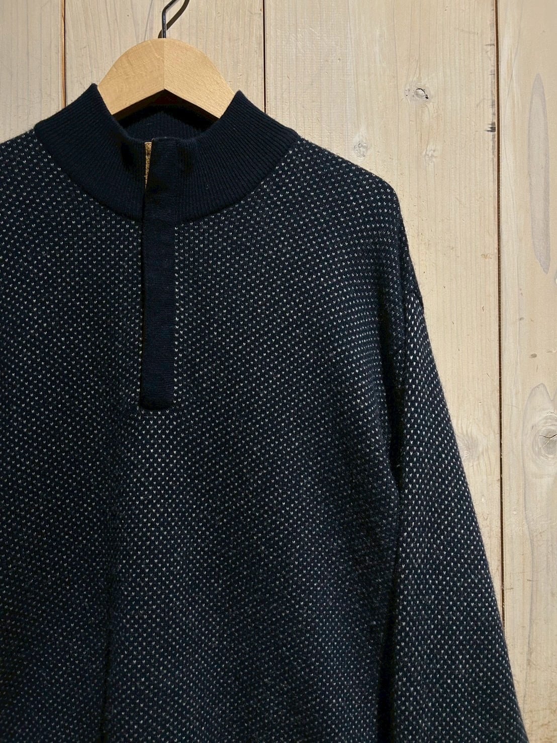 細かなドットが連なるバーズアイパターンを全面に配したニット。一見すると落ち着いたネイビートーンながら、近くで見るほどに奥行きが増し、静かな存在感を放ちます。