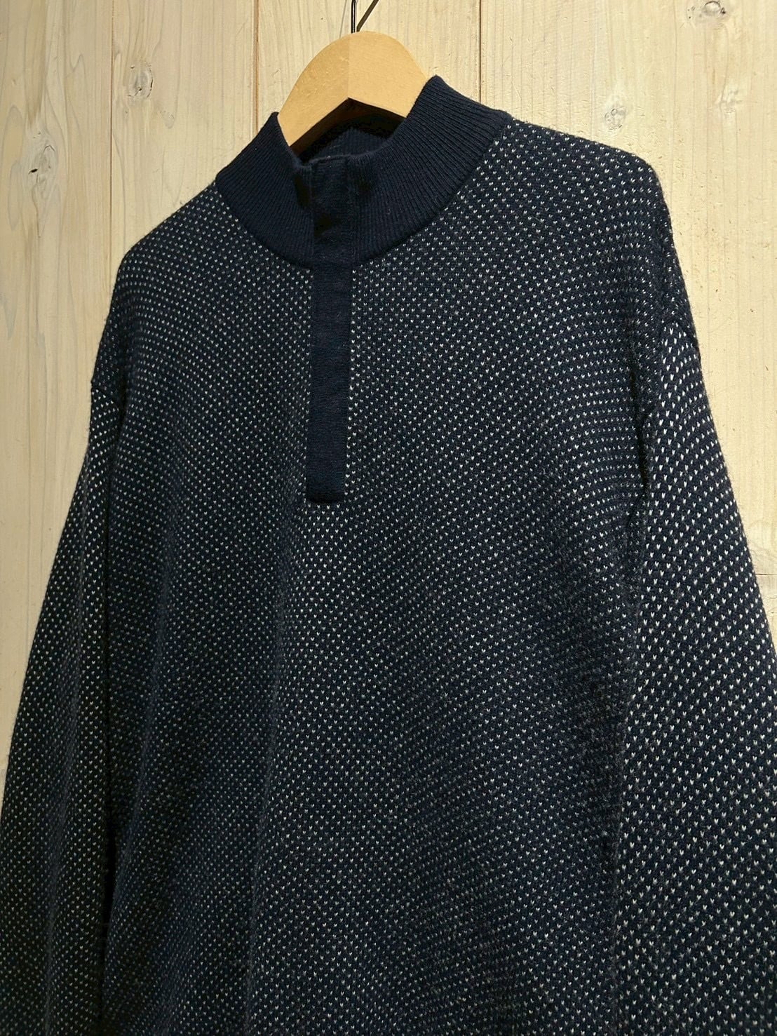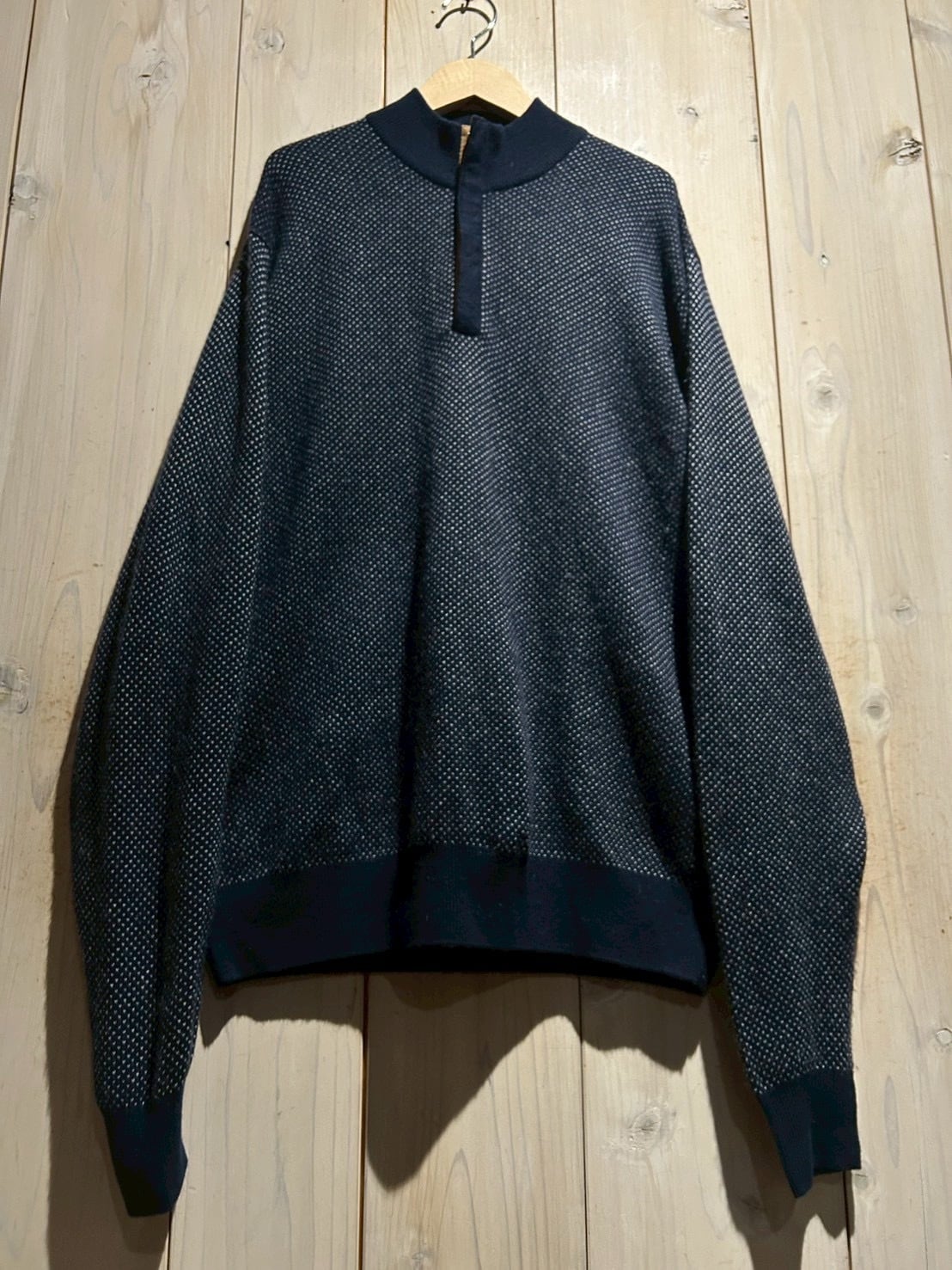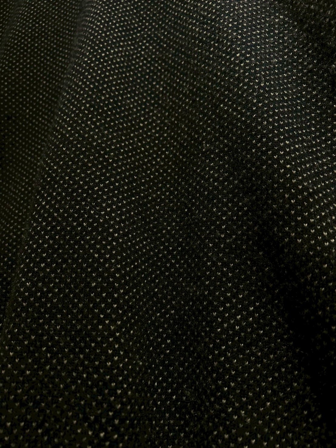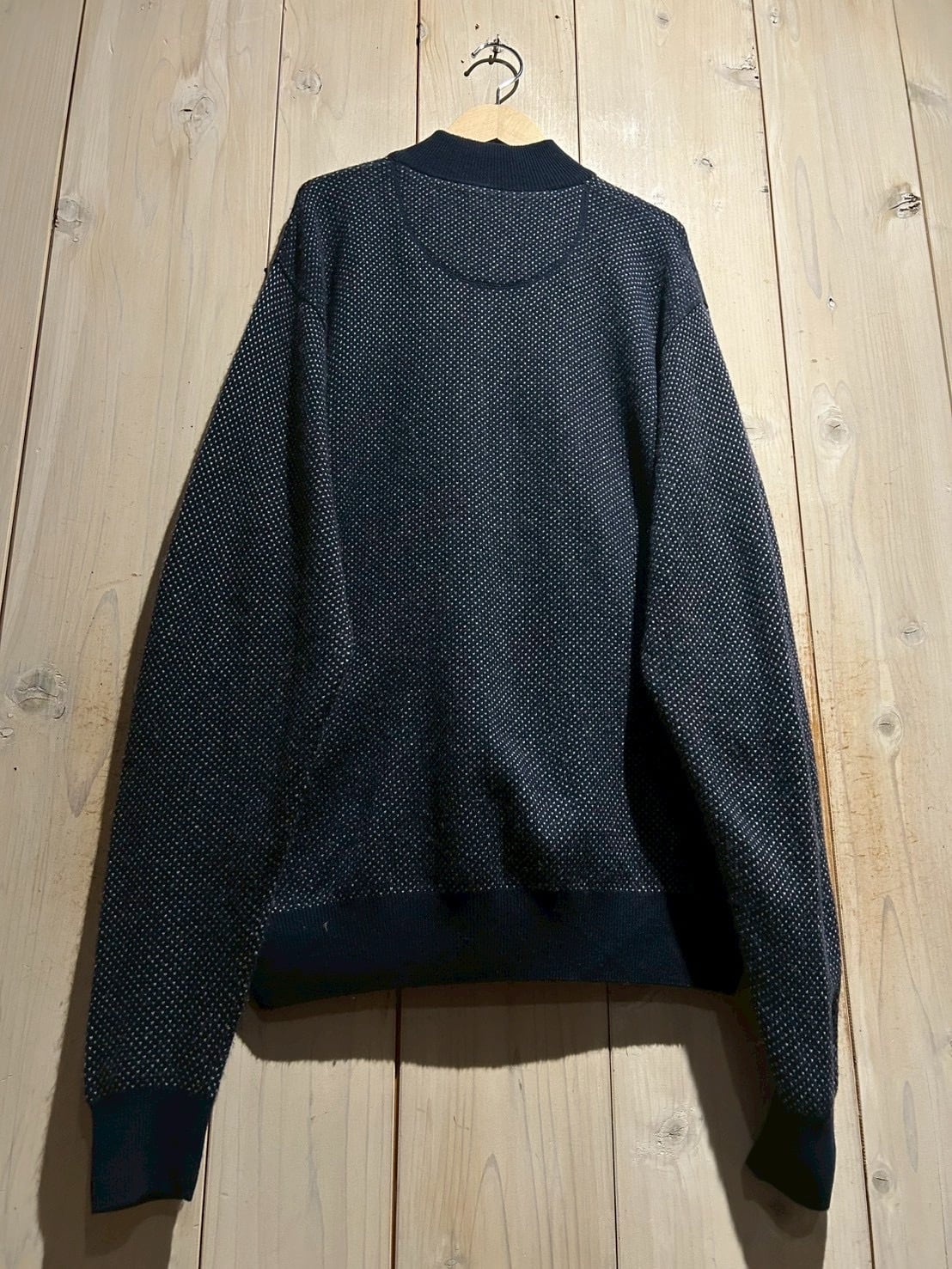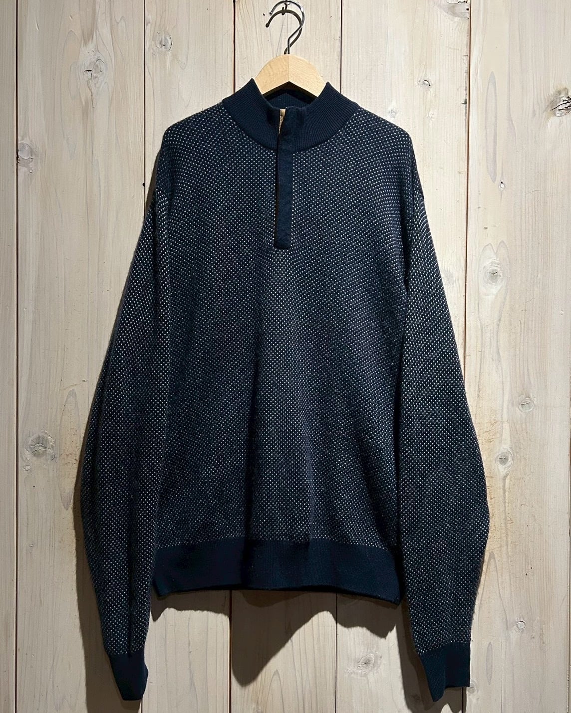 細かなドットが連なるバーズアイパターンを全面に配したニット。一見すると落ち着いたネイビートーンながら、近くで見るほどに奥行きが増し、静かな存在感を放ちます。