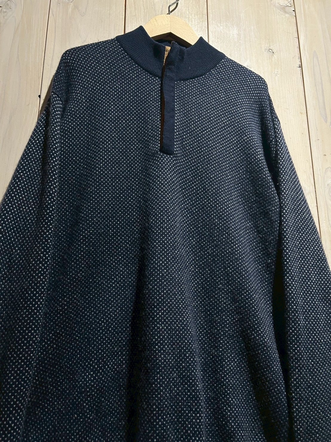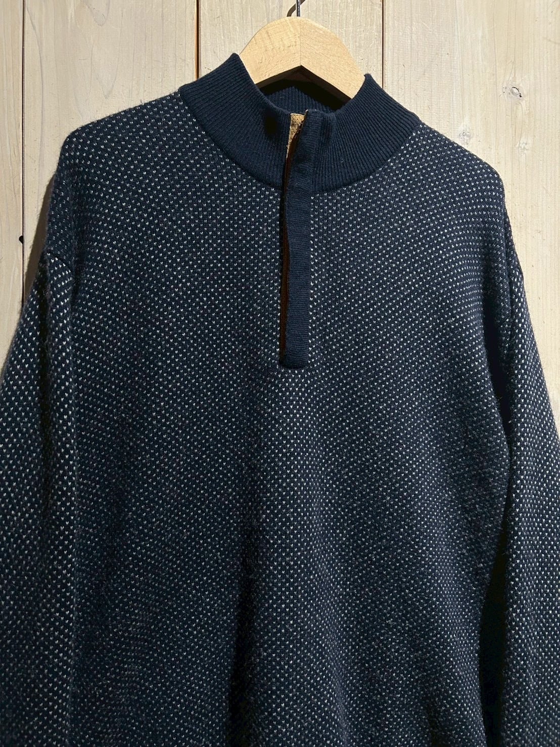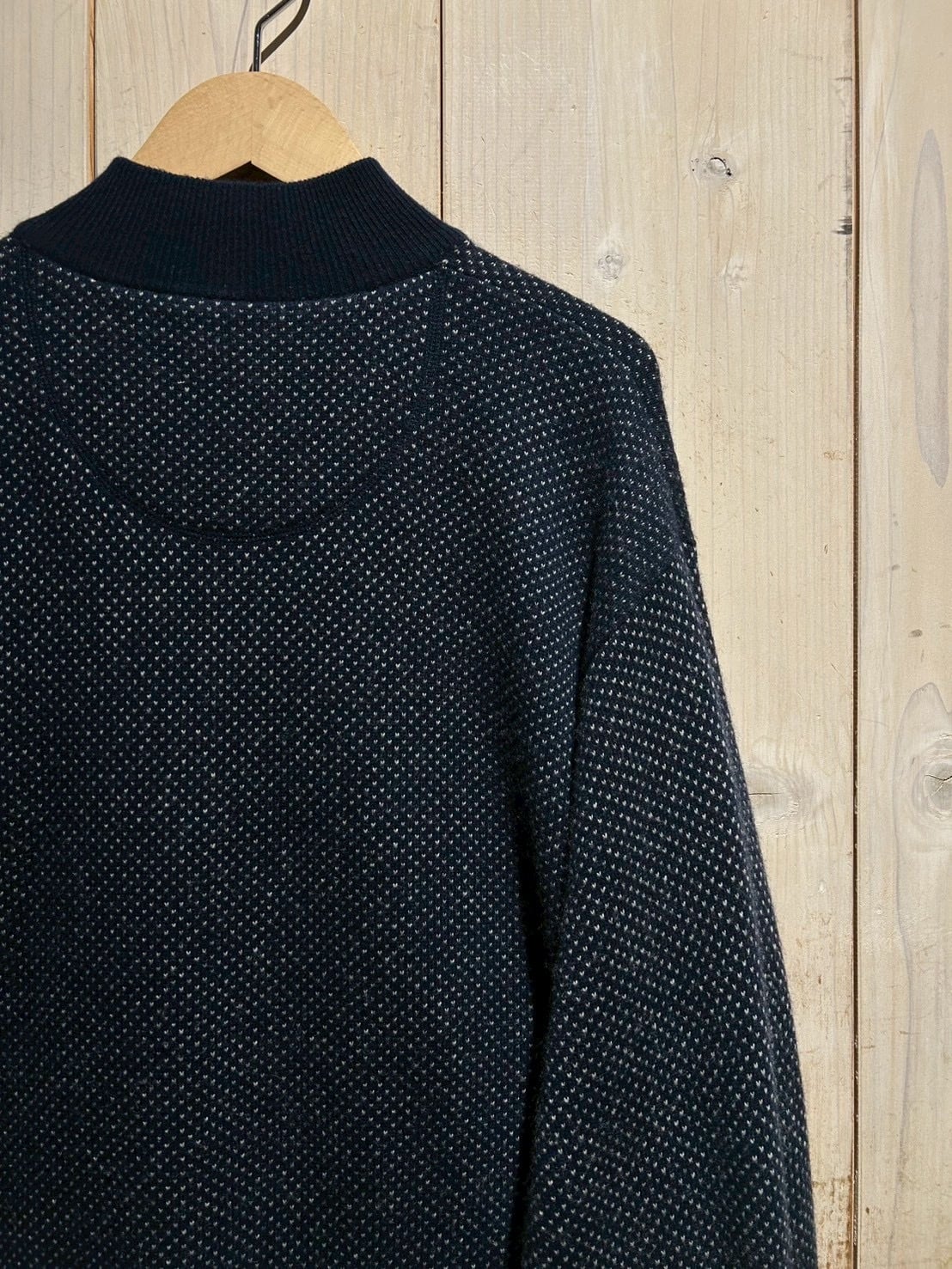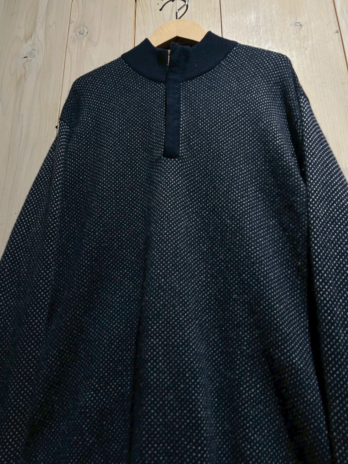 細かなドットが連なるバーズアイパターンを全面に配したニット。一見すると落ち着いたネイビートーンながら、近くで見るほどに奥行きが増し、静かな存在感を放ちます。