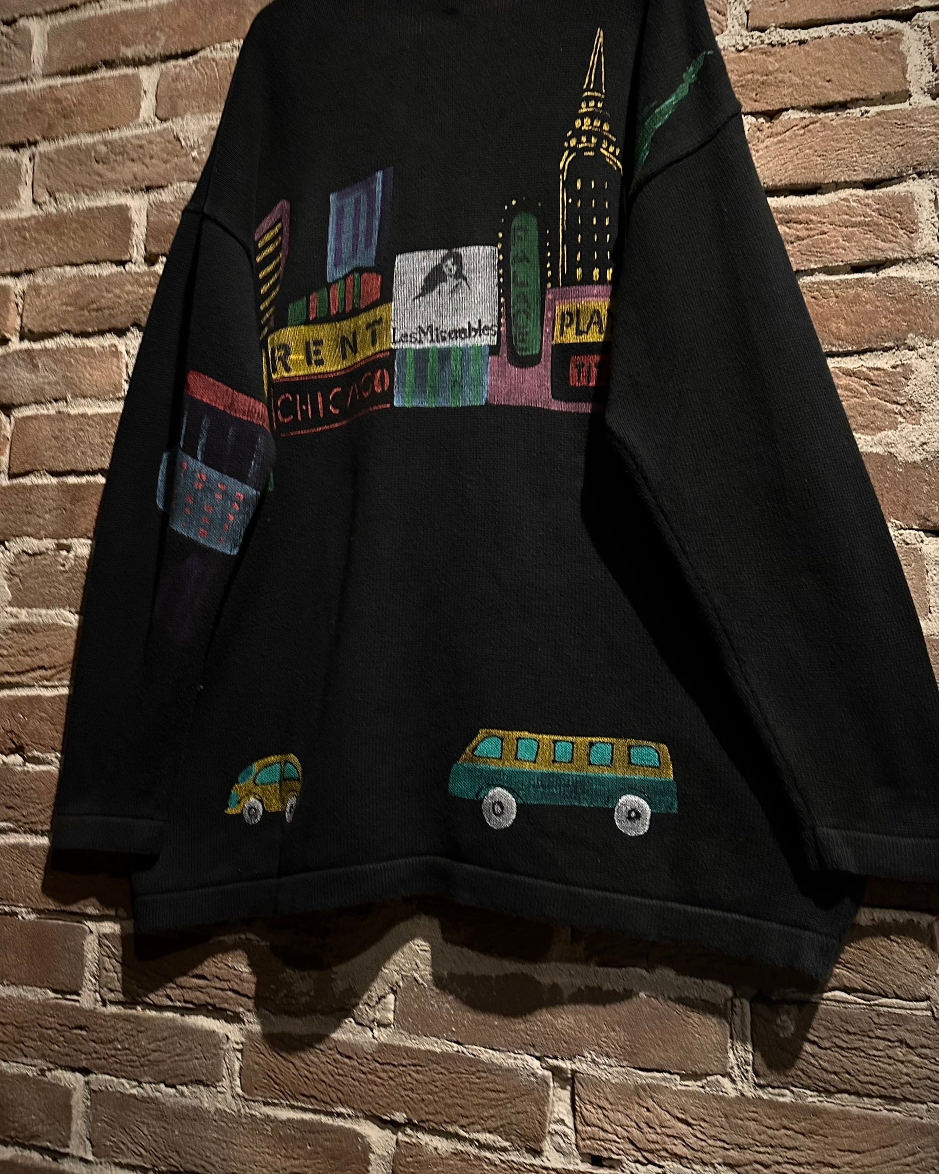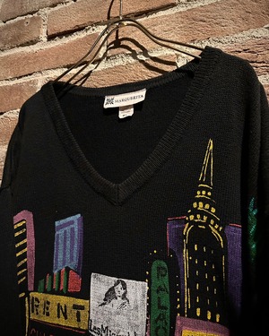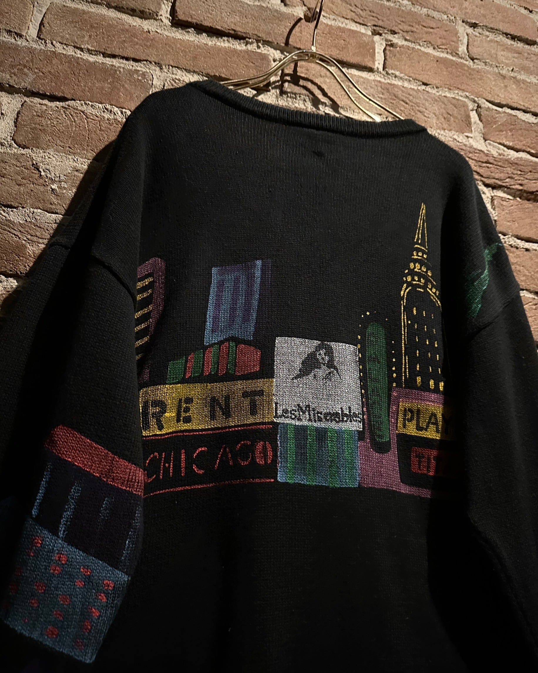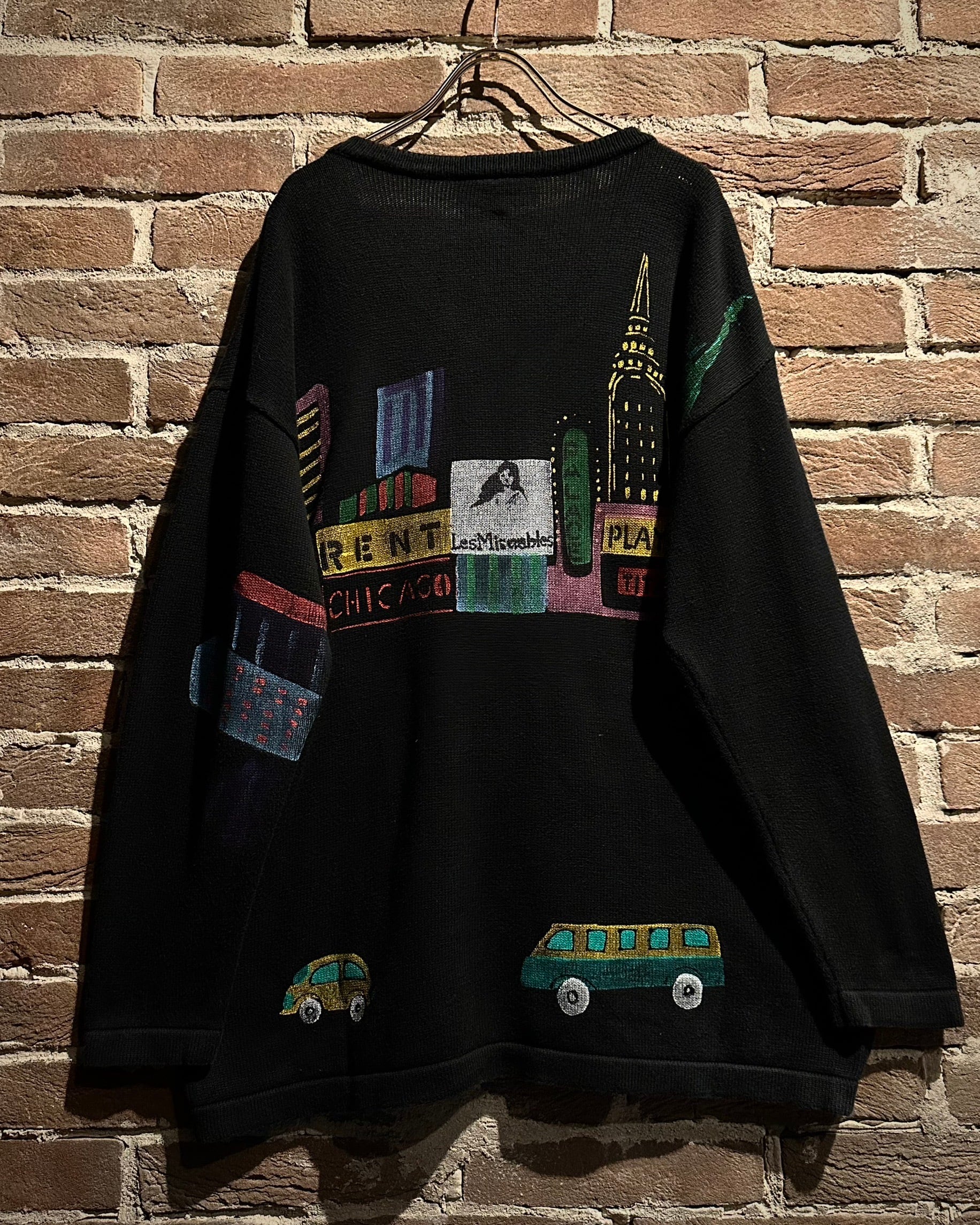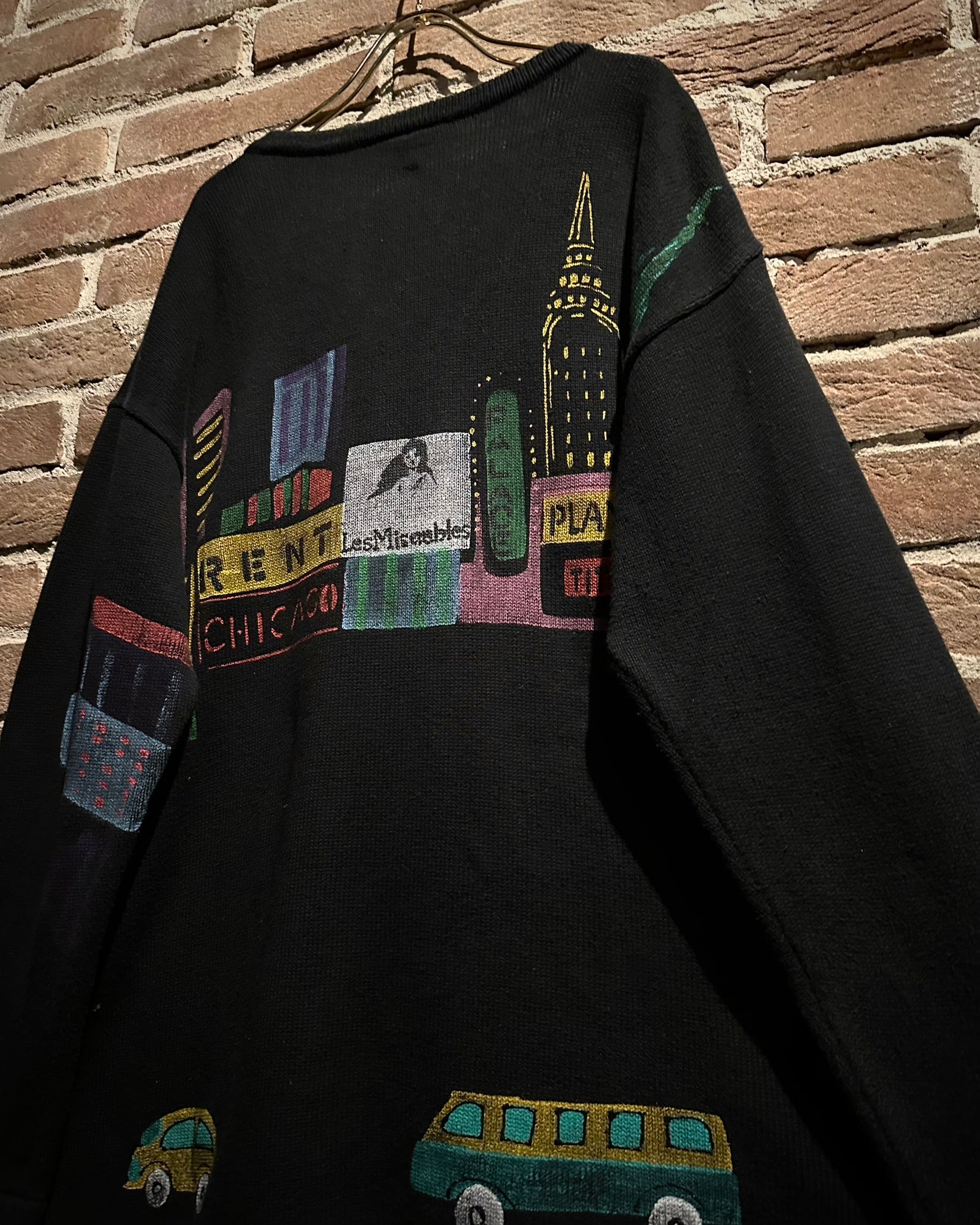 ブラックベースのニットボディに、街並みを描いたグラフィックを大胆に落とし込んだ80's〜90's USA製のニット。
