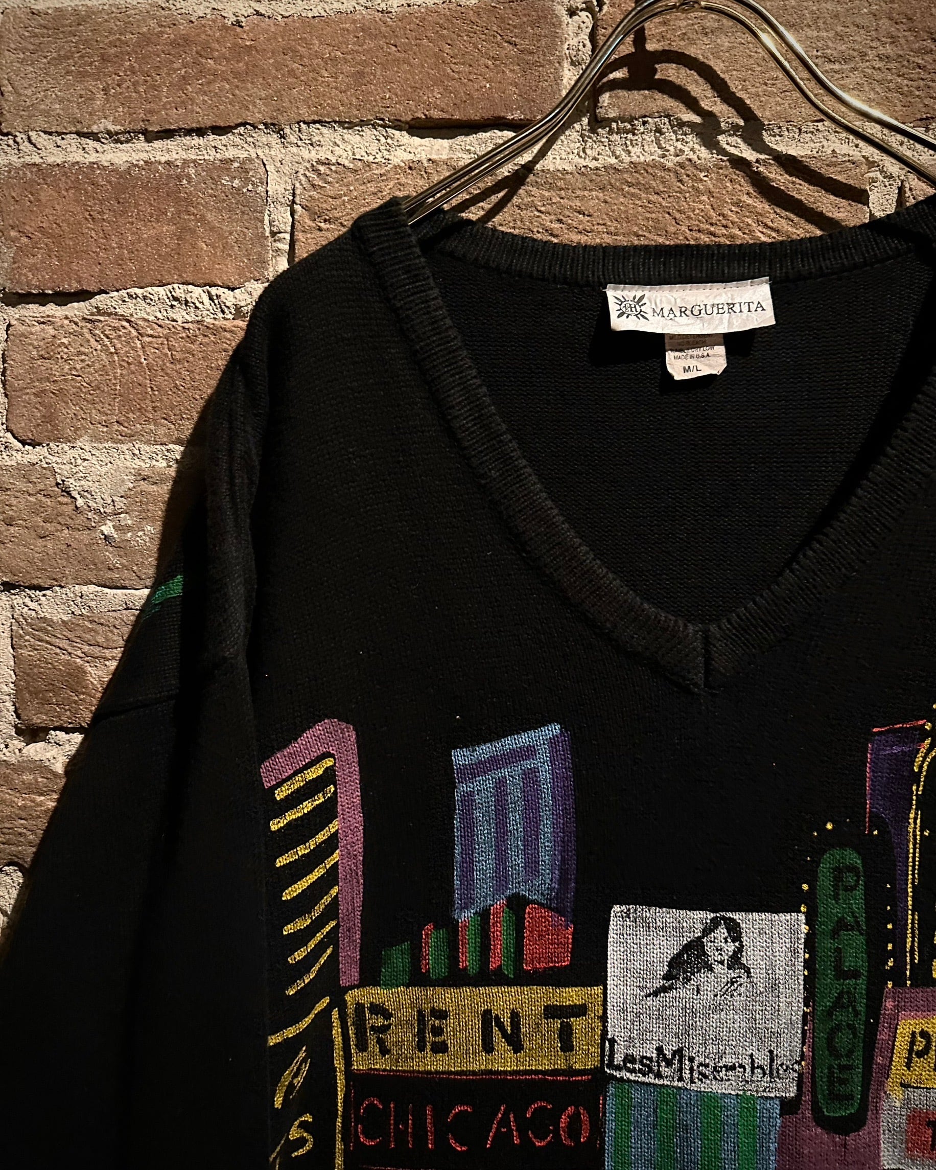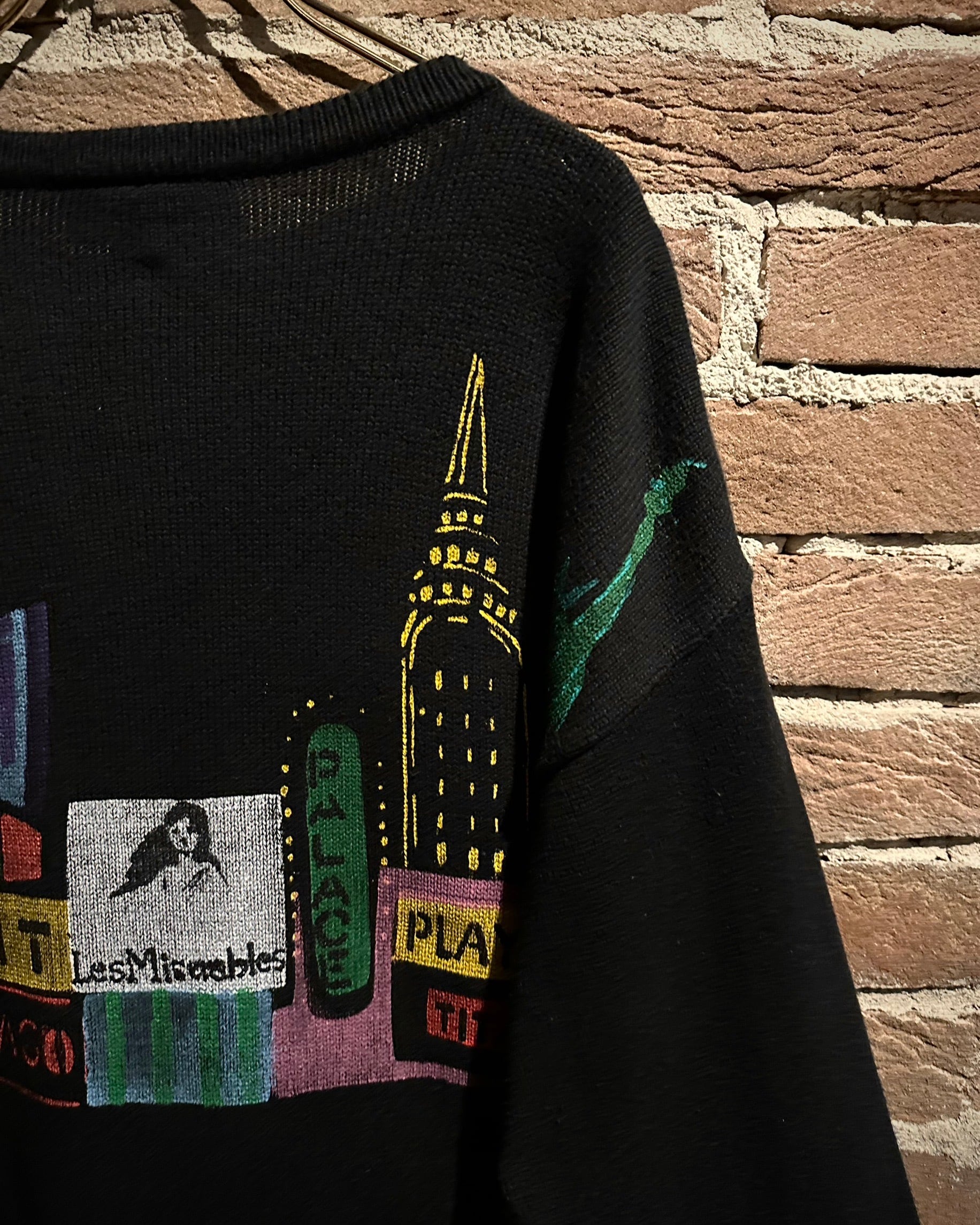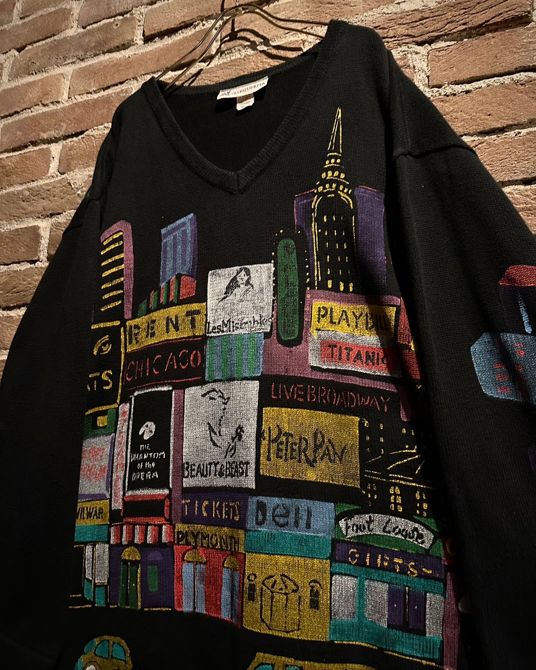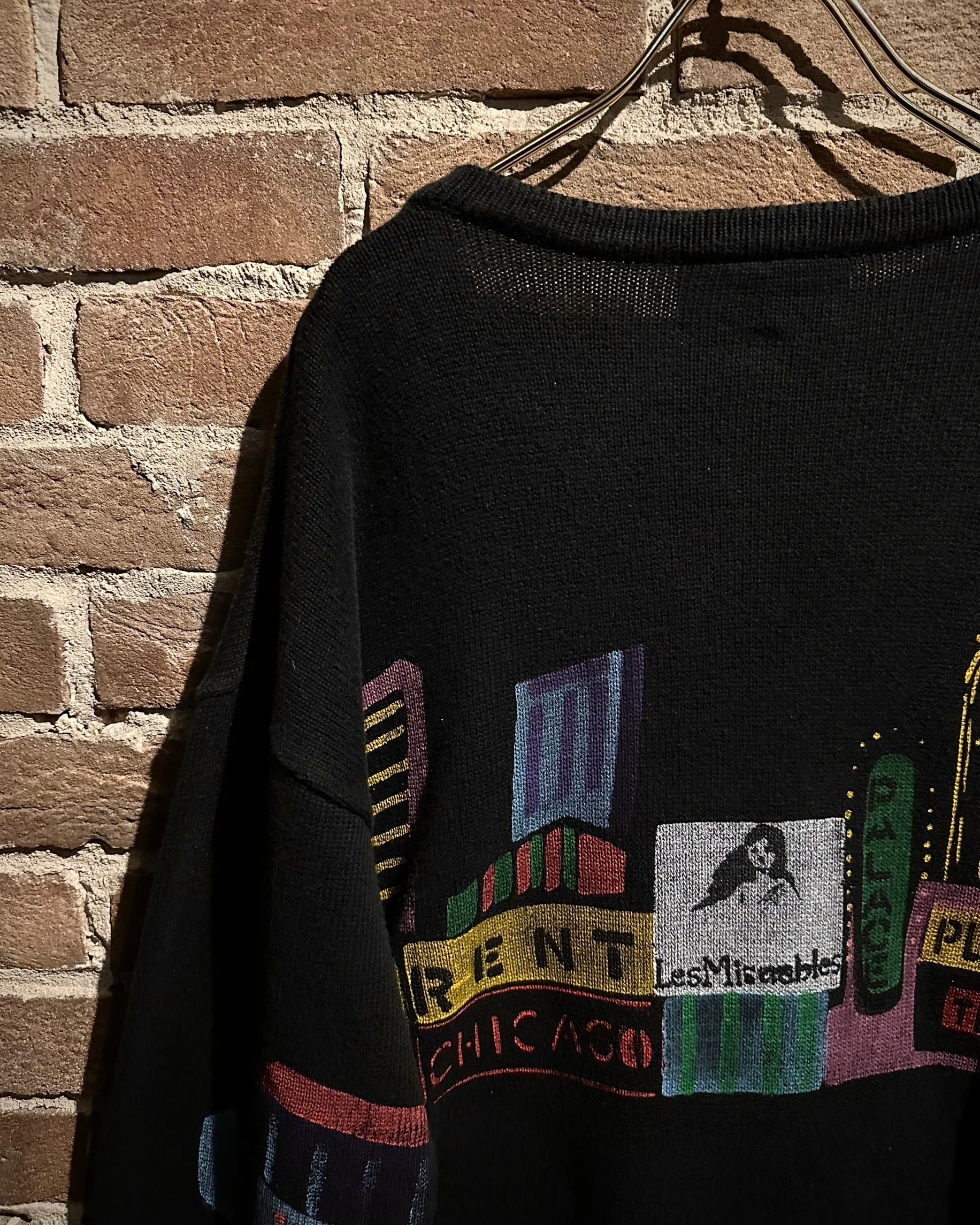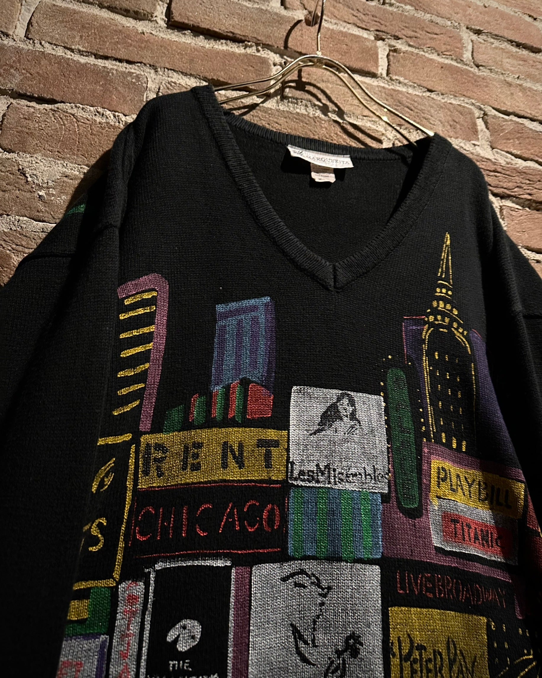 ブラックベースのニットボディに、街並みを描いたグラフィックを大胆に落とし込んだ80's〜90's USA製のニット。