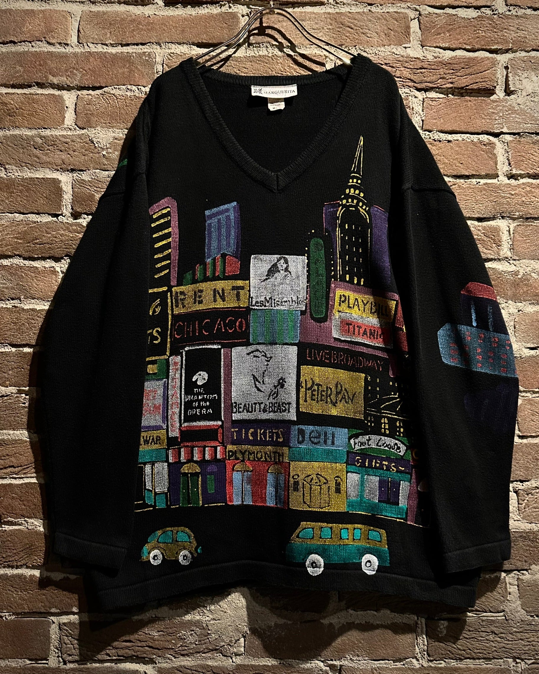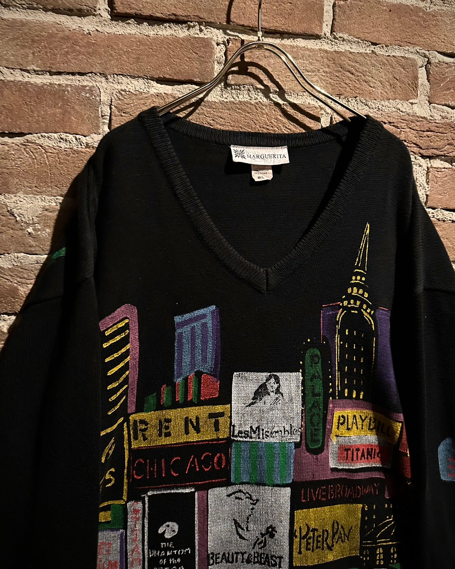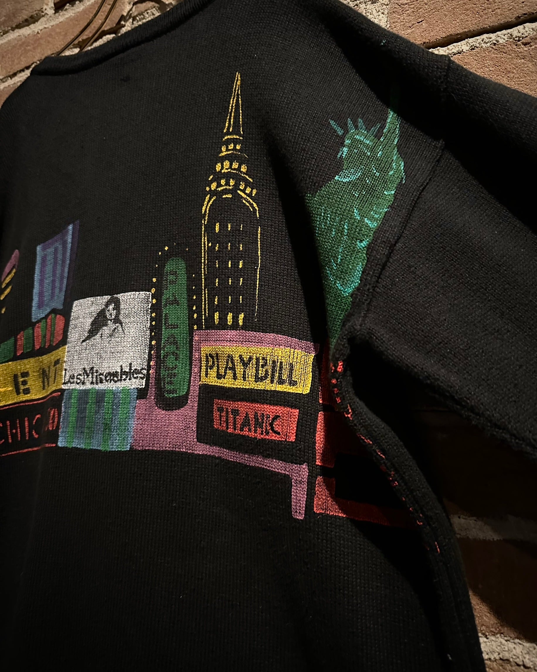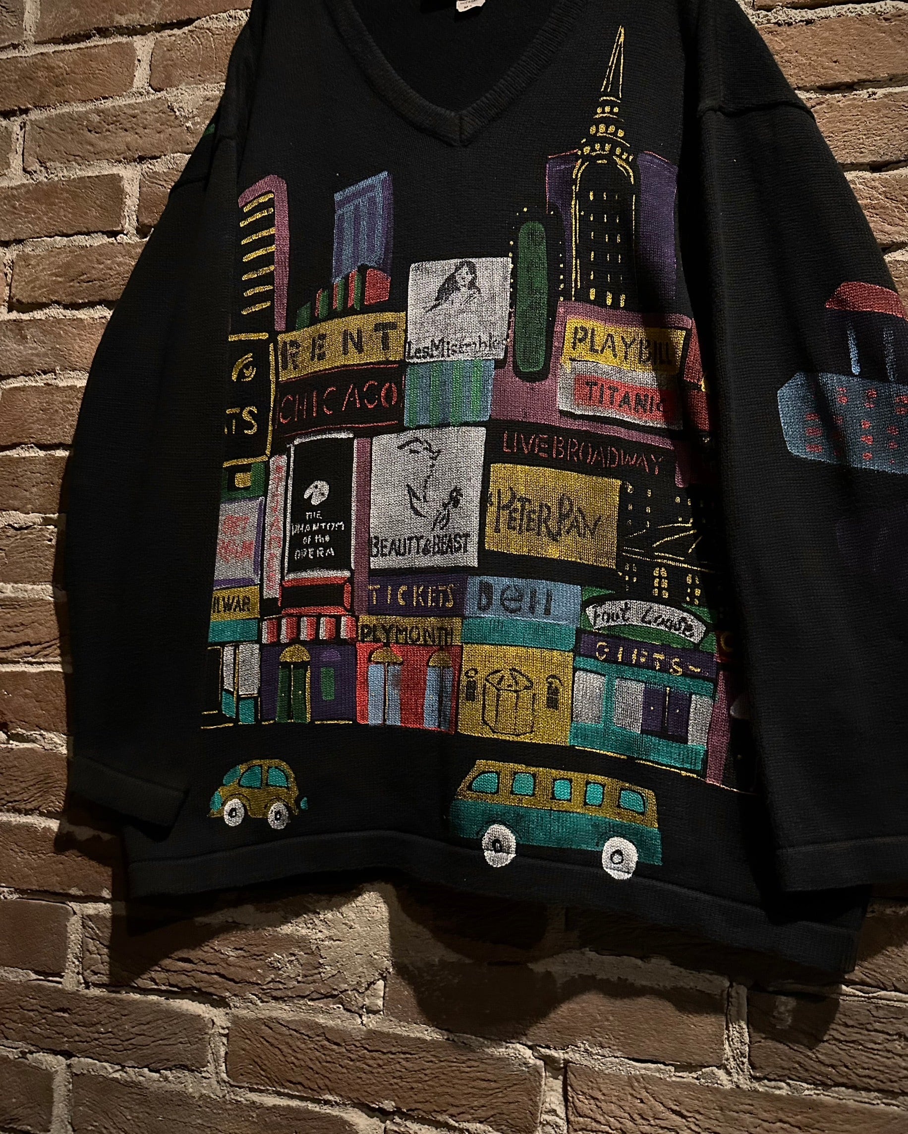 ブラックベースのニットボディに、街並みを描いたグラフィックを大胆に落とし込んだ80's〜90's USA製のニット。