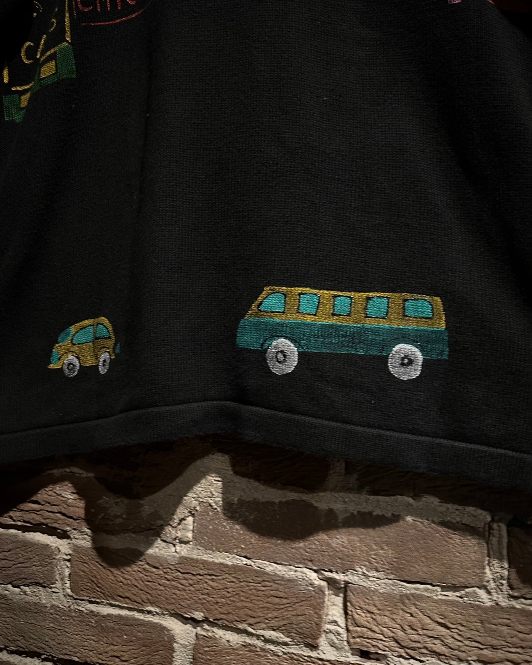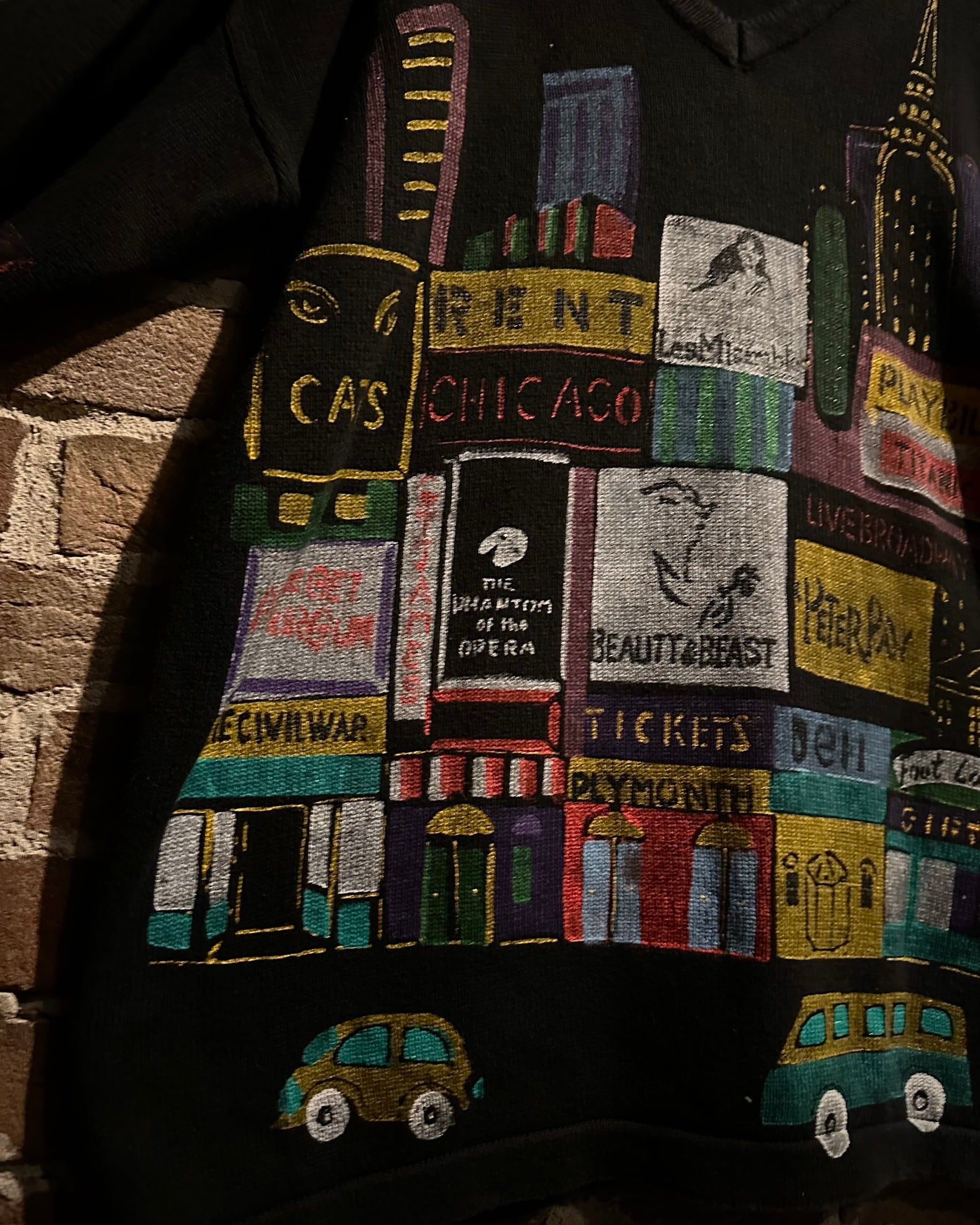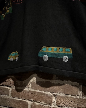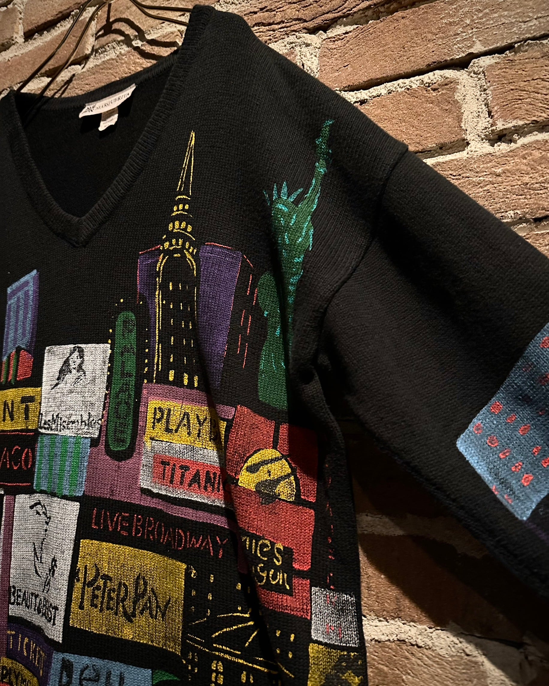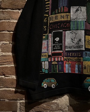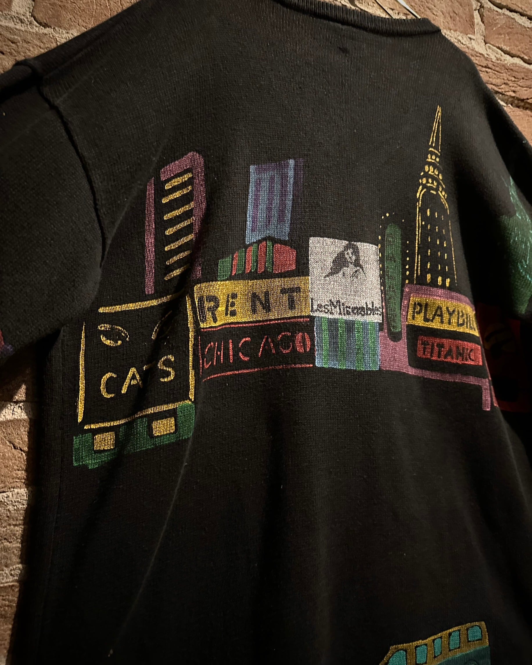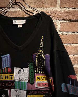 ブラックベースのニットボディに、街並みを描いたグラフィックを大胆に落とし込んだ80's〜90's USA製のニット。