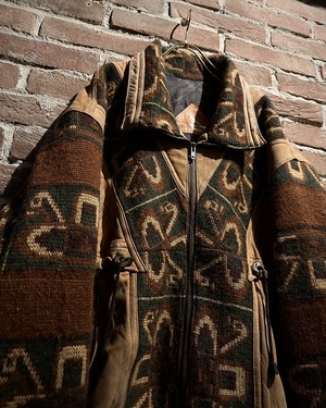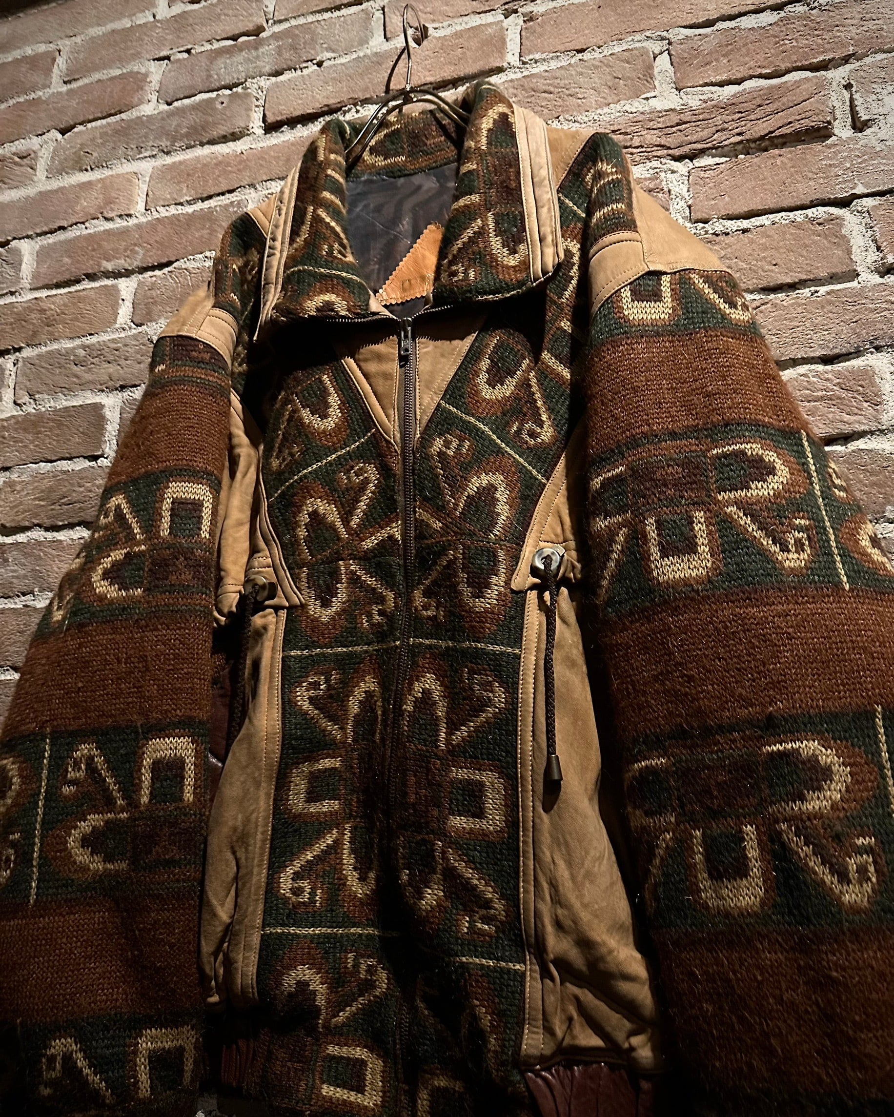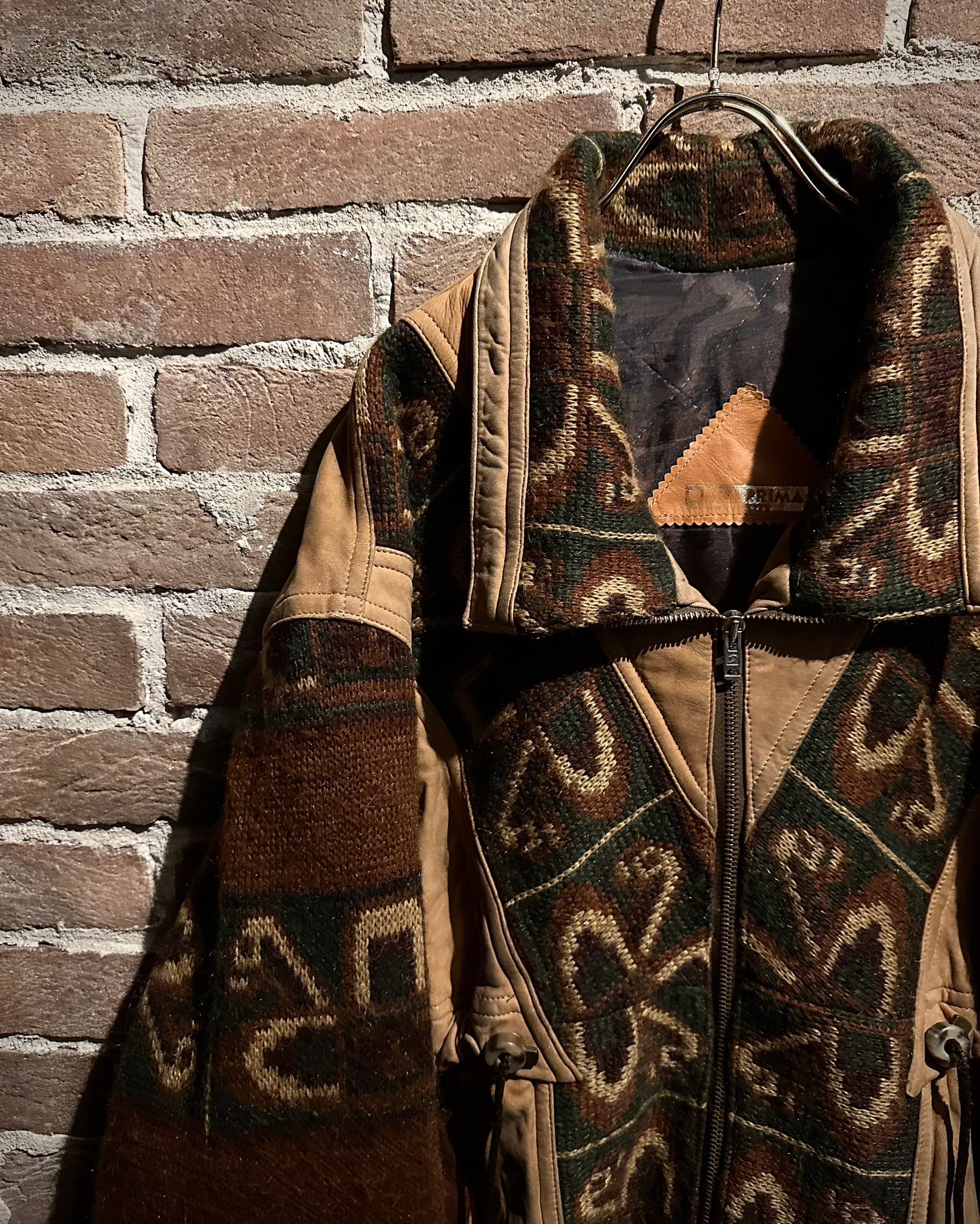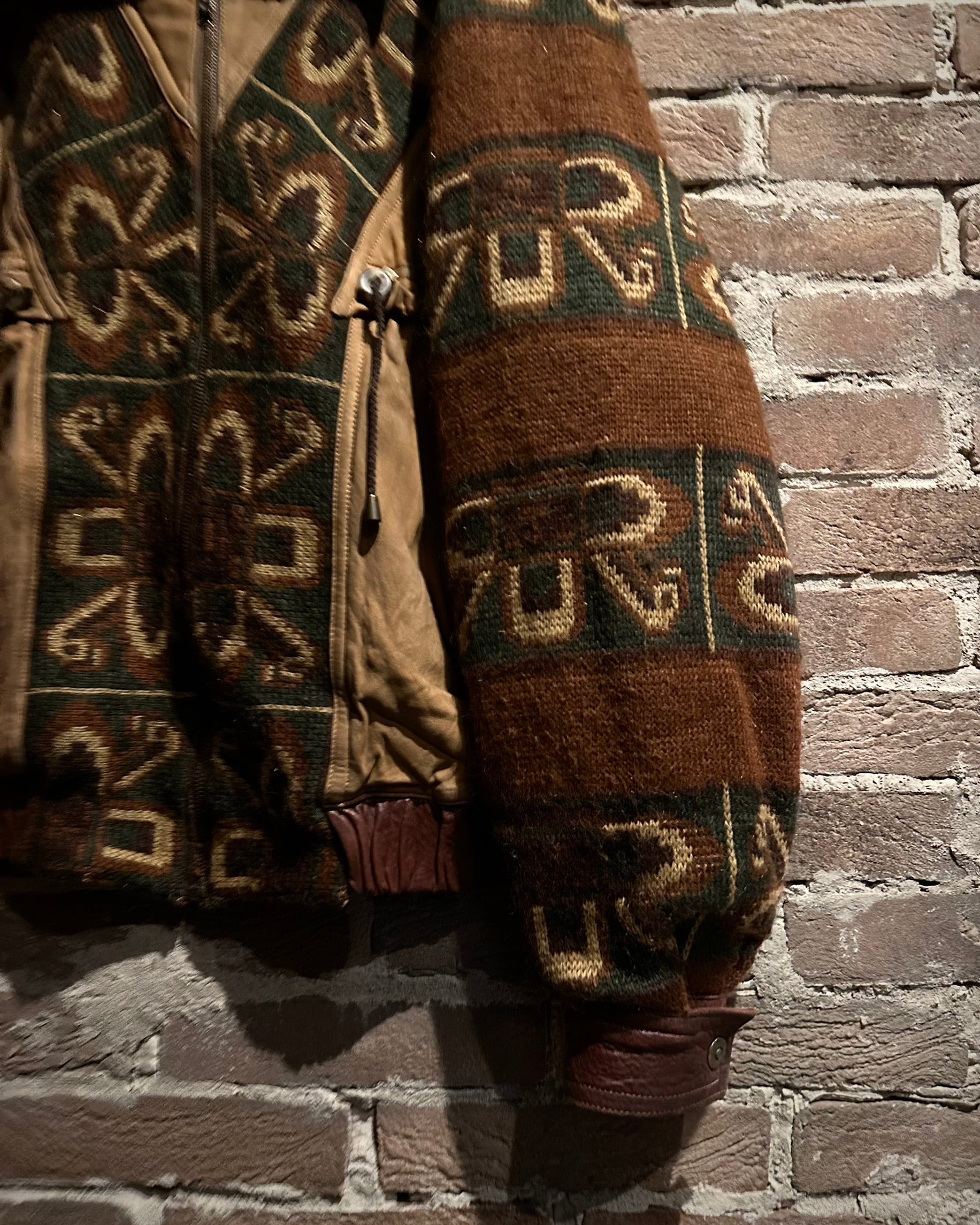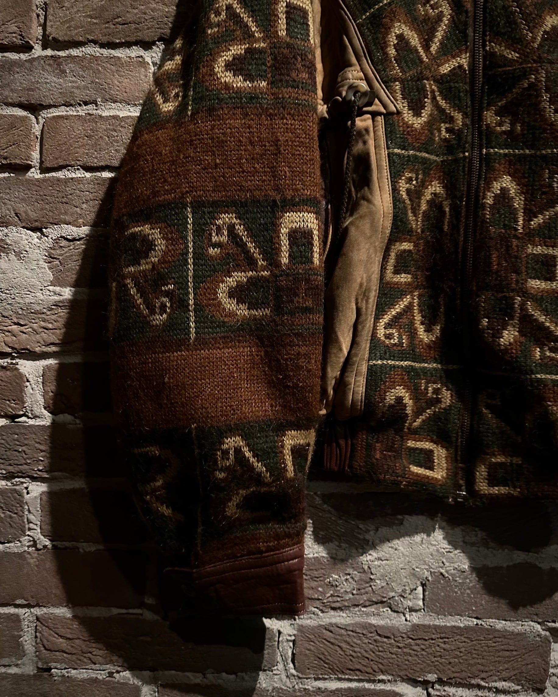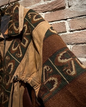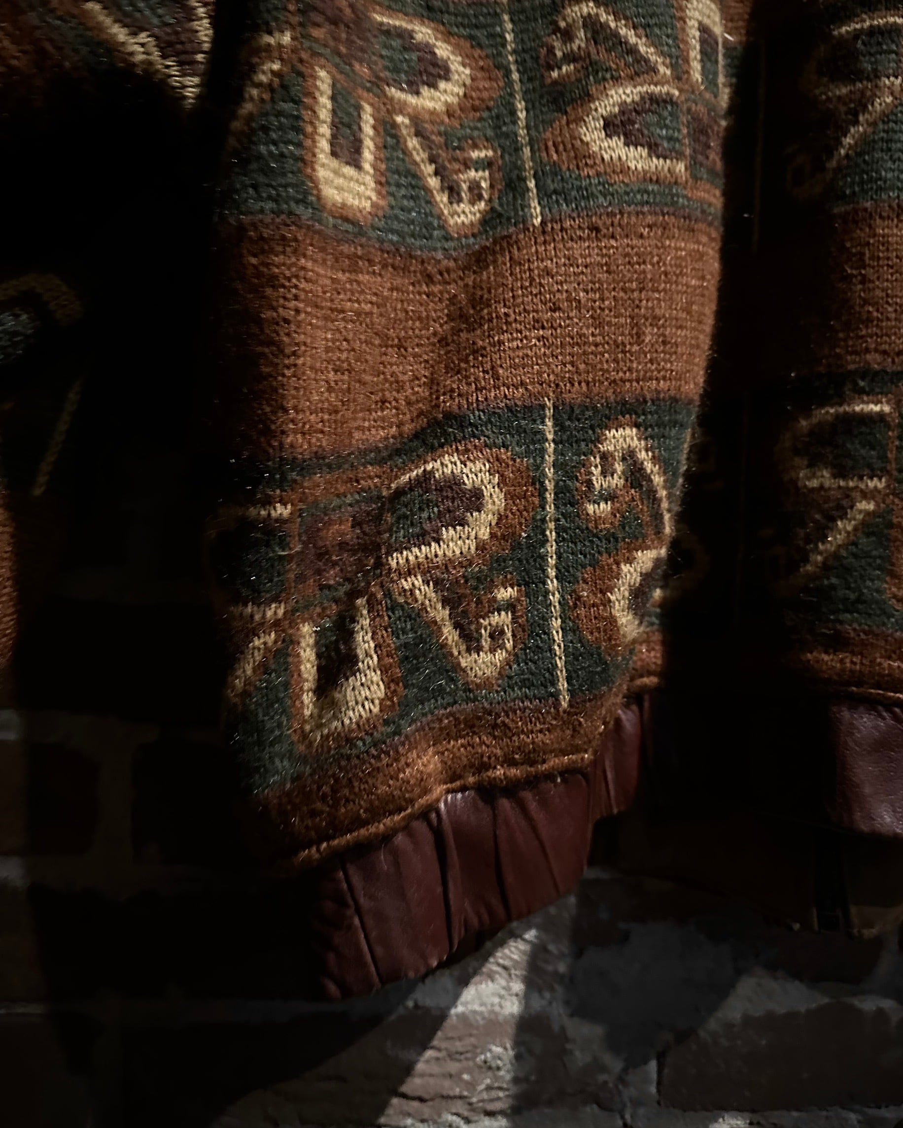 温かみのあるブラウン、オリーブトーンを軸に、幾何学的なニットパターンが全体に広がり、クラフト感と民族的ムードを自然に漂わせます。そこへレザーを重ねることで、単なるニットアウターに留まらない奥行きのある表情を演出。