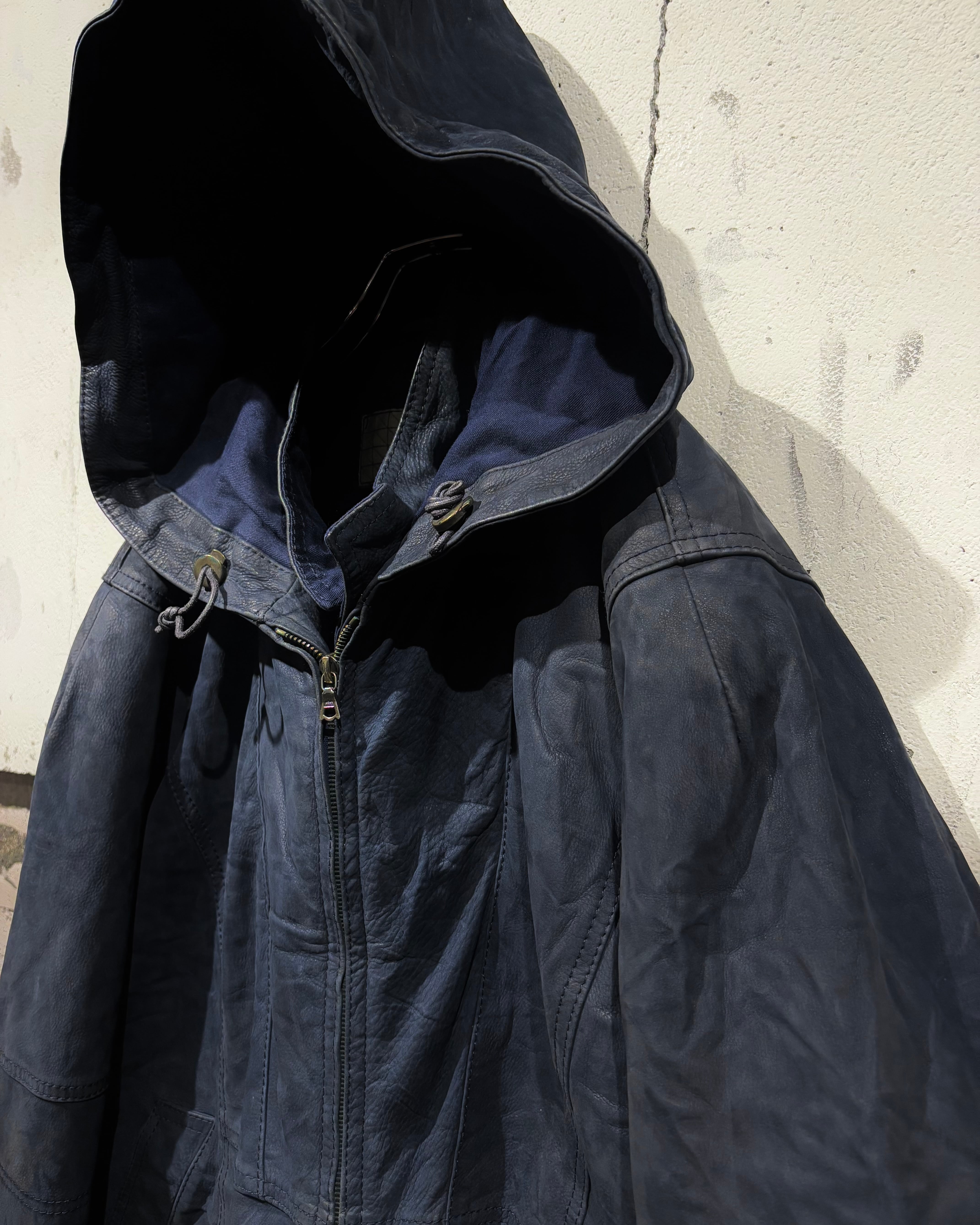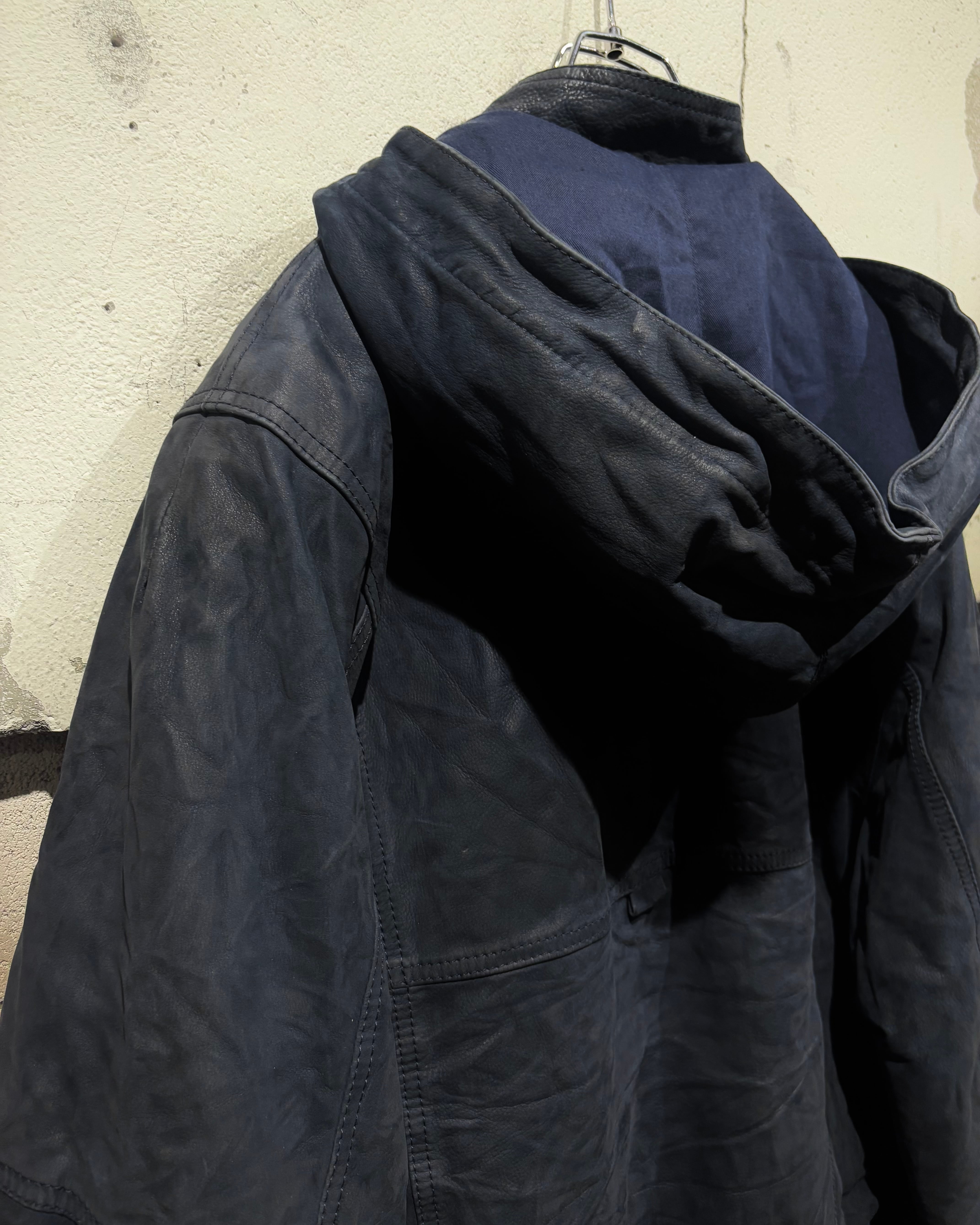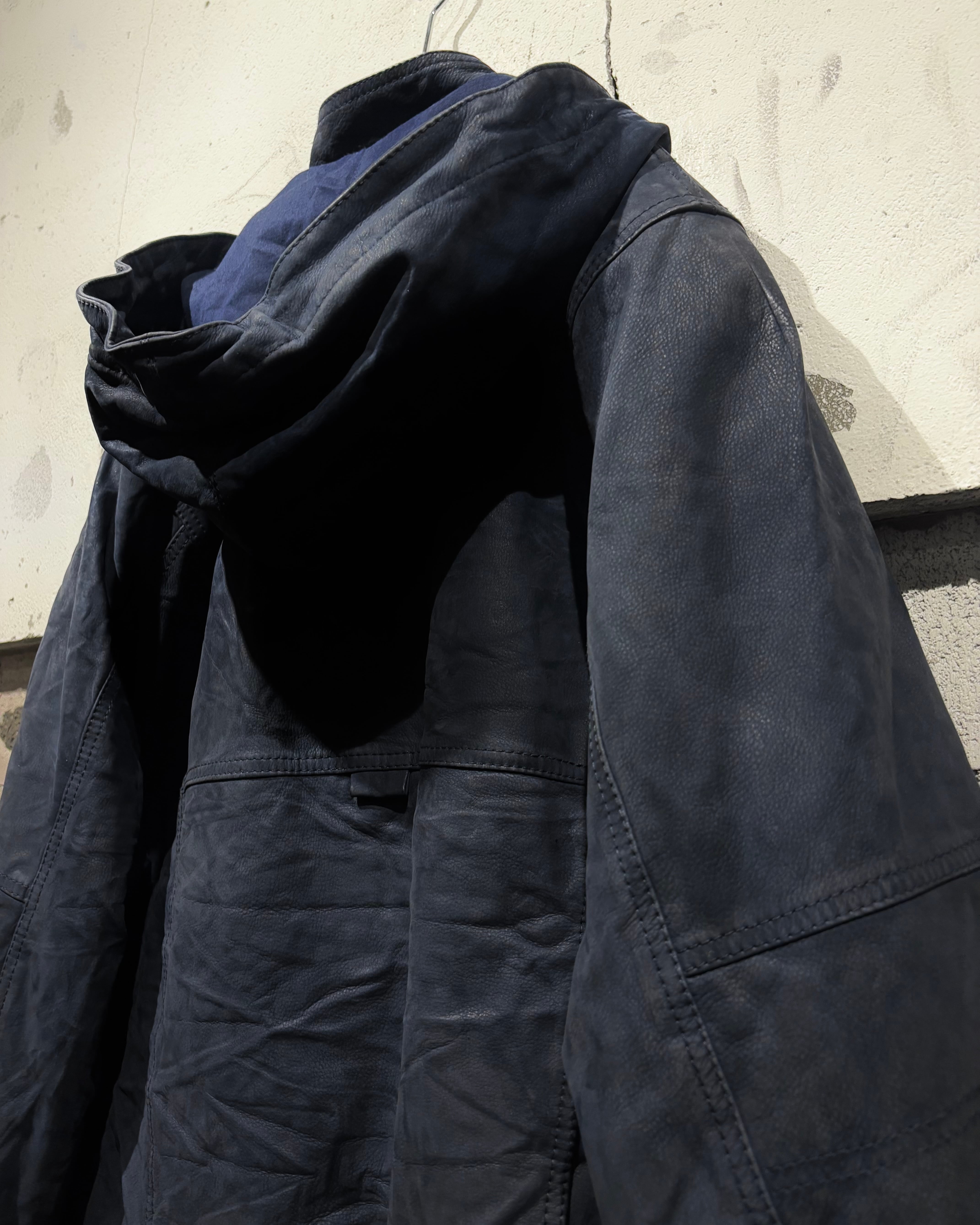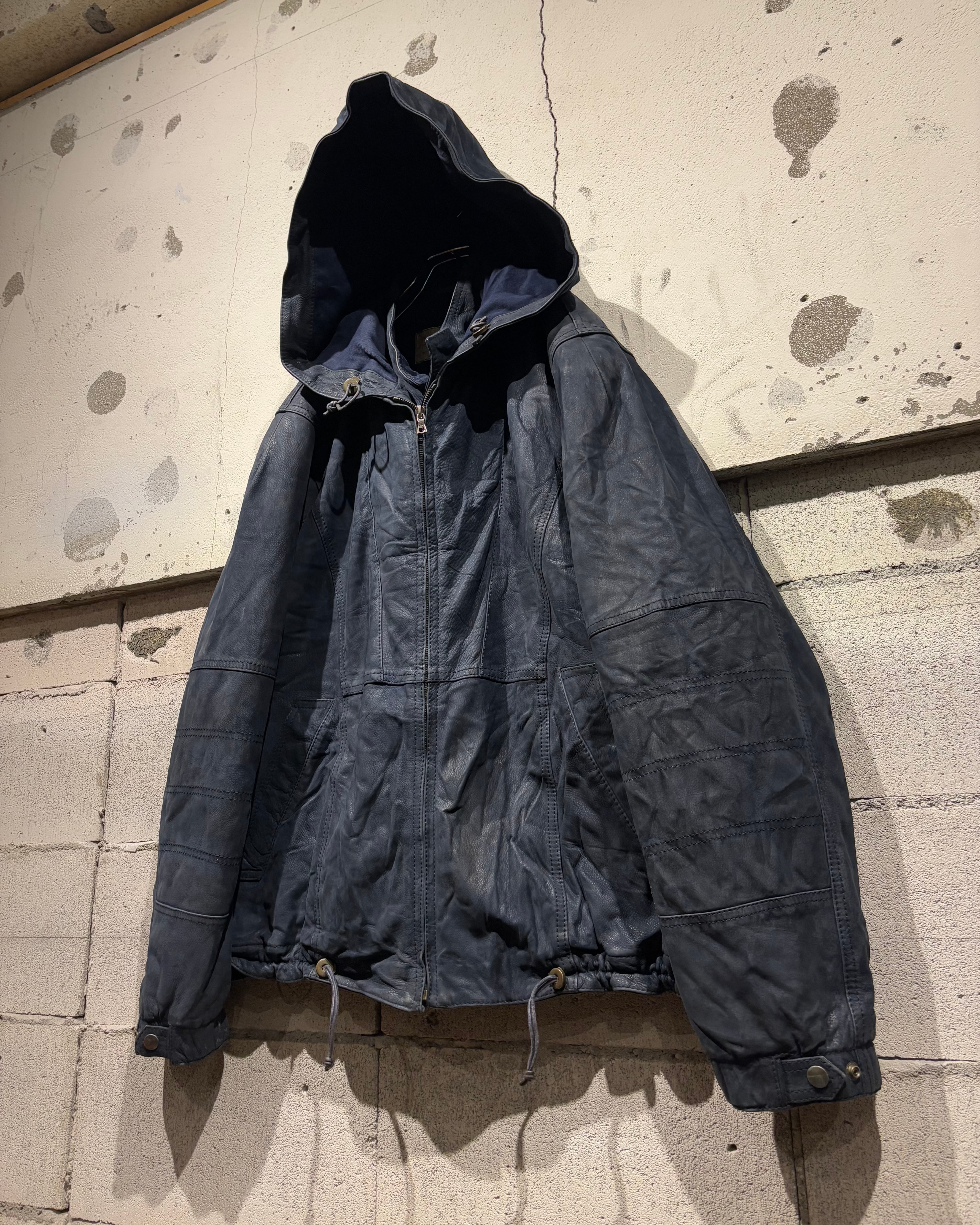 稀有なネイビーカラーのレザーを用いた、スペシャルなフーディレザージャケット。