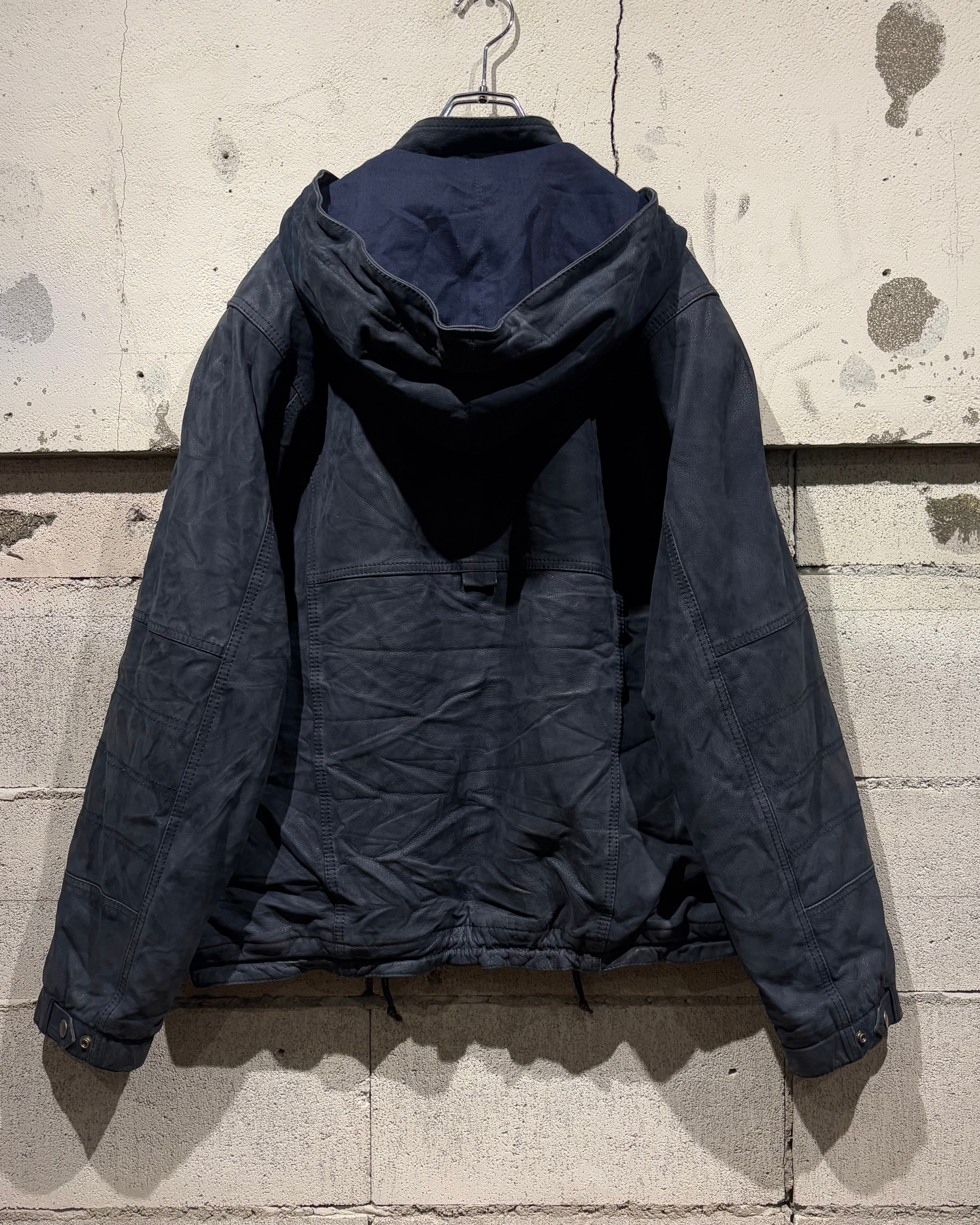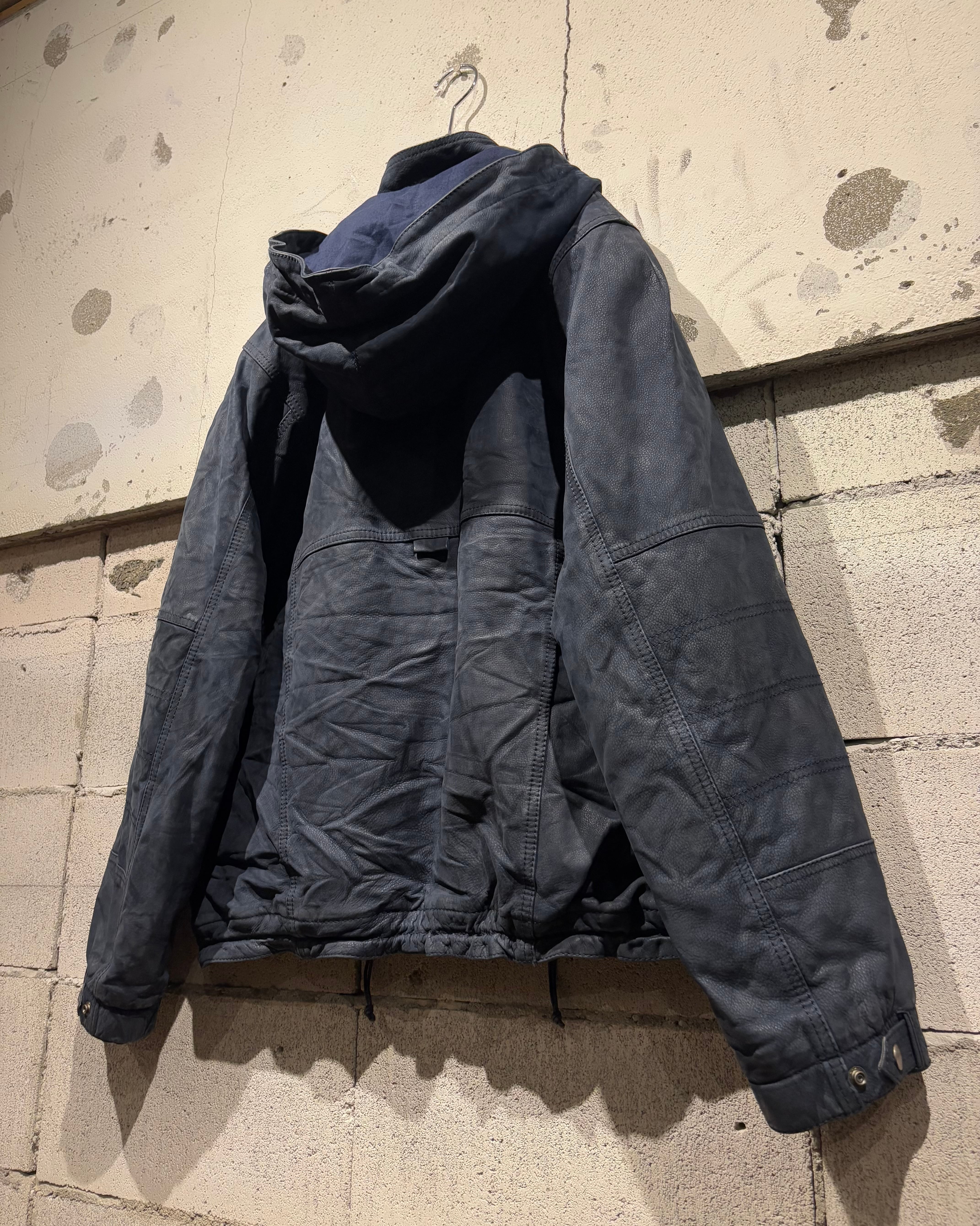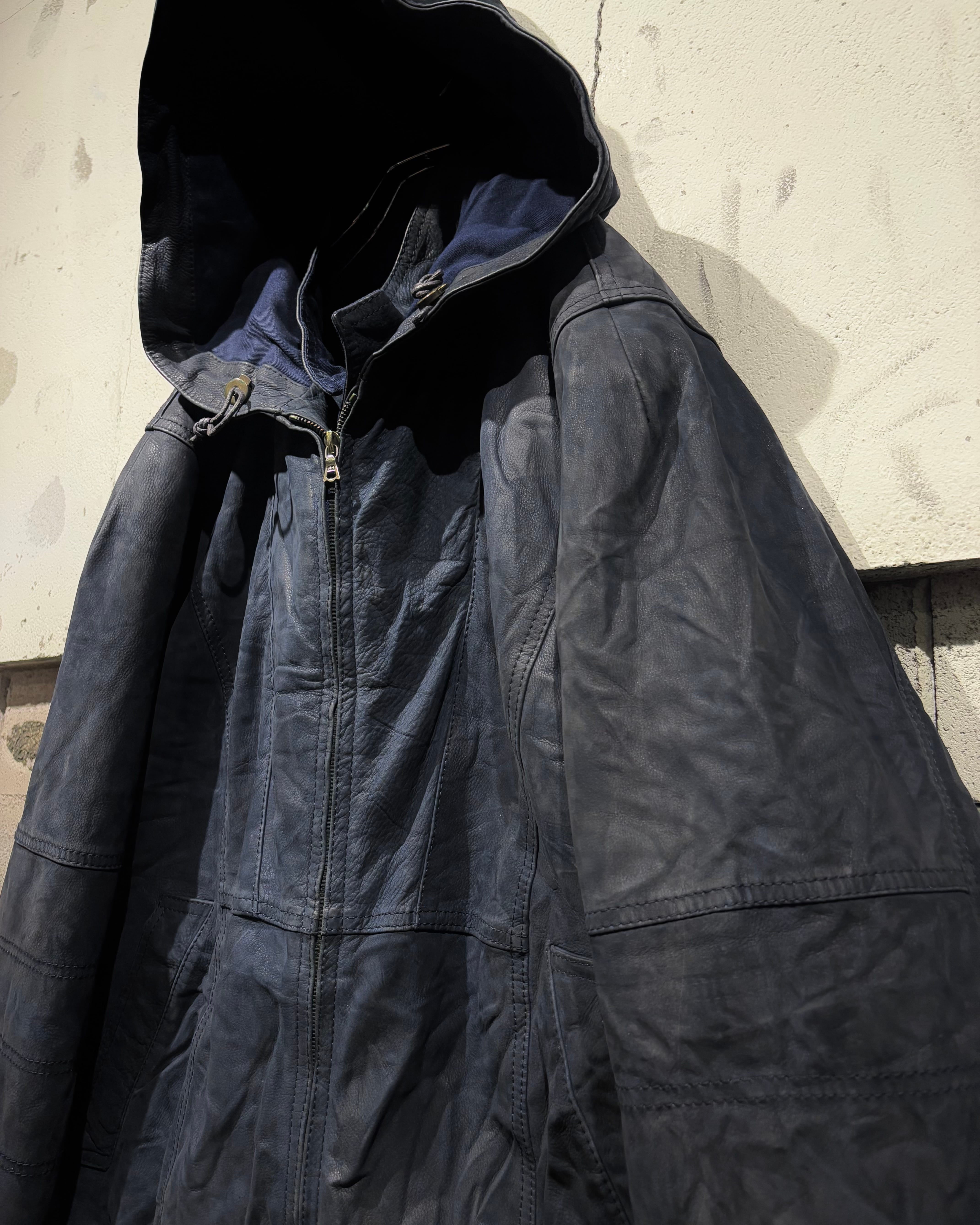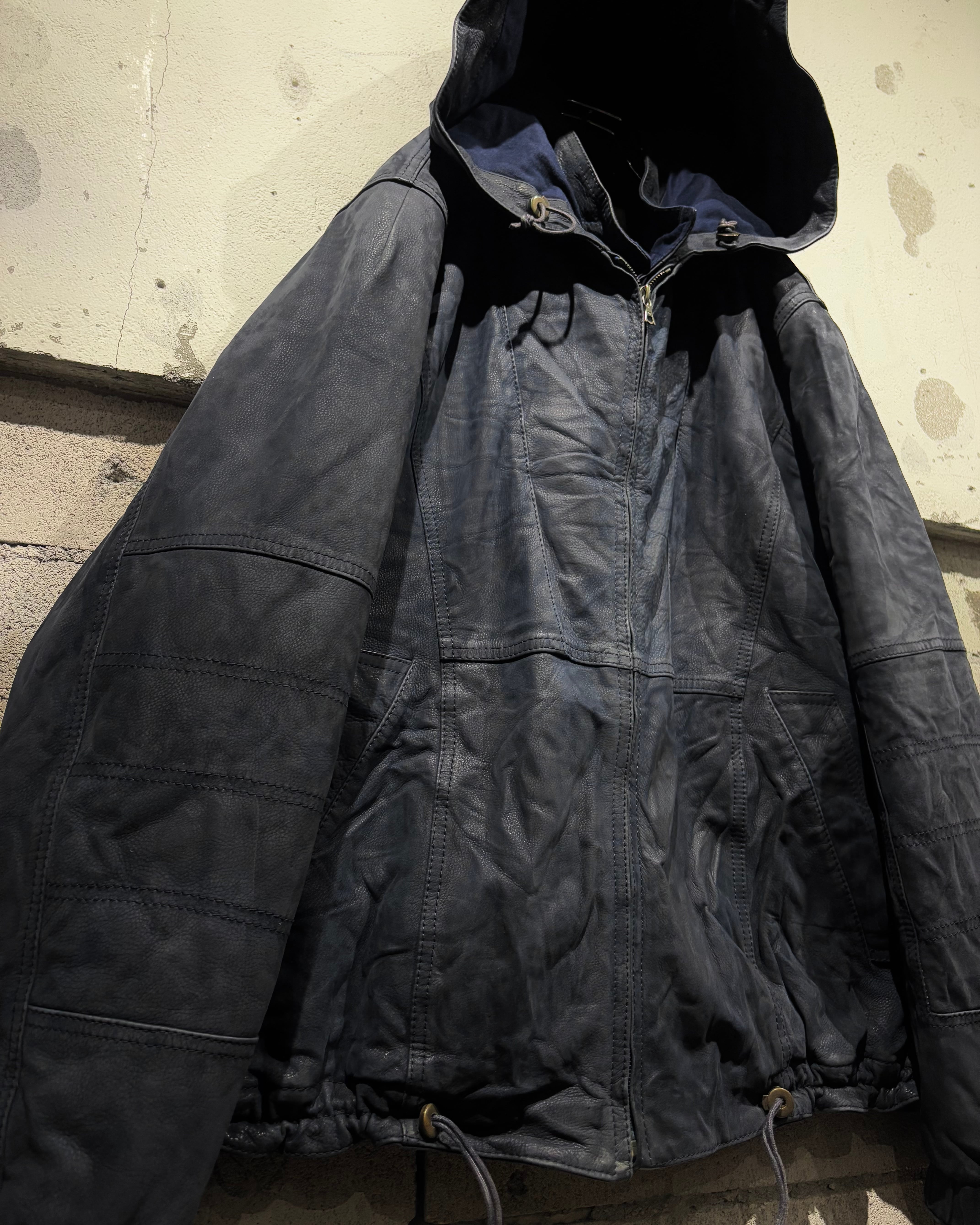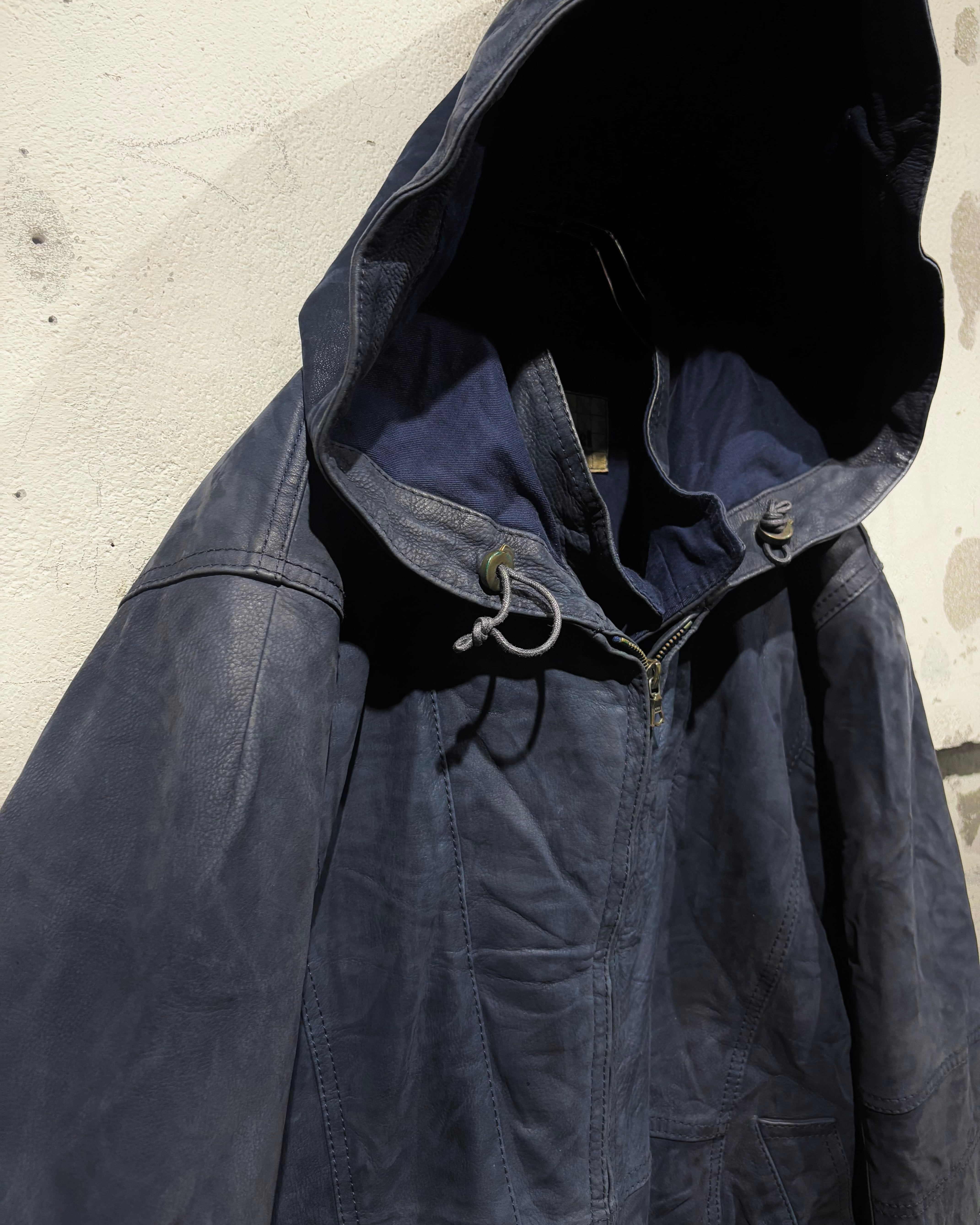稀有なネイビーカラーのレザーを用いた、スペシャルなフーディレザージャケット。