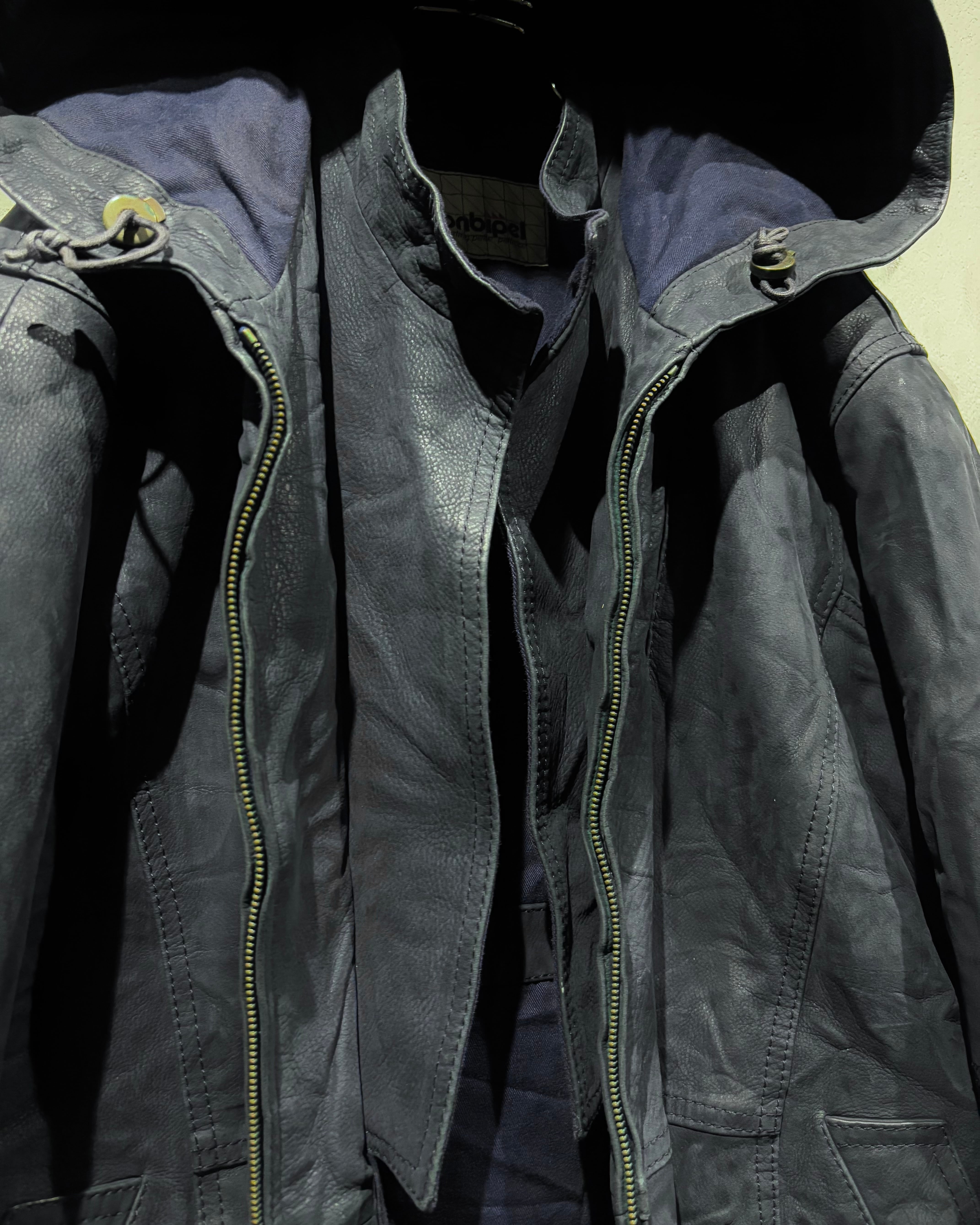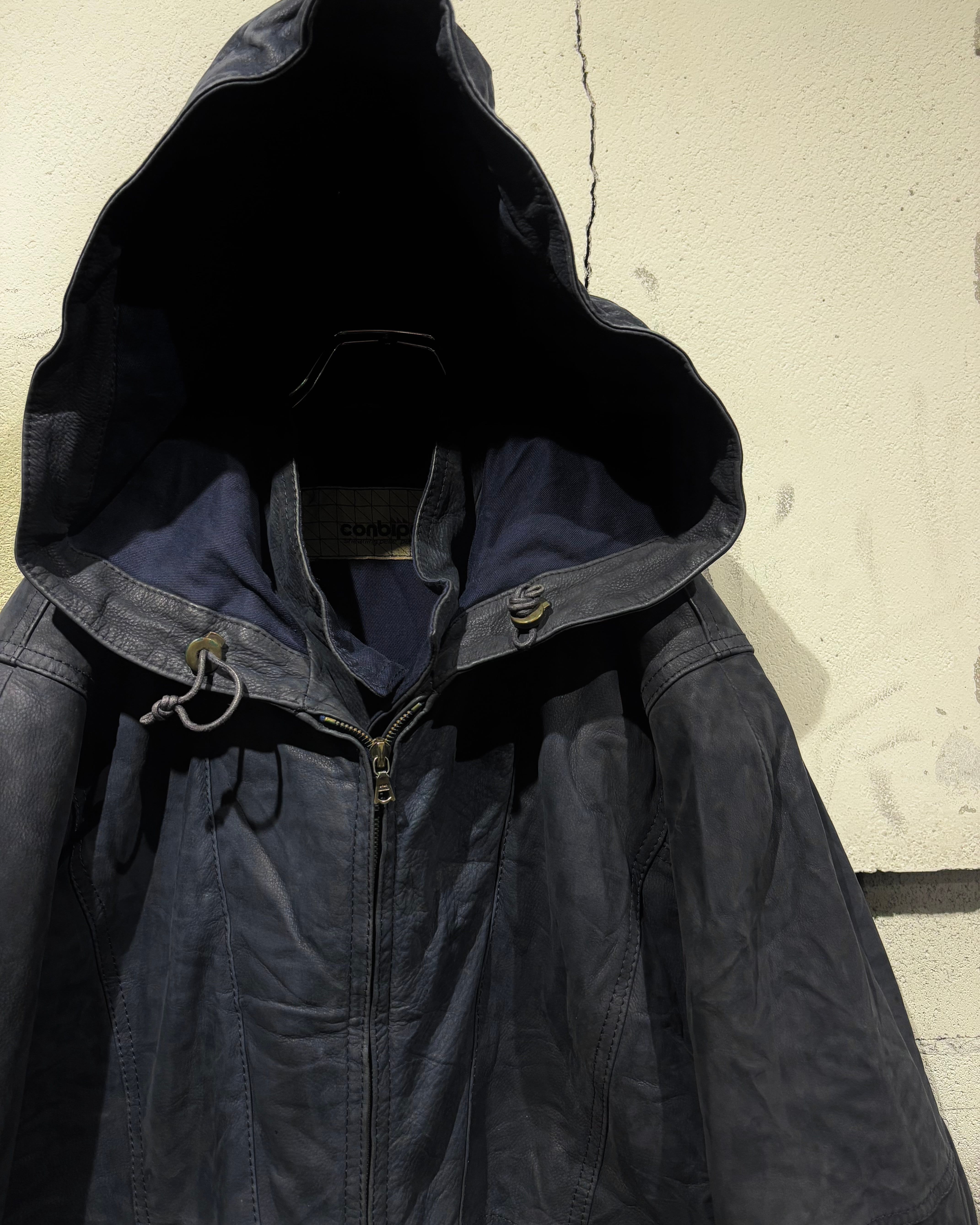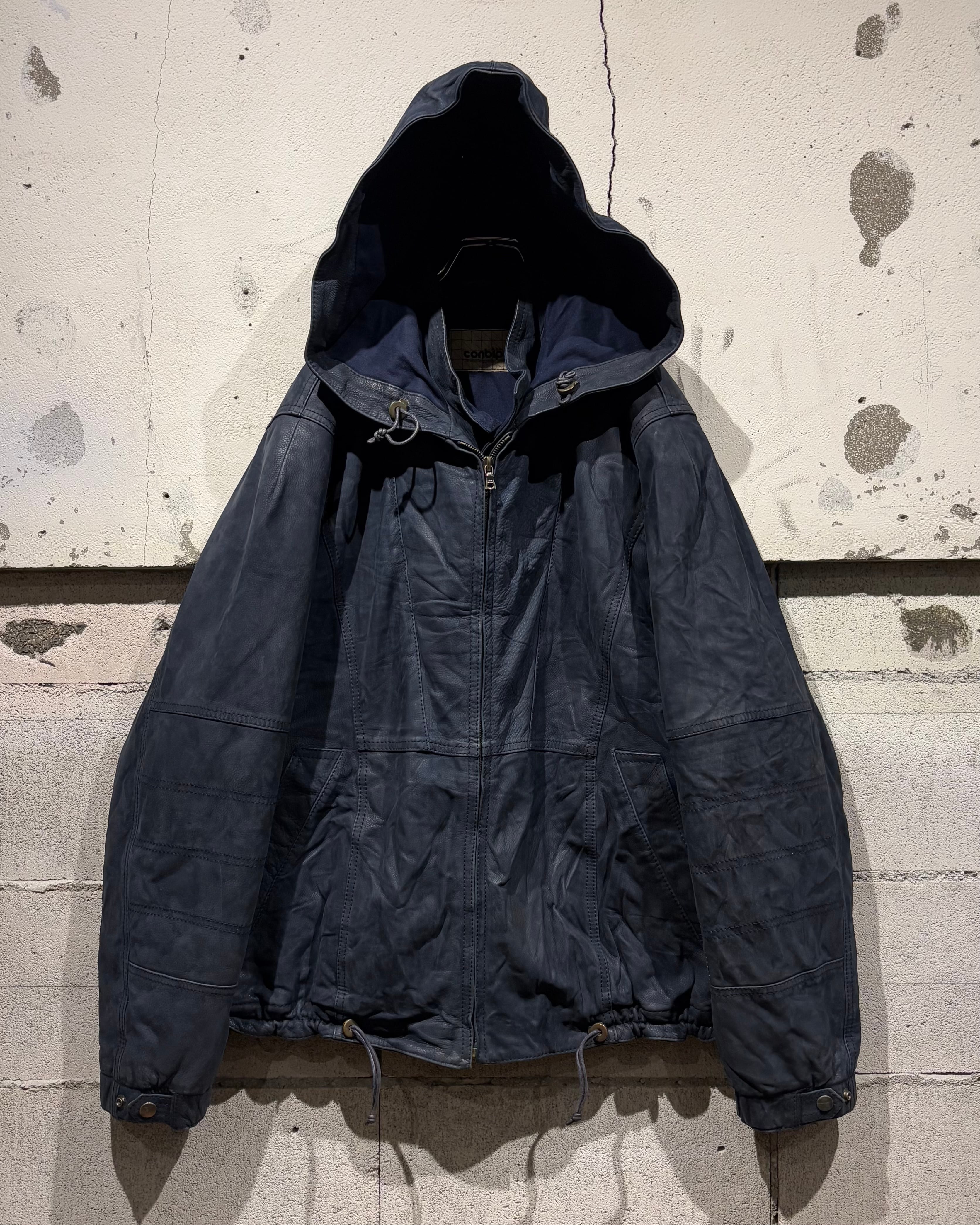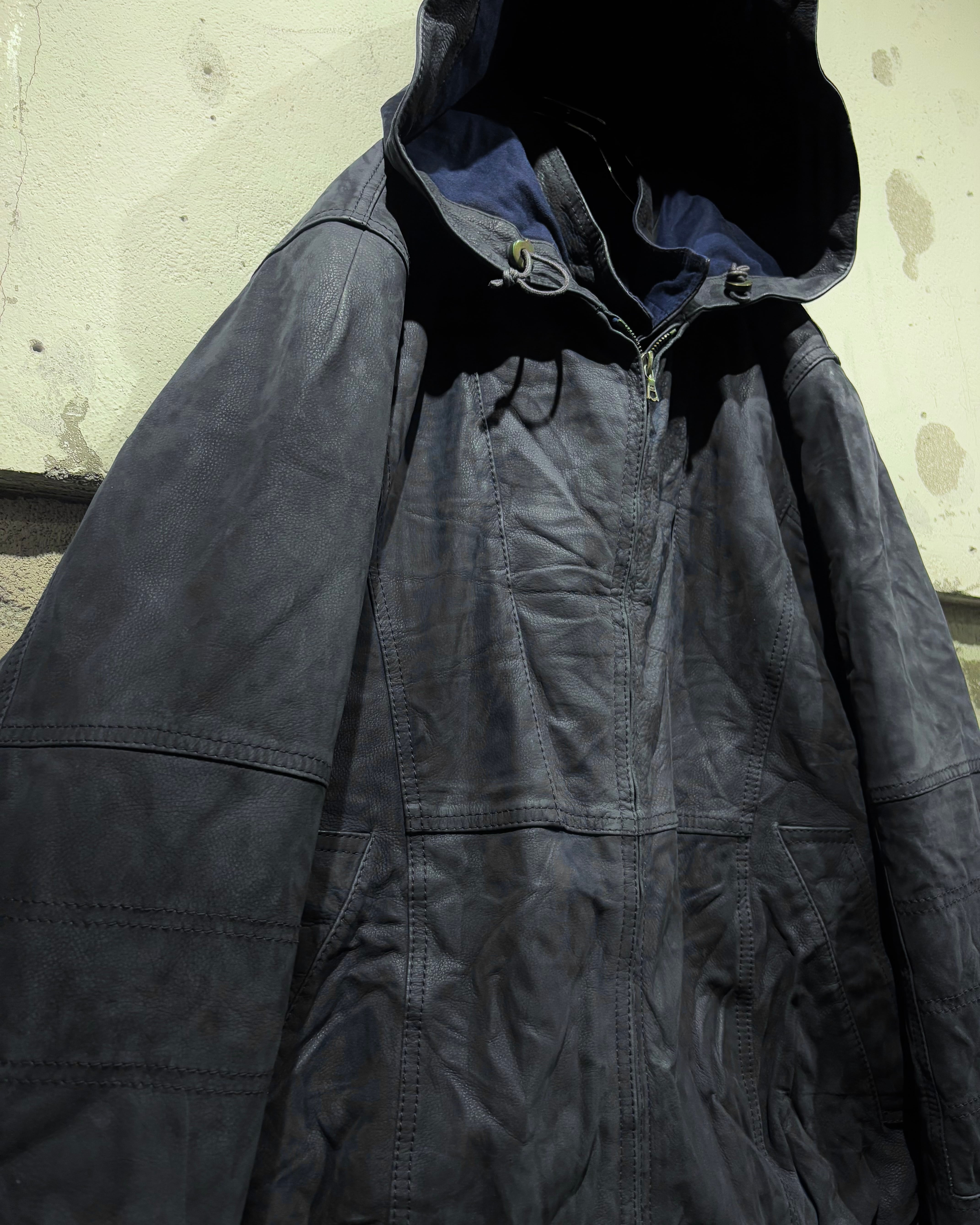 稀有なネイビーカラーのレザーを用いた、スペシャルなフーディレザージャケット。