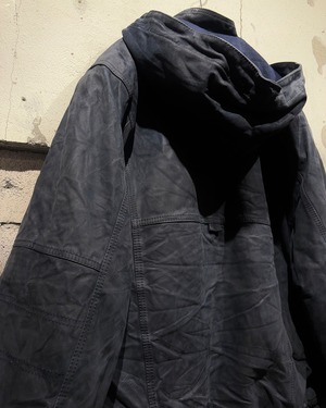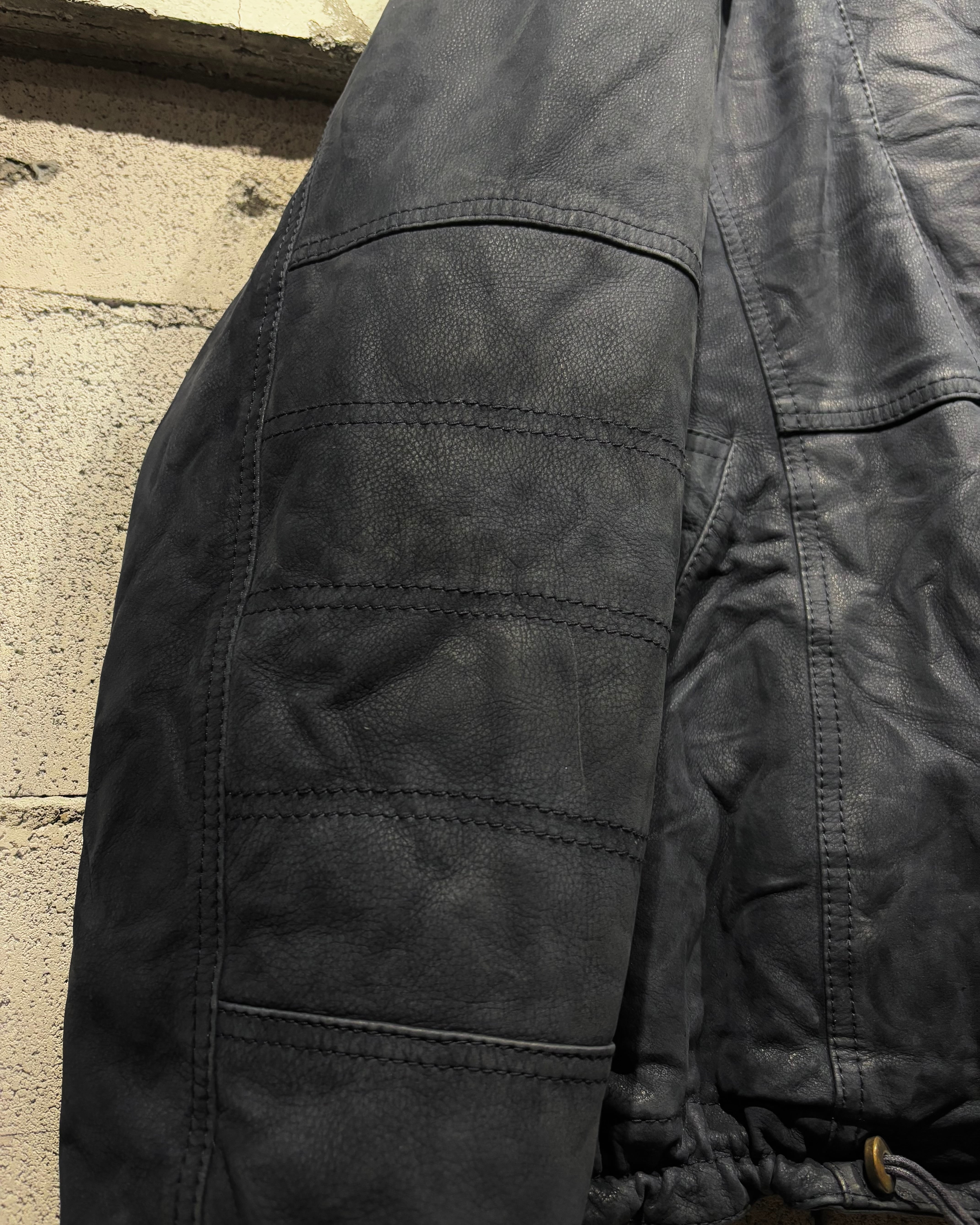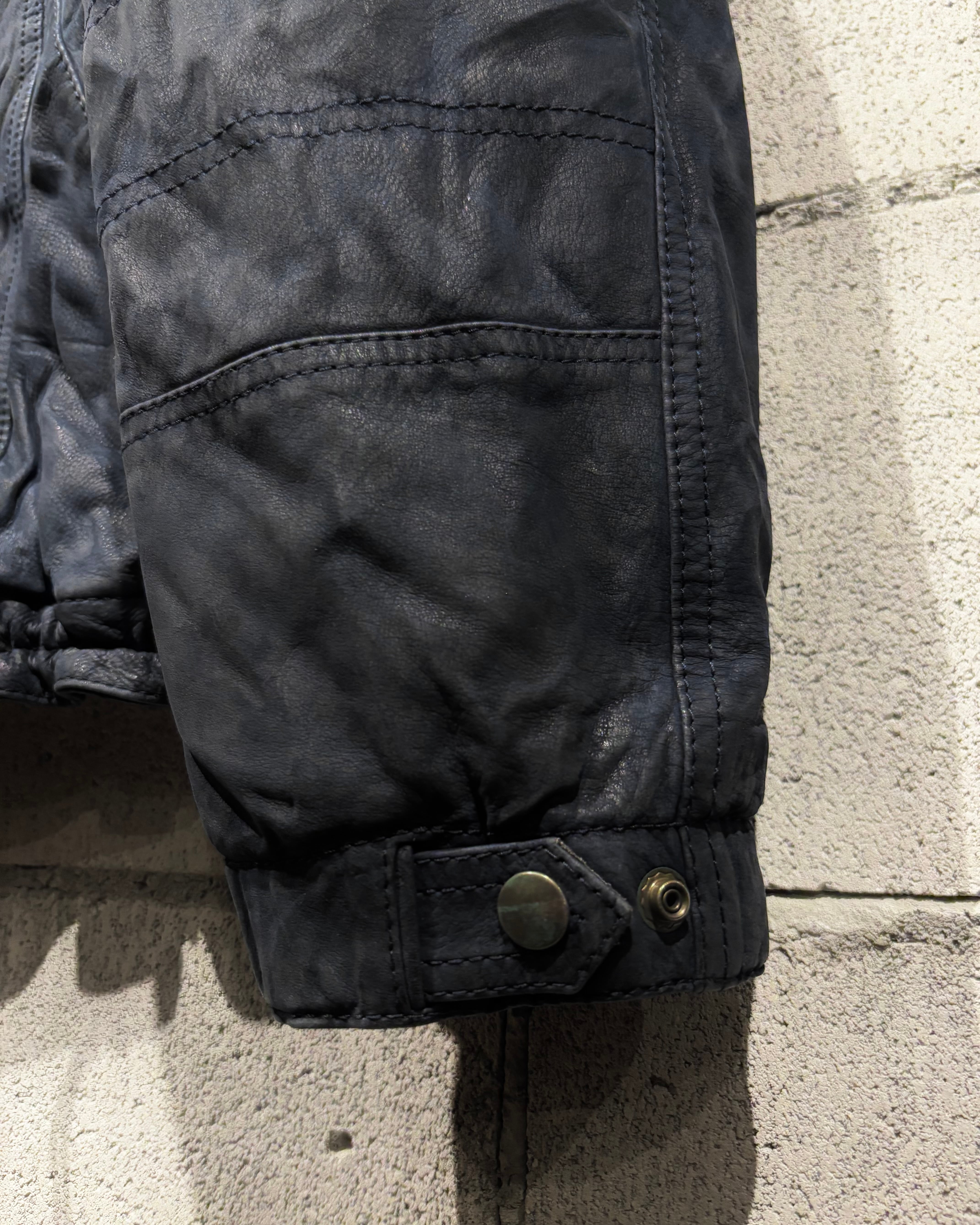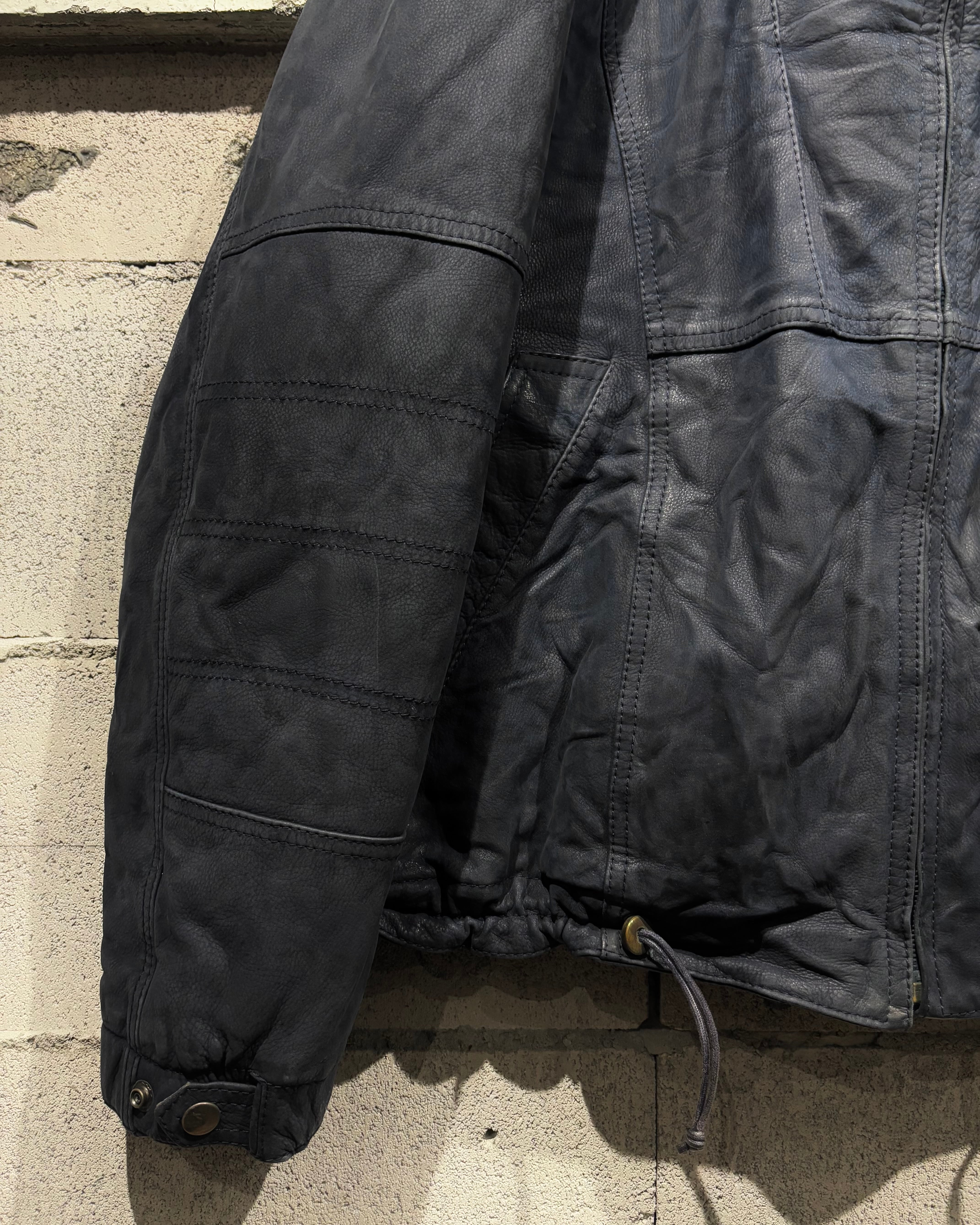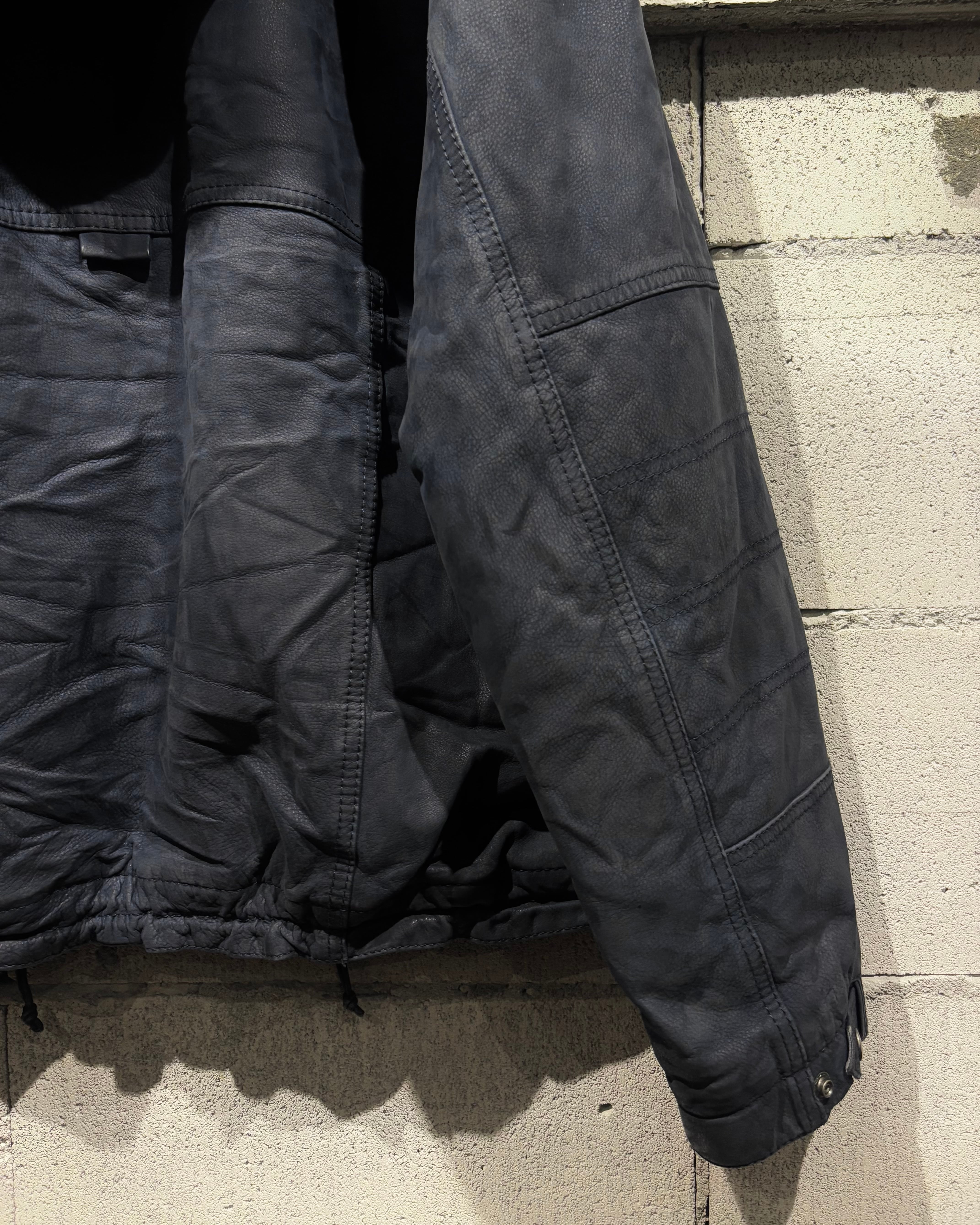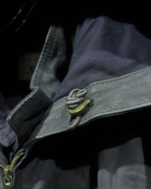 稀有なネイビーカラーのレザーを用いた、スペシャルなフーディレザージャケット。