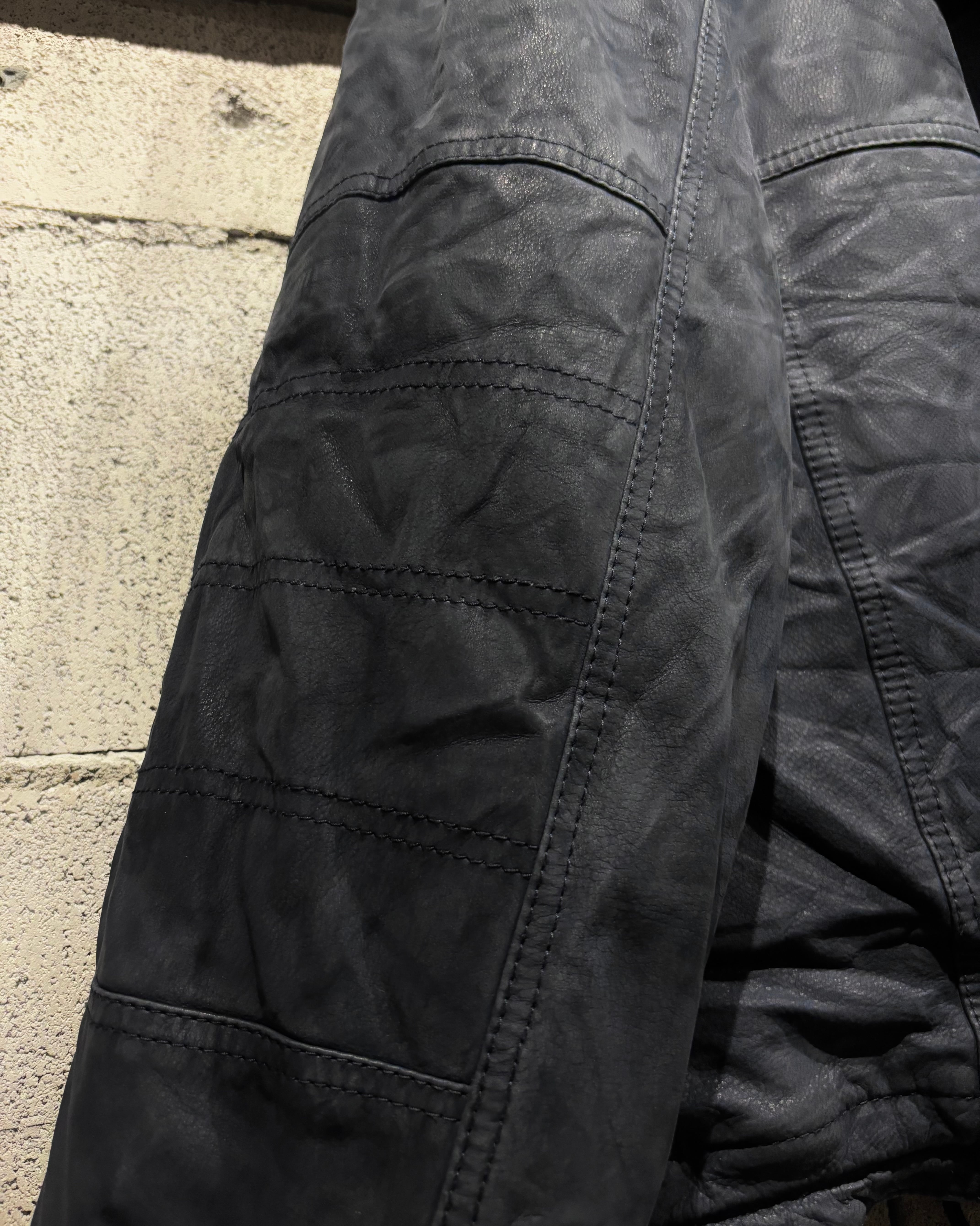 最大の特徴は、首元に施されたレイヤード風のデザイン。インナーにスタンドカラーのジャケットを重ねたような立体的なデザインが、シンプルなレザージャケットとは一線を画す仕上がりです。