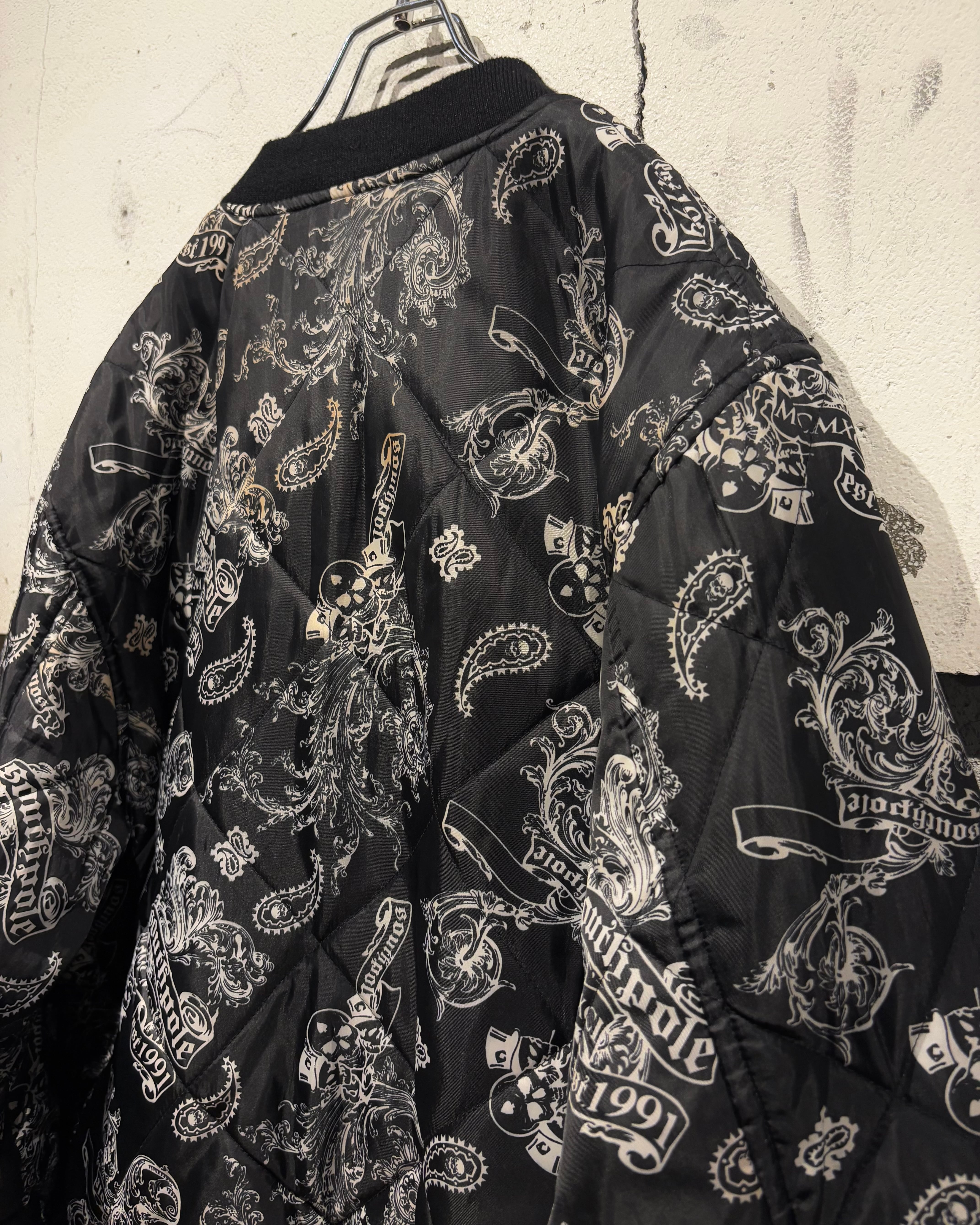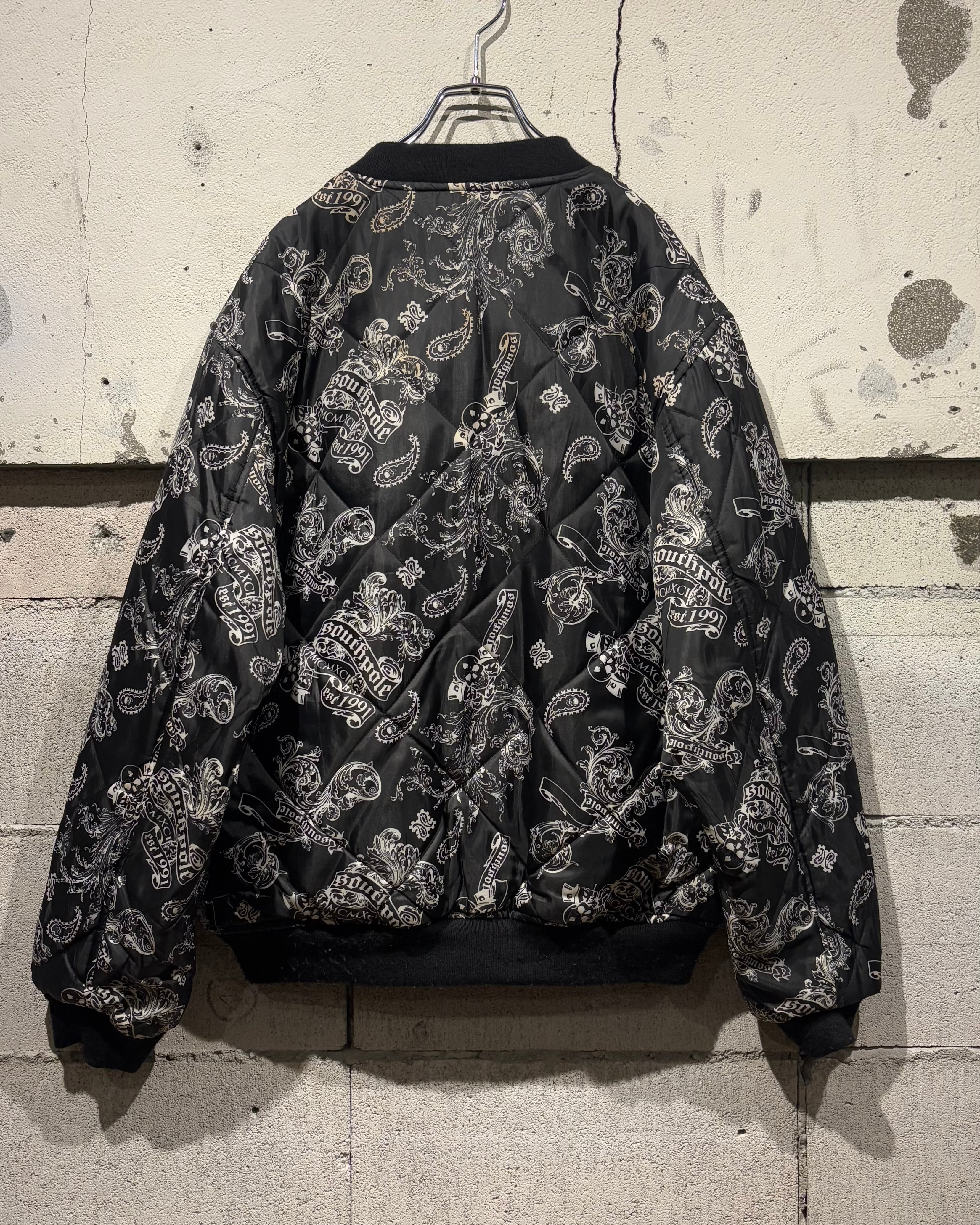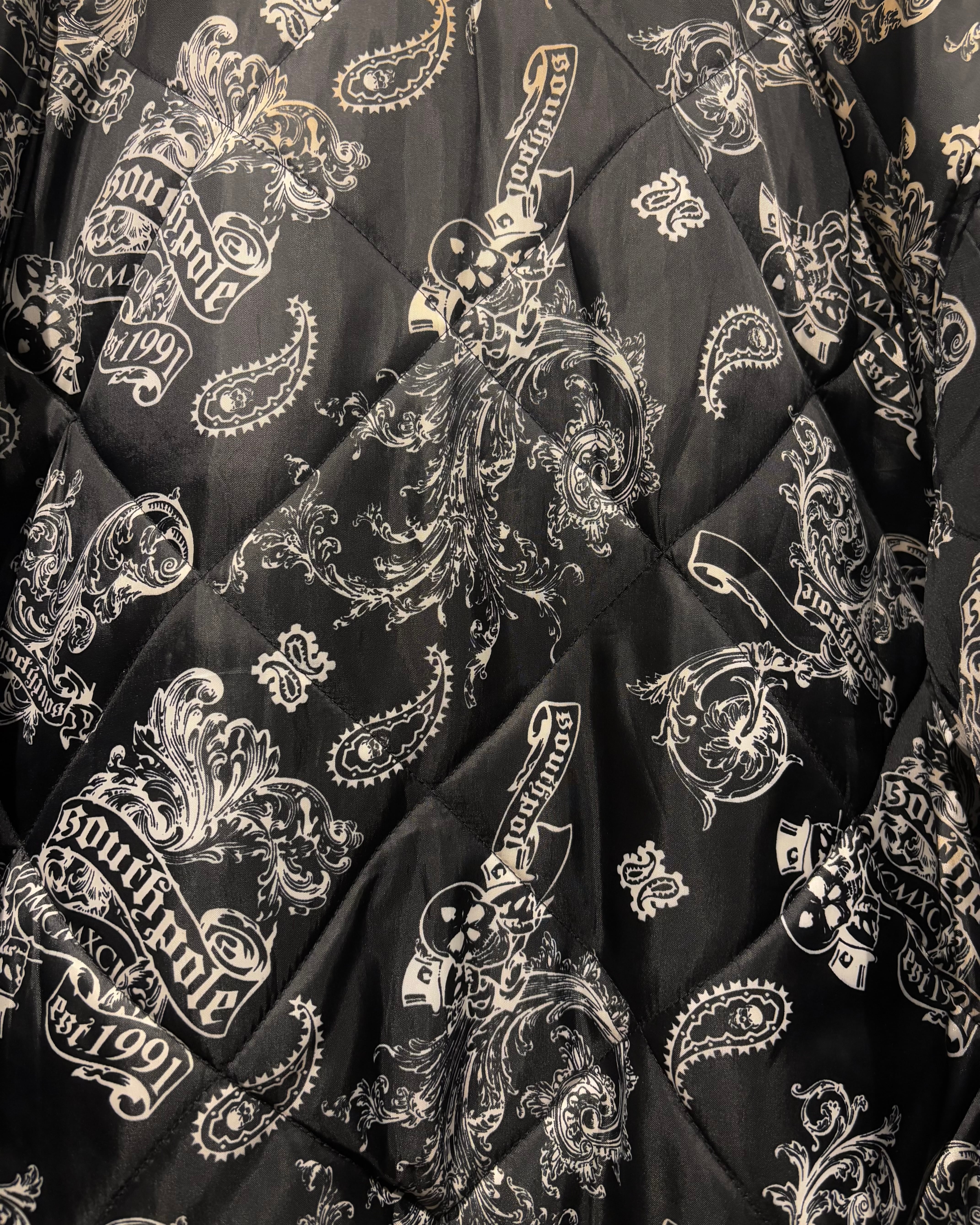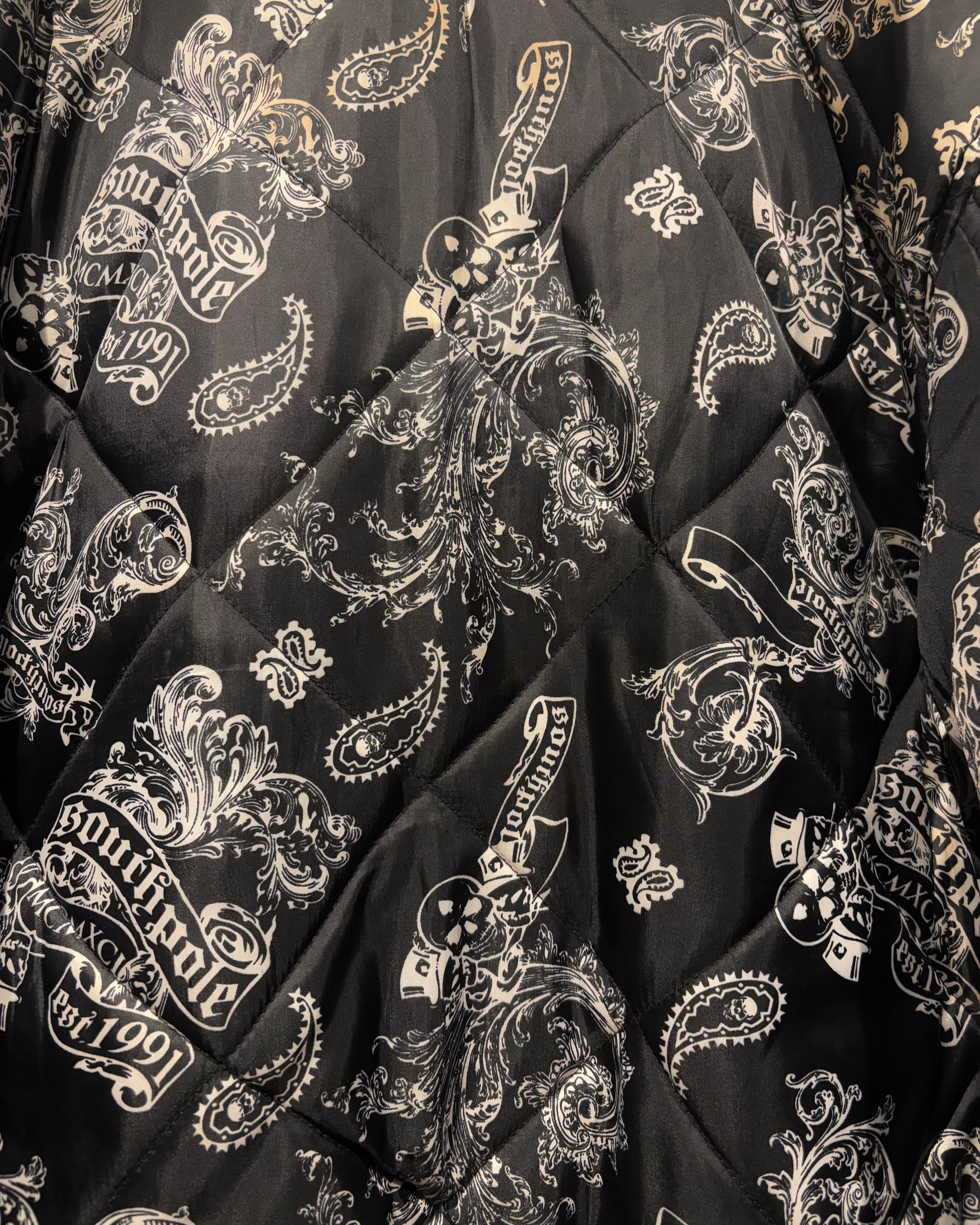表面にはキルティング加工を施し、ペイズリーとスカルを掛け合わせた総柄デザインを採用。ストリート色の強い主張あるルックスながら、ブラックベースの配色によりまとまりのある印象に仕上がっています。