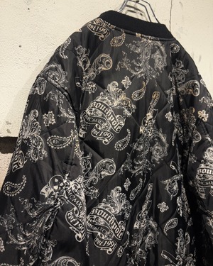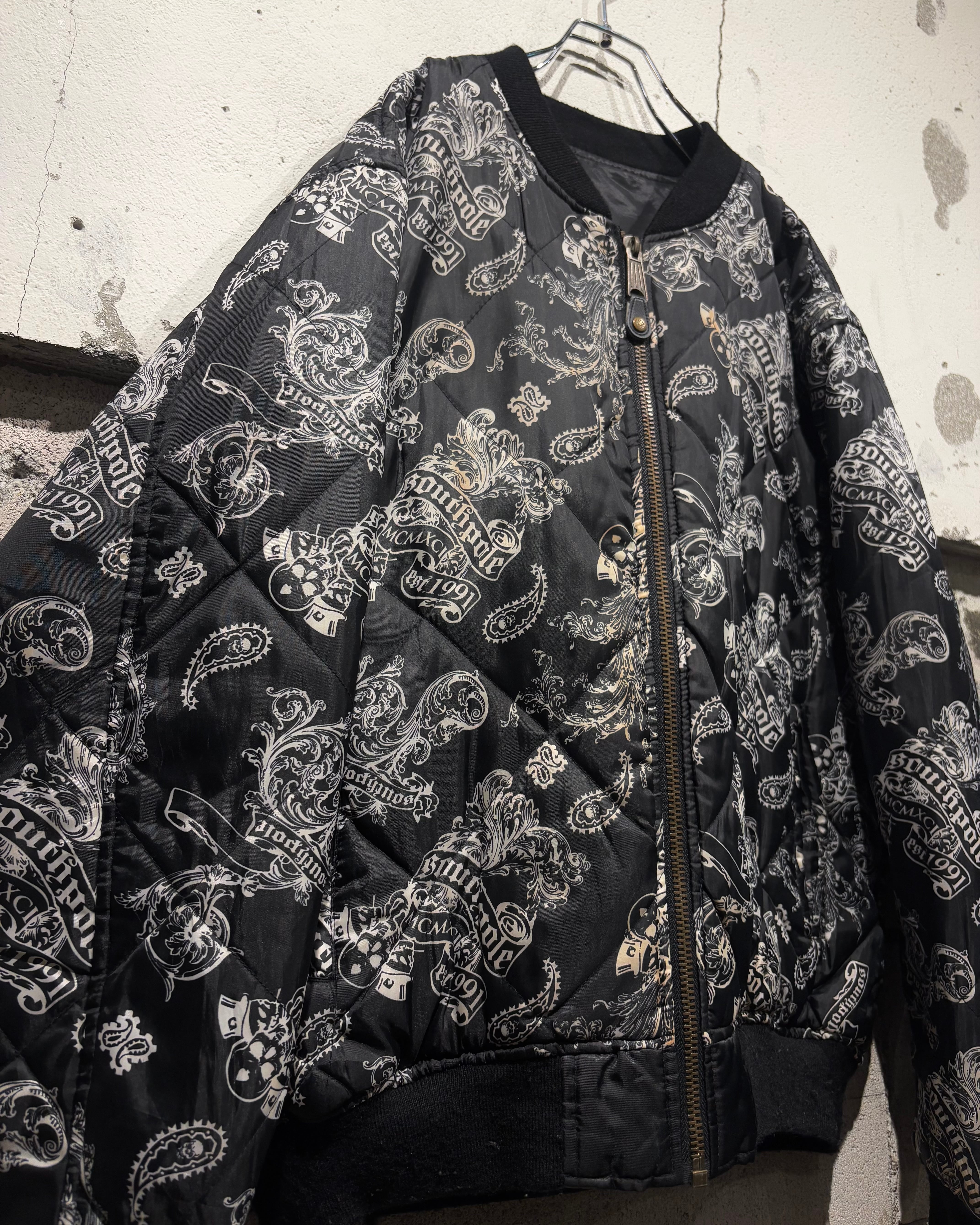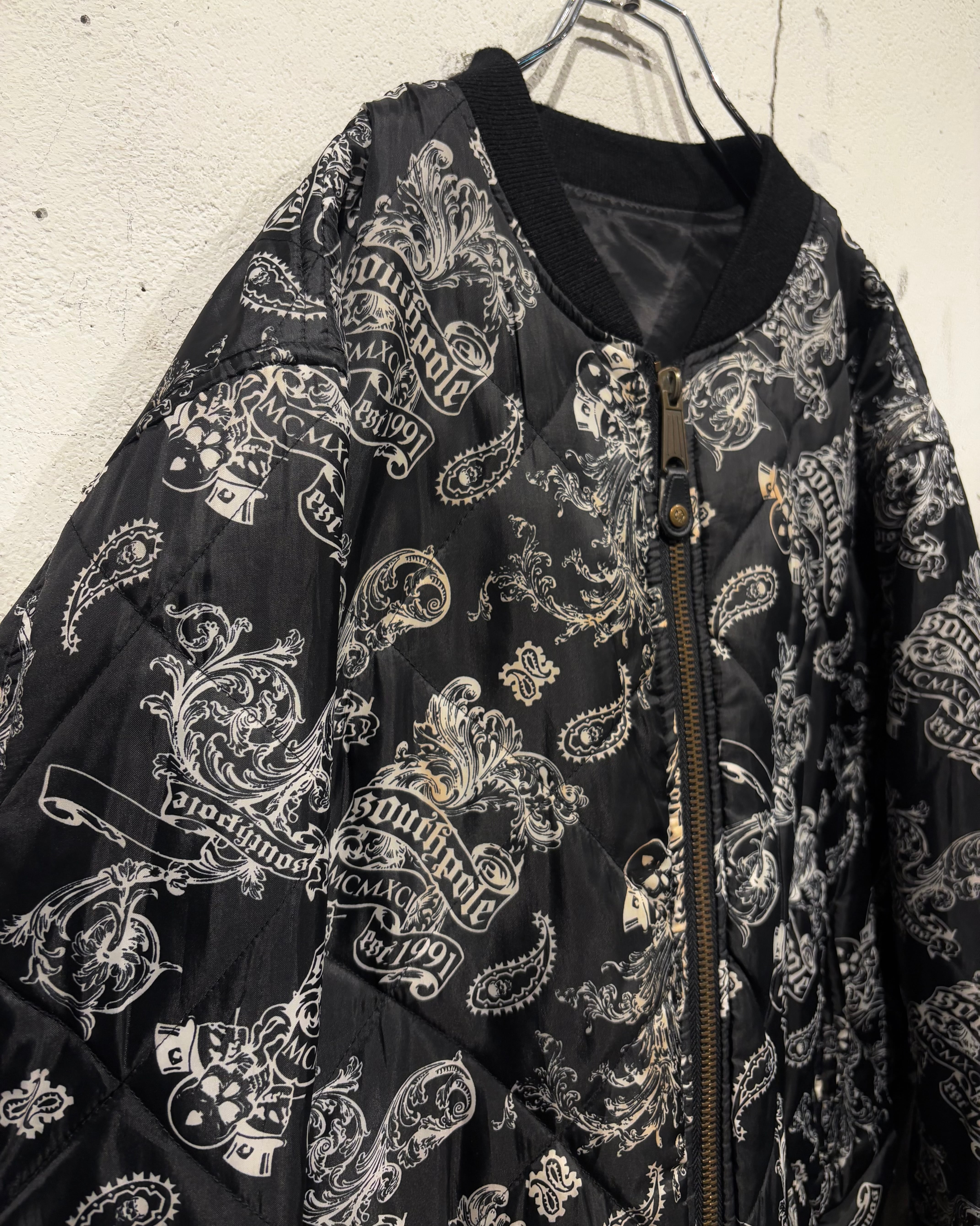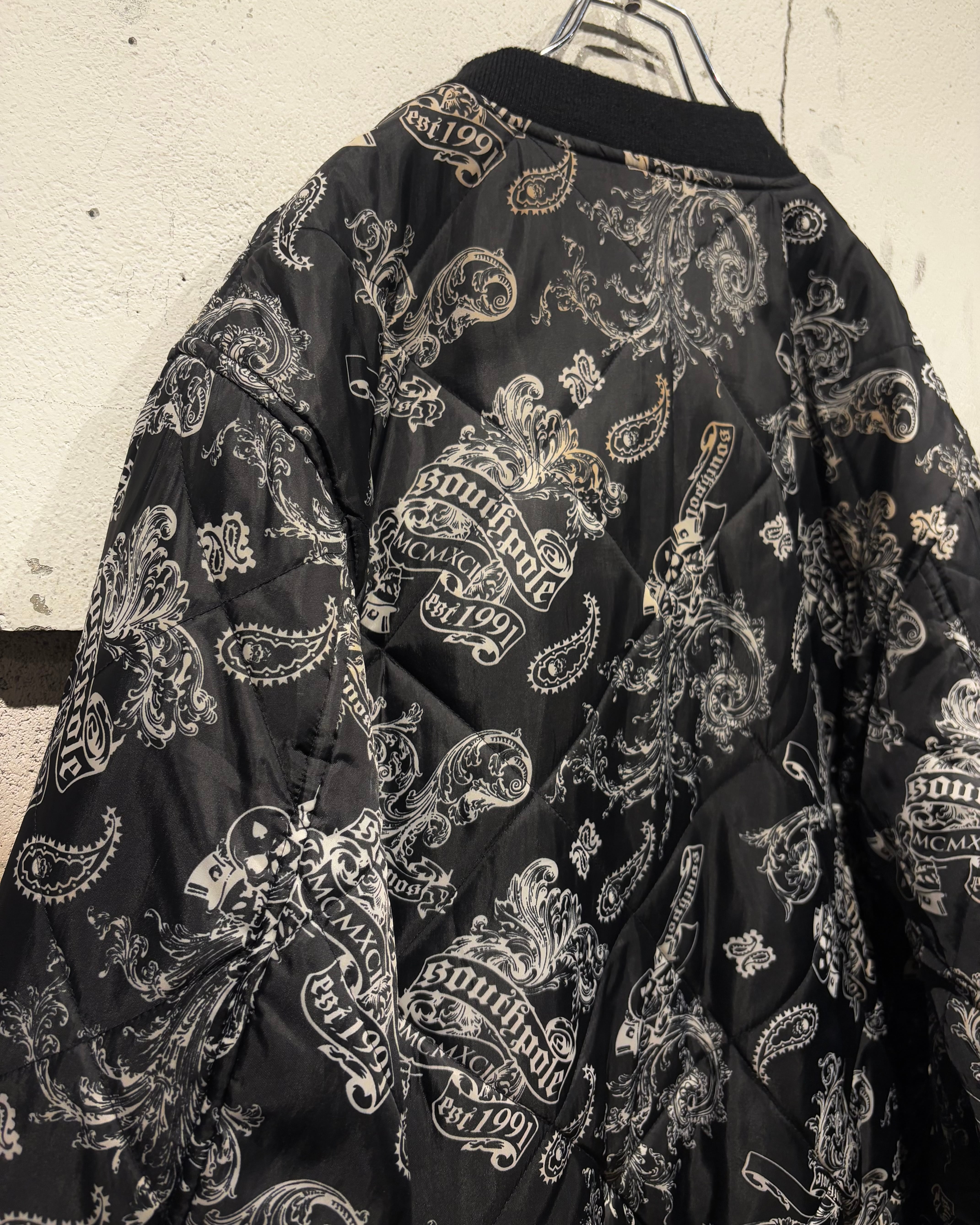 表面にはキルティング加工を施し、ペイズリーとスカルを掛け合わせた総柄デザインを採用。ストリート色の強い主張あるルックスながら、ブラックベースの配色によりまとまりのある印象に仕上がっています。