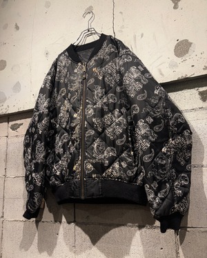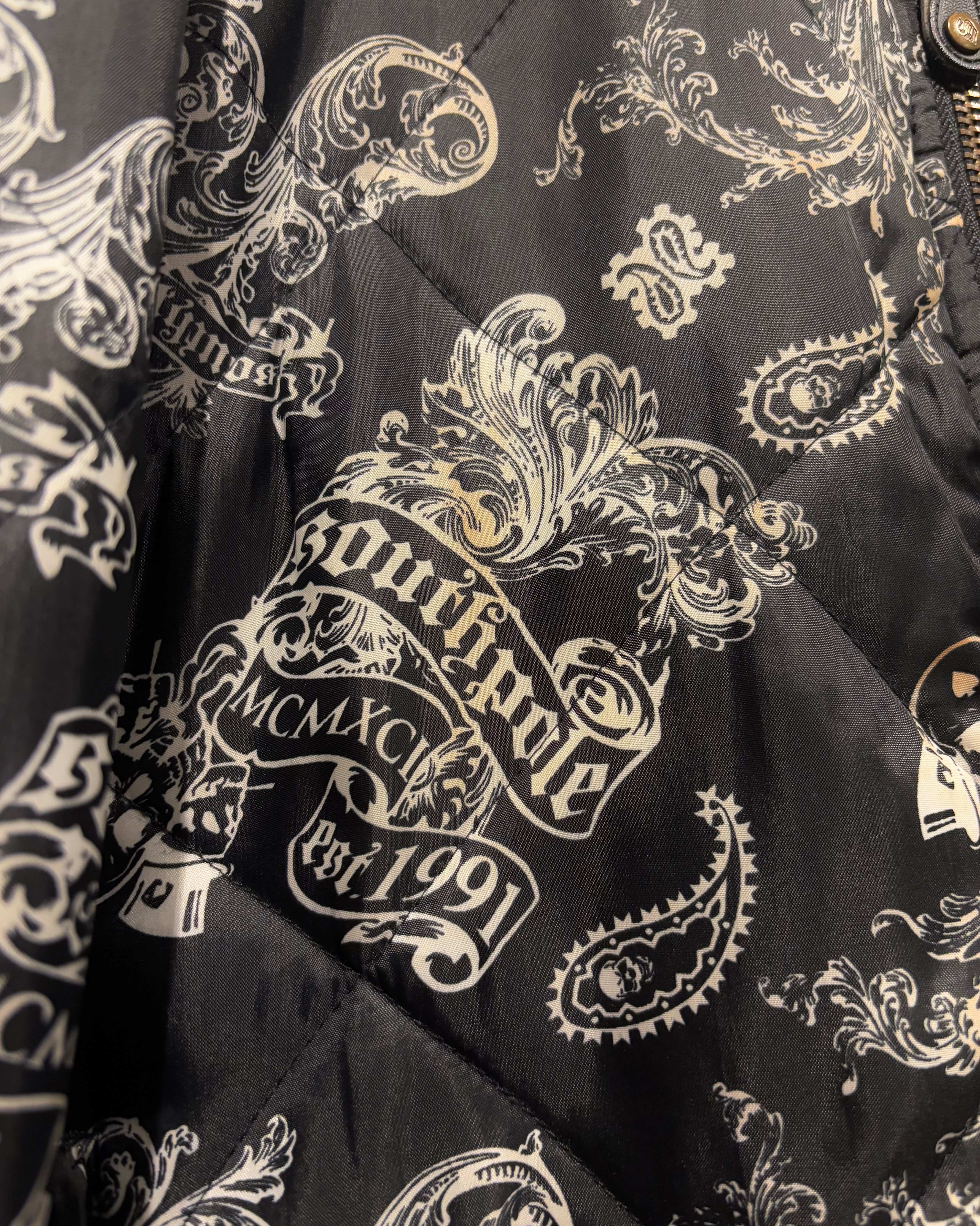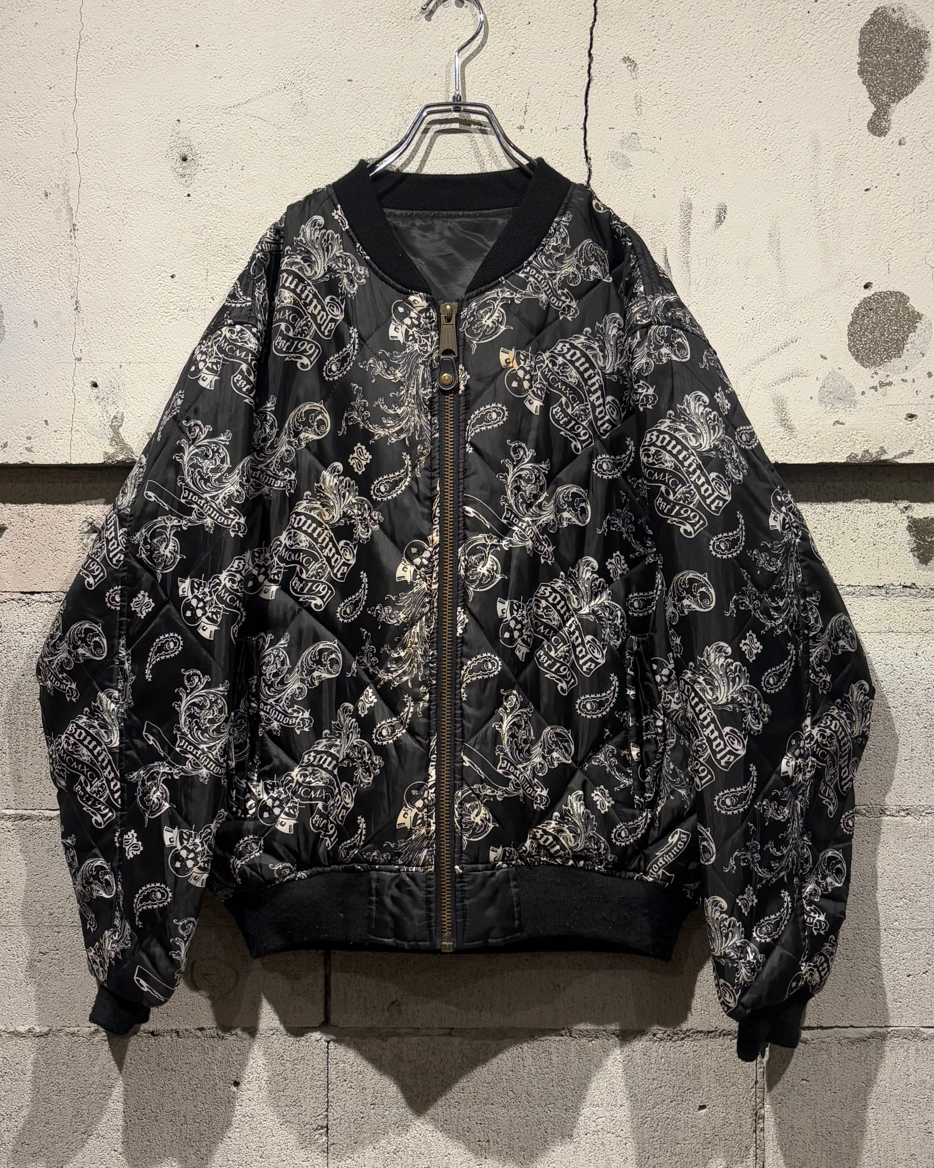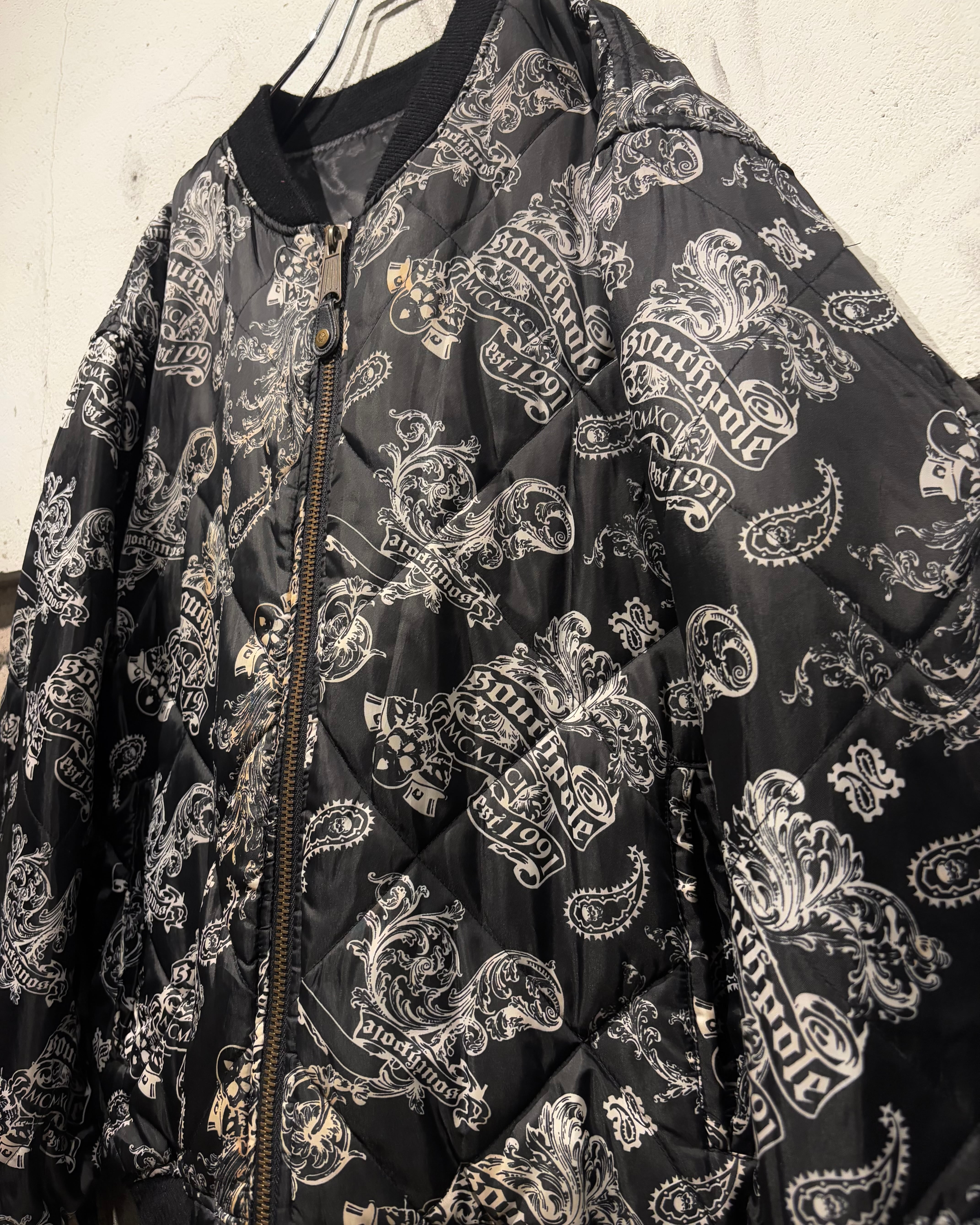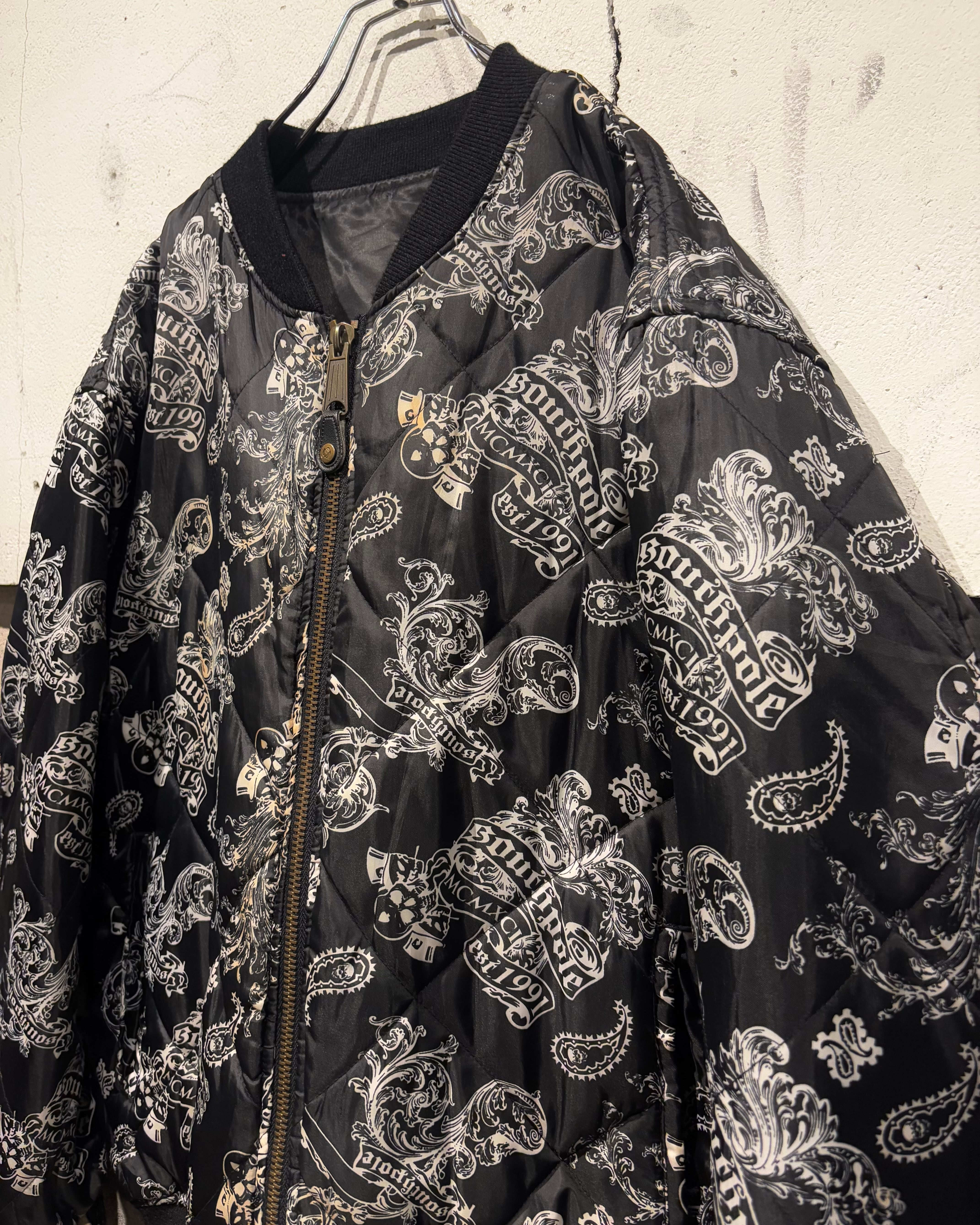 表面にはキルティング加工を施し、ペイズリーとスカルを掛け合わせた総柄デザインを採用。ストリート色の強い主張あるルックスながら、ブラックベースの配色によりまとまりのある印象に仕上がっています。