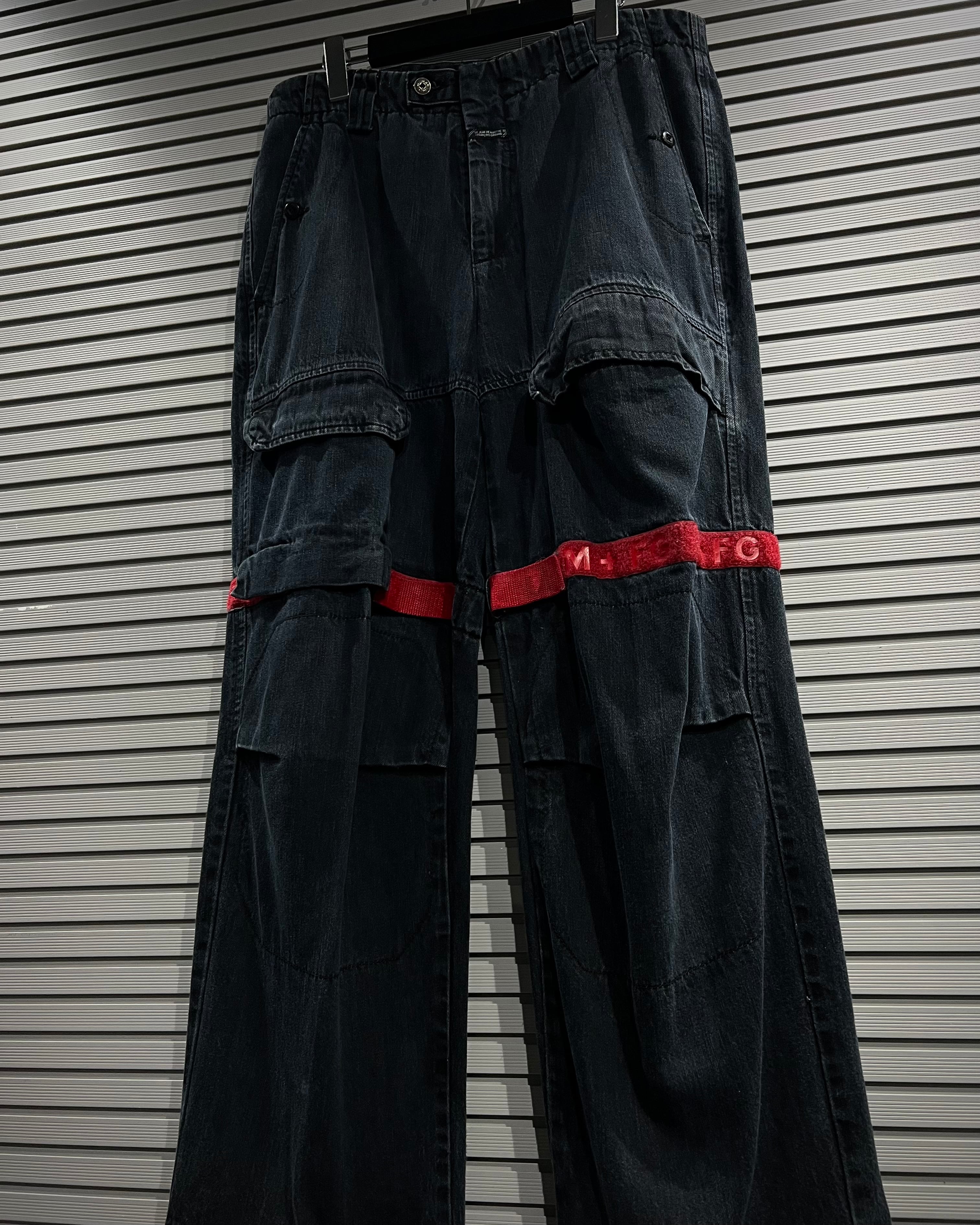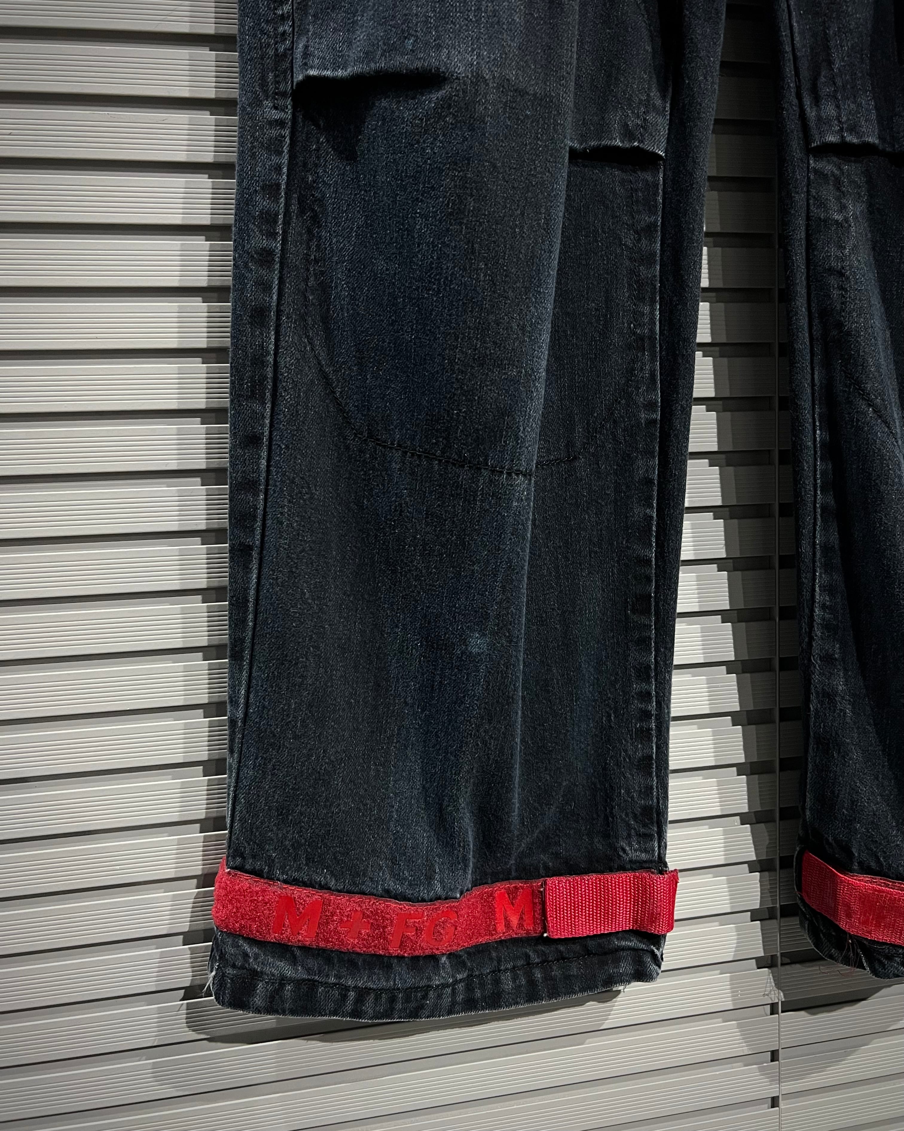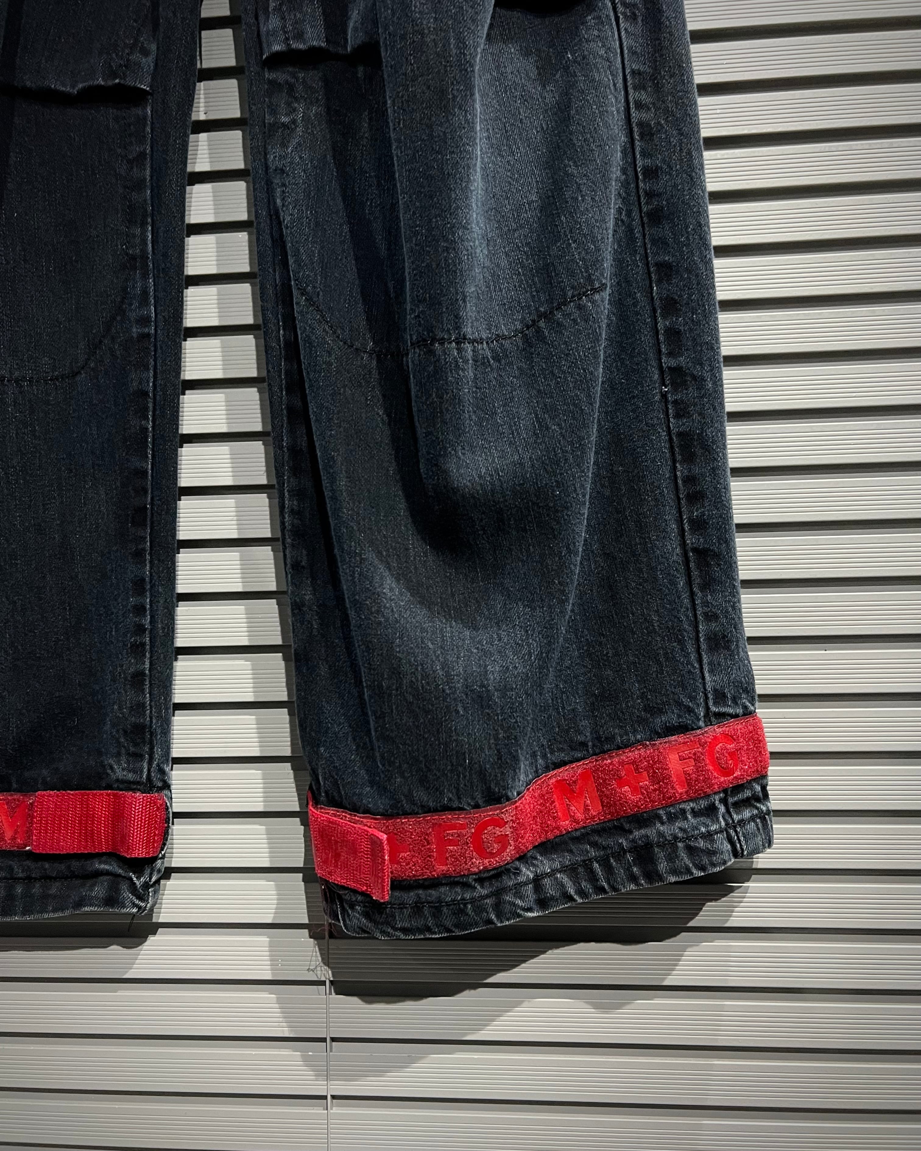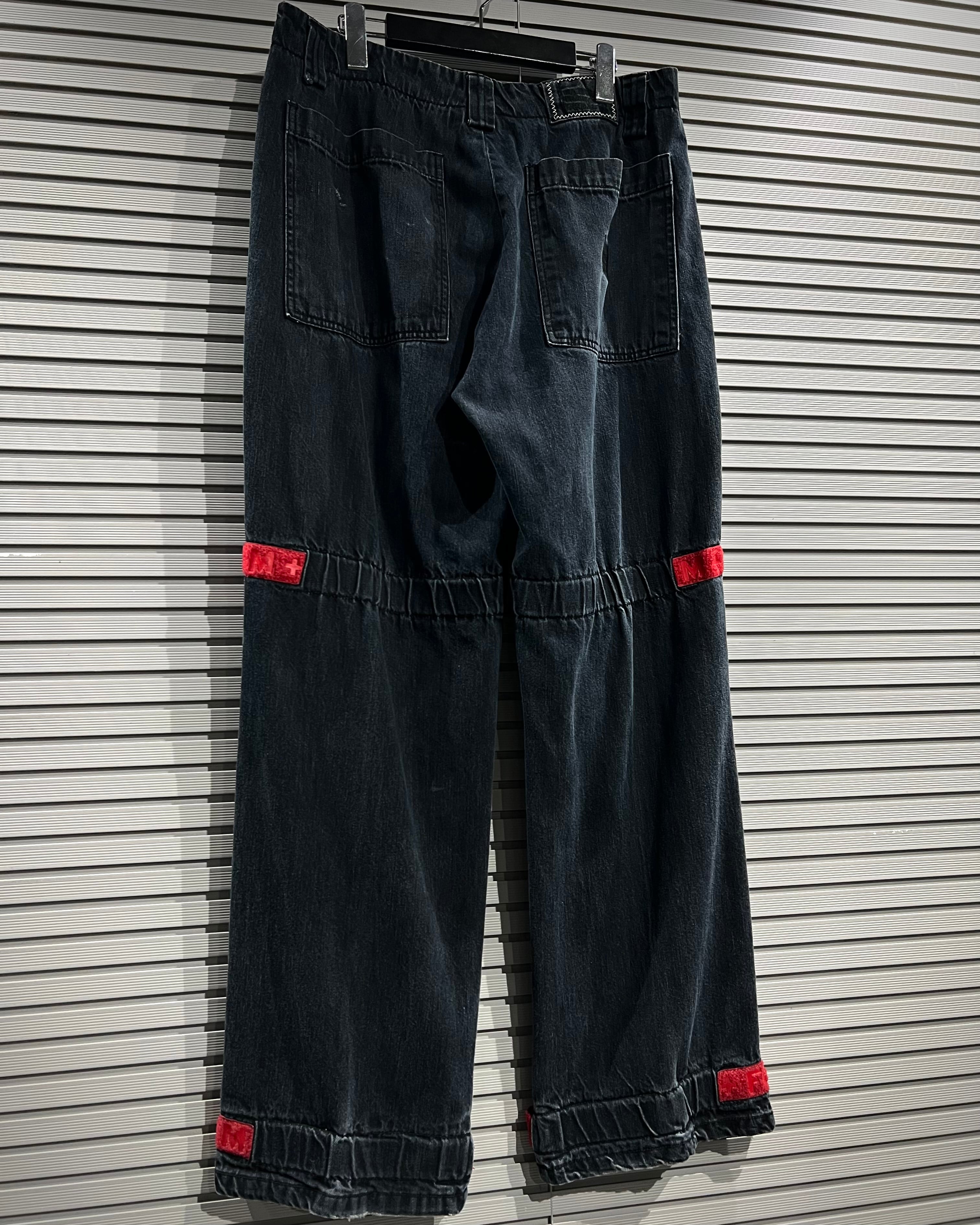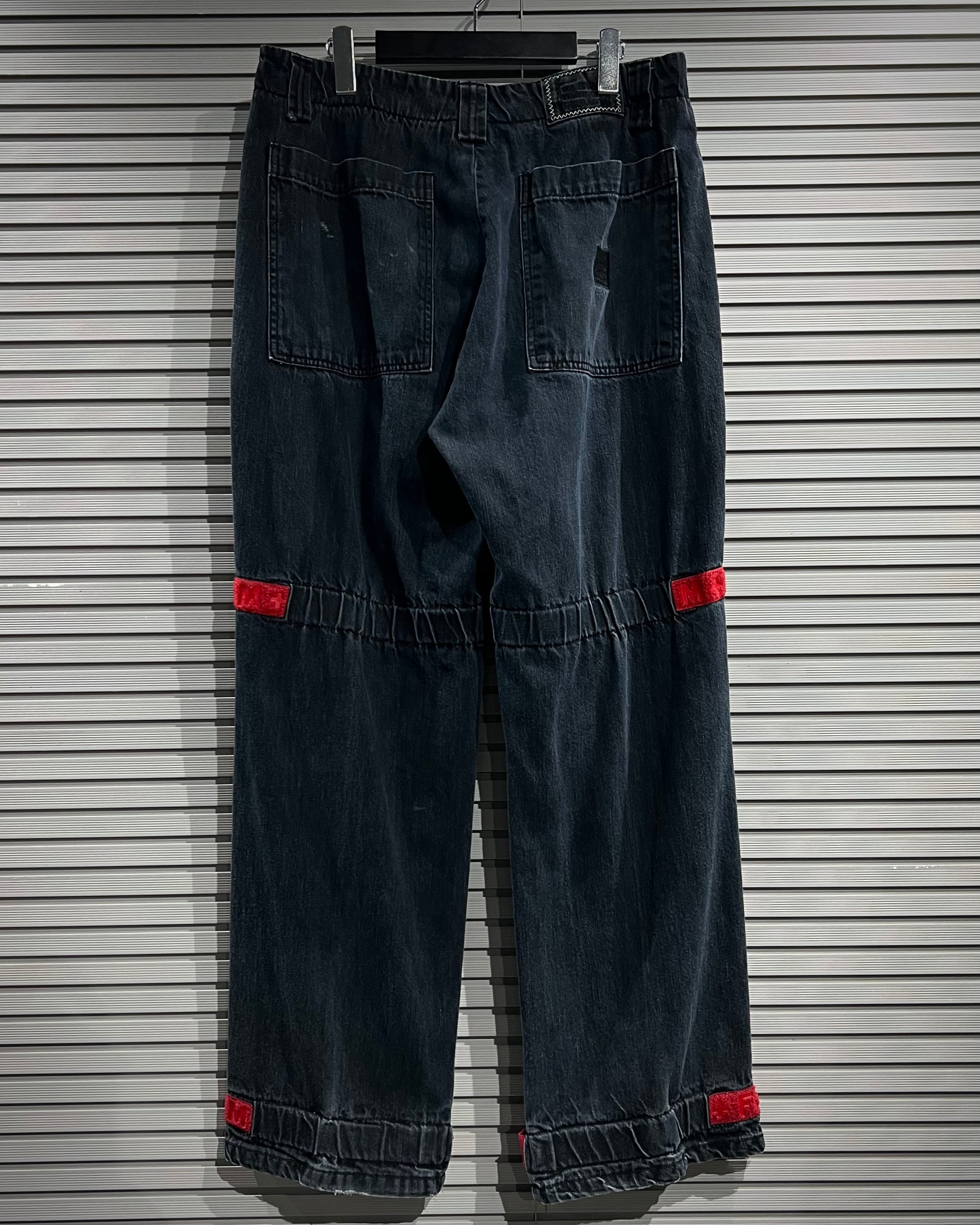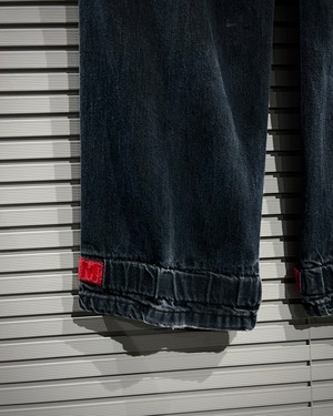 シャトルパンツの中でも希少な濃紺ボディに、赤のベルクロを配した存在感のある1着です。ベルクロ部分には同色でブランドロゴを施し、さりげなくアイデンティティを主張。