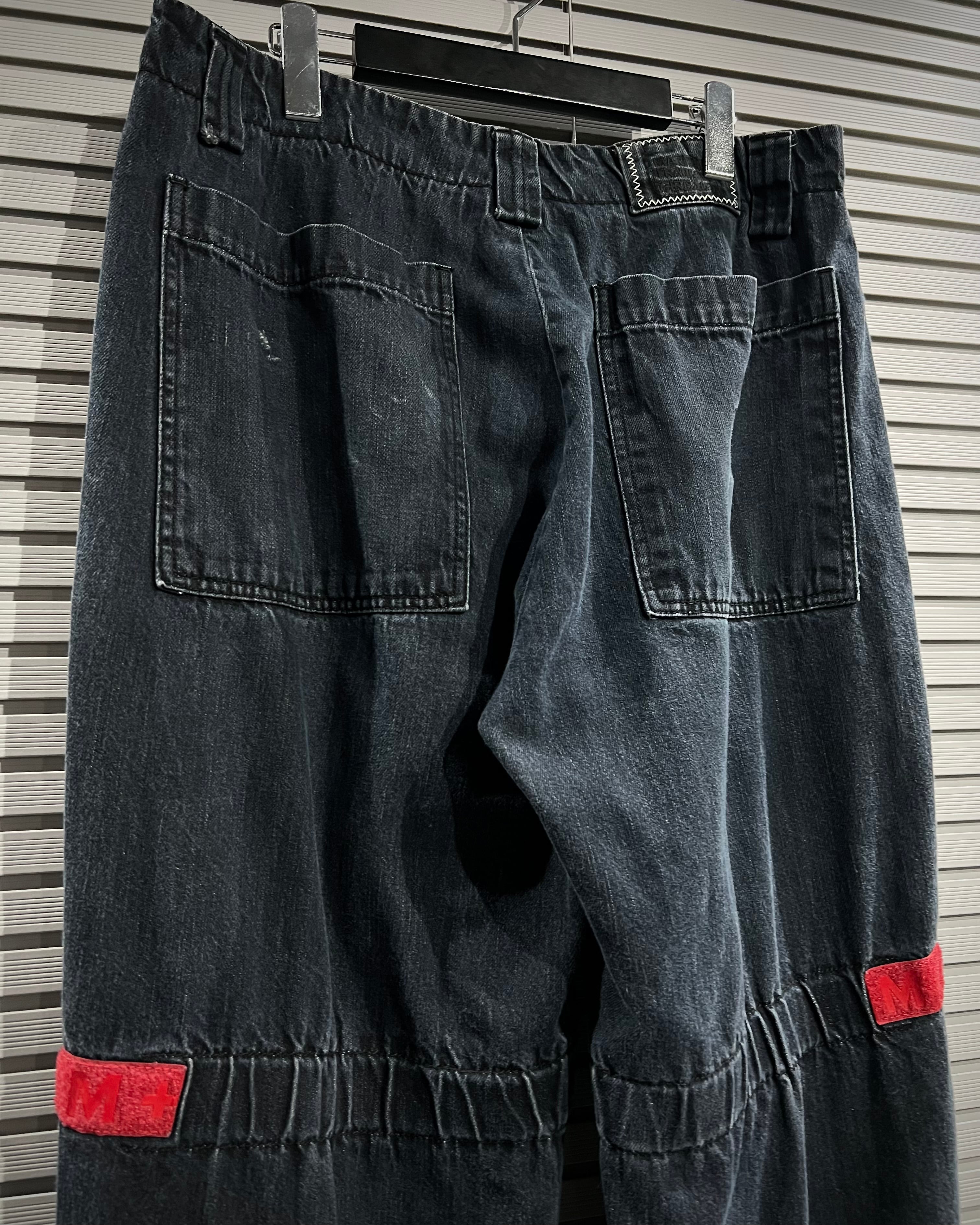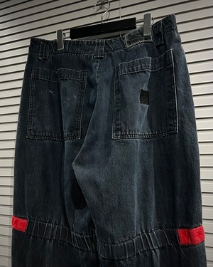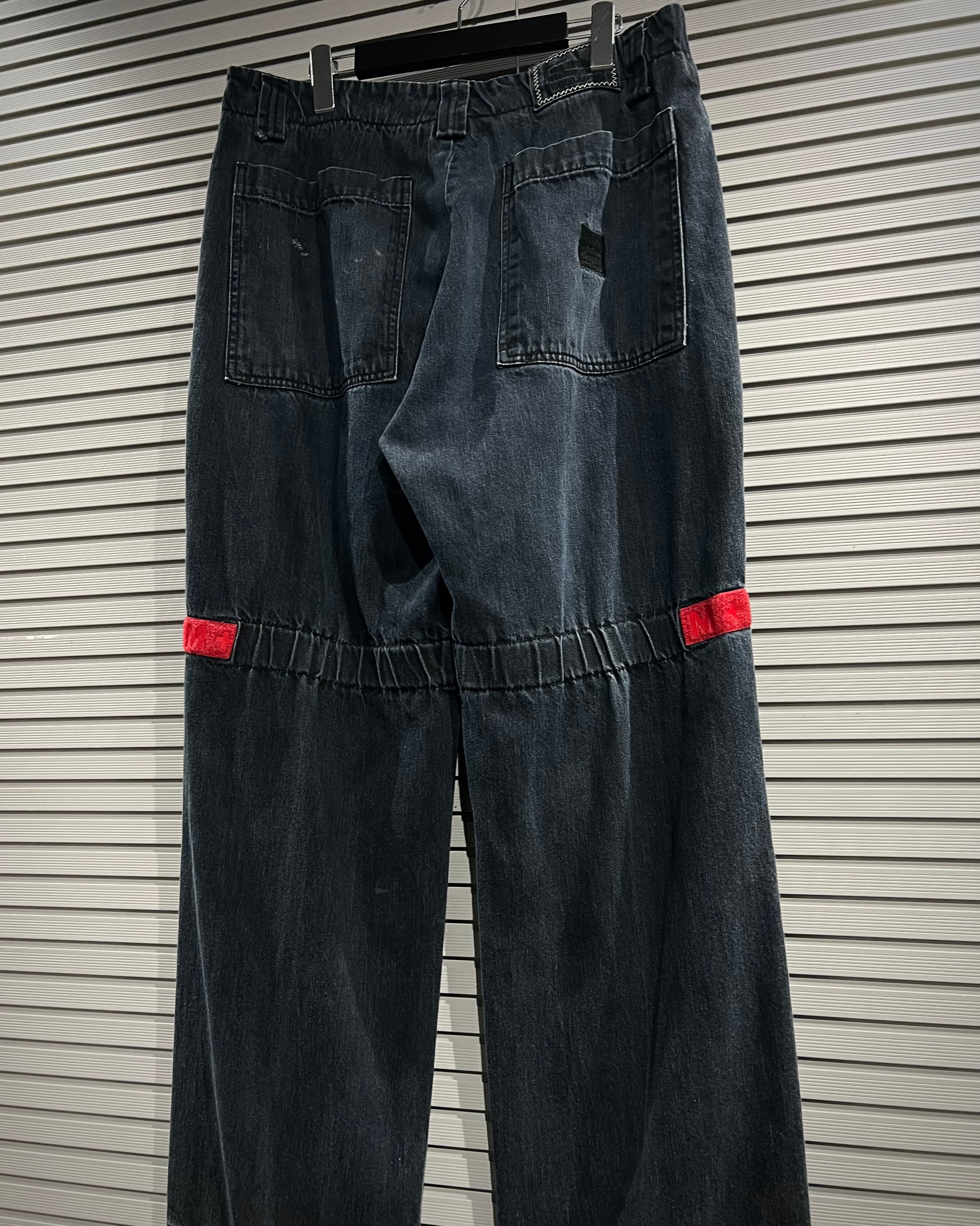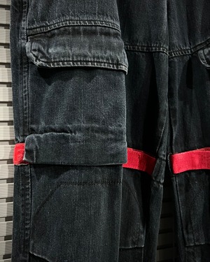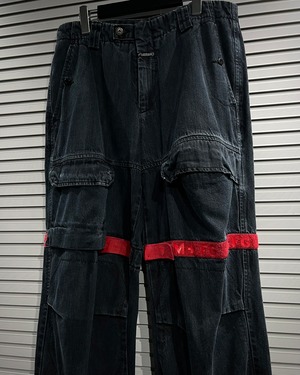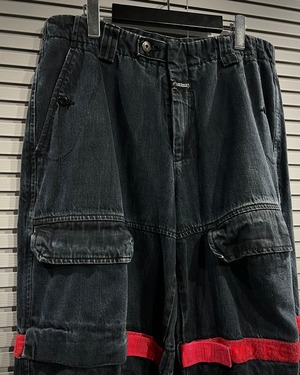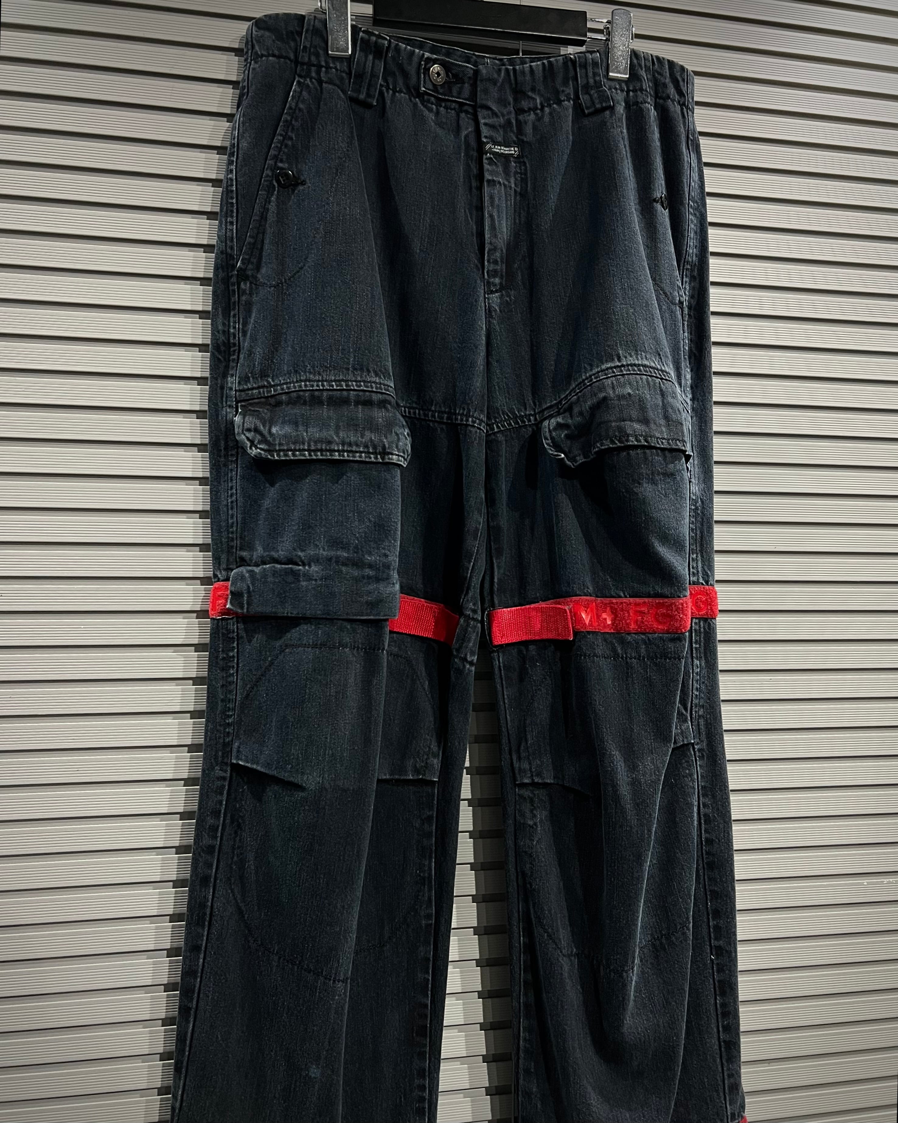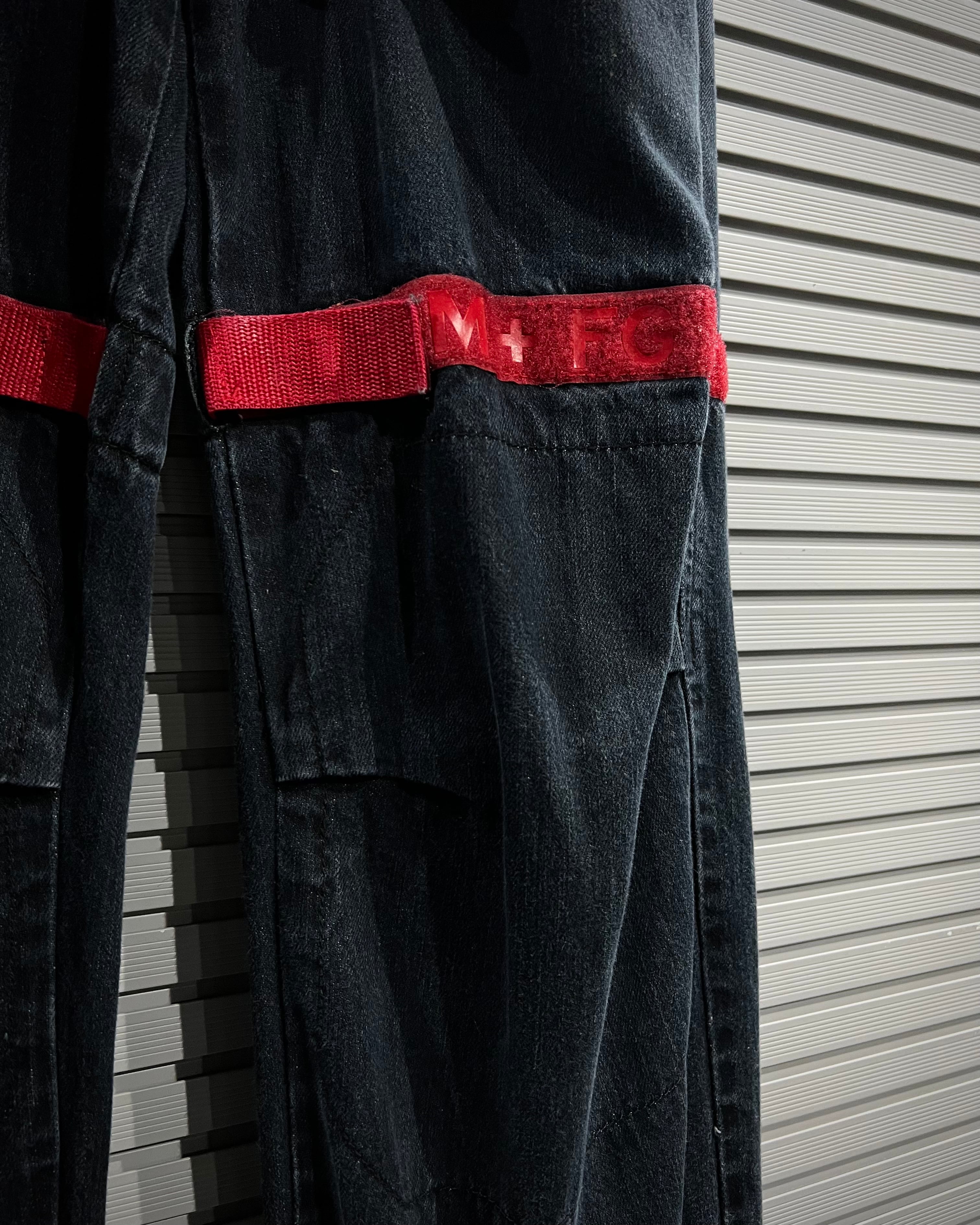 シャトルパンツの中でも希少な濃紺ボディに、赤のベルクロを配した存在感のある1着です。ベルクロ部分には同色でブランドロゴを施し、さりげなくアイデンティティを主張。