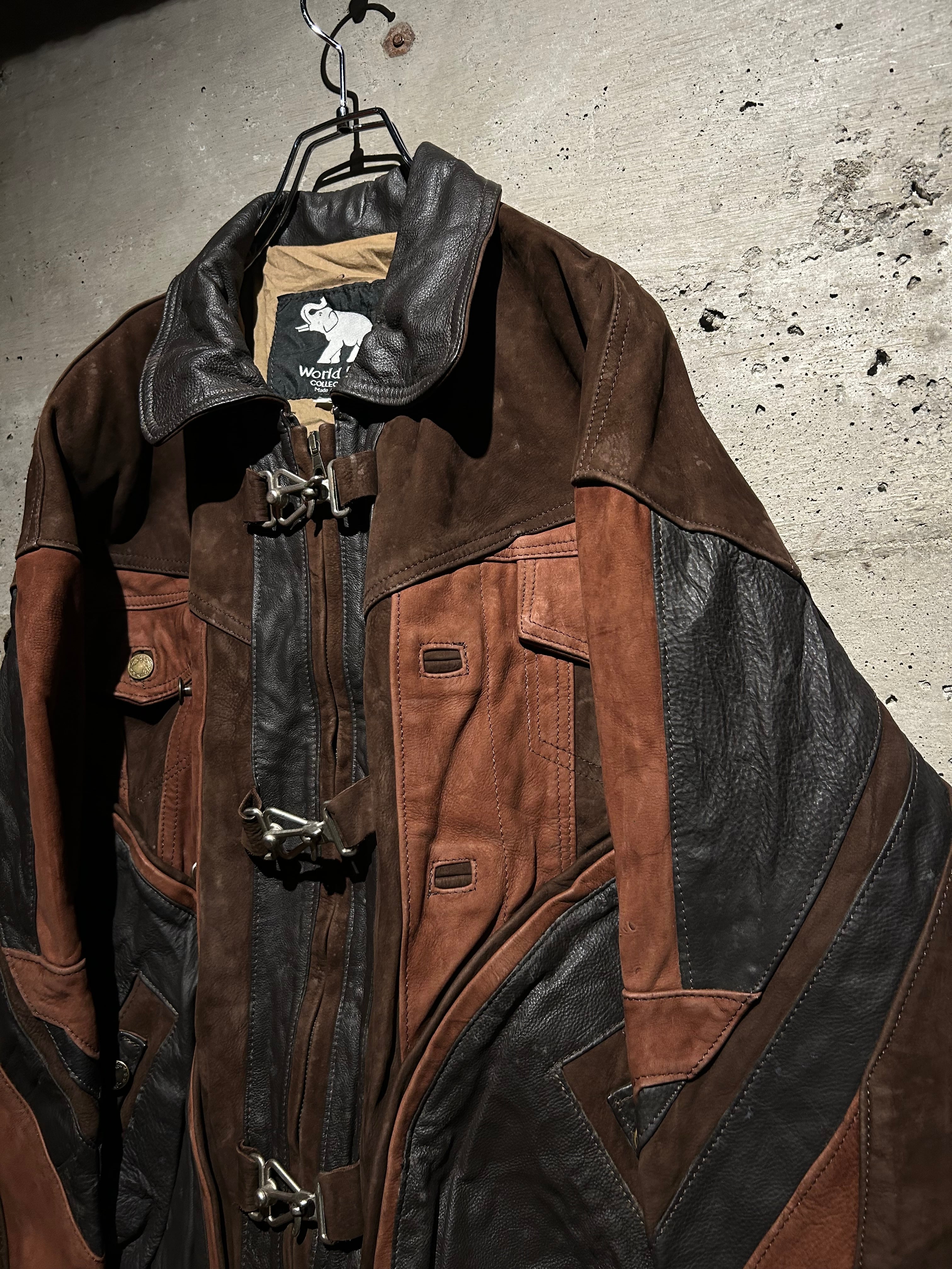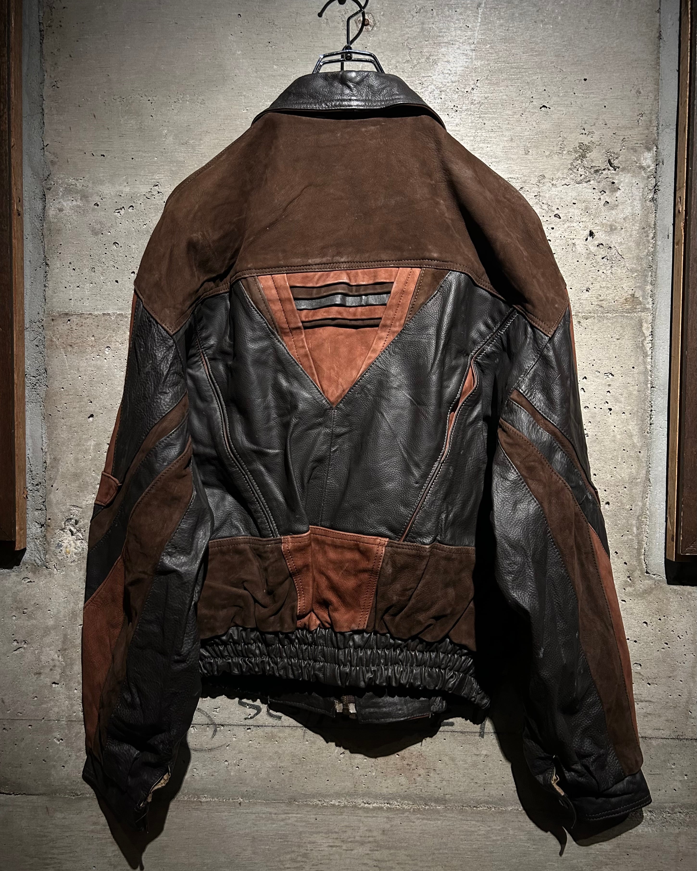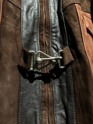 鈍い光沢を放つスムースレザーと起毛感のあるスエードレザーを大胆にパネルで切り替えた1着。この時期特有のトゥーマッチながら、デザインバランスが整い切った素晴らしい個体です。
