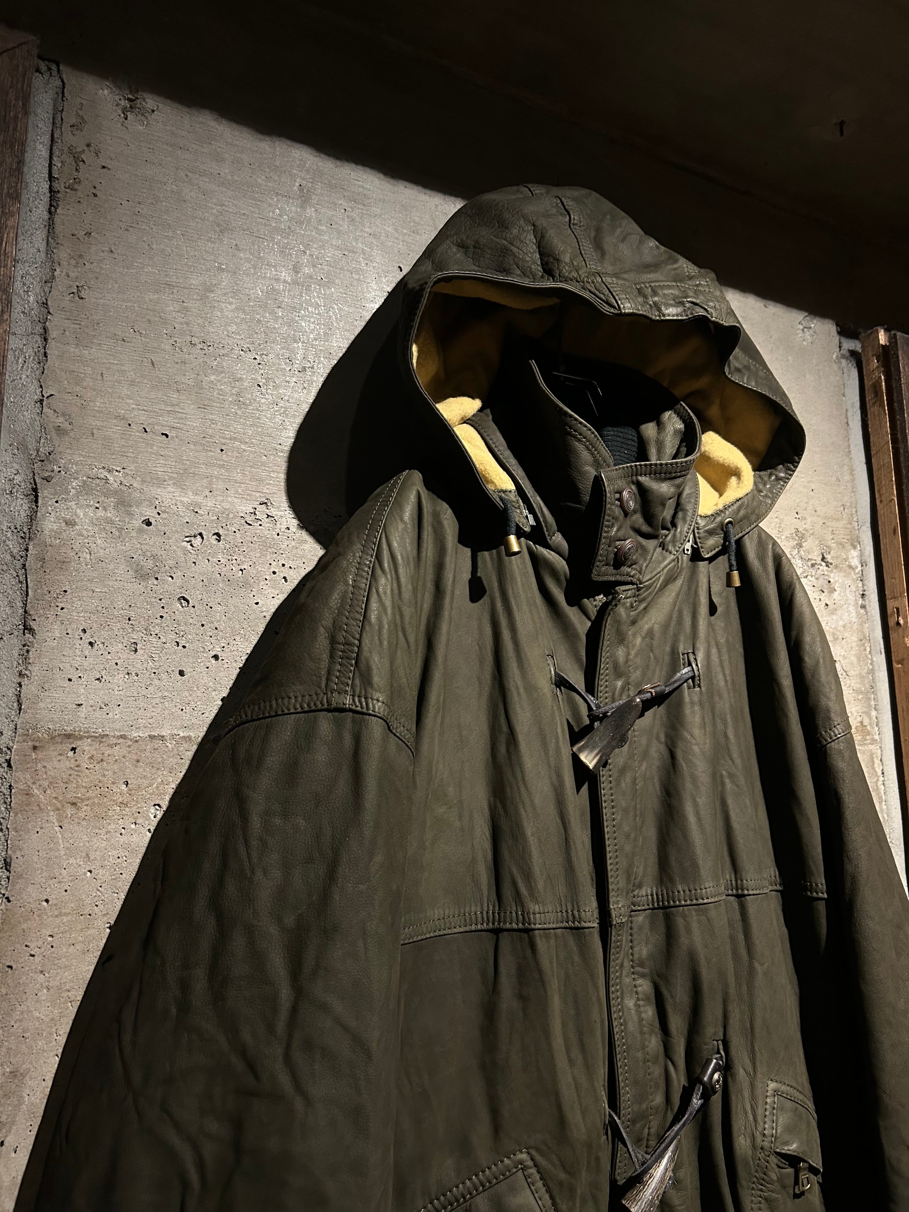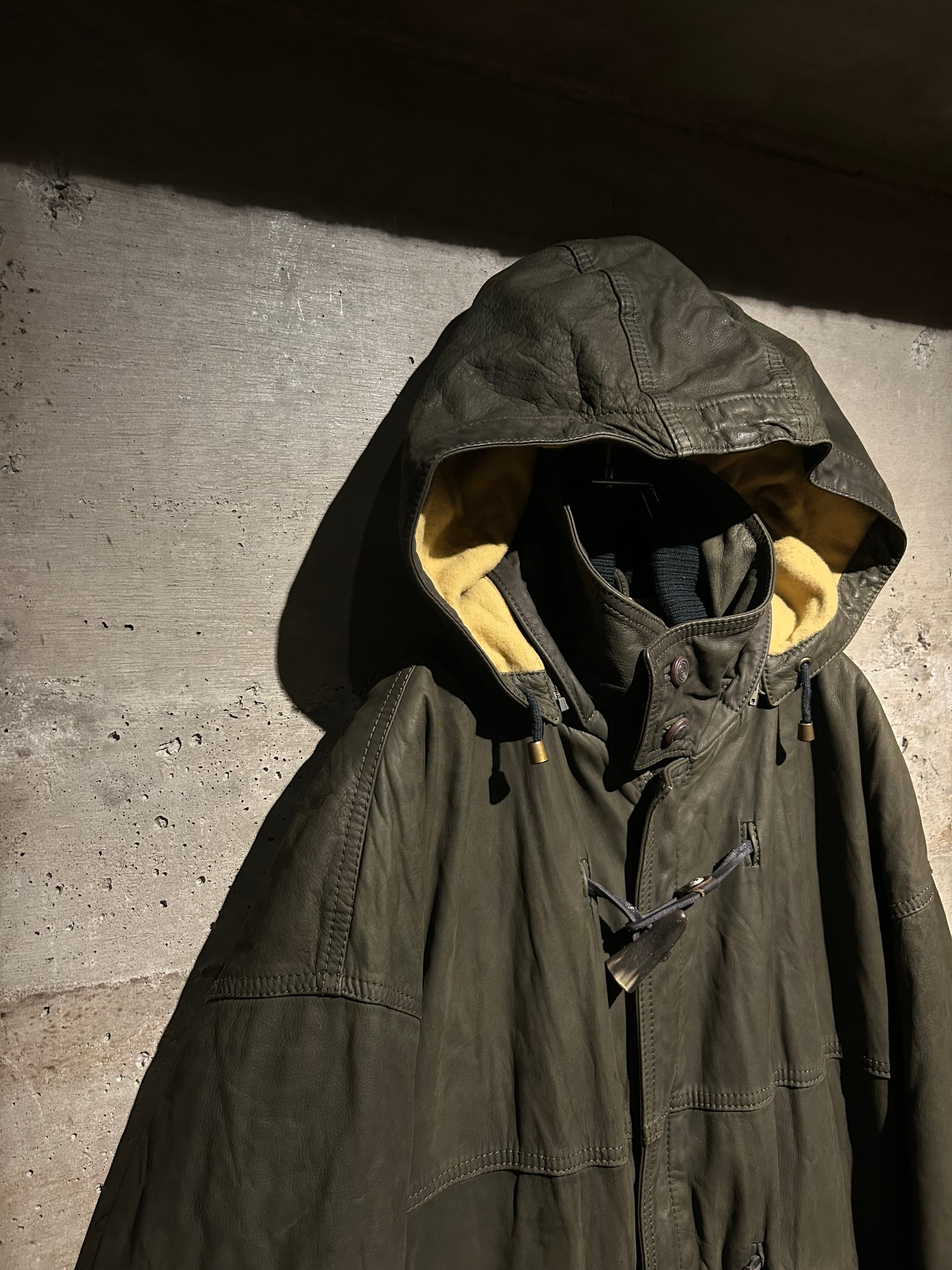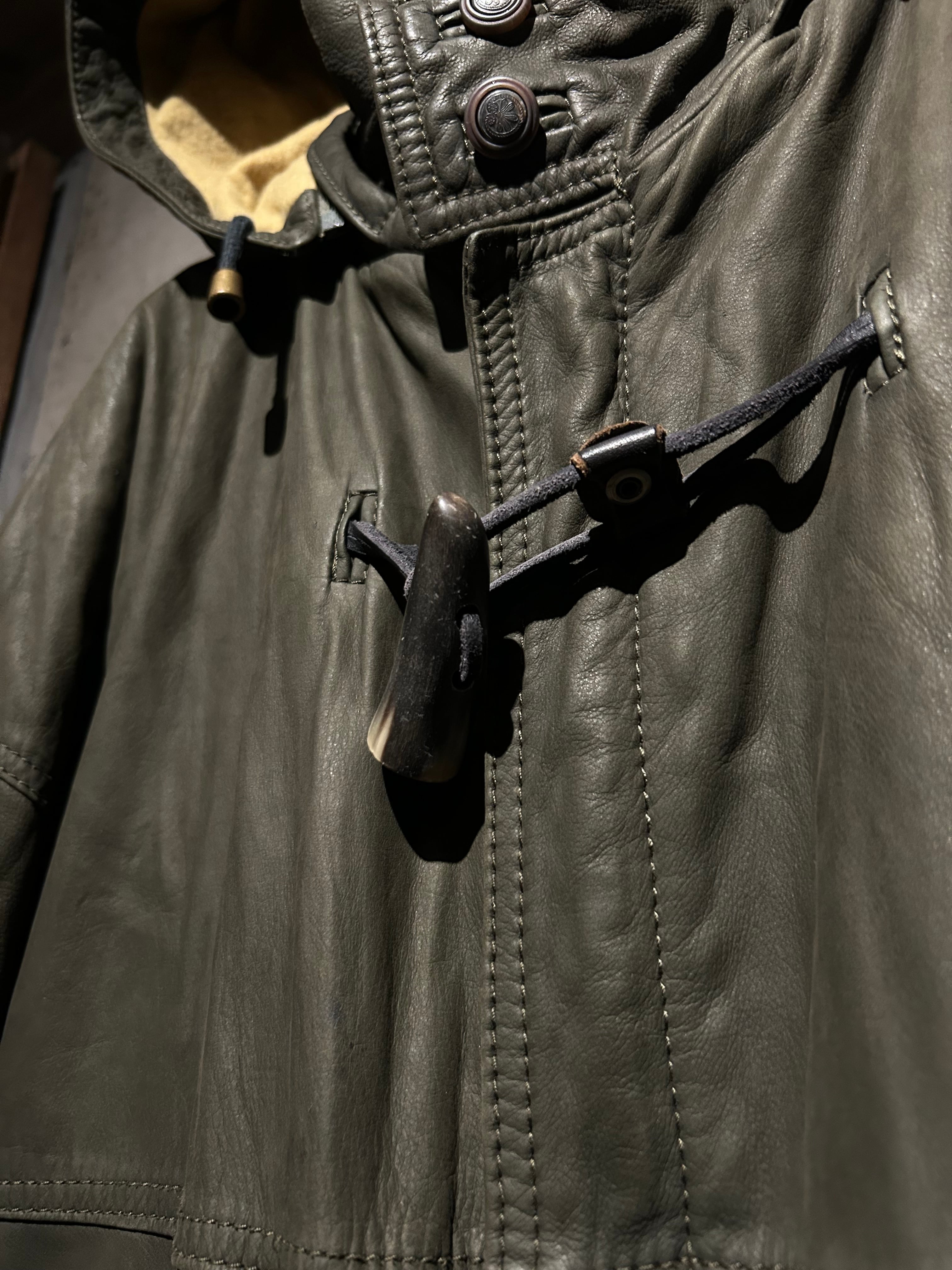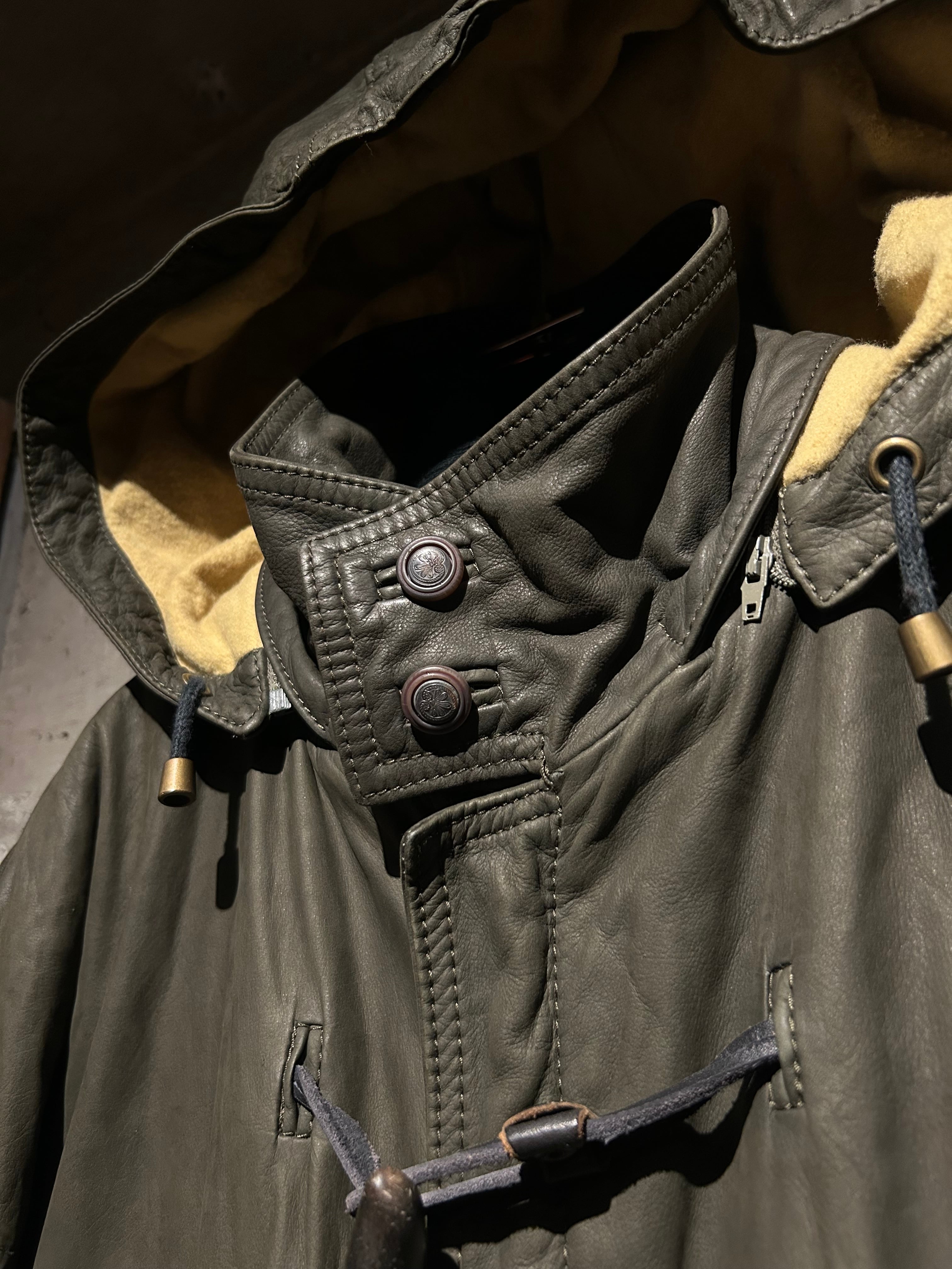 ヴァルサーチやジルボーとのコラボレーション、レザーのファブリックを提供していた80's〜90'sの“Ruffo” より、重厚感のあるレザーを贅沢に用い、ダッフルコートの意匠へと落とし込んだスペシャルな1着。
