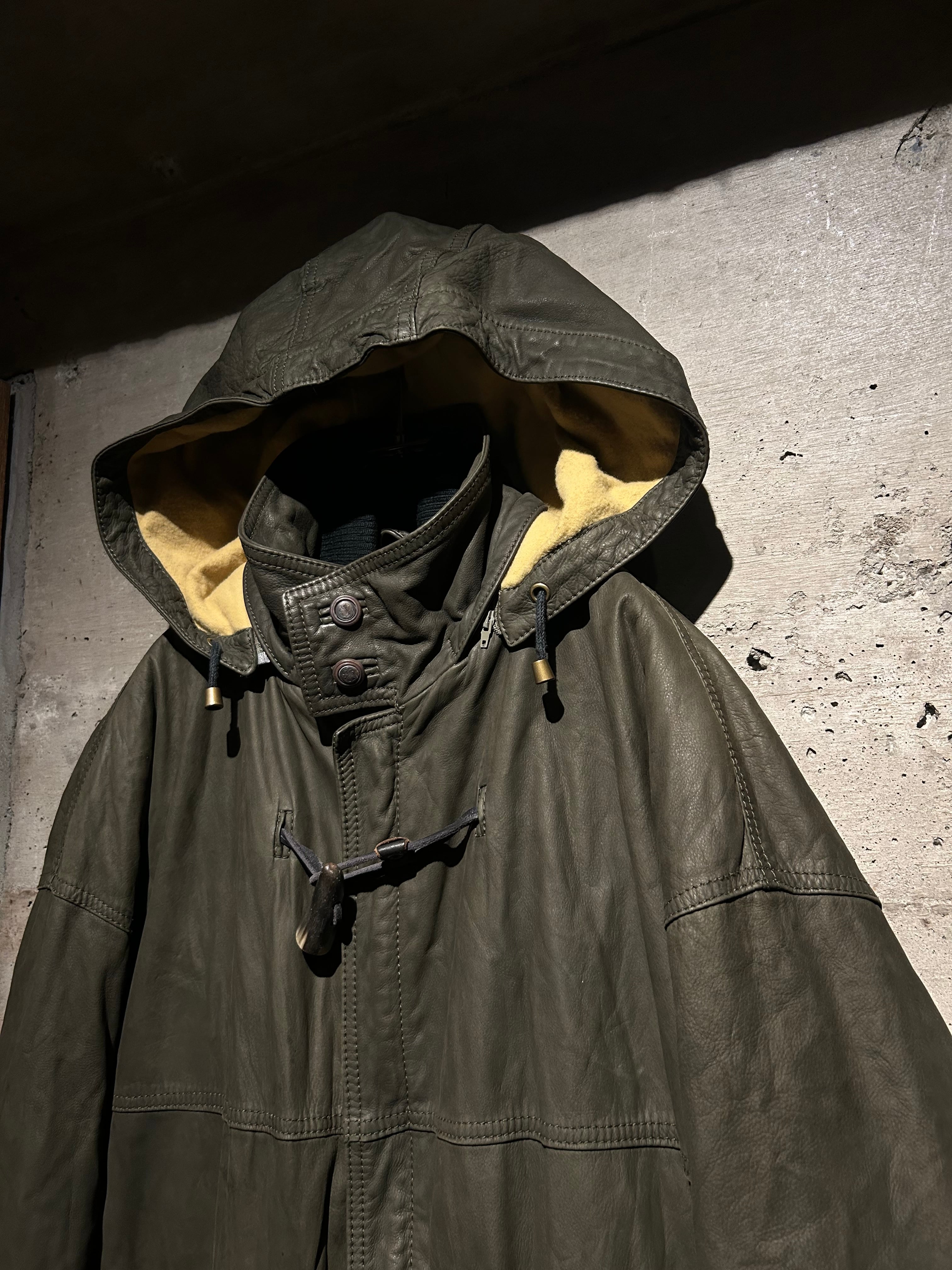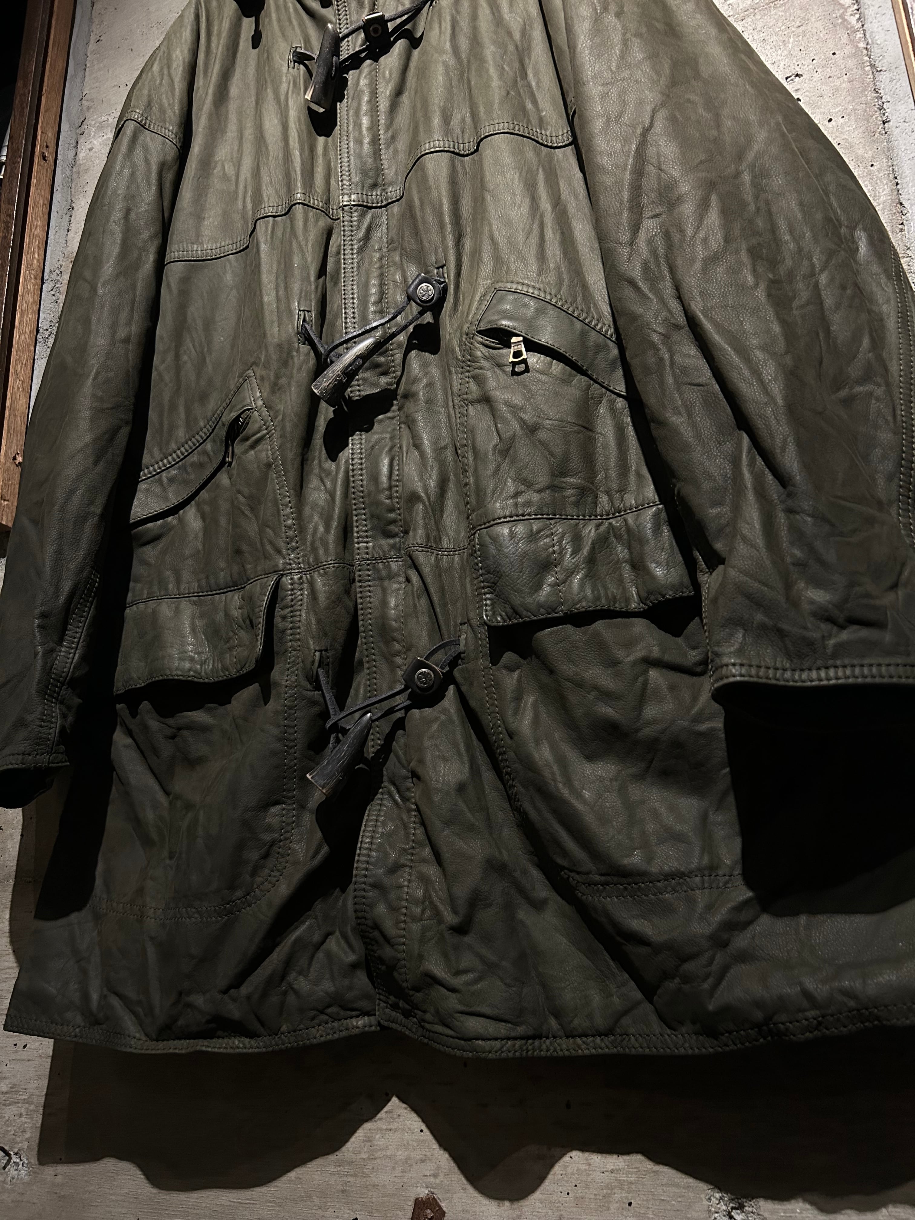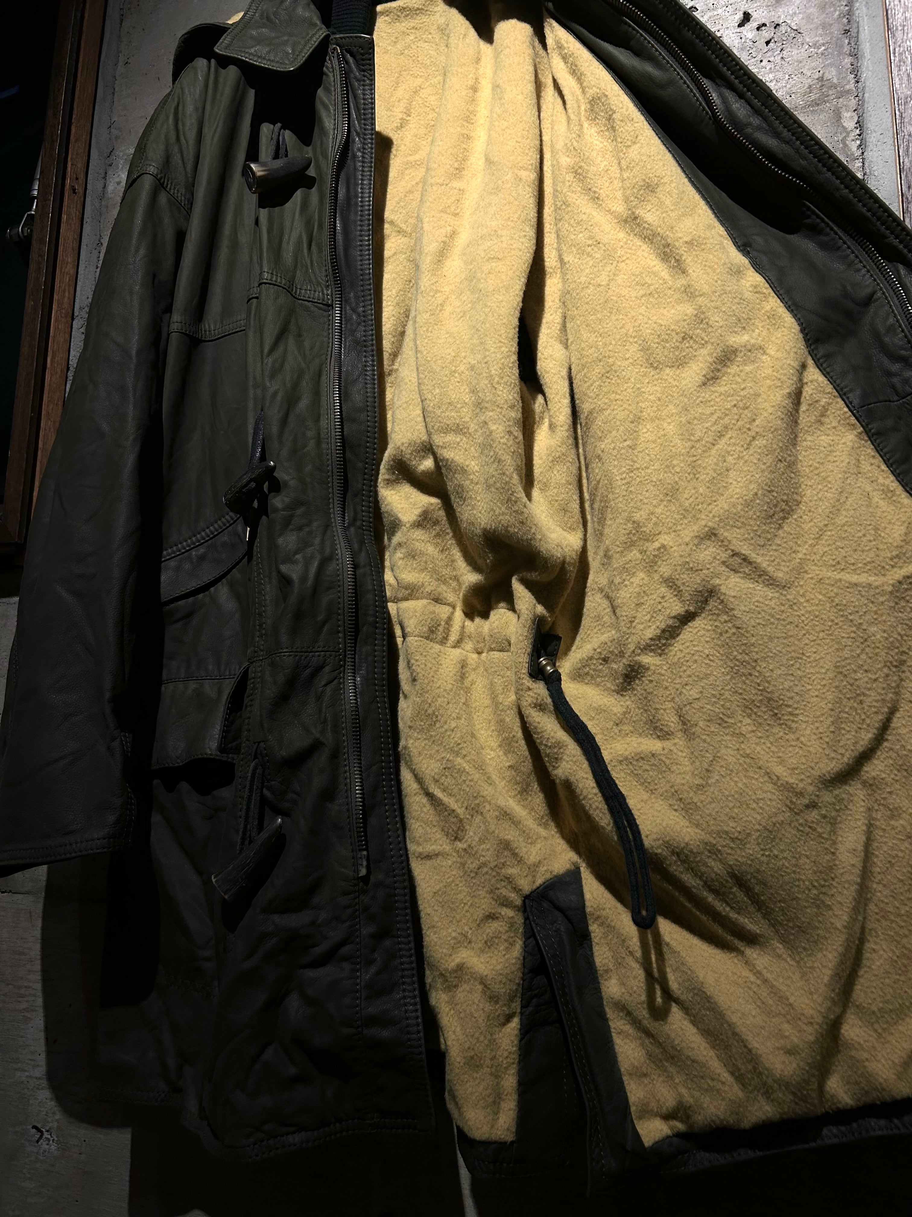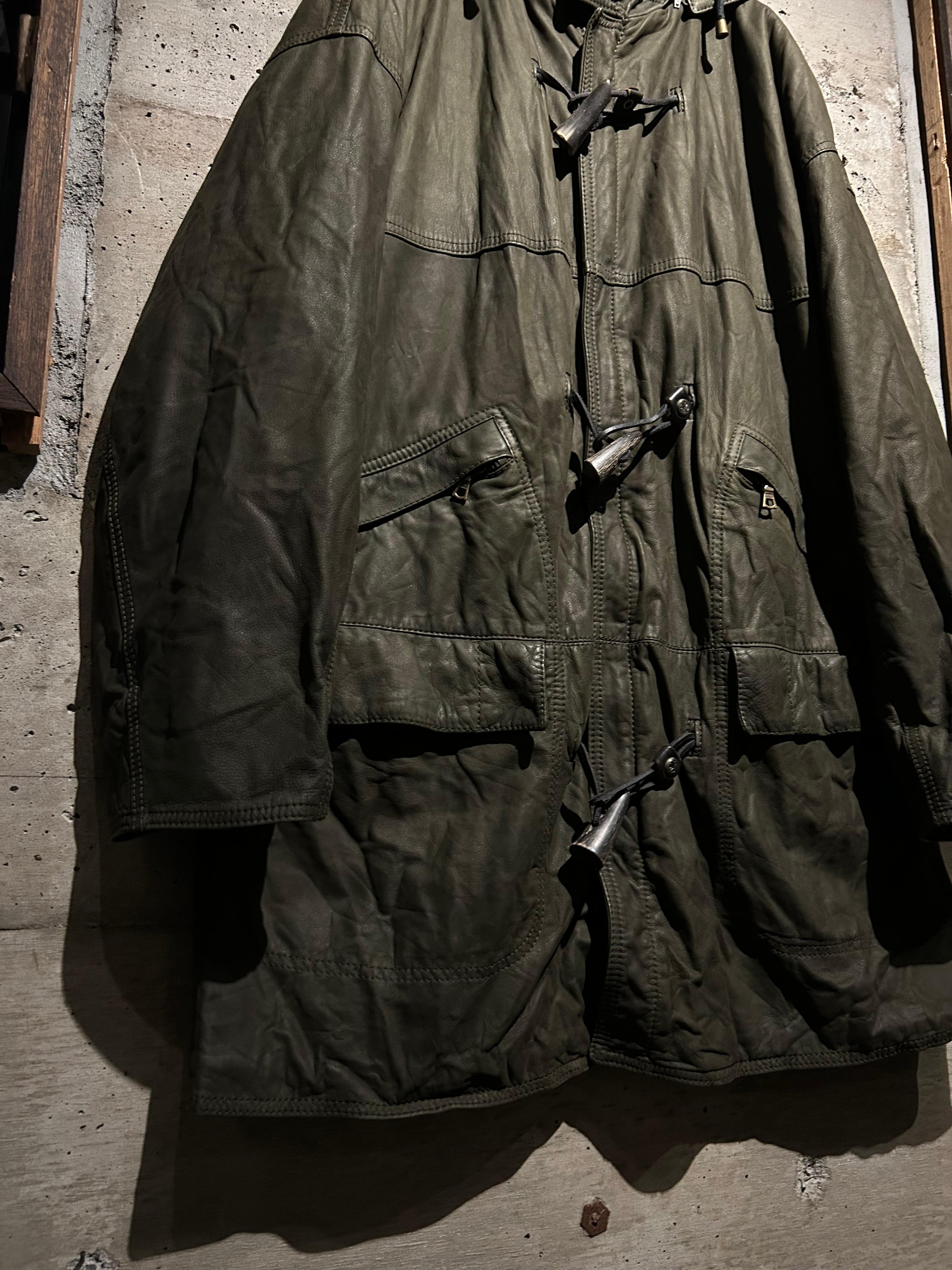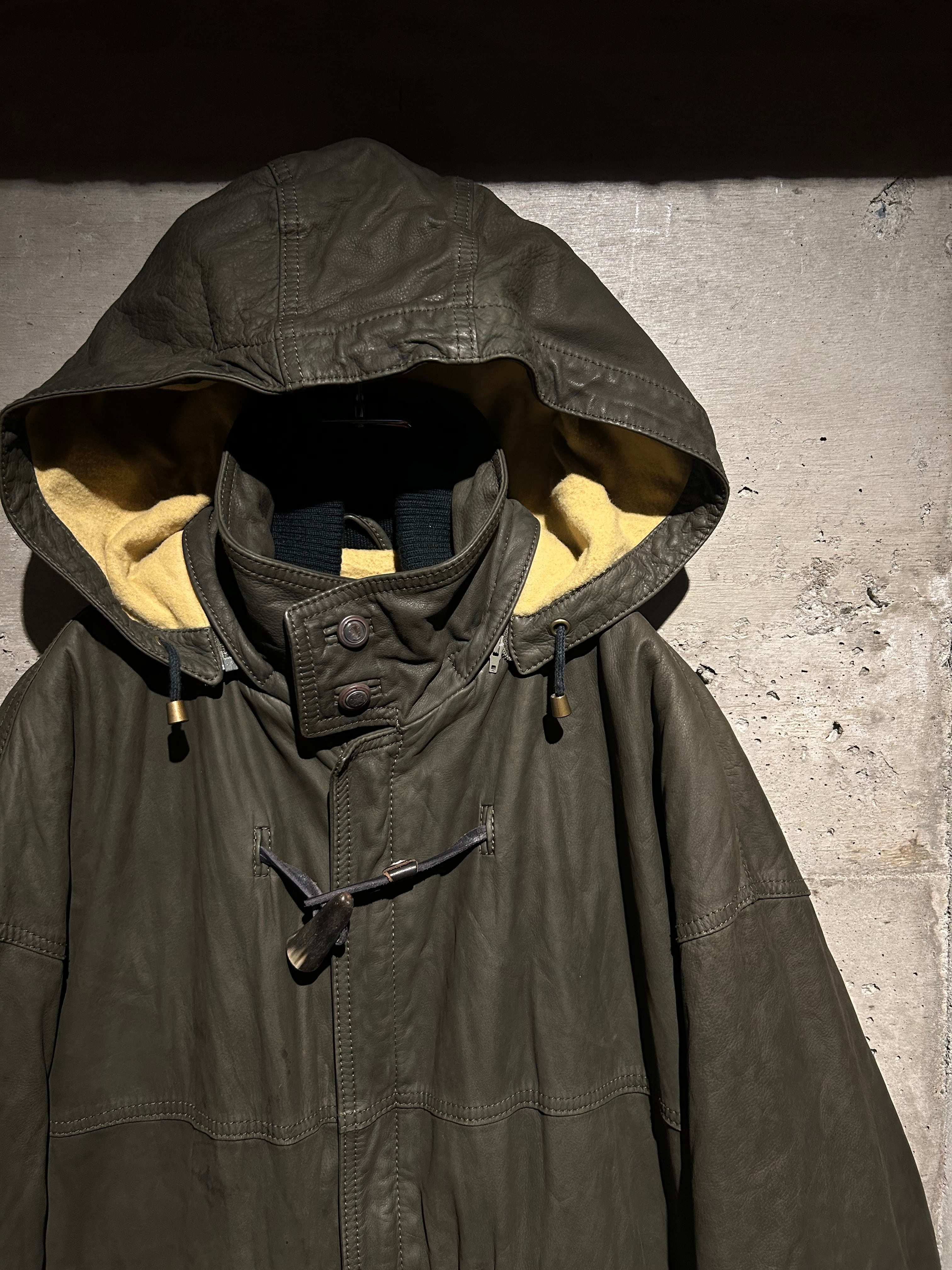 ヴァルサーチやジルボーとのコラボレーション、レザーのファブリックを提供していた80's〜90'sの“Ruffo” より、重厚感のあるレザーを贅沢に用い、ダッフルコートの意匠へと落とし込んだスペシャルな1着。