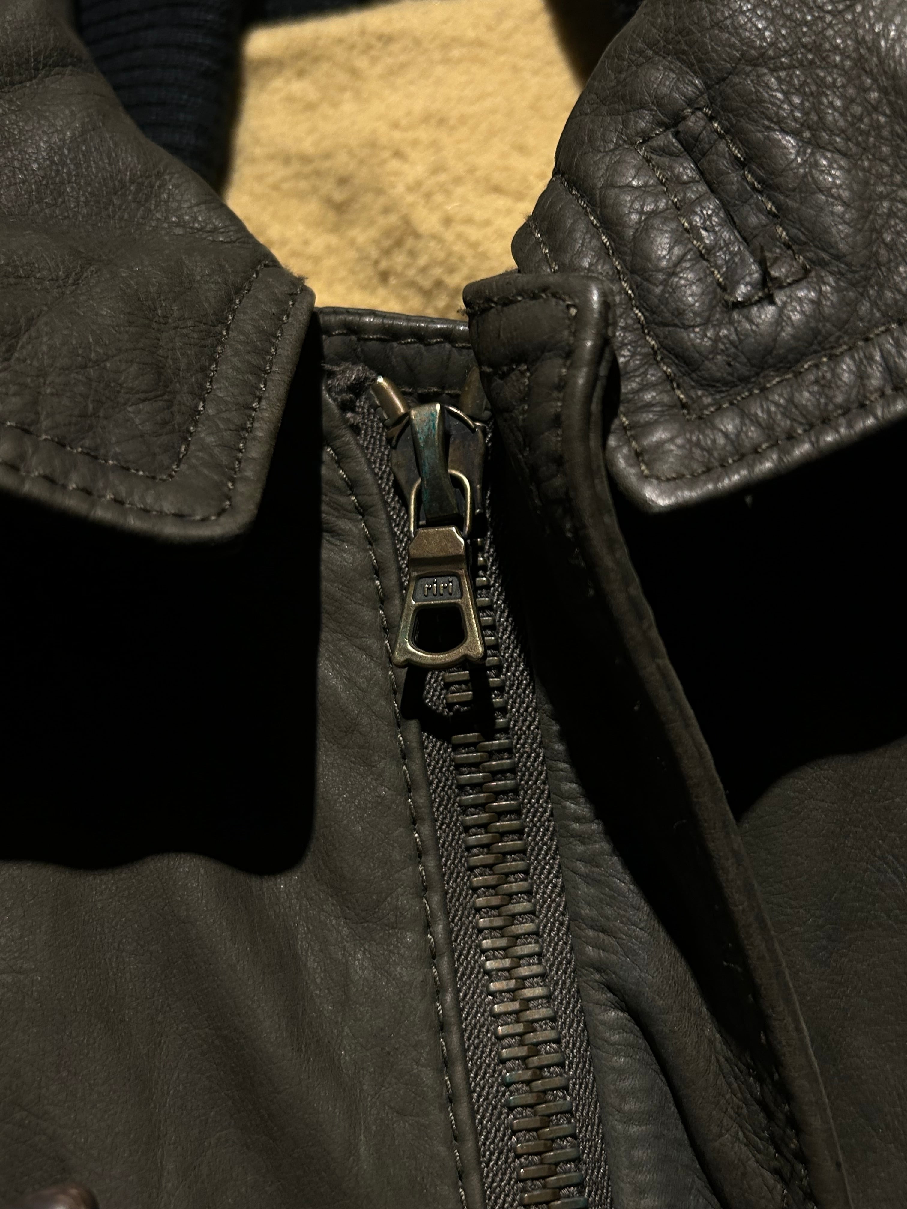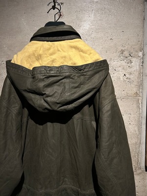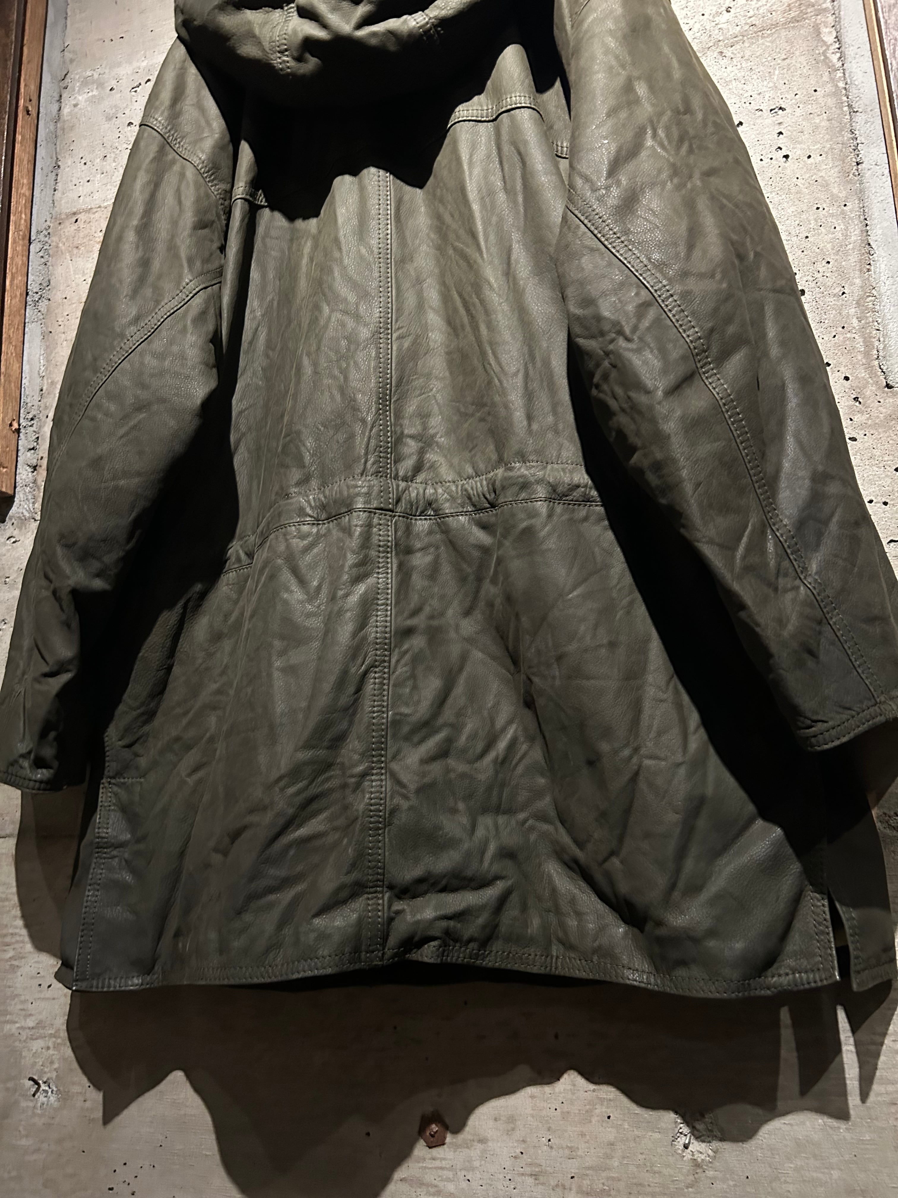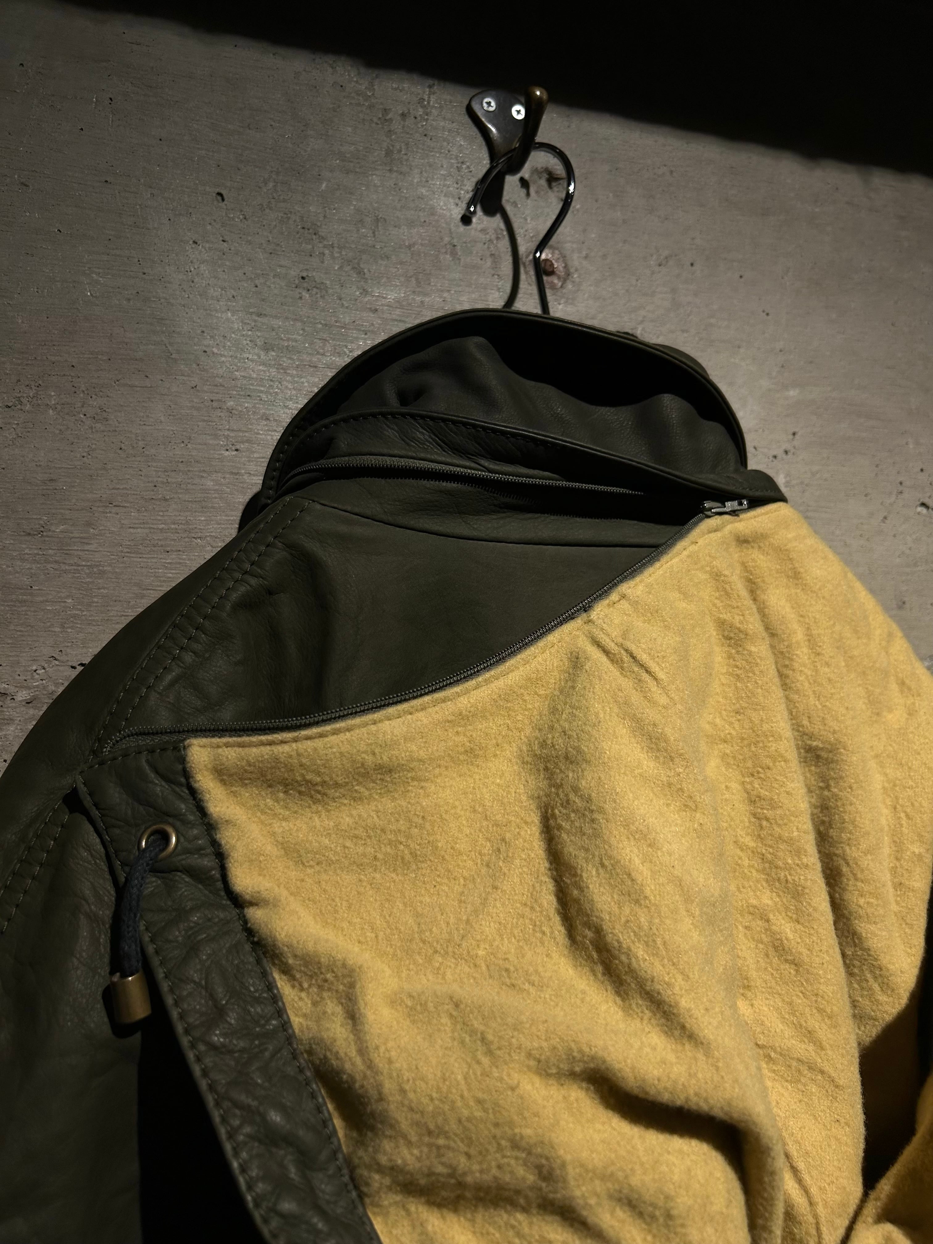 ボディにはしなやかさを残したレザーを採用。着込むことで生まれるシワや表情も含め、レザーならではの経年変化を楽しめる仕上がり。オリーブ寄りの深みある色味が、無骨さと上品さを両立しています。