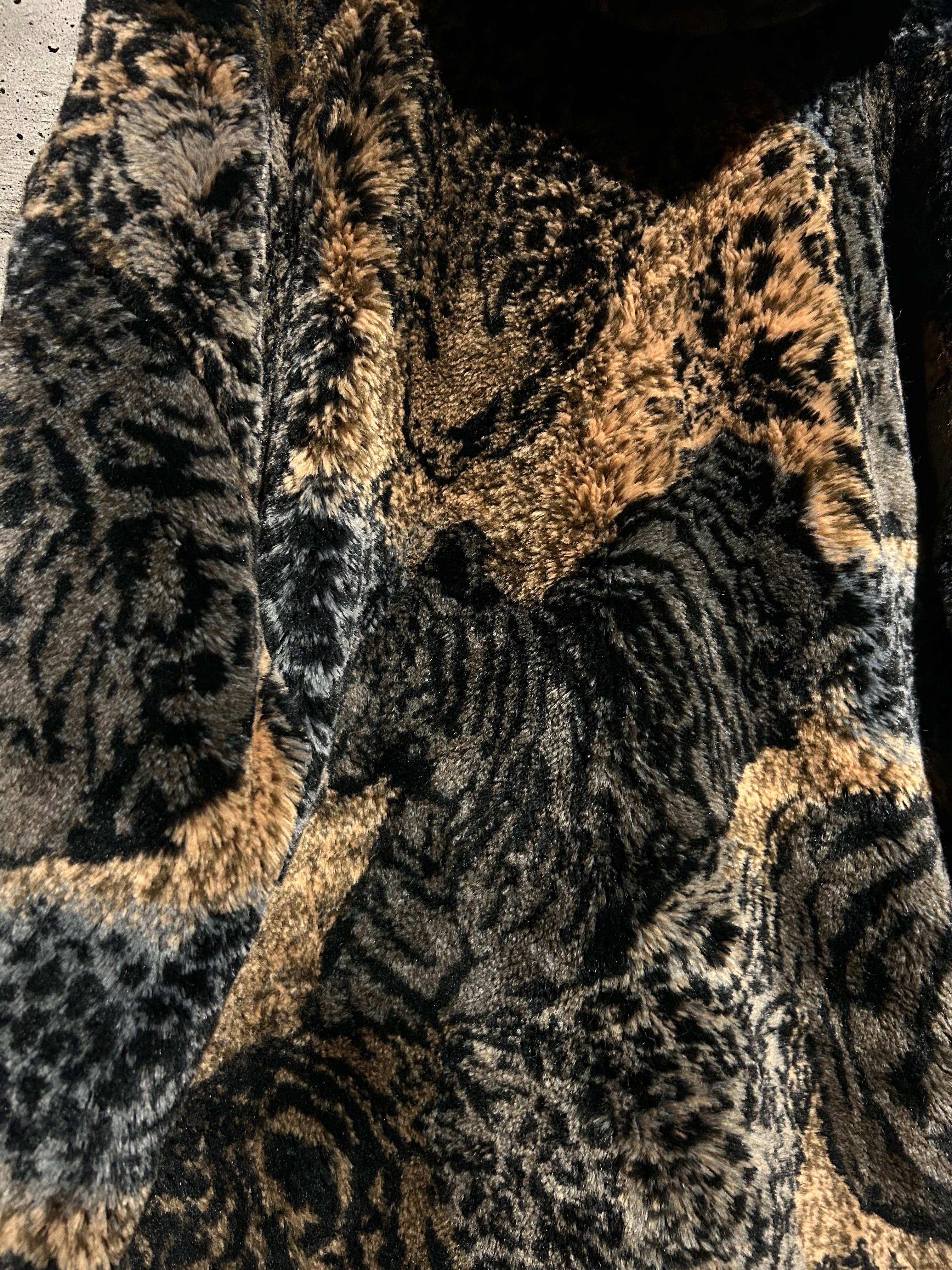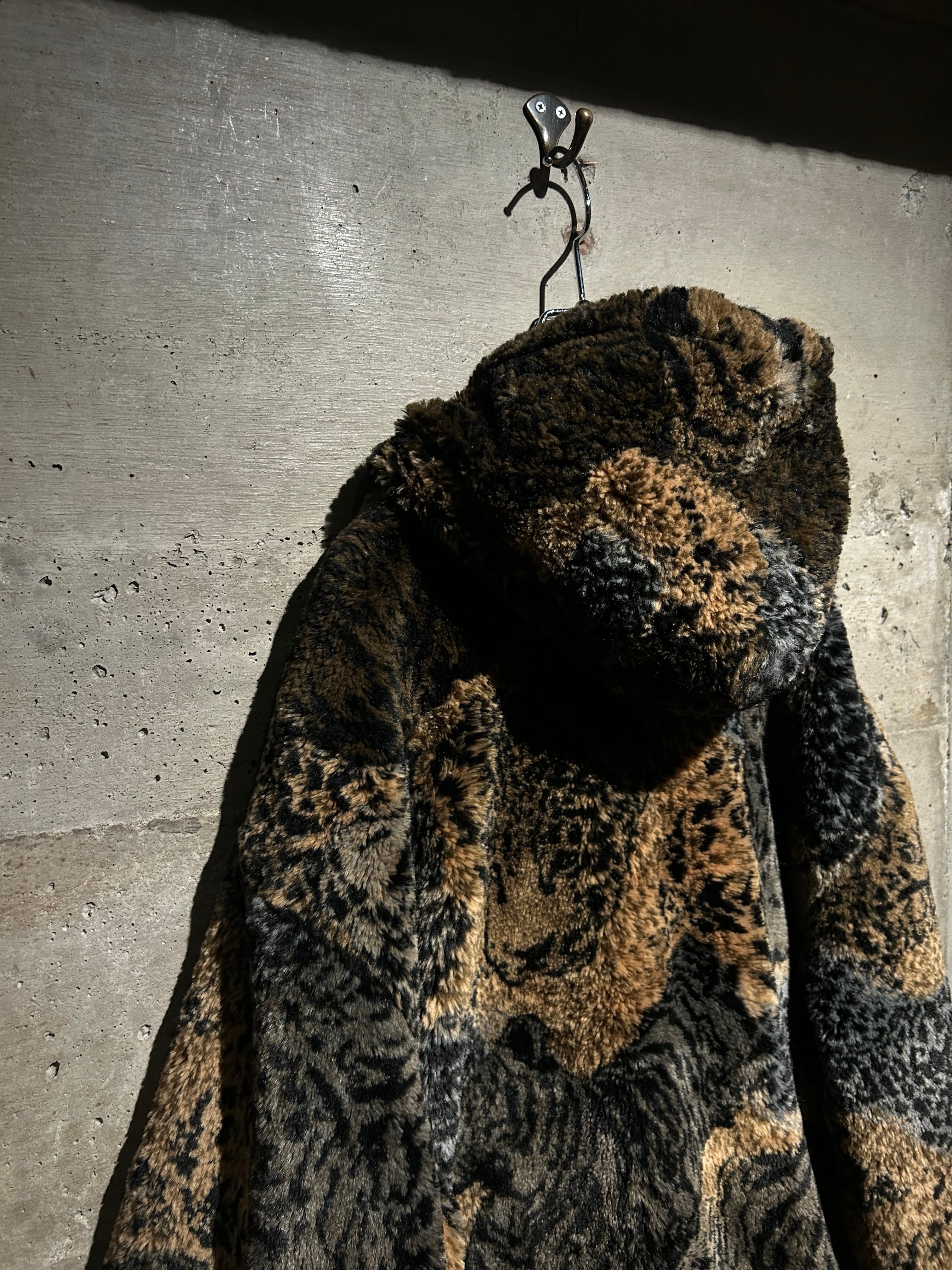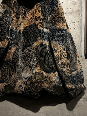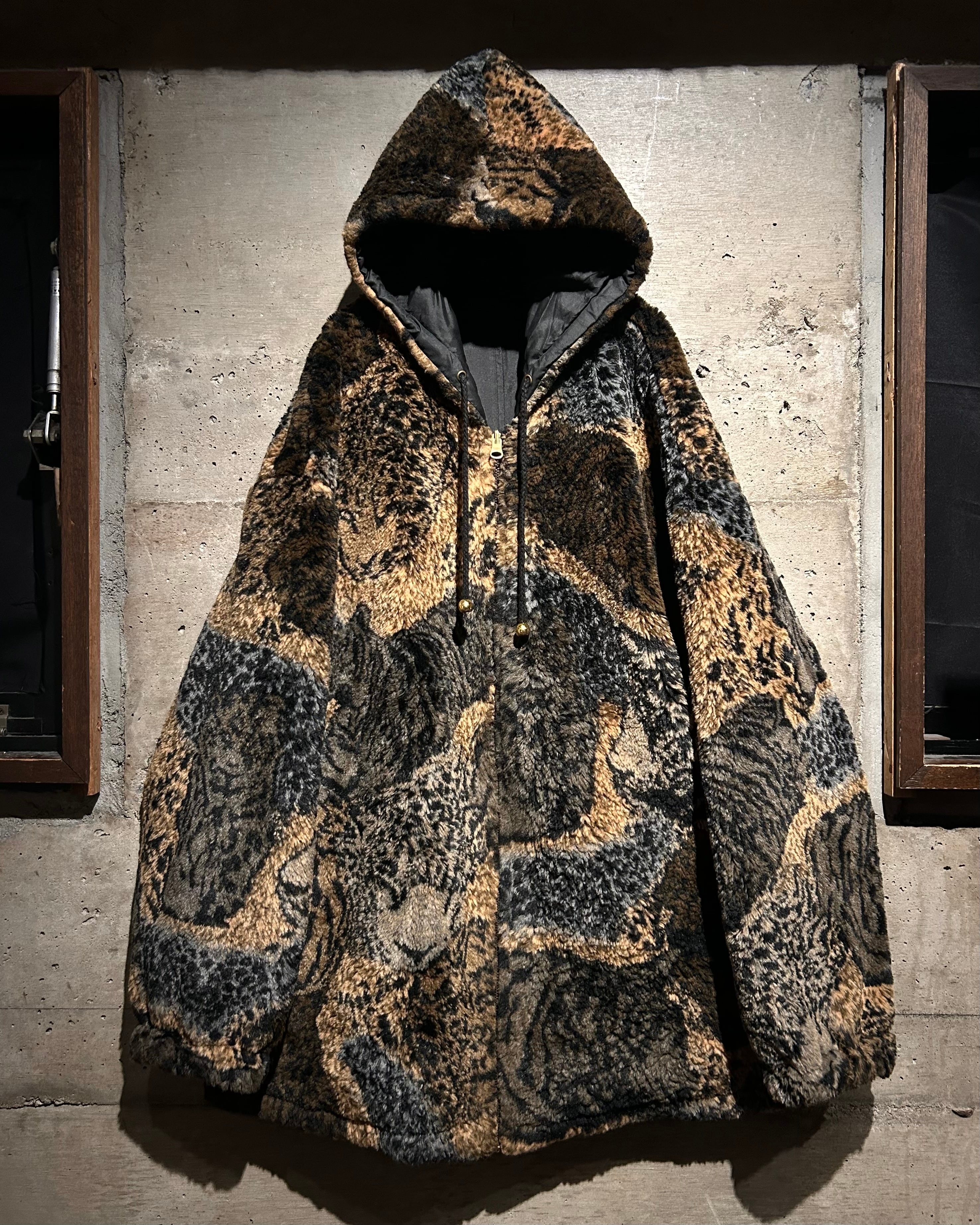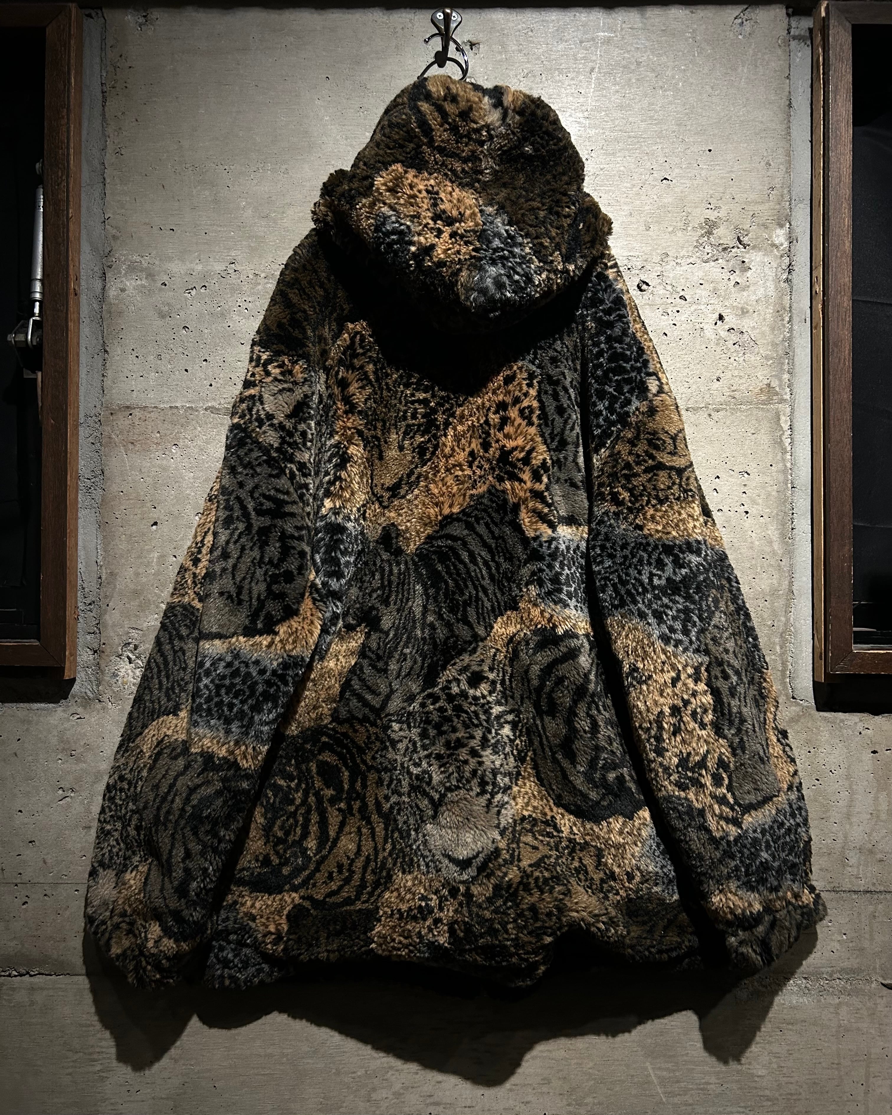 モフッと柔らかなファーをボディに用い、虎や豹などを全体に散りばめた、抜群の存在感を見せるリバーシブル仕様のフェイクファージャケット。