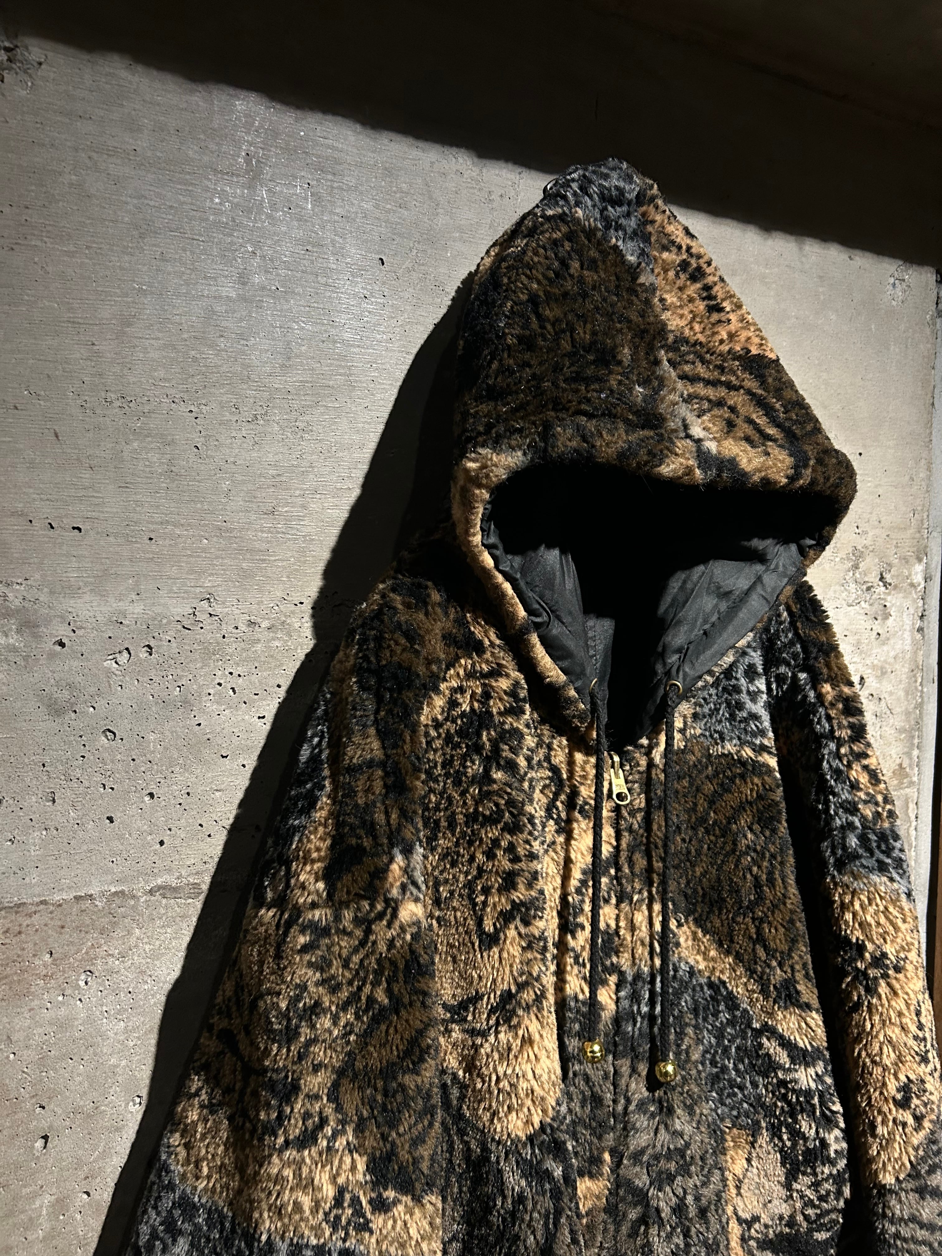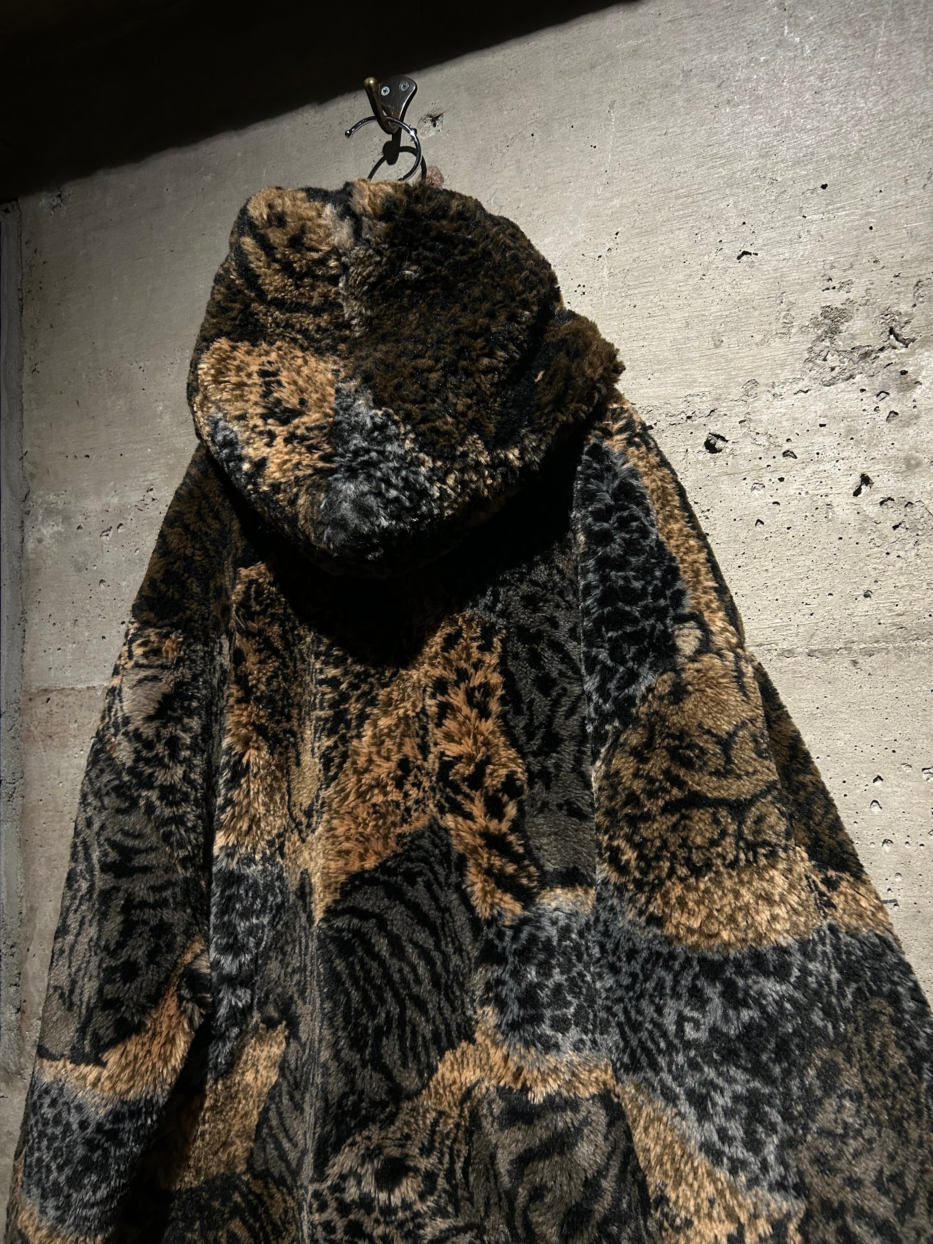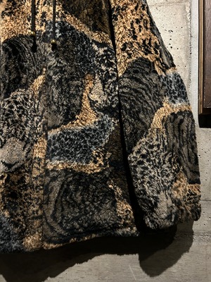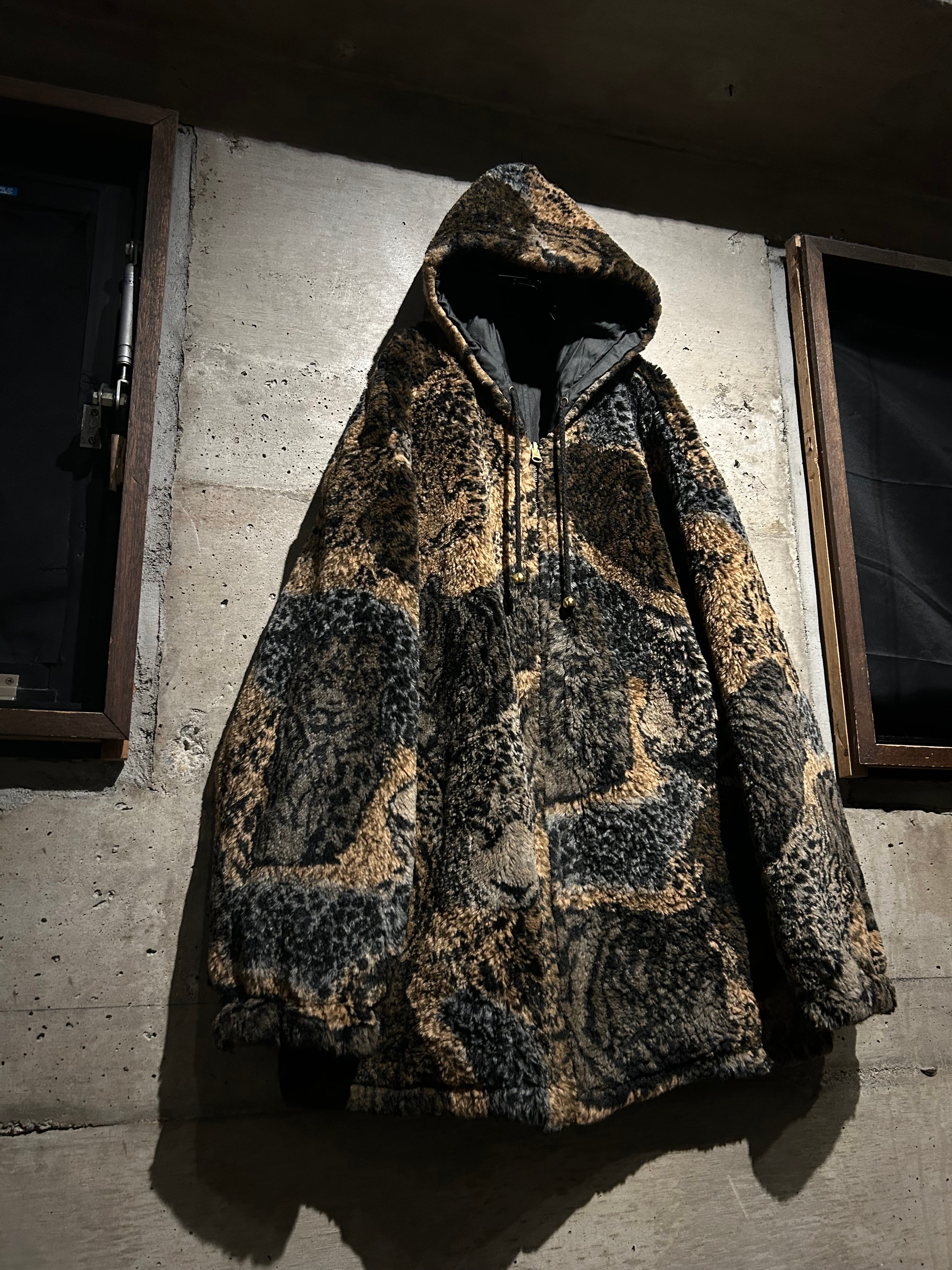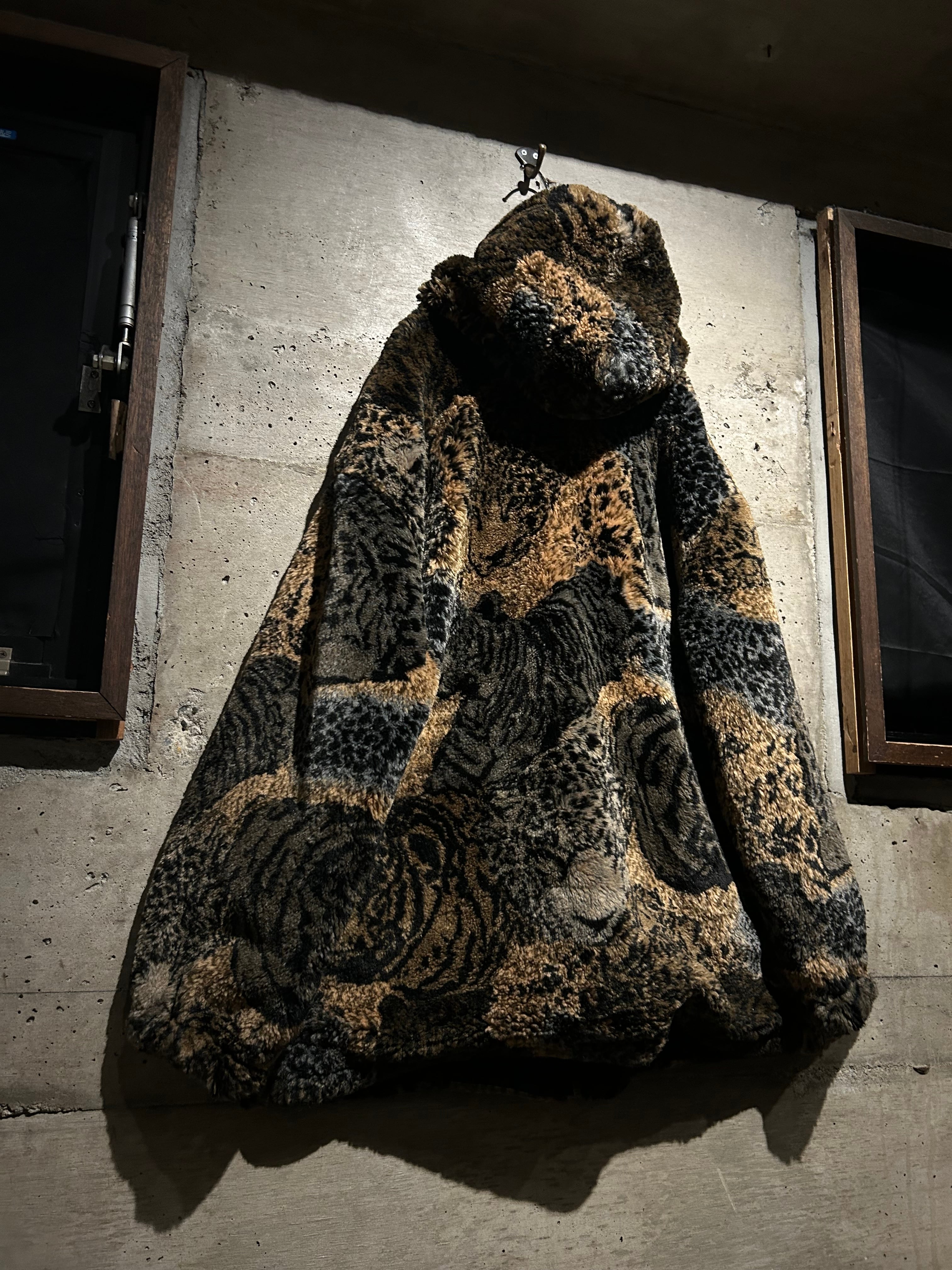 モフッと柔らかなファーをボディに用い、虎や豹などを全体に散りばめた、抜群の存在感を見せるリバーシブル仕様のフェイクファージャケット。