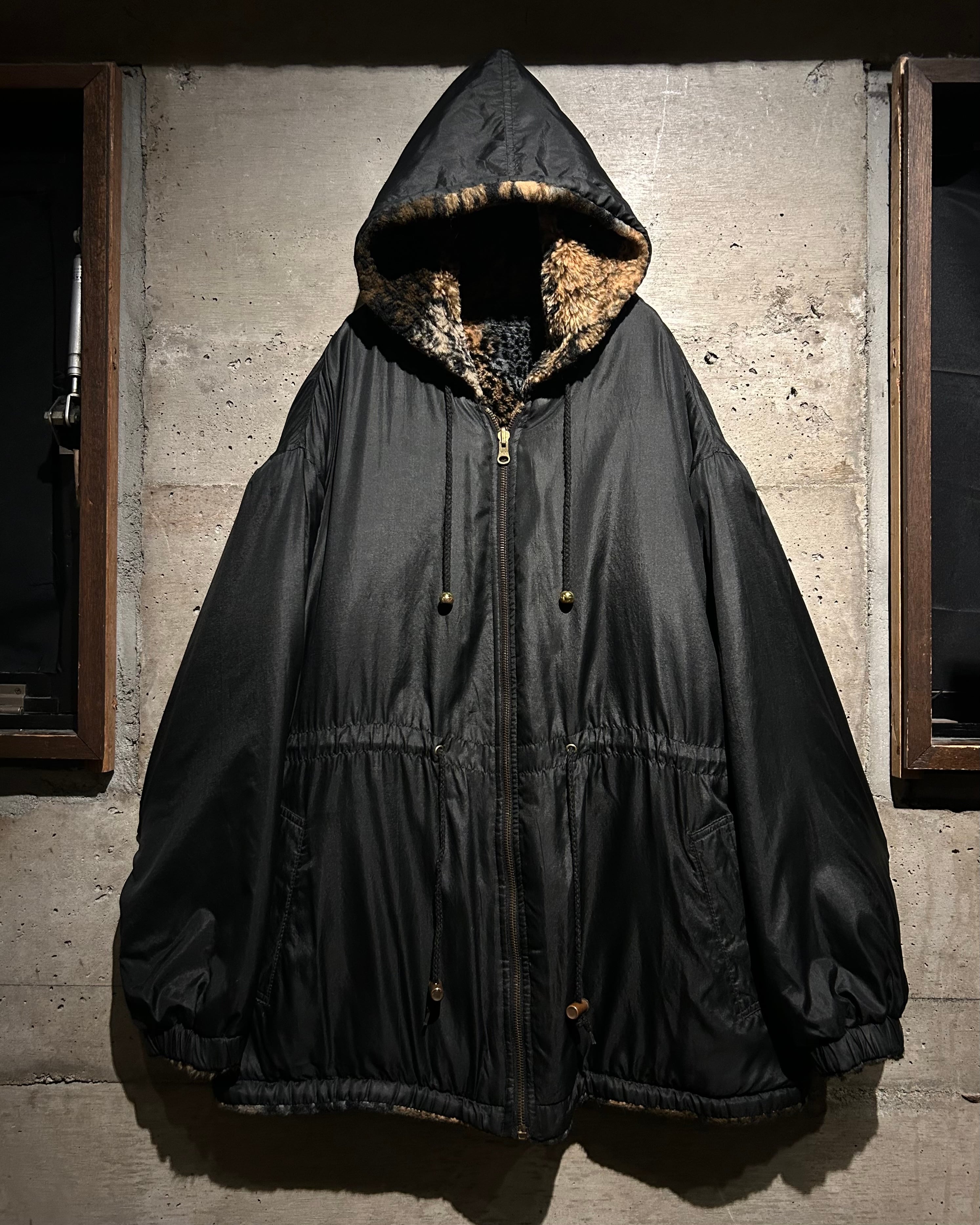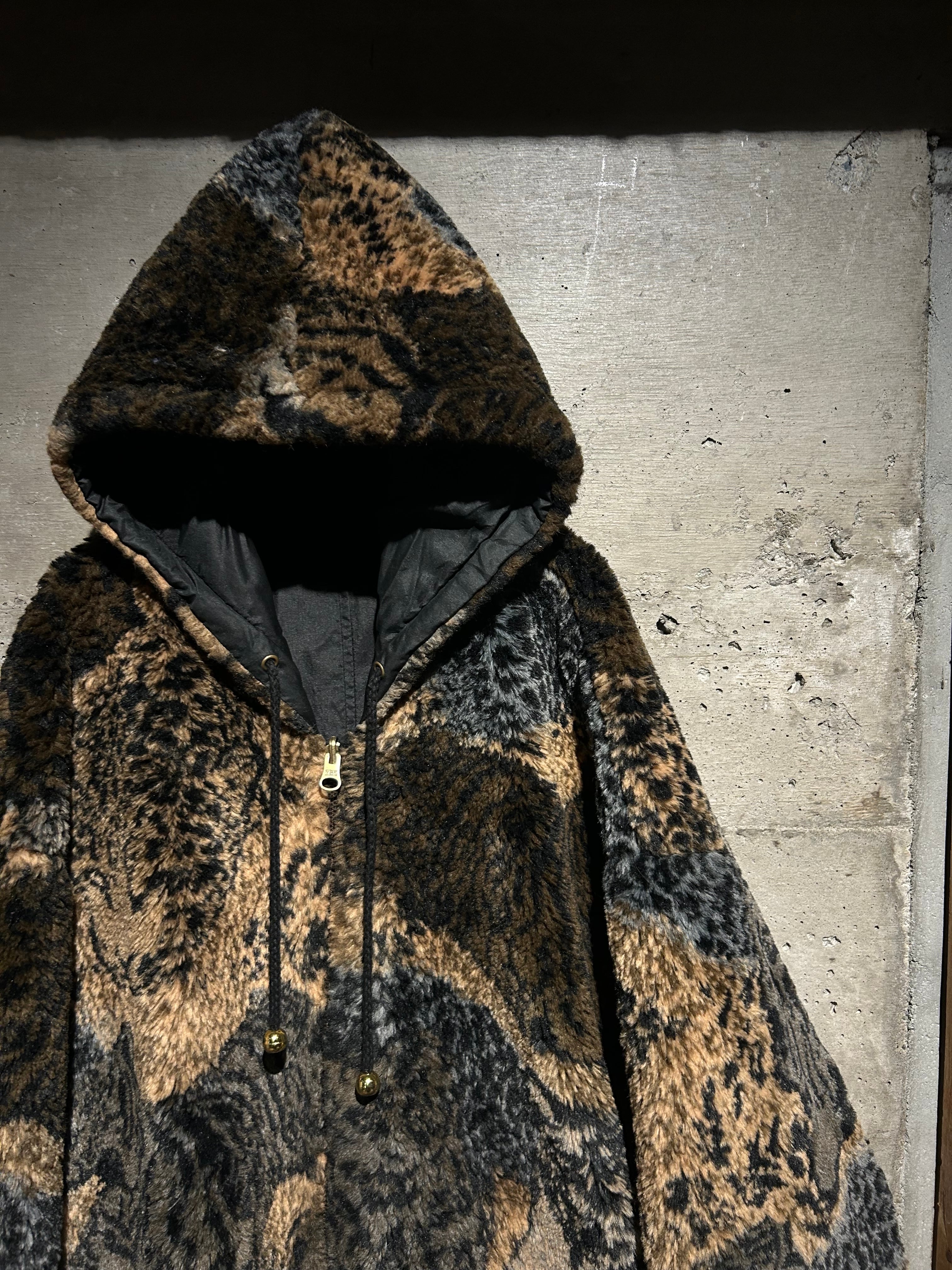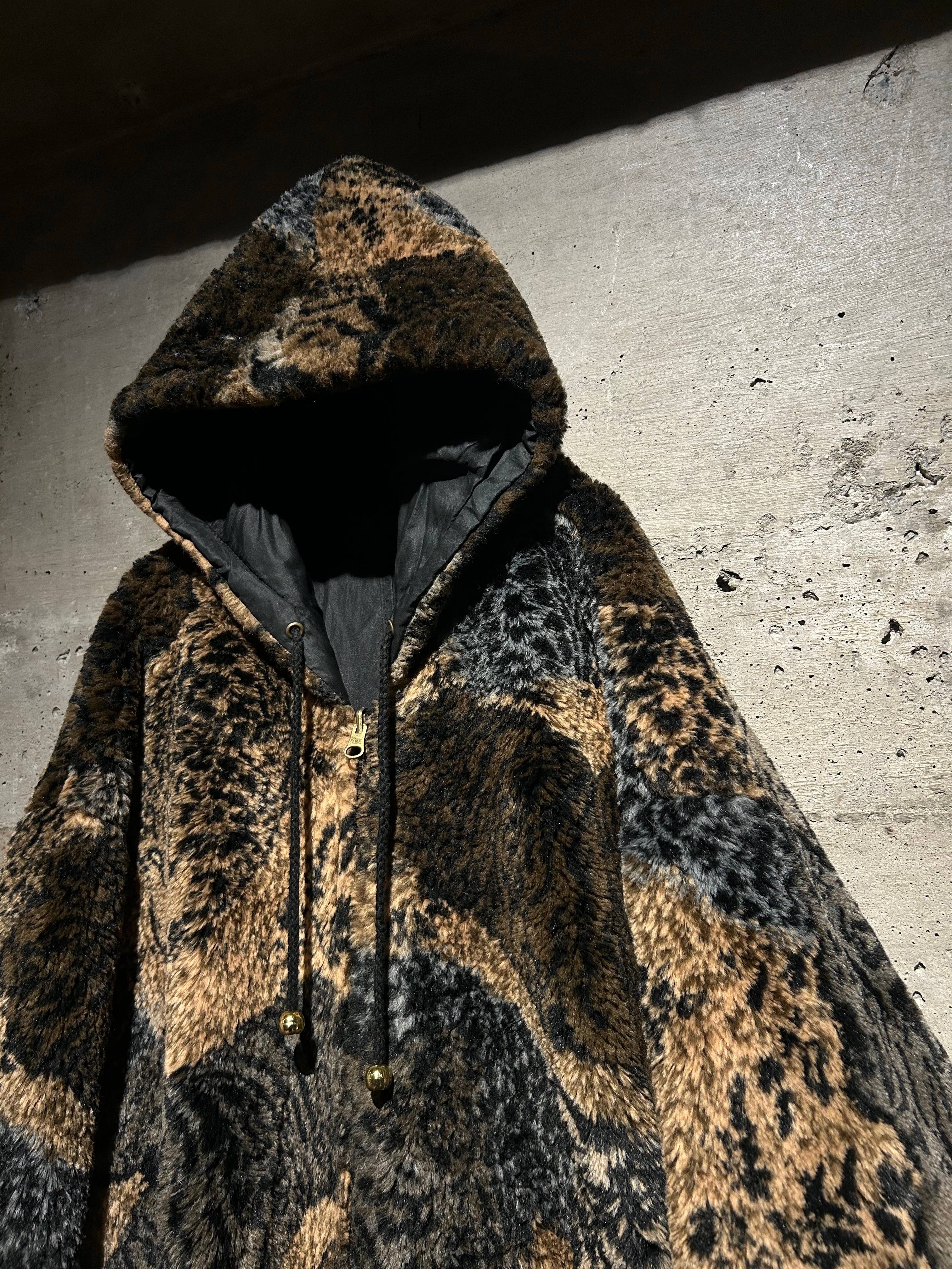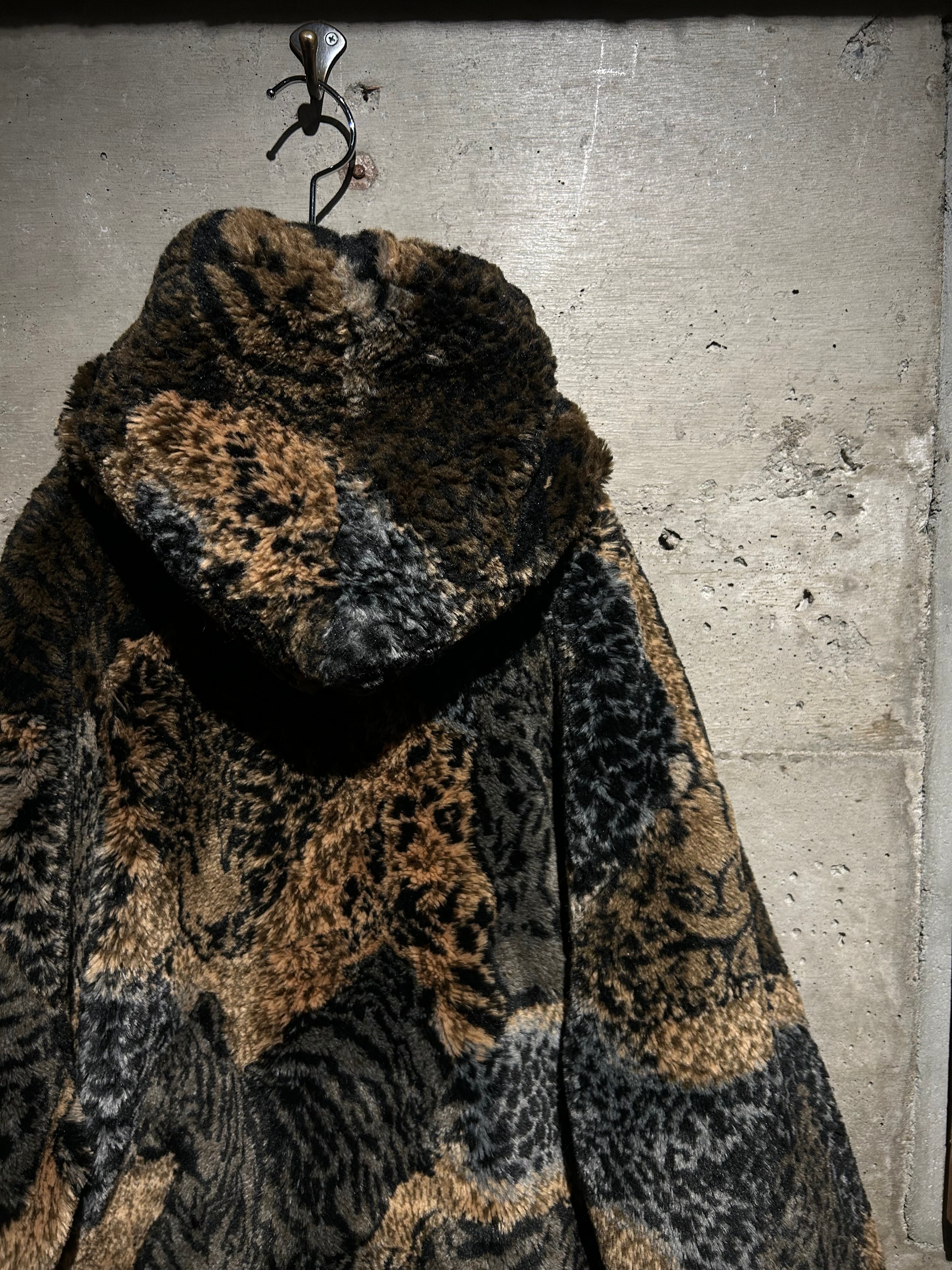 モフッと柔らかなファーをボディに用い、虎や豹などを全体に散りばめた、抜群の存在感を見せるリバーシブル仕様のフェイクファージャケット。
